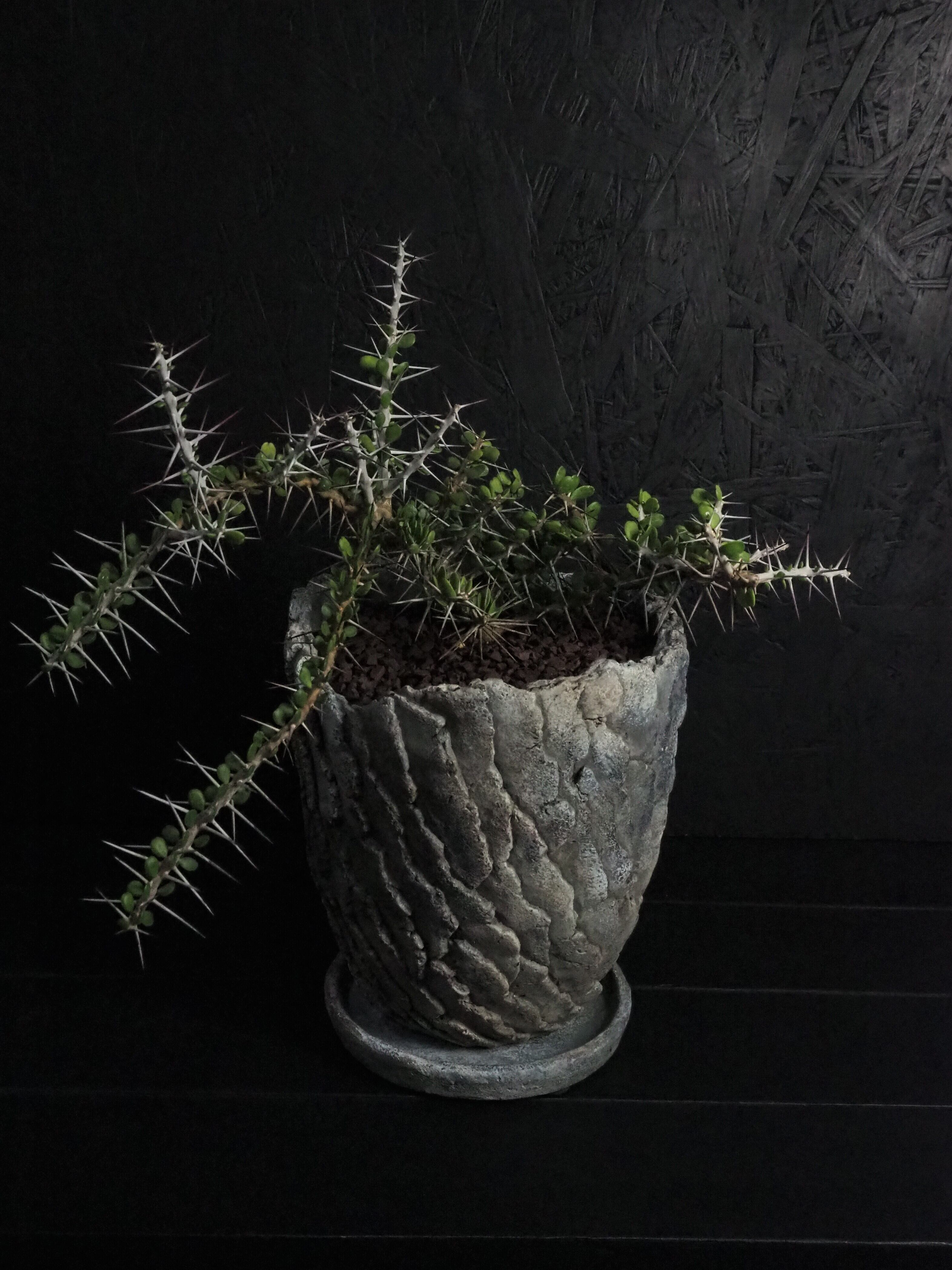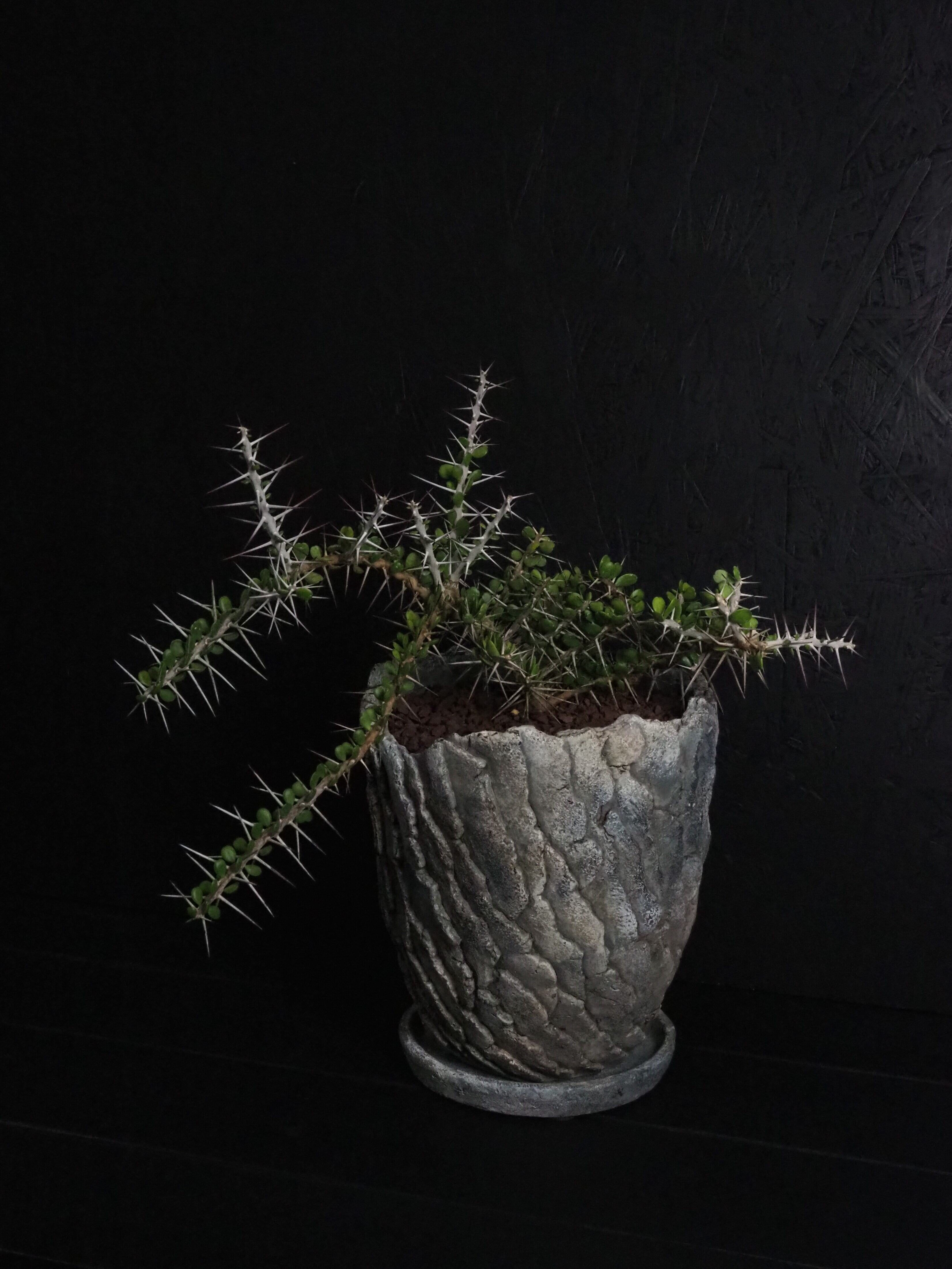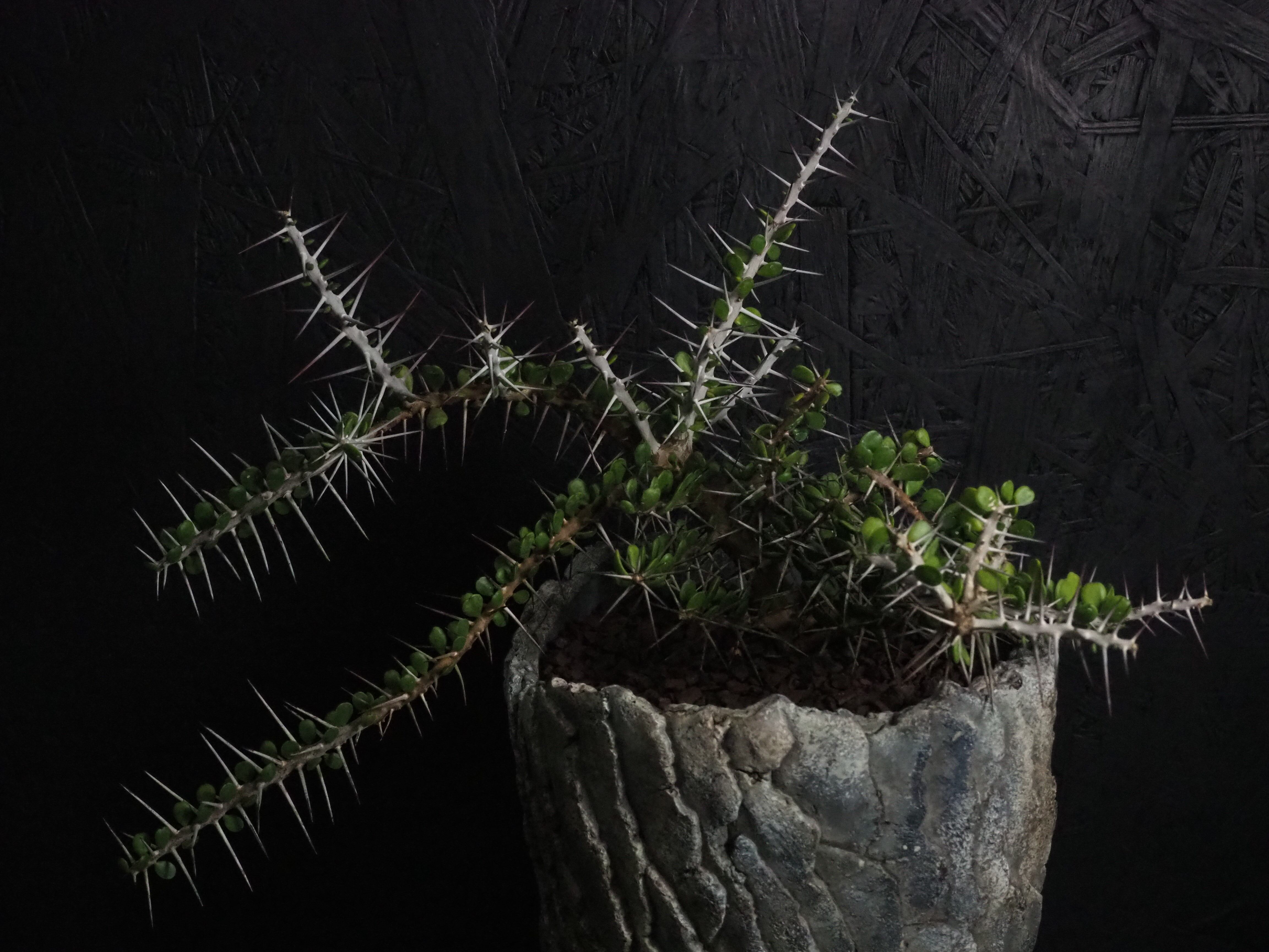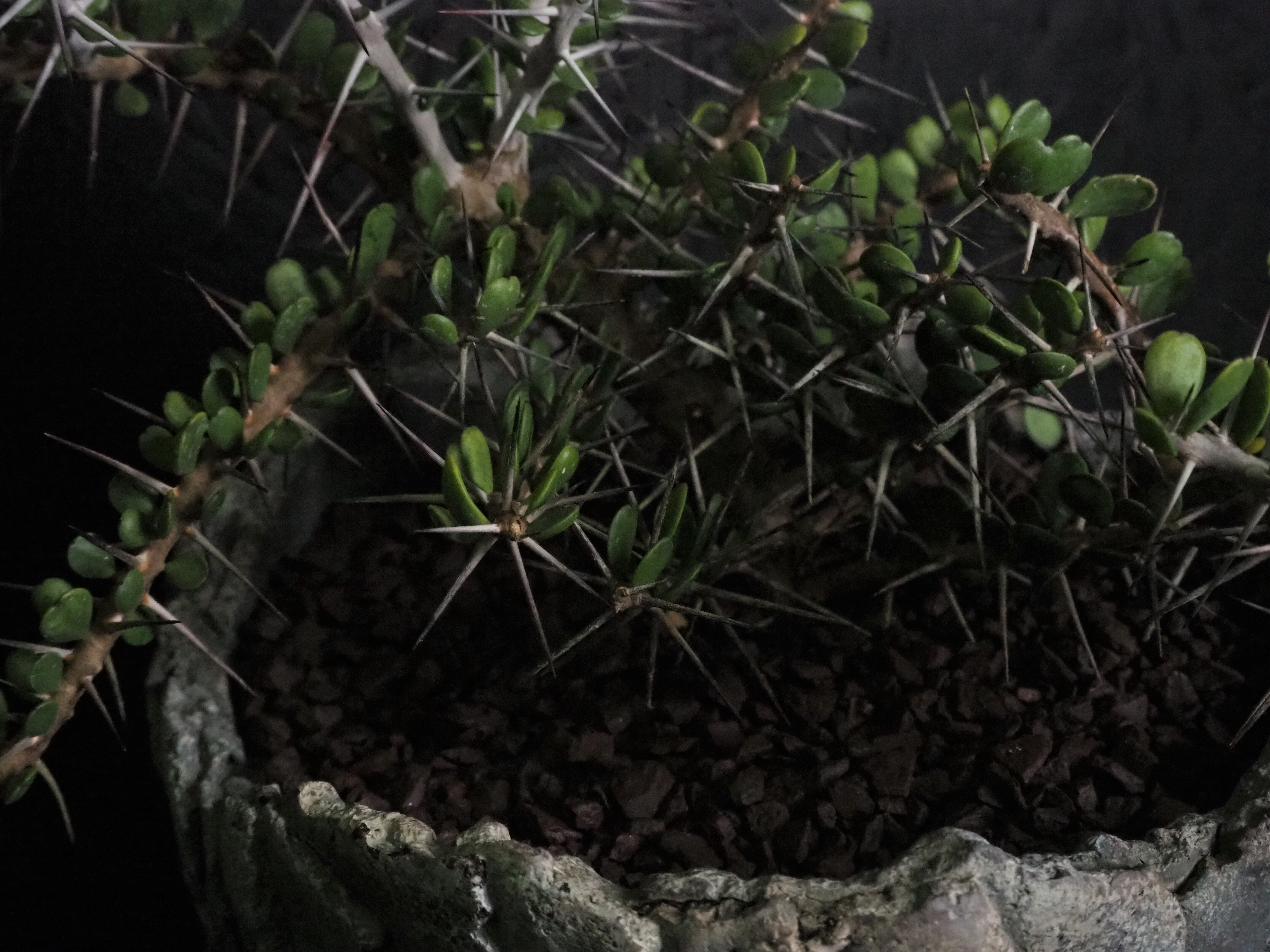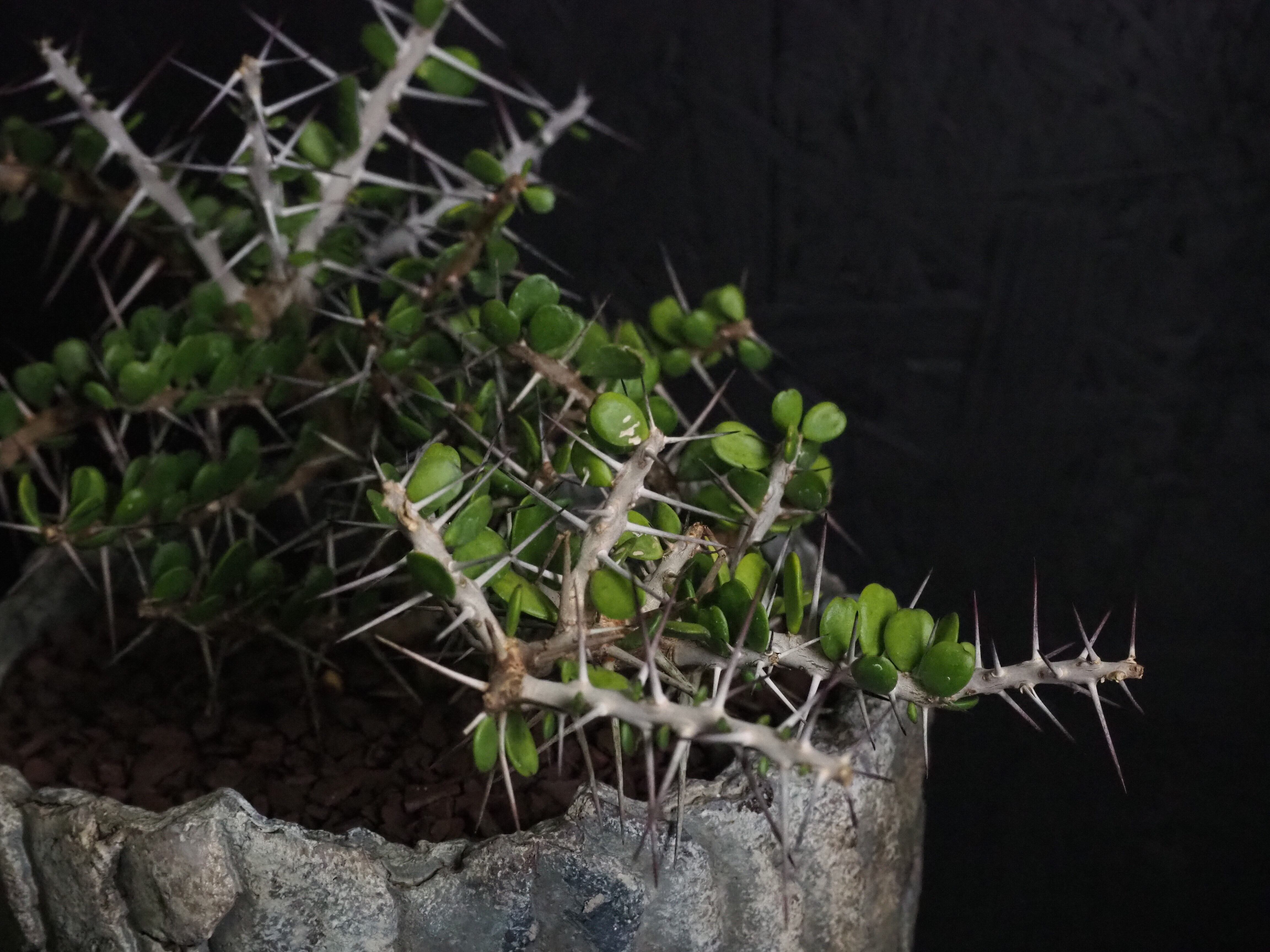 自由奔放に伸びる細めの枝に強力で立派な刺が連なって生えます。刺の隙間には丸い肉厚の小葉がつき、原生地での樹高は2~3m程度になります。