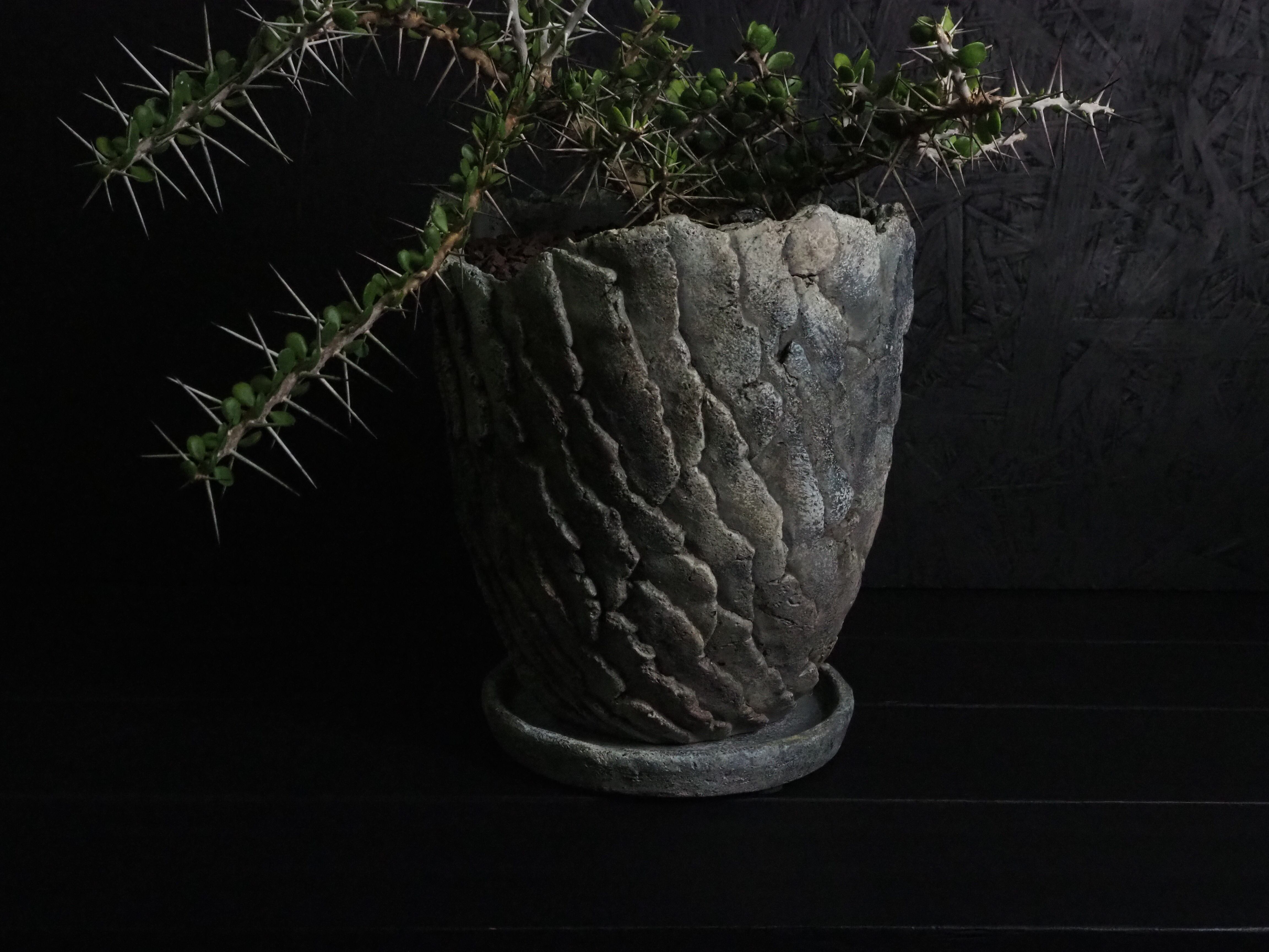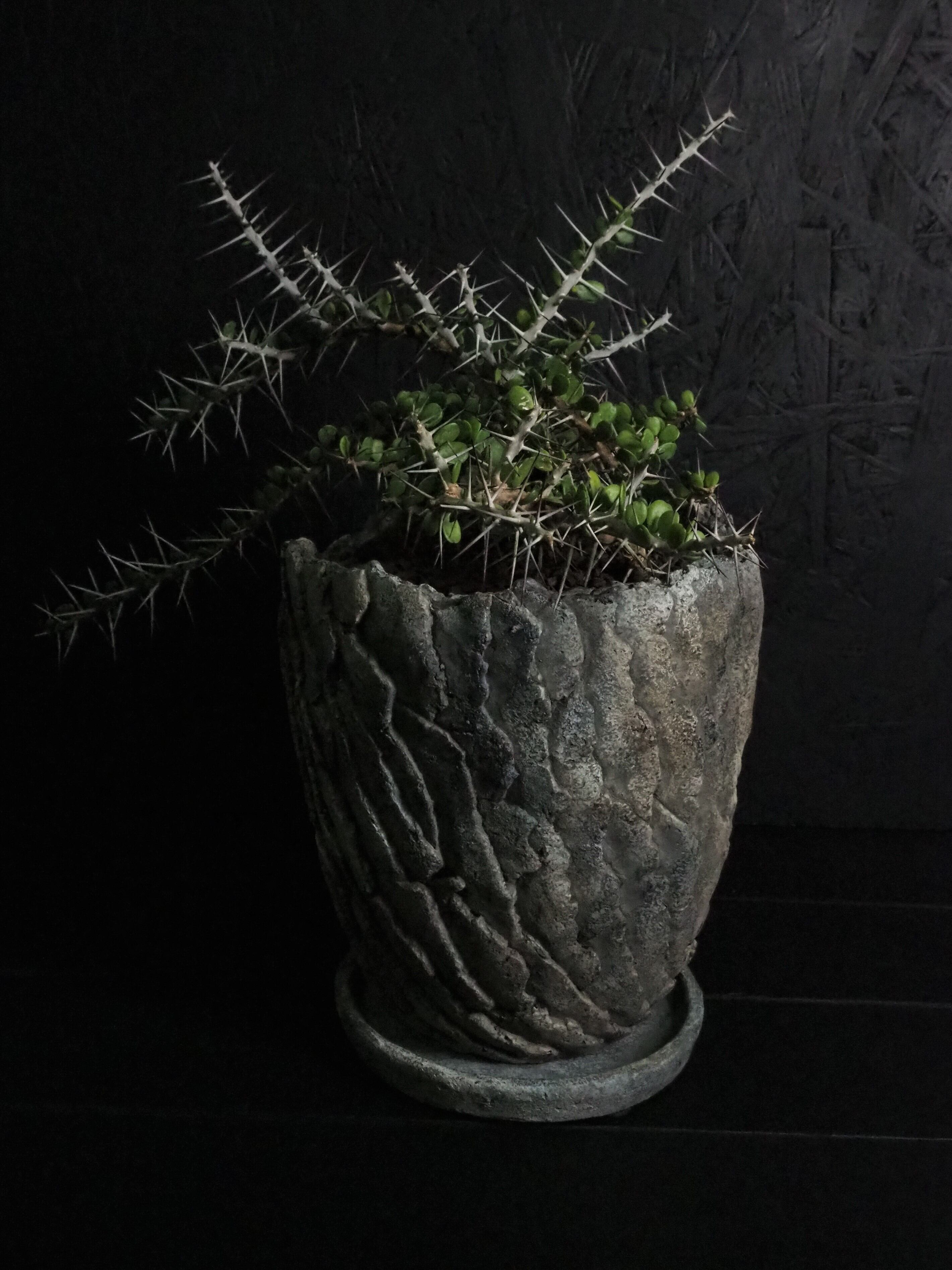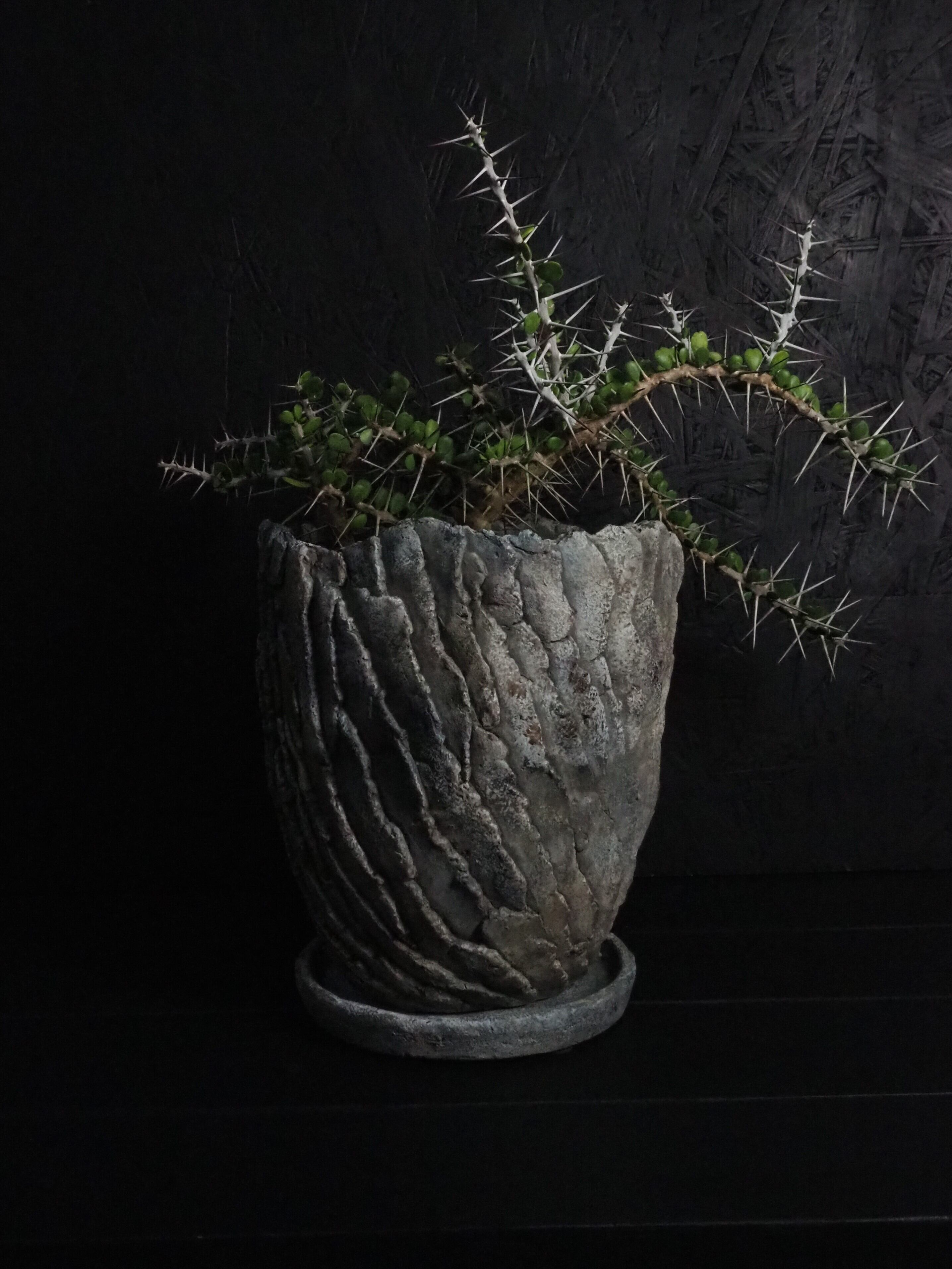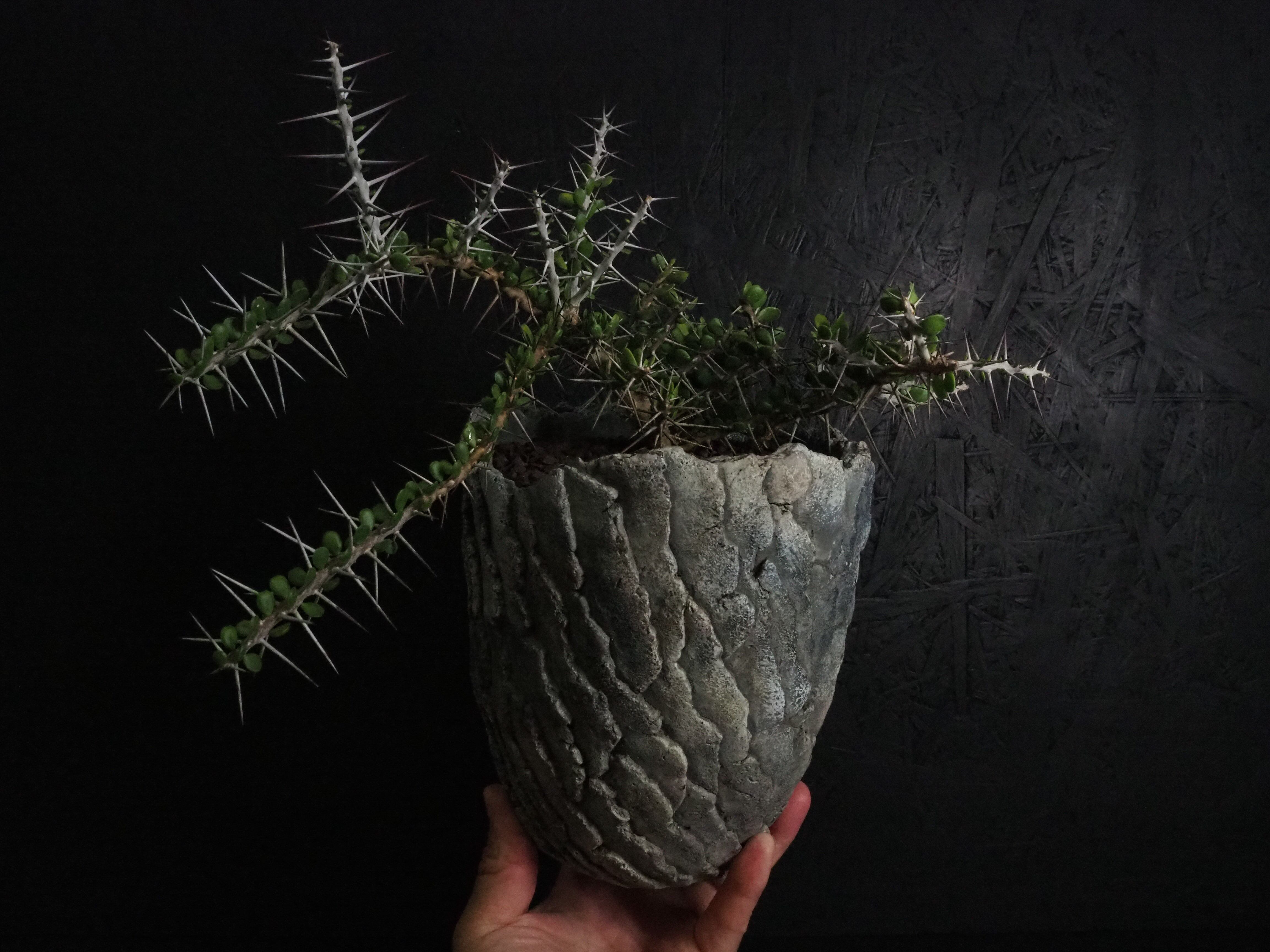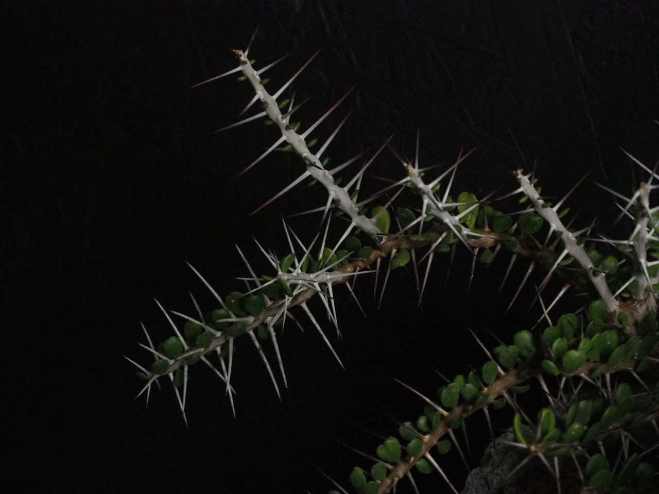 自由奔放に伸びる細めの枝に強力で立派な刺が連なって生えます。刺の隙間には丸い肉厚の小葉がつき、原生地での樹高は2~3m程度になります。