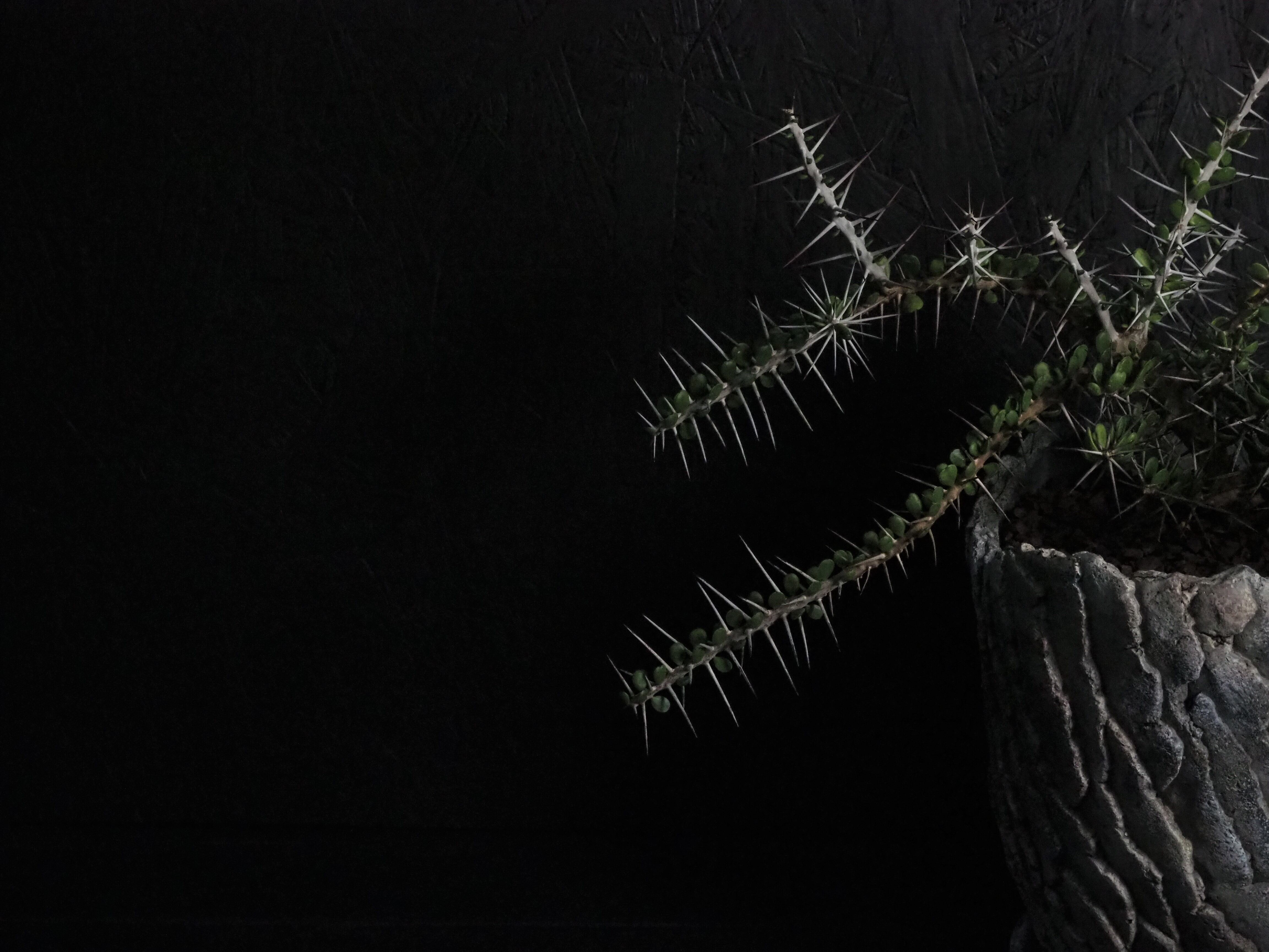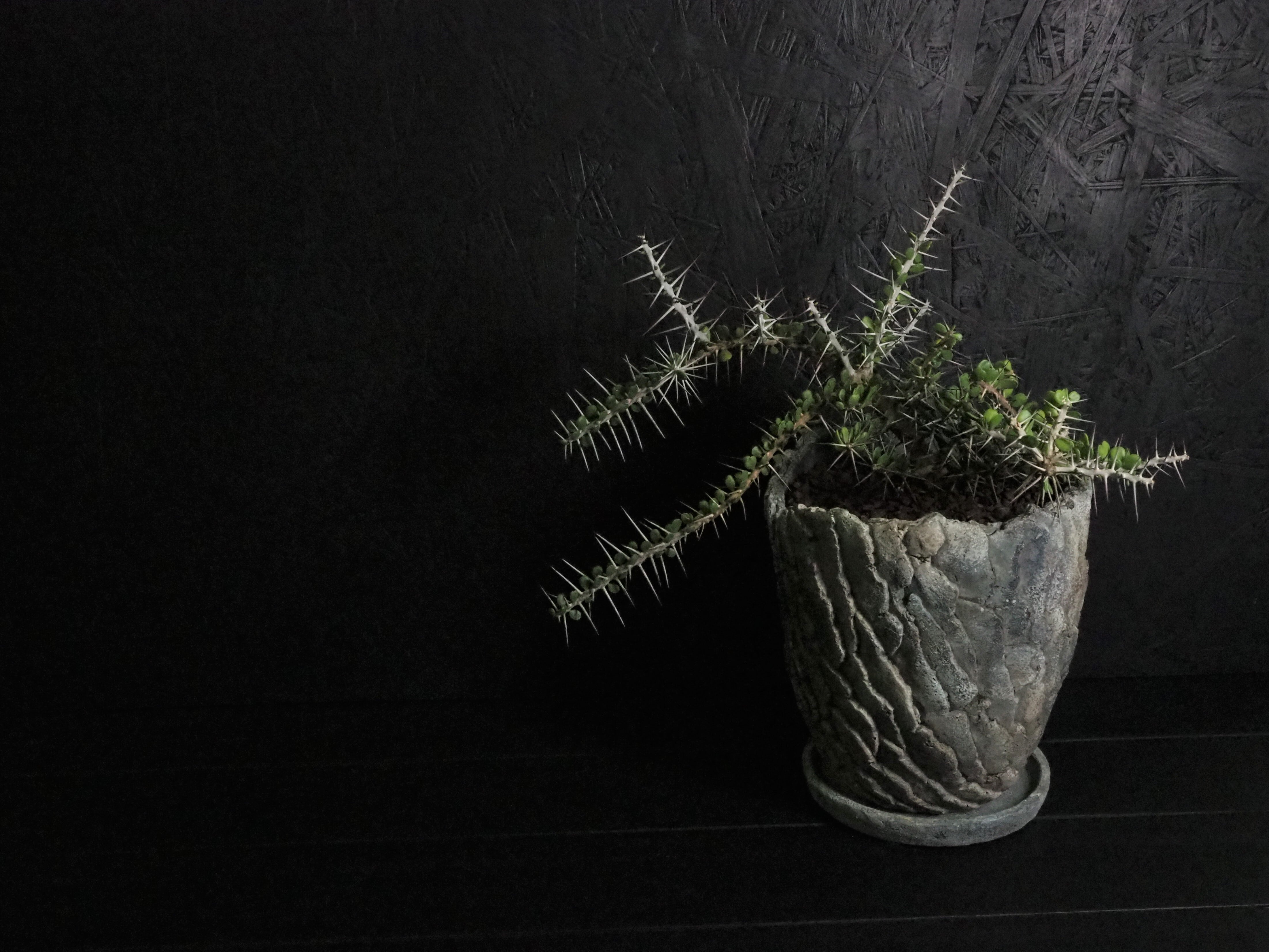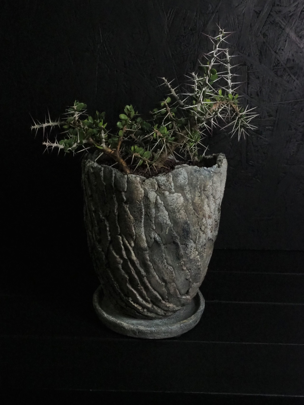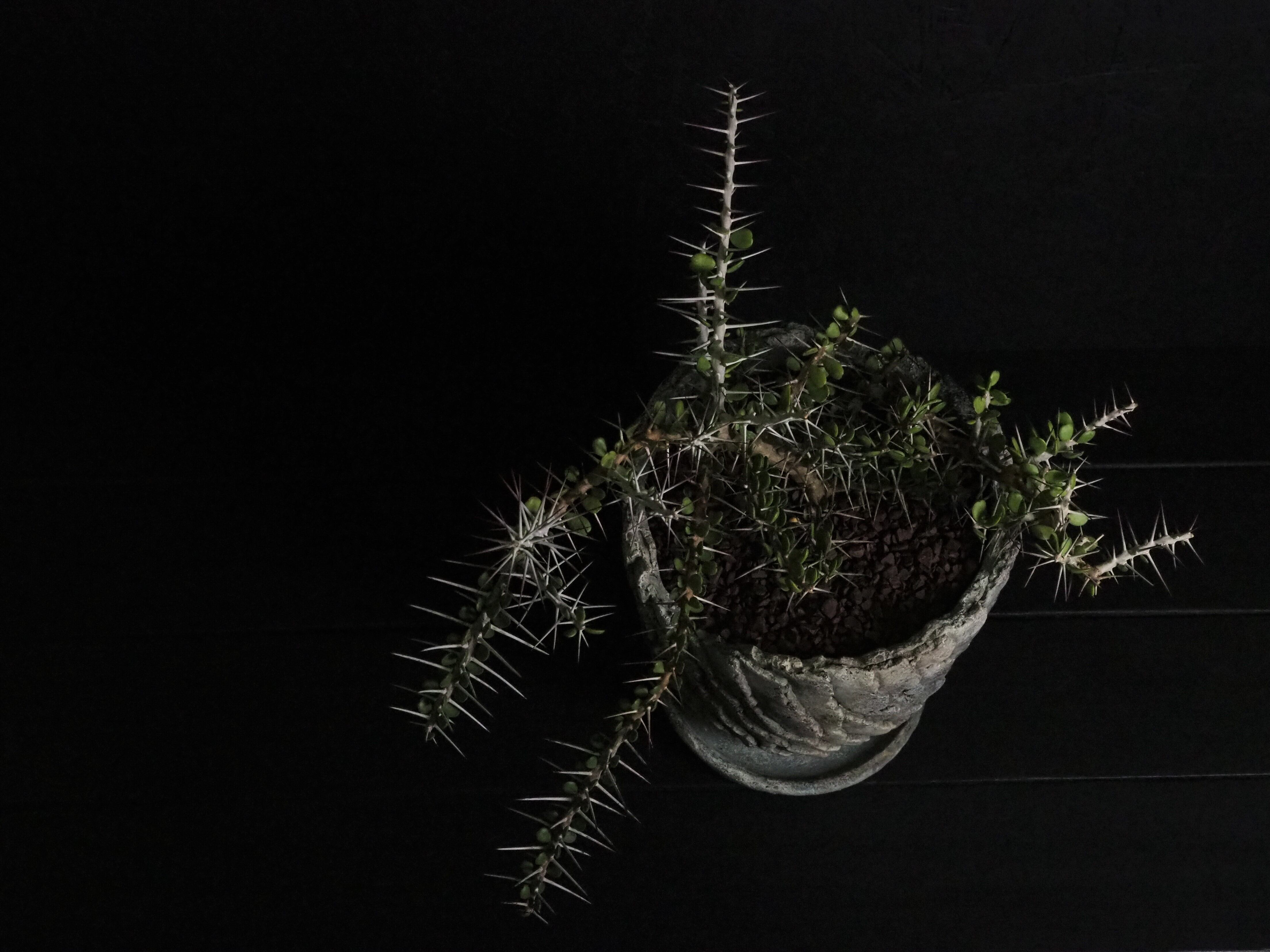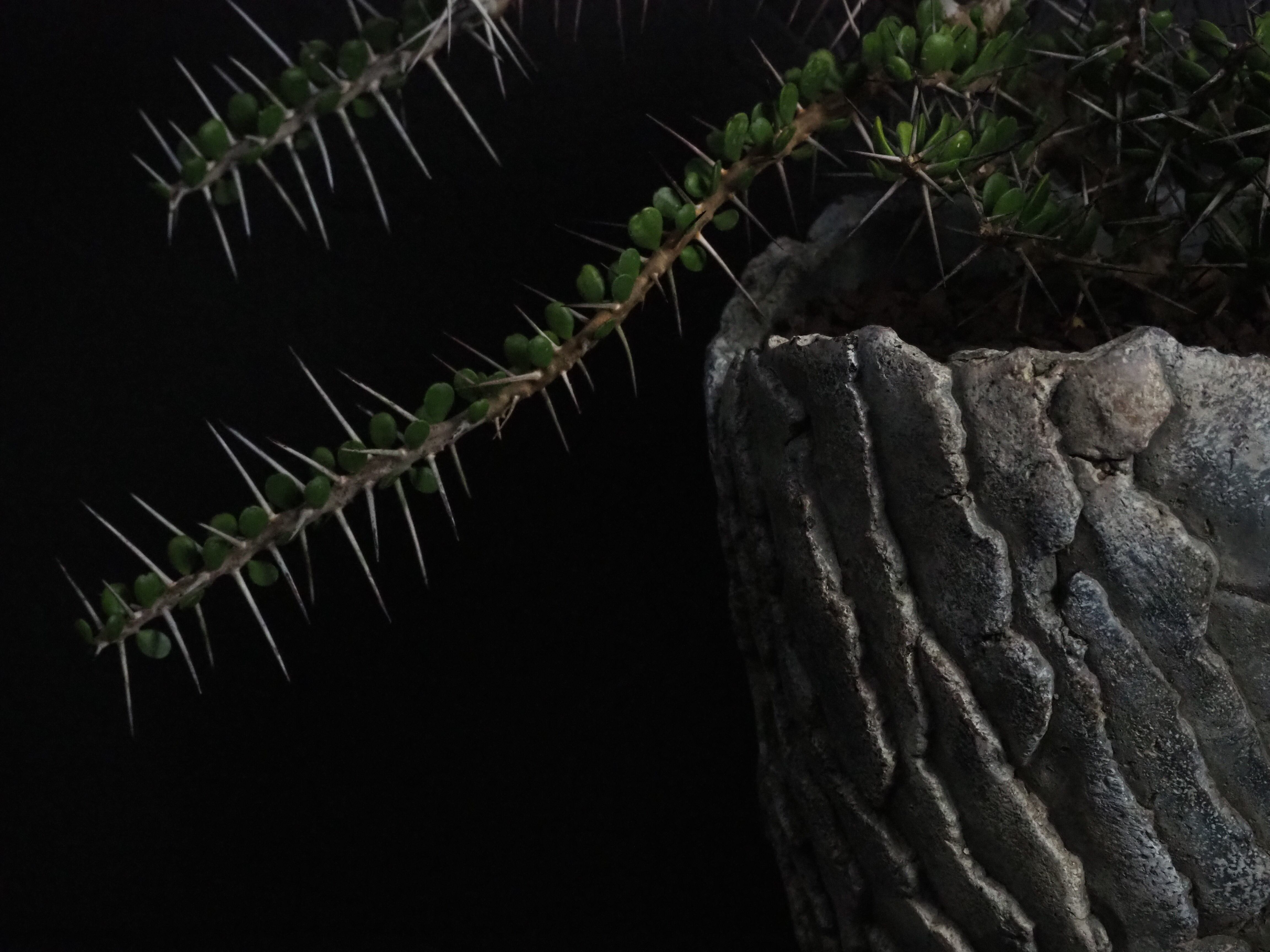 自由奔放に伸びる細めの枝に強力で立派な刺が連なって生えます。刺の隙間には丸い肉厚の小葉がつき、原生地での樹高は2~3m程度になります。