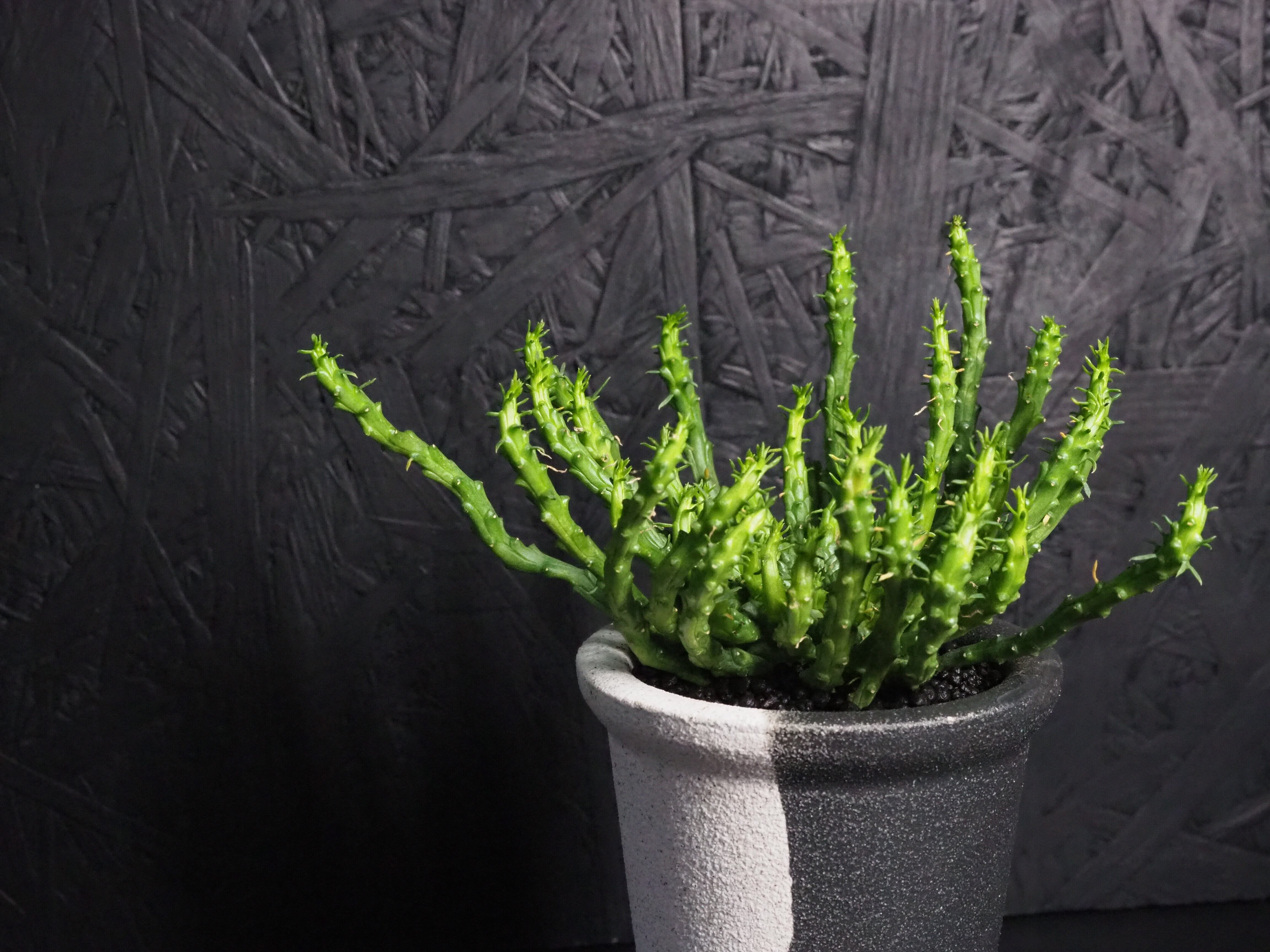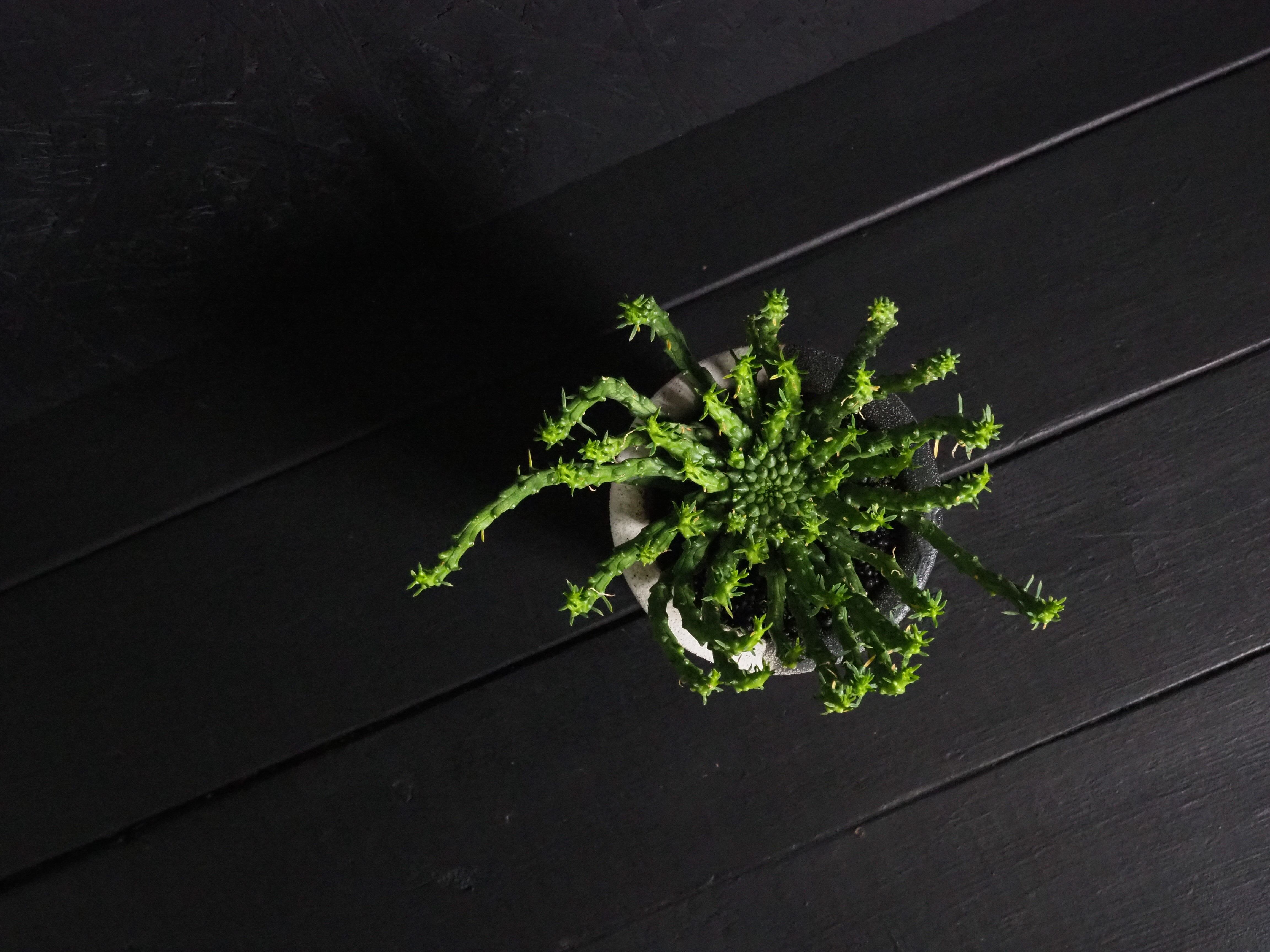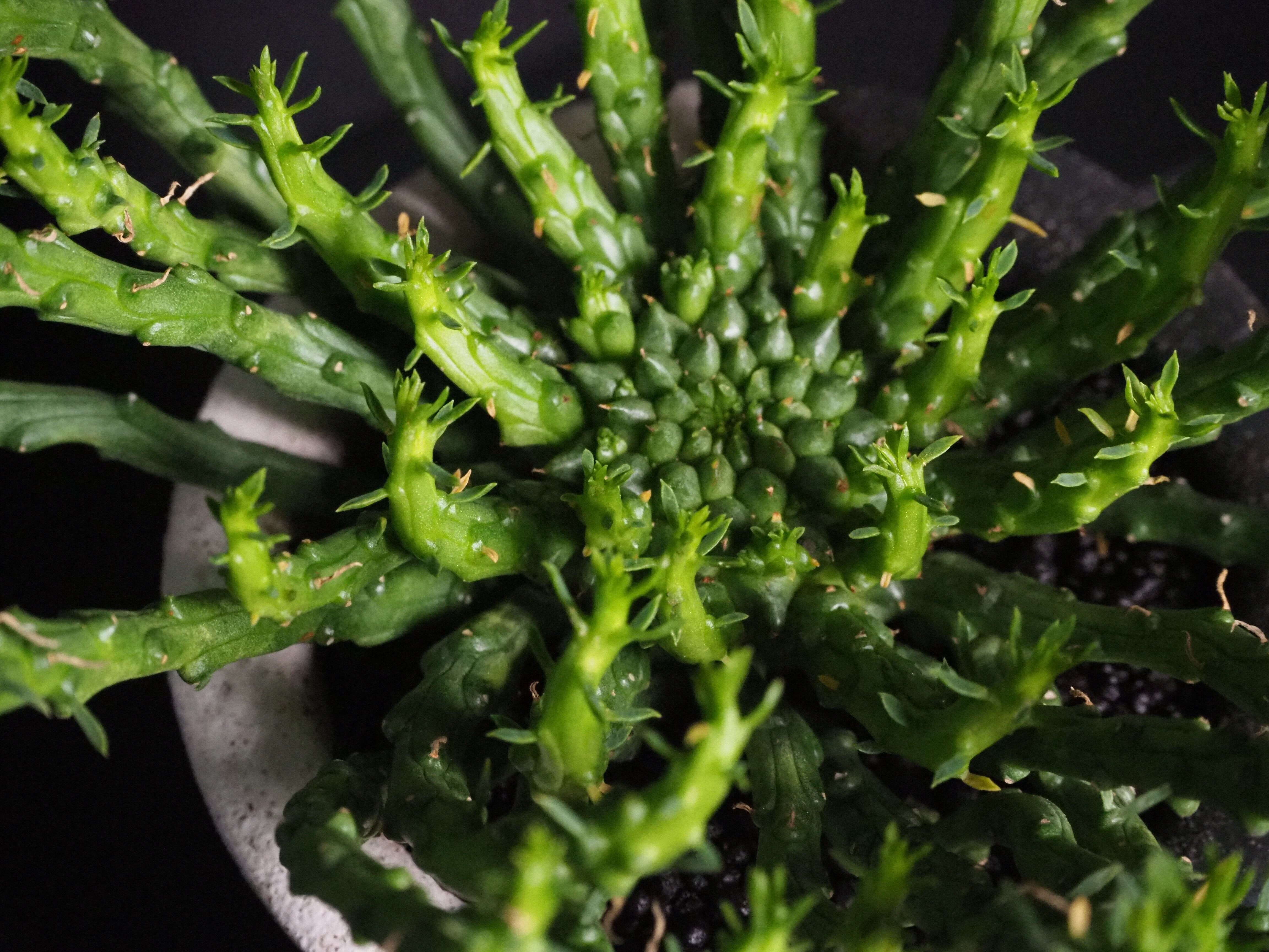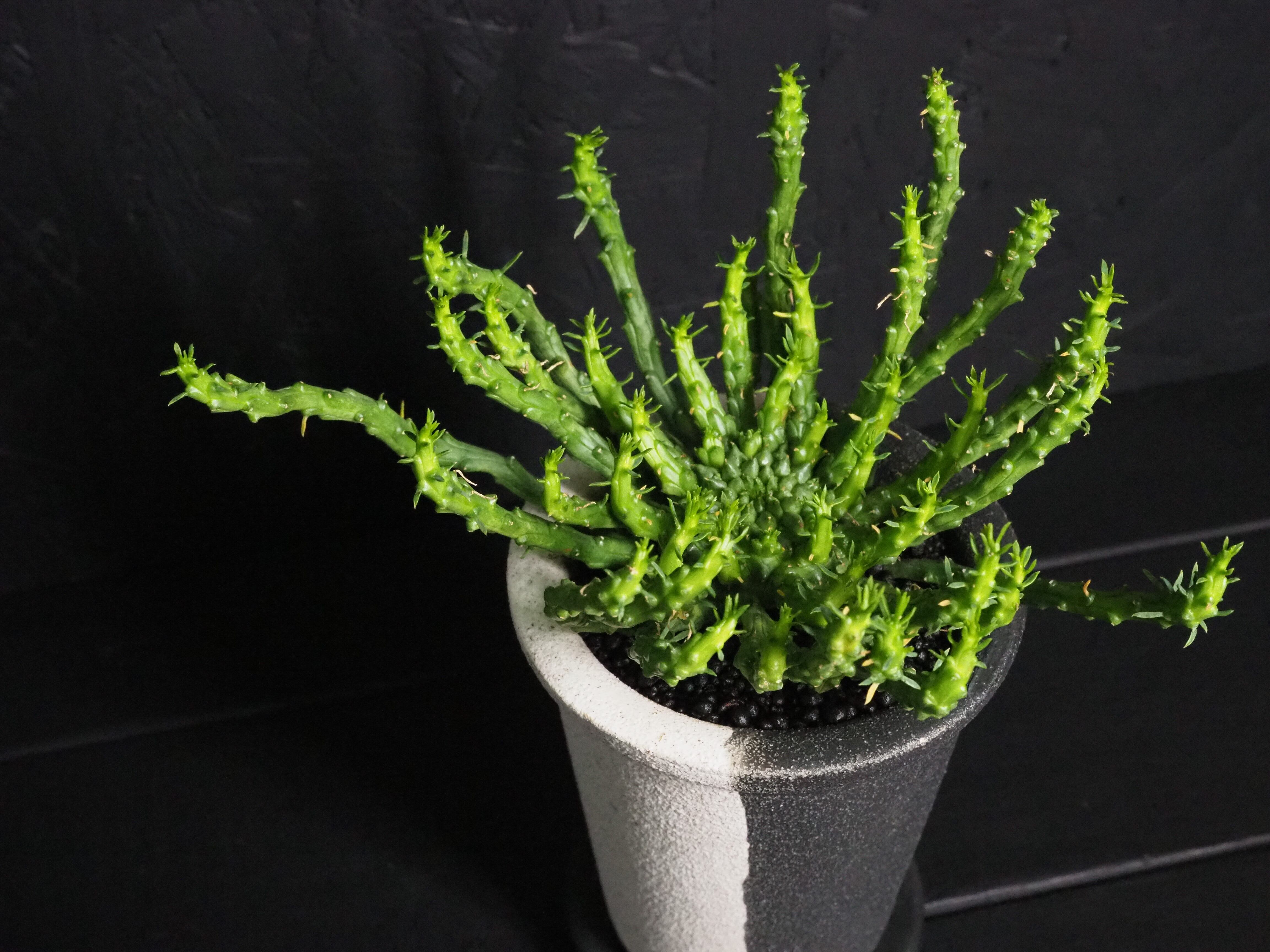 ユーフォルビアの普及種、タコもの代表種。逆円錐状の幹上部はまるでメドゥーサの頭。四方八方伸びる枝に年数回黄色い花を付けます。この個体も花が咲いています。
