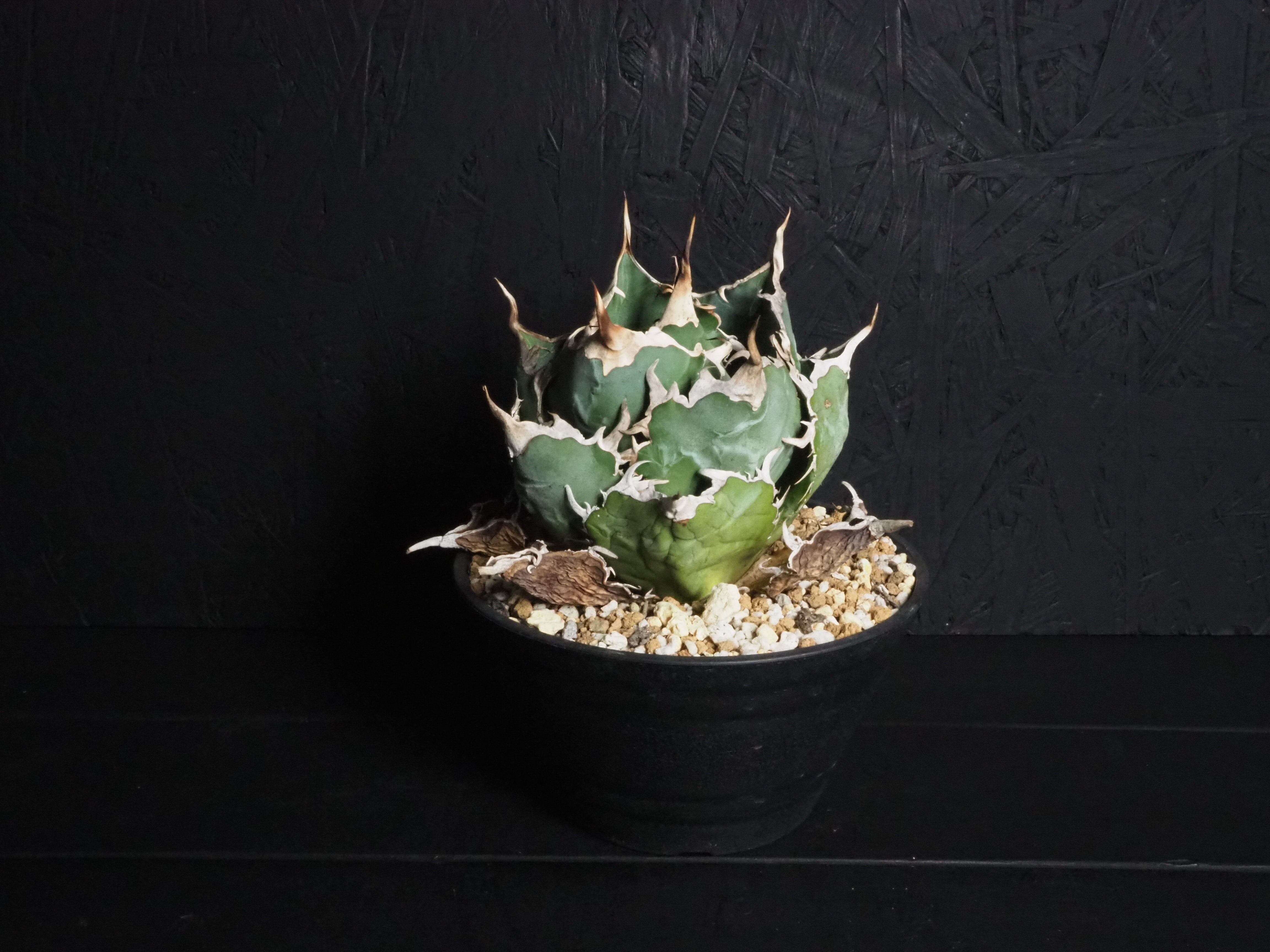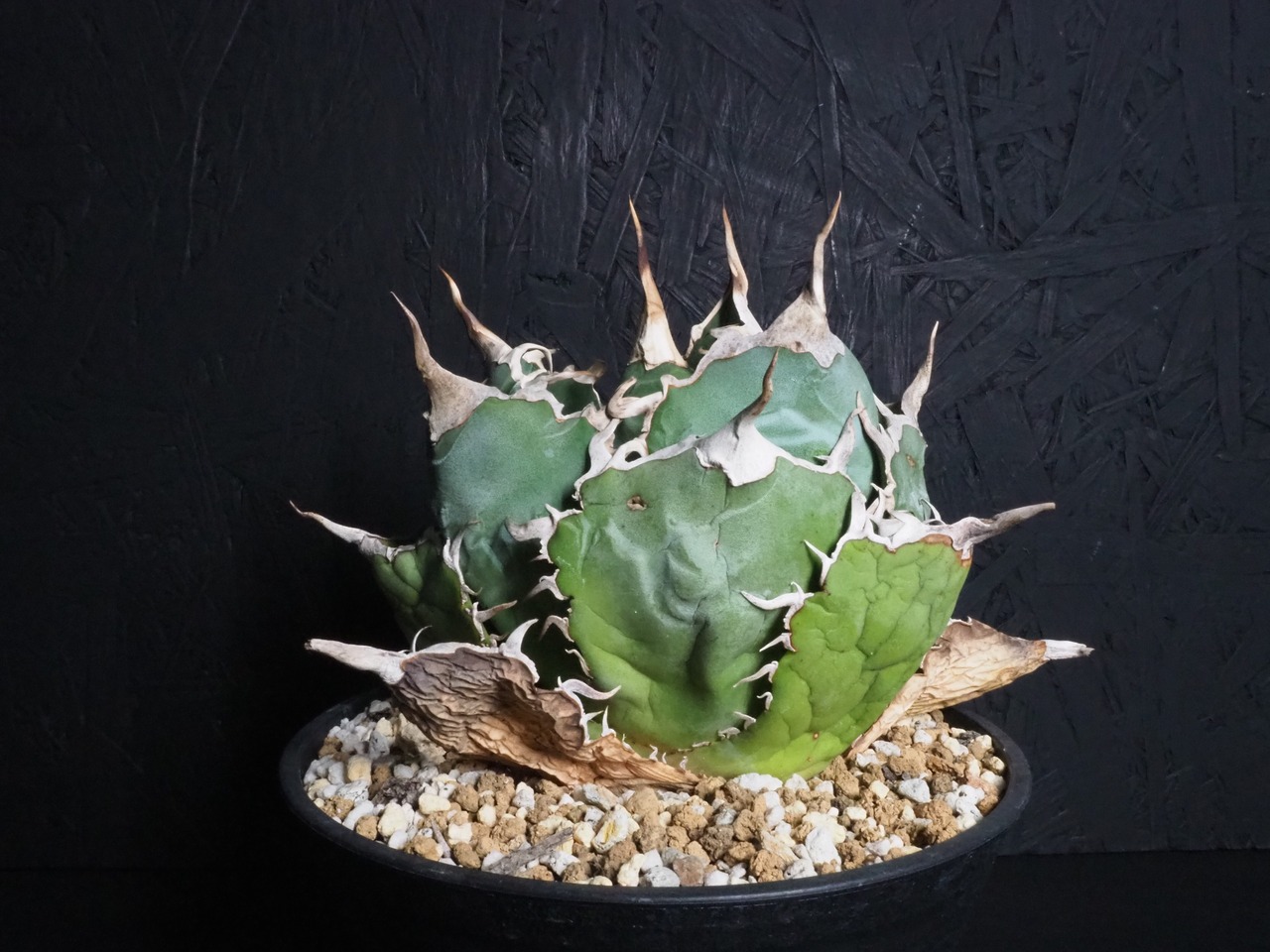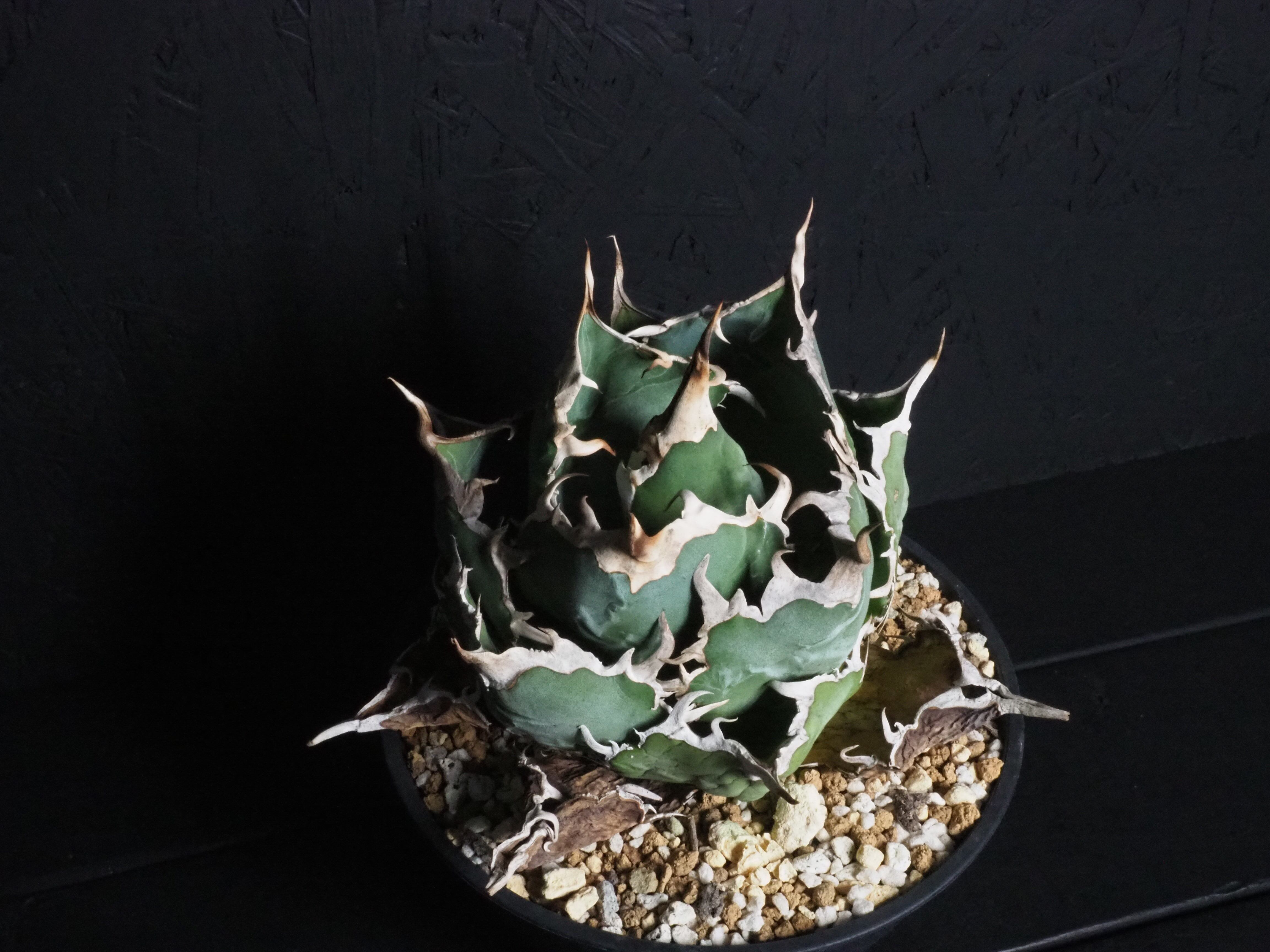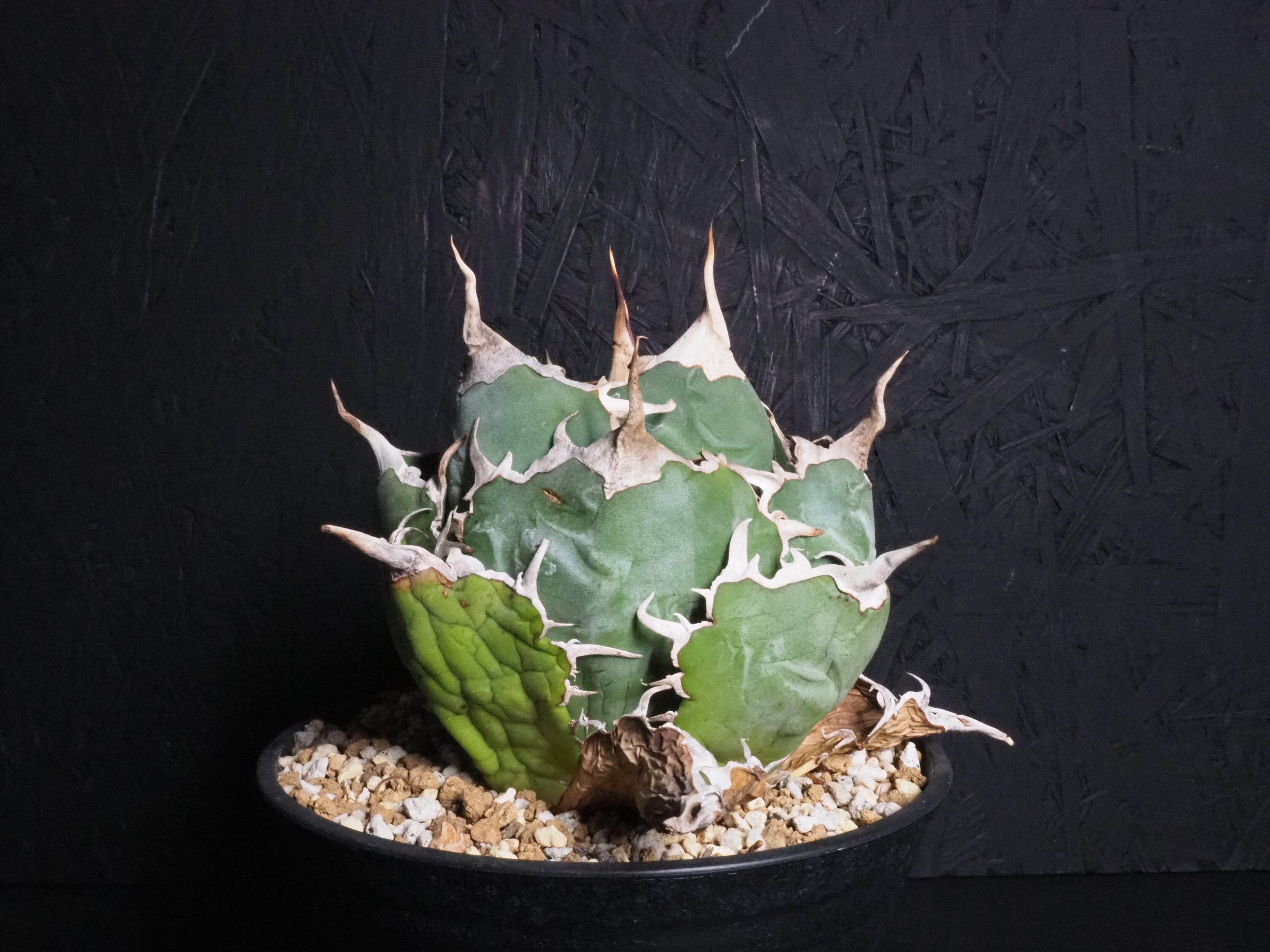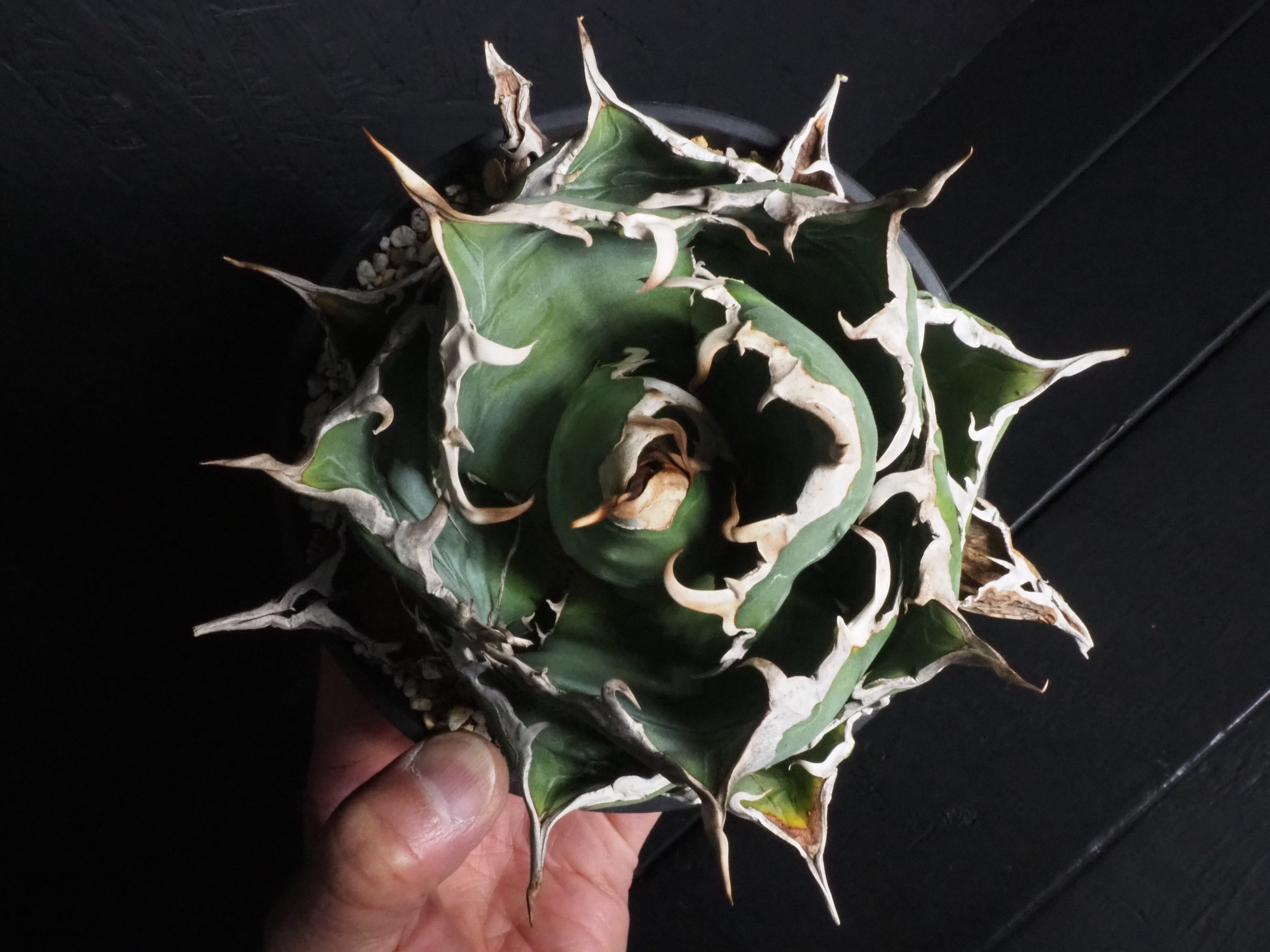 台湾から輸入したものを国内育成・発根管理した信頼の良品個体、5号平鉢で個体も大きいです。お値段強めですが、いうまでもなくしっかり発根、しっかり管理した上での販売ですので安心と共に自信をもってお届けできる株です。白鯨の美しく厳つい棘の造形美はたまりませんね。もともとアメリカからきたチタノタの中で、先の棘が白く長いアガベに「白鯨」と名付けられたのが最初のようで、日本で命名されました。