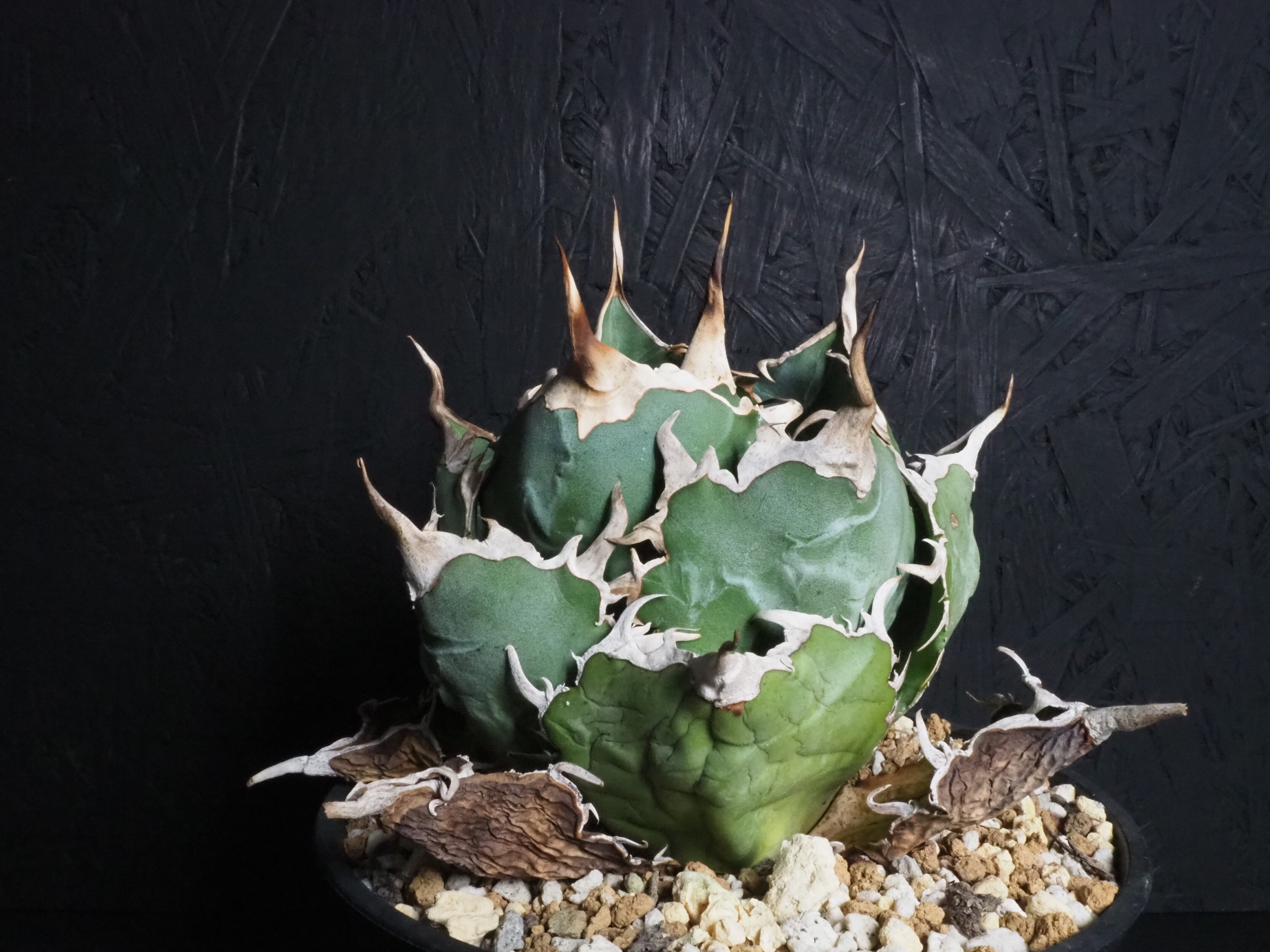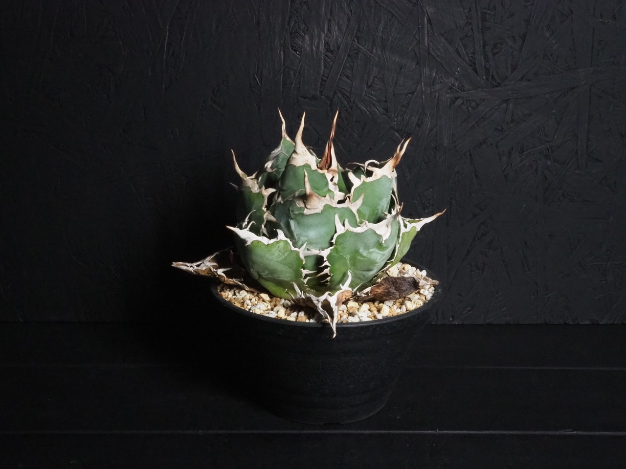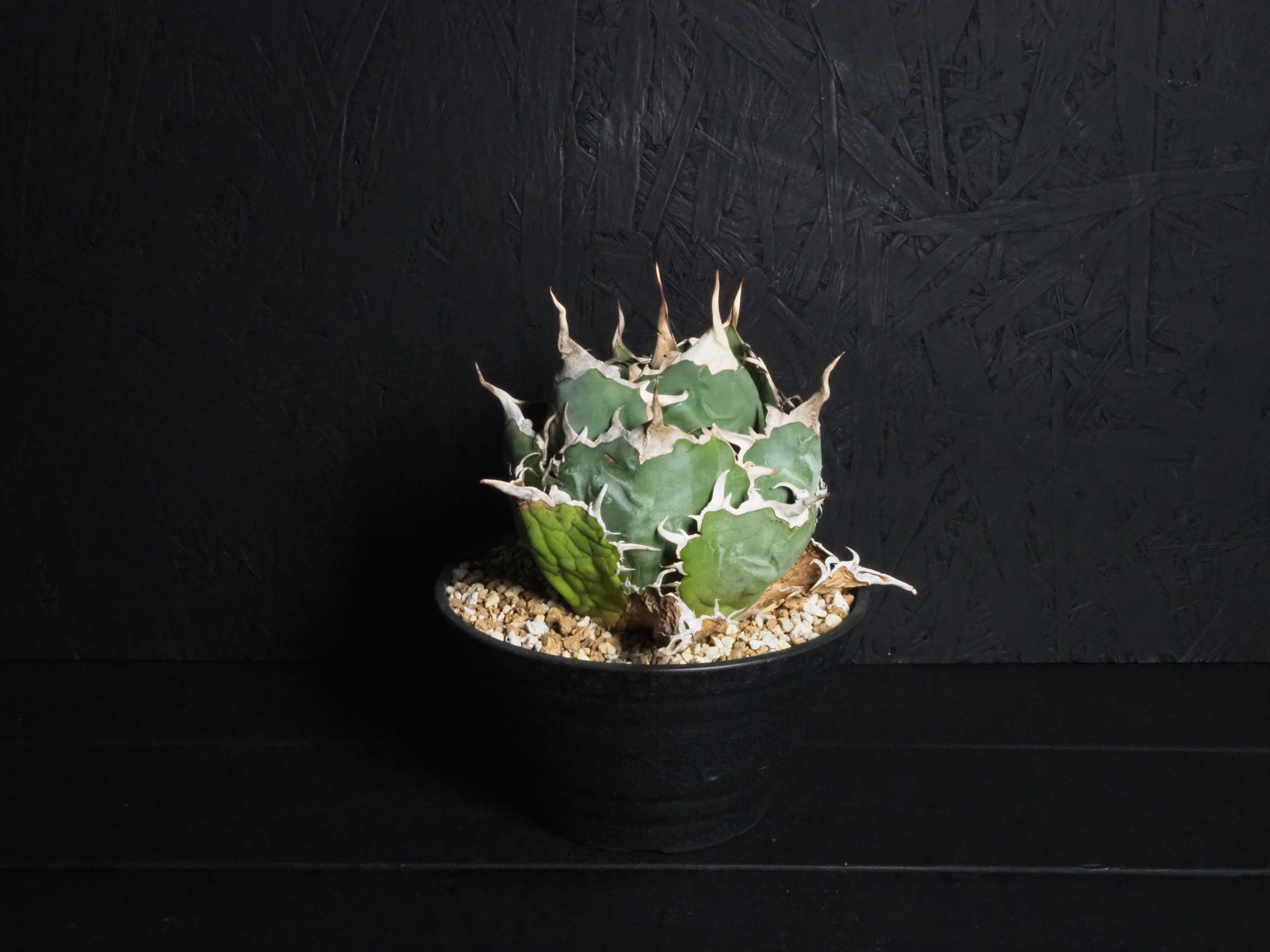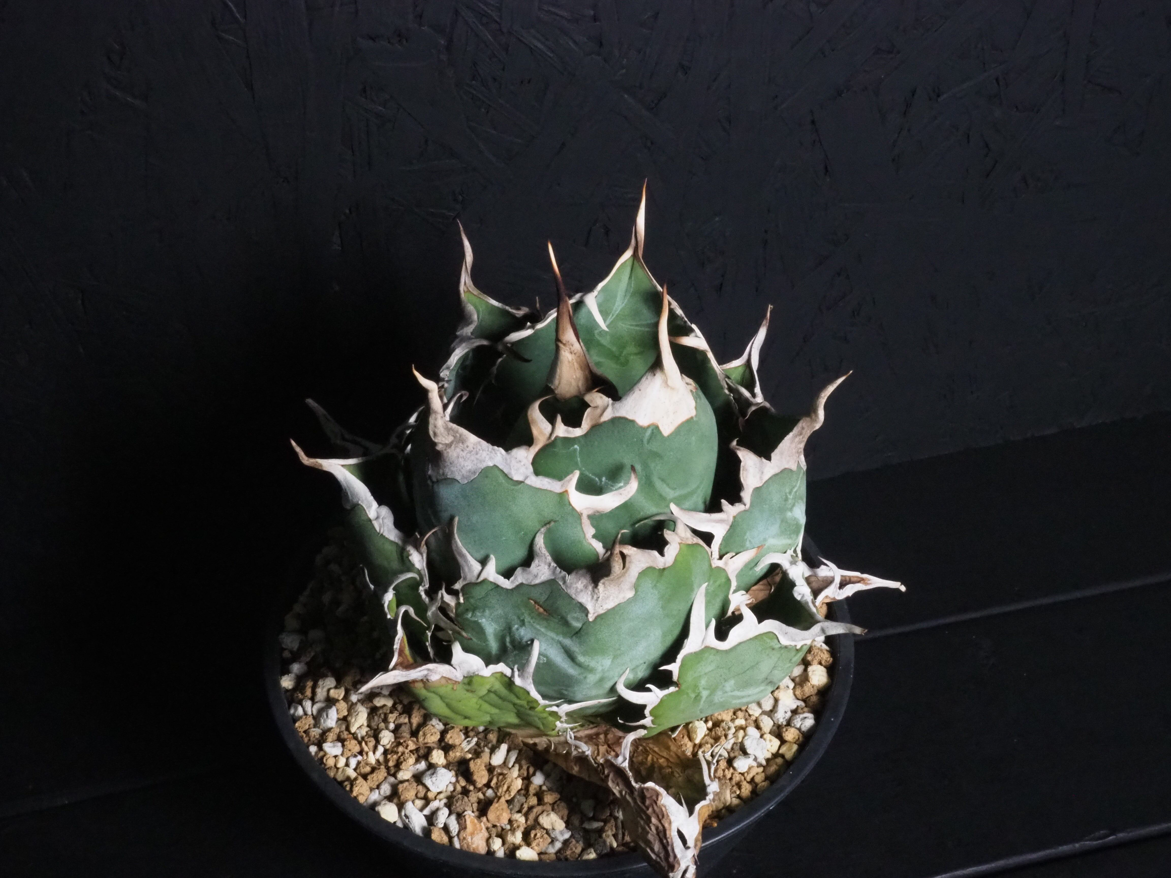 台湾から輸入したものを国内育成・発根管理した信頼の良品個体、5号平鉢で個体も大きいです。お値段強めですが、いうまでもなくしっかり発根、しっかり管理した上での販売ですので安心と共に自信をもってお届けできる株です。白鯨の美しく厳つい棘の造形美はたまりませんね。もともとアメリカからきたチタノタの中で、先の棘が白く長いアガベに「白鯨」と名付けられたのが最初のようで、日本で命名されました。