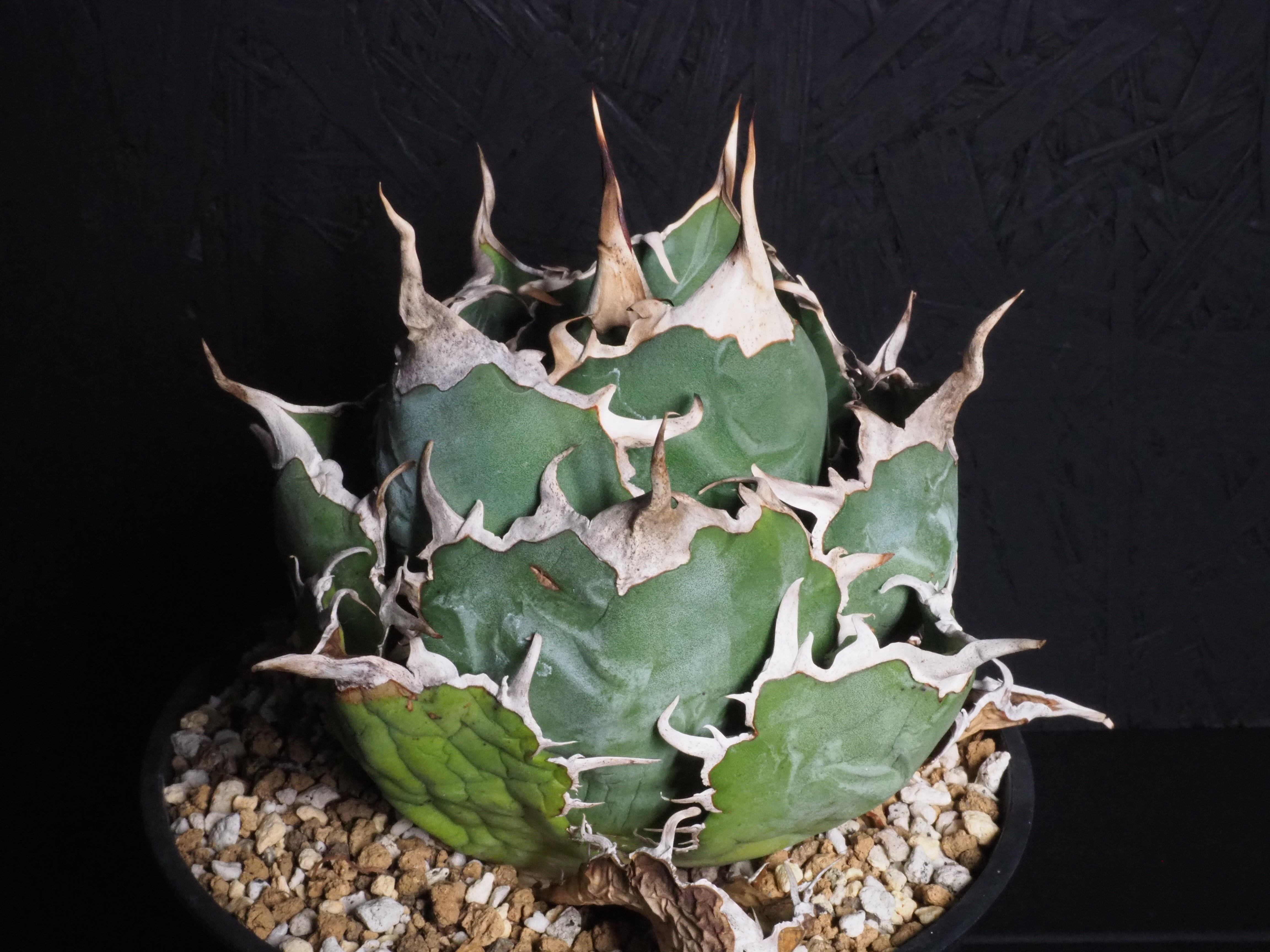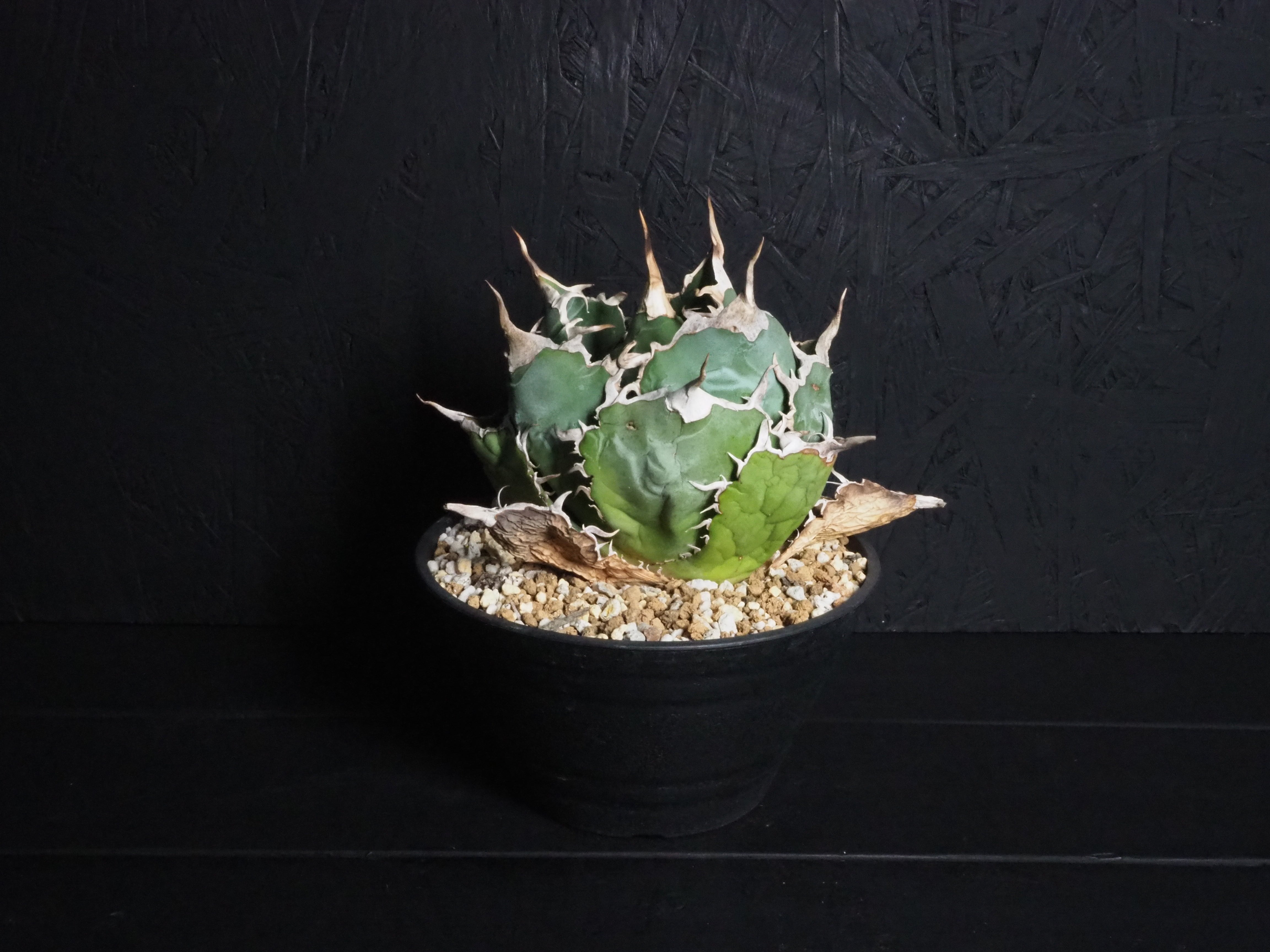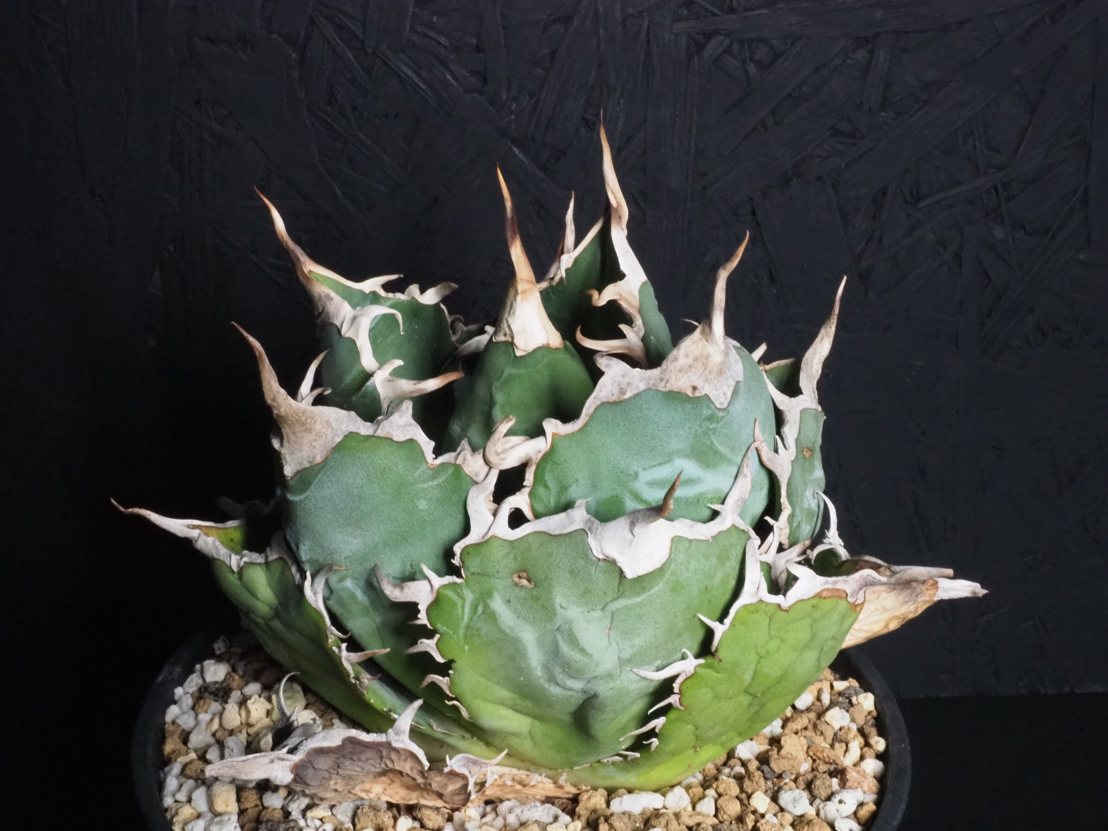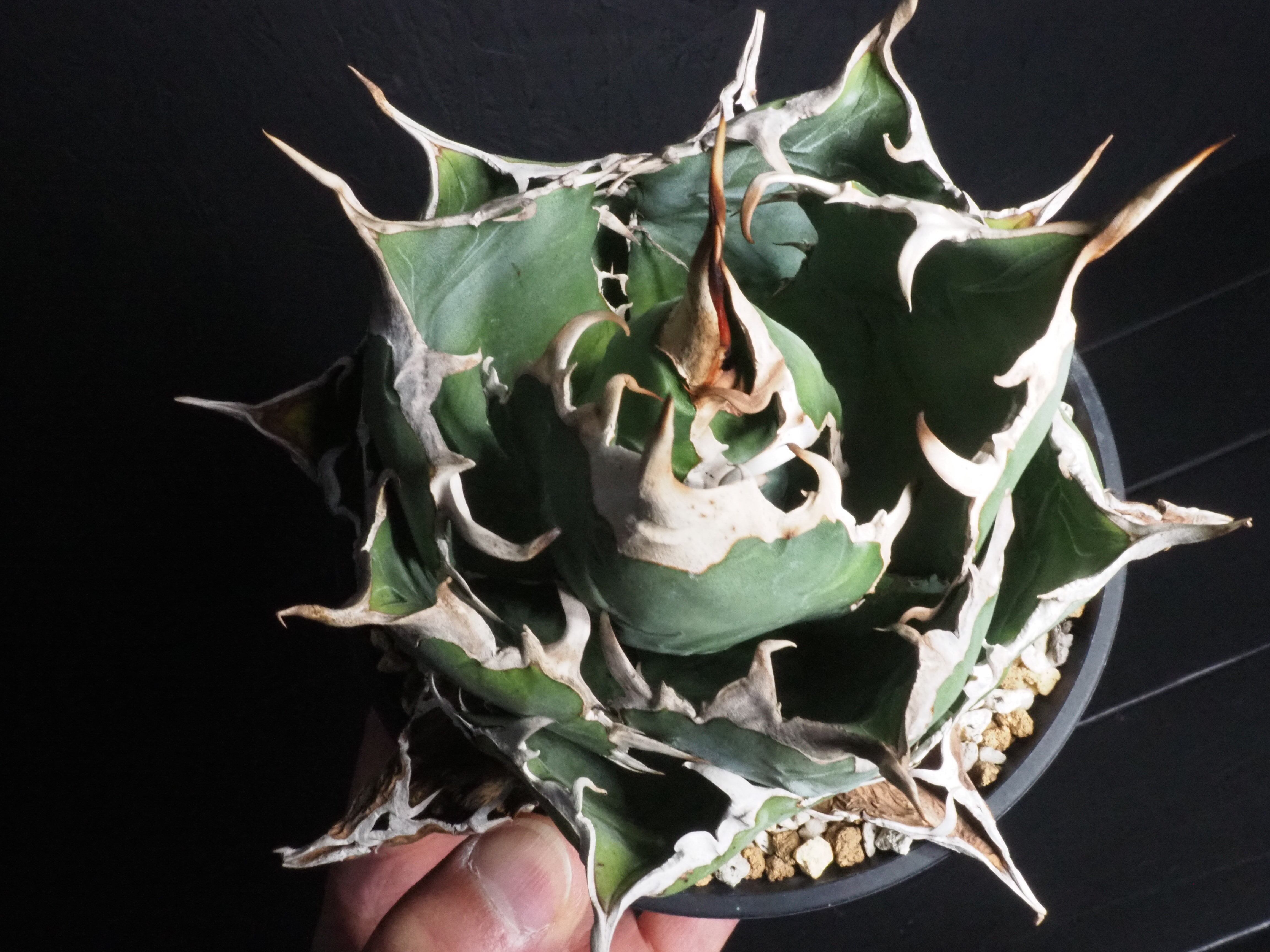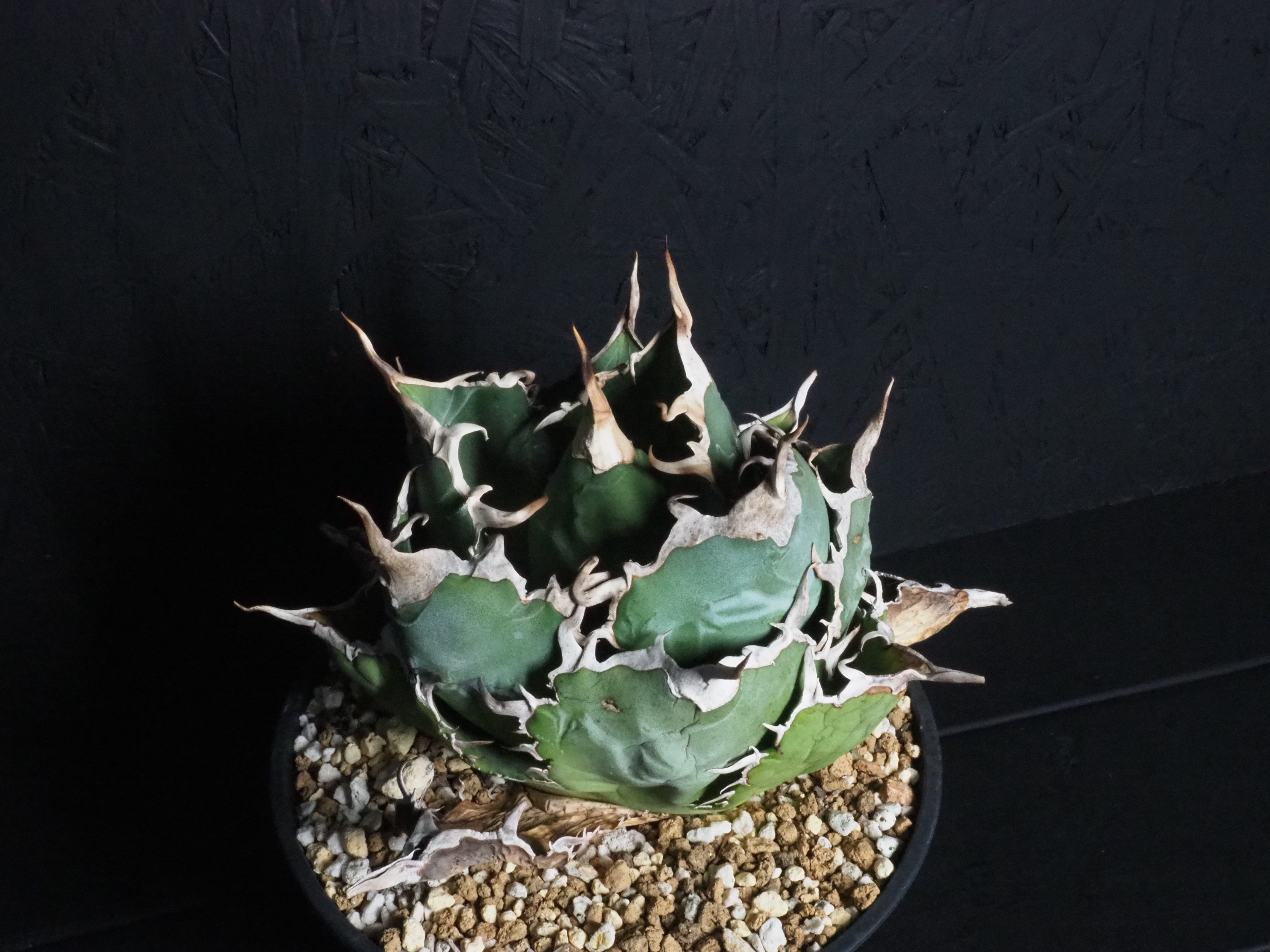 台湾から輸入したものを国内育成・発根管理した信頼の良品個体、5号平鉢で個体も大きいです。お値段強めですが、いうまでもなくしっかり発根、しっかり管理した上での販売ですので安心と共に自信をもってお届けできる株です。白鯨の美しく厳つい棘の造形美はたまりませんね。もともとアメリカからきたチタノタの中で、先の棘が白く長いアガベに「白鯨」と名付けられたのが最初のようで、日本で命名されました。