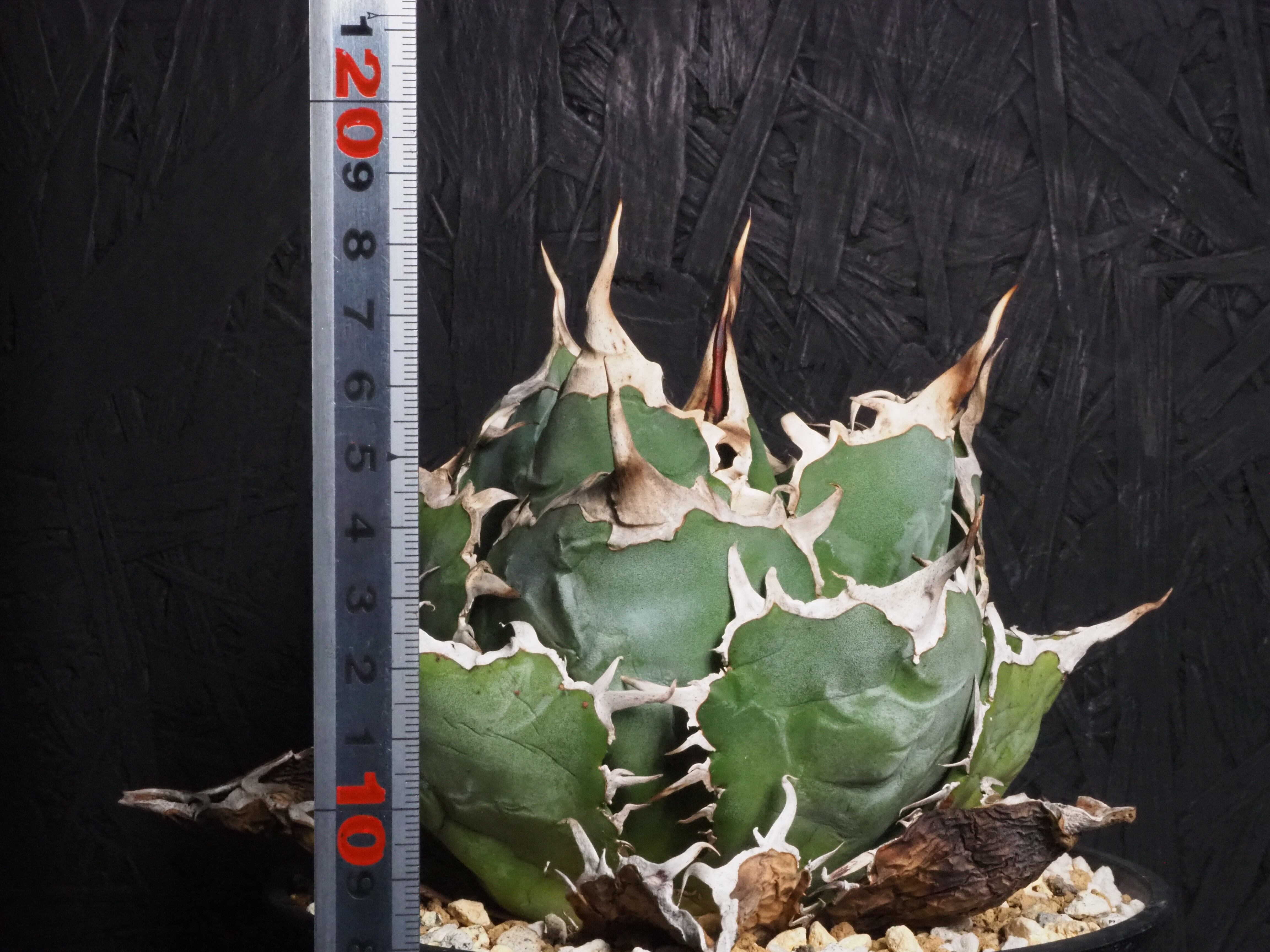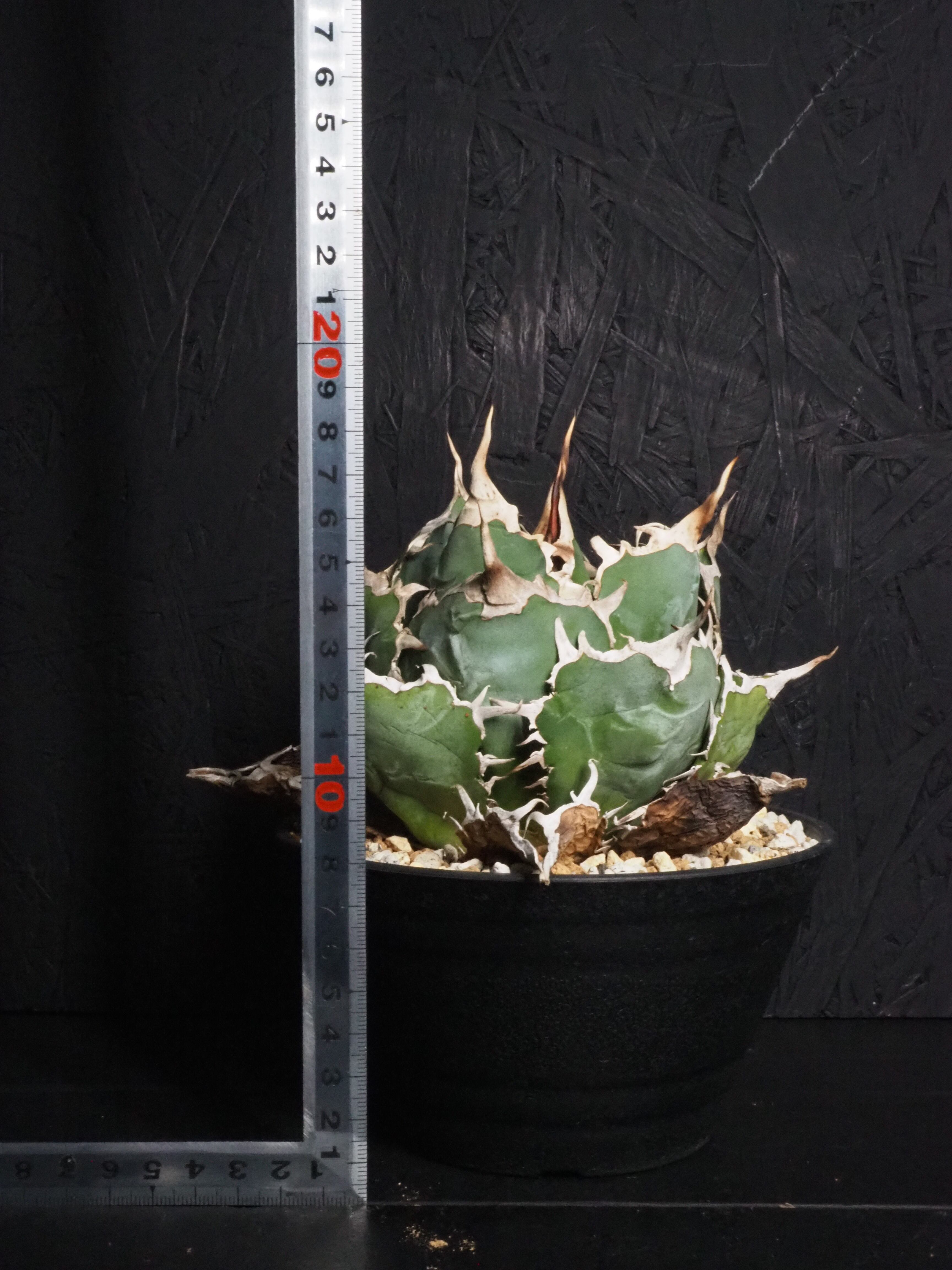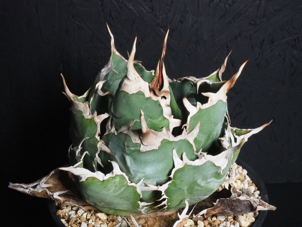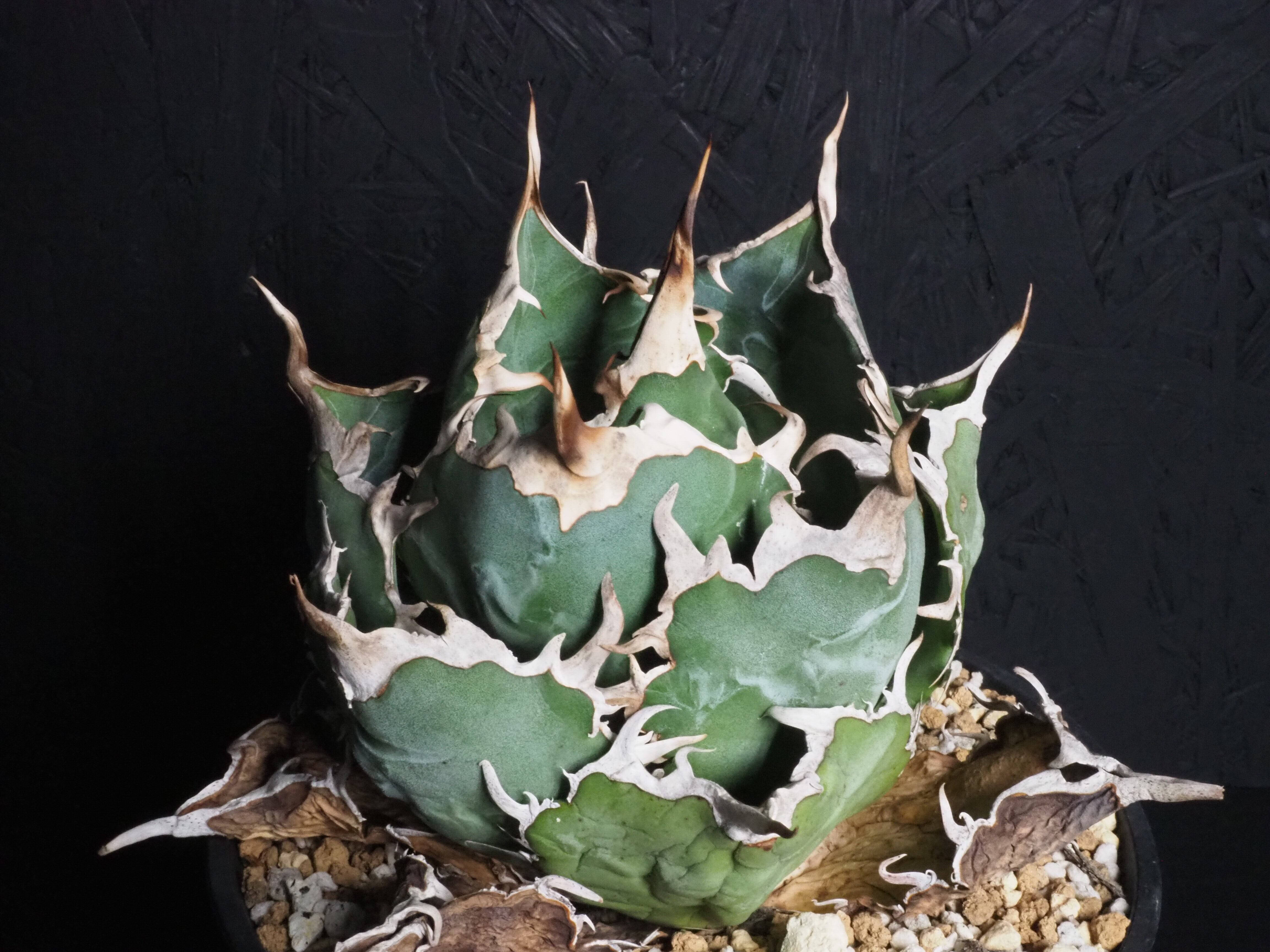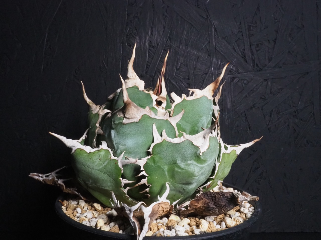 台湾から輸入したものを国内育成・発根管理した信頼の良品個体、5号平鉢で個体も大きいです。お値段強めですが、いうまでもなくしっかり発根、しっかり管理した上での販売ですので安心と共に自信をもってお届けできる株です。白鯨の美しく厳つい棘の造形美はたまりませんね。もともとアメリカからきたチタノタの中で、先の棘が白く長いアガベに「白鯨」と名付けられたのが最初のようで、日本で命名されました。