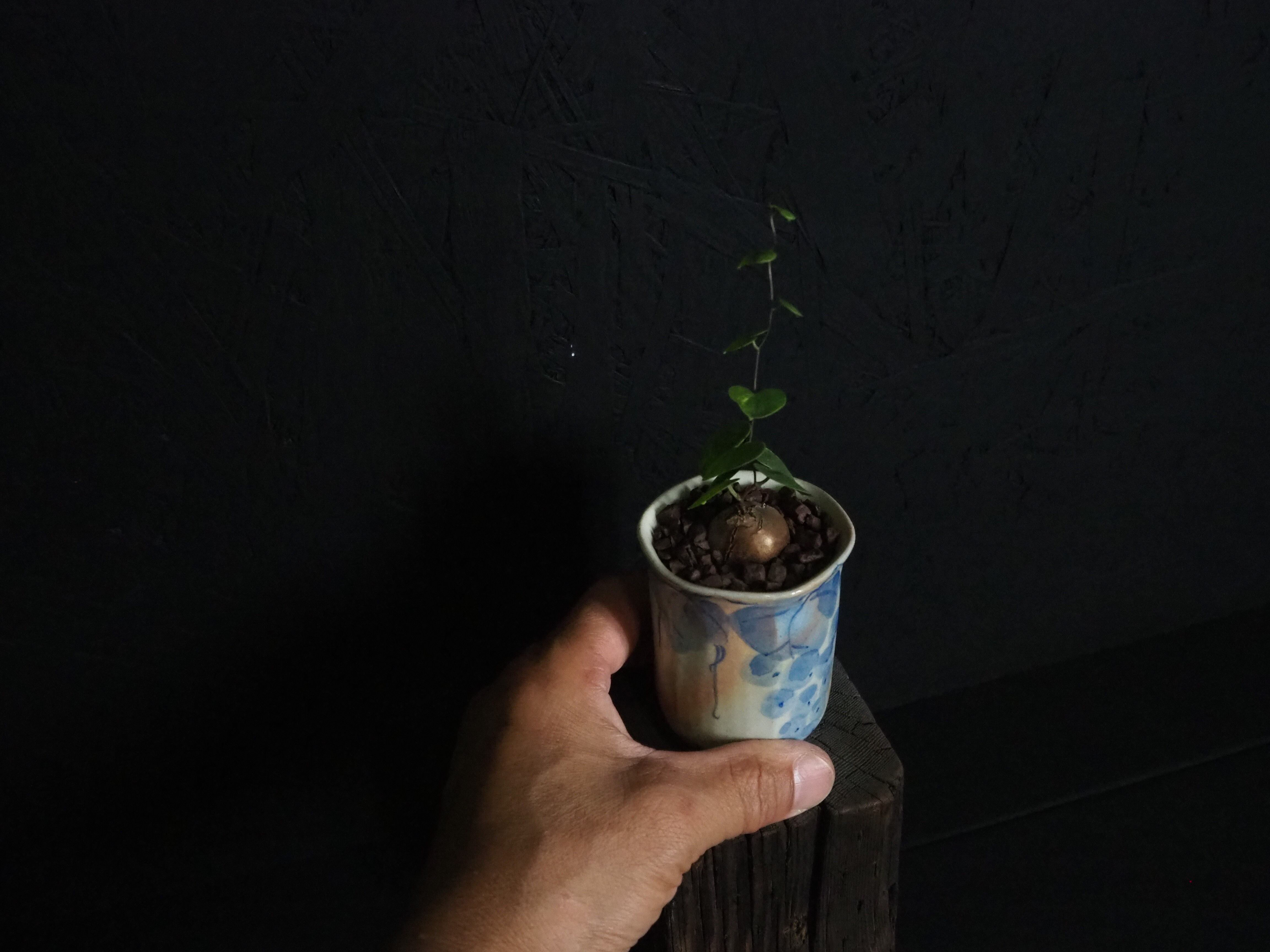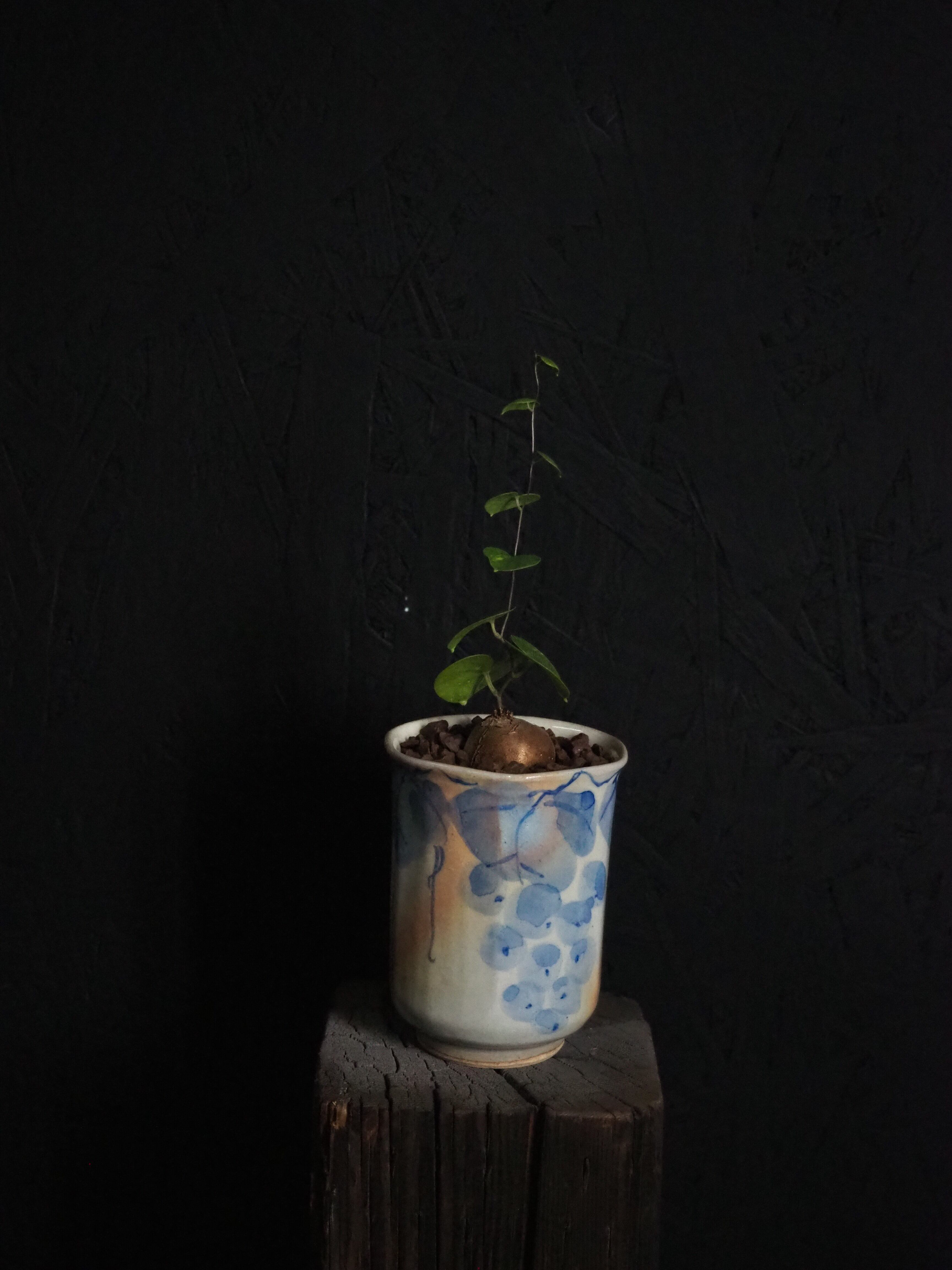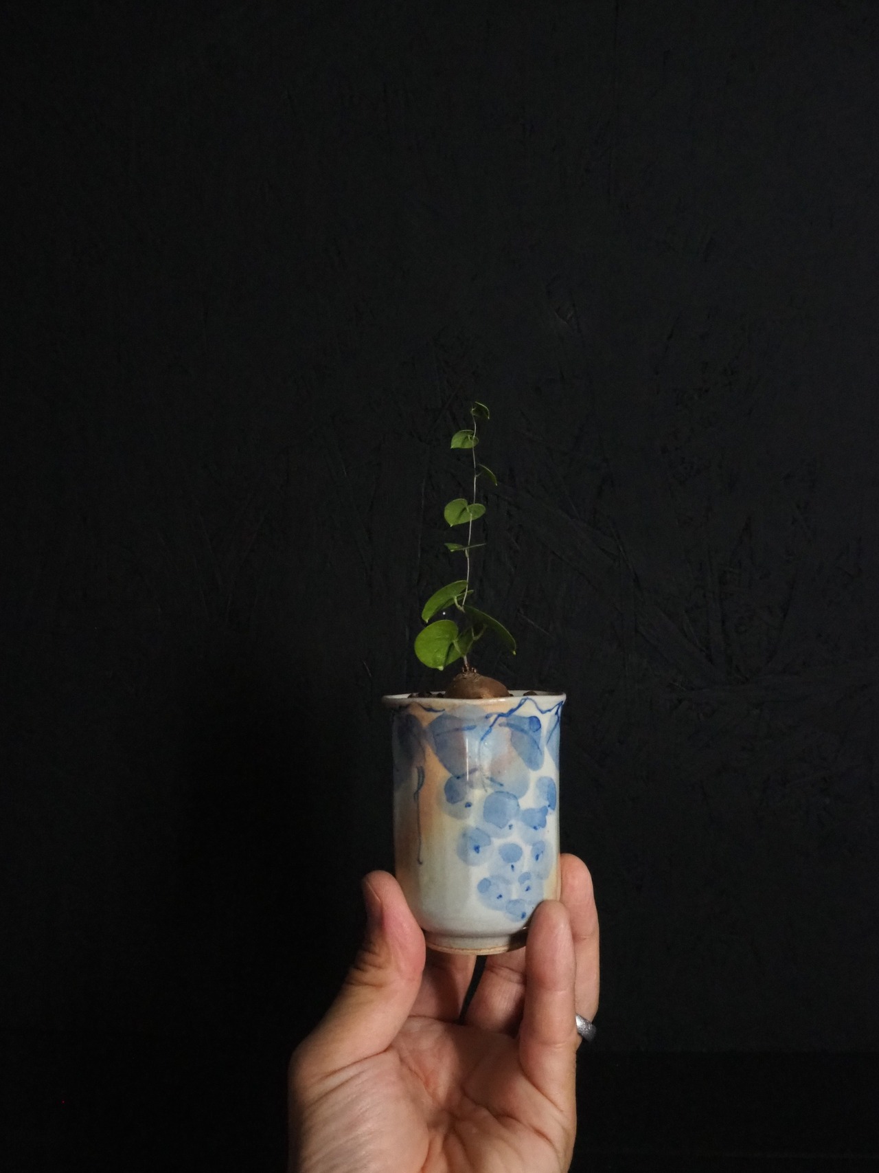 古き良き昭和時代の湯呑みに底穴を開けて鉢にリメイクし、実生のミニ亀甲竜を設えました。これから少しずつ生長し、だんだん塊根がひび割れて成人クラスになると亀の甲羅のようになっていきます。発根状態もバッチリです。