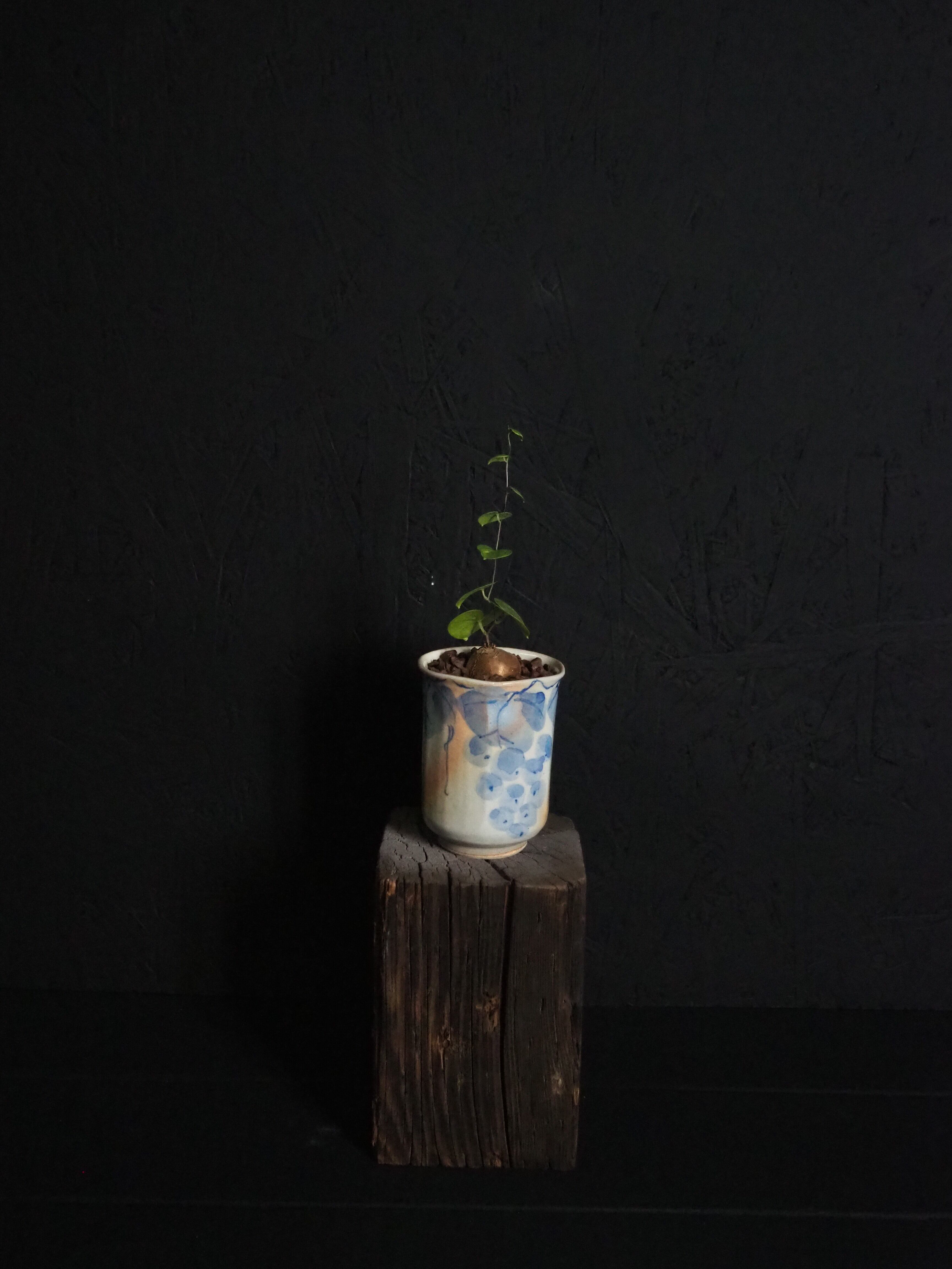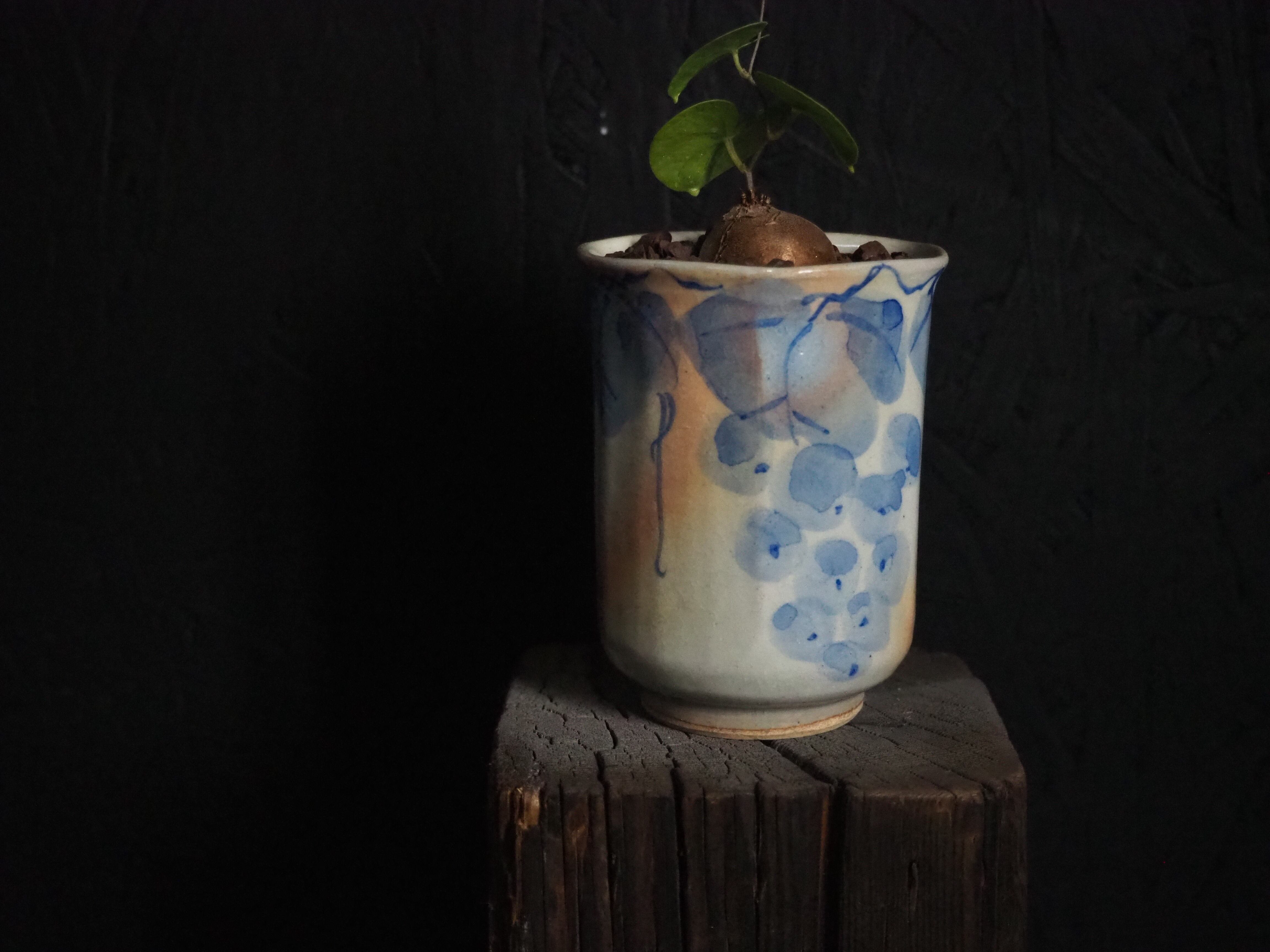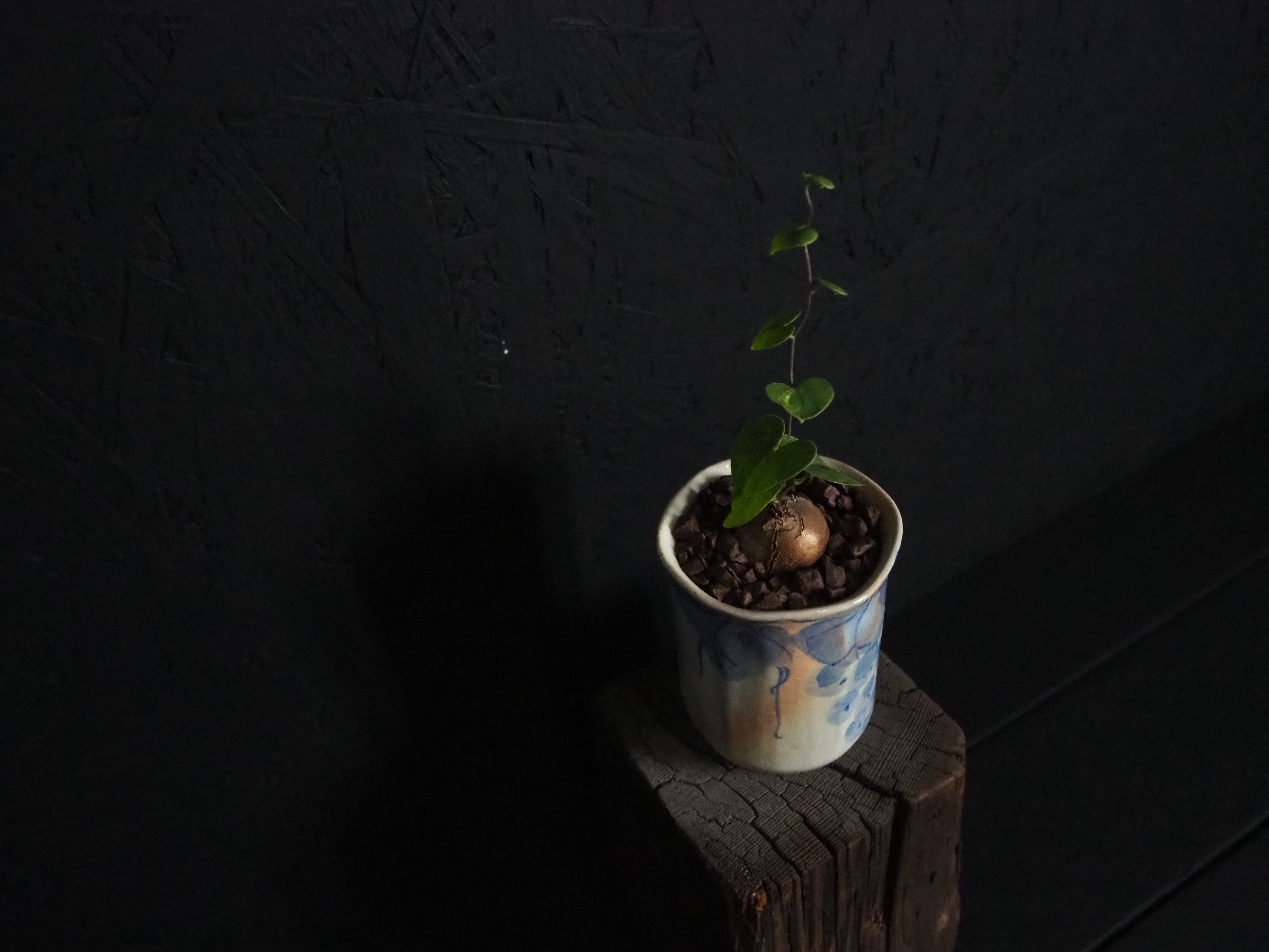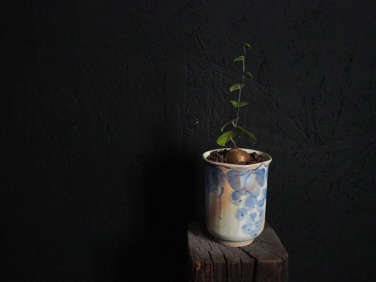 古き良き昭和時代の湯呑みに底穴を開けて鉢にリメイクし、実生のミニ亀甲竜を設えました。これから少しずつ生長し、だんだん塊根がひび割れて成人クラスになると亀の甲羅のようになっていきます。発根状態もバッチリです。