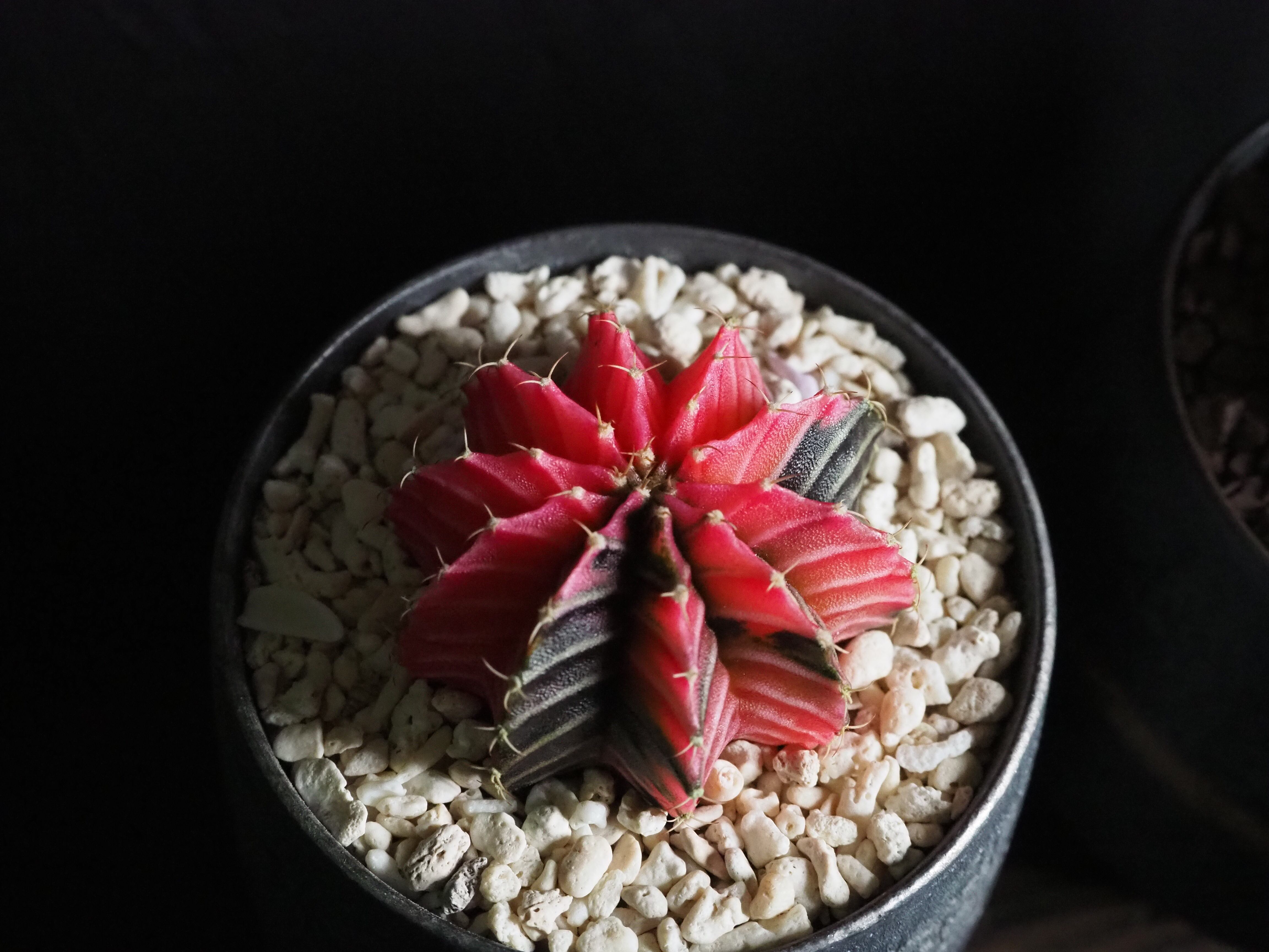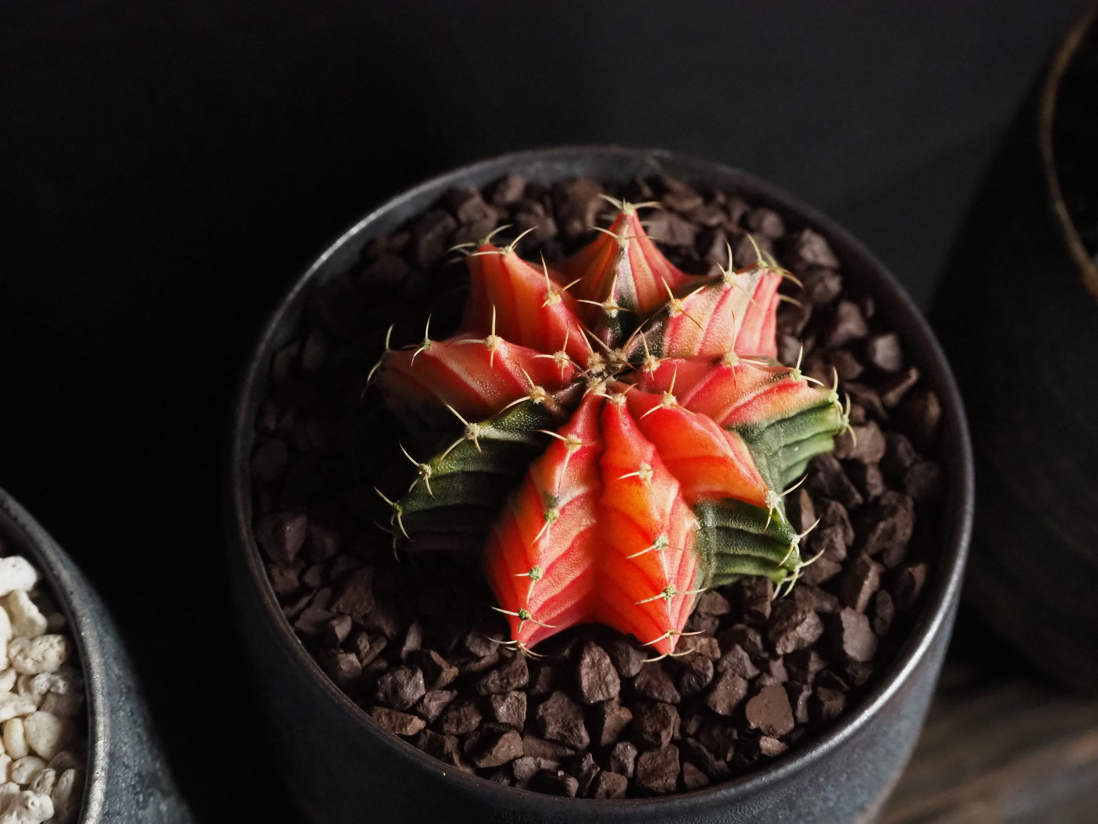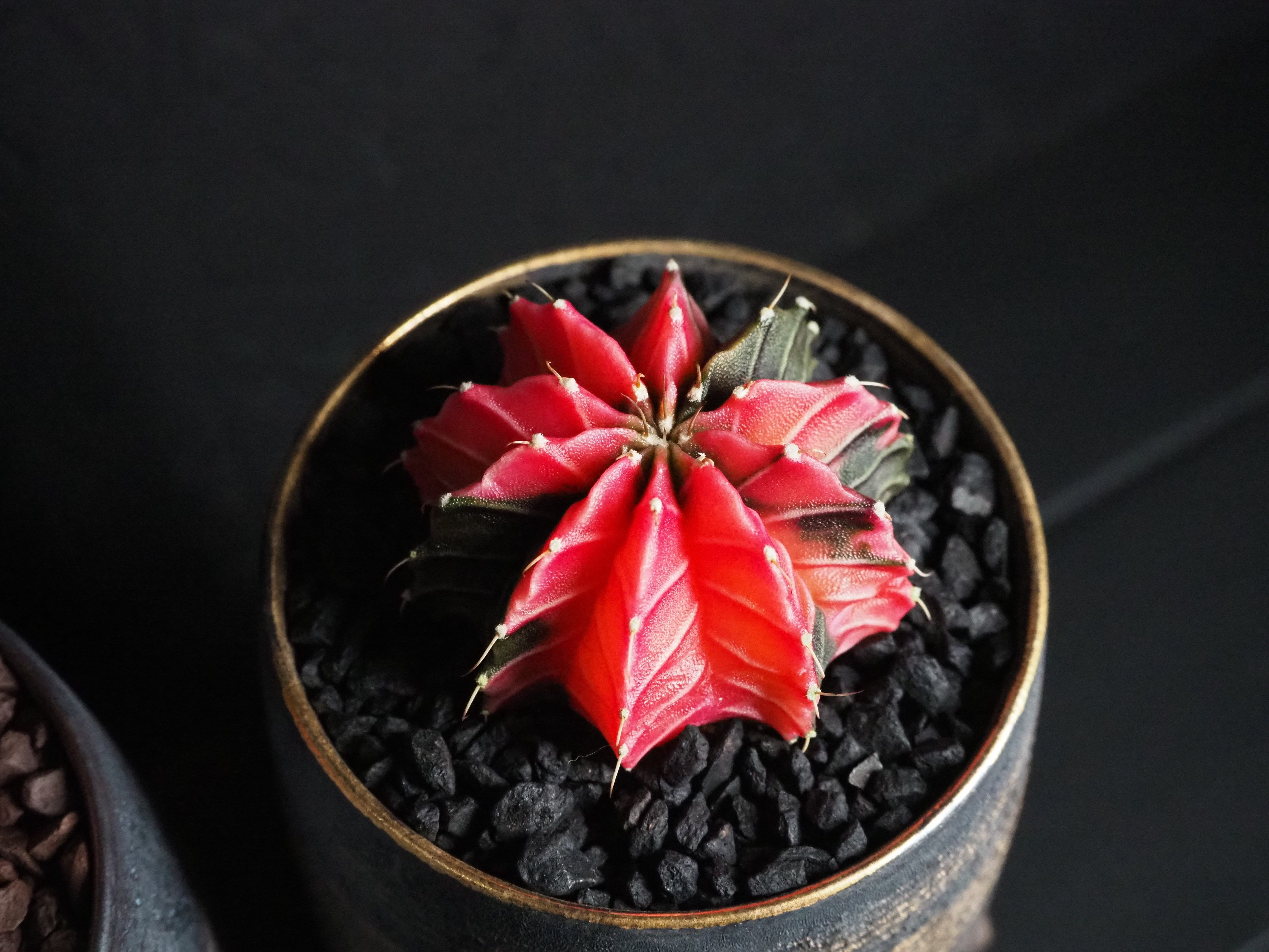 赤系、オレンジ系、ピンク系など、発色が大変強く非常に鮮やかで美しいのが最大の特徴です。それらが幾何学的な模様で絡みあい発色する様は正にアメージング。素晴らしいハイブリッドサボテンです。