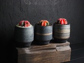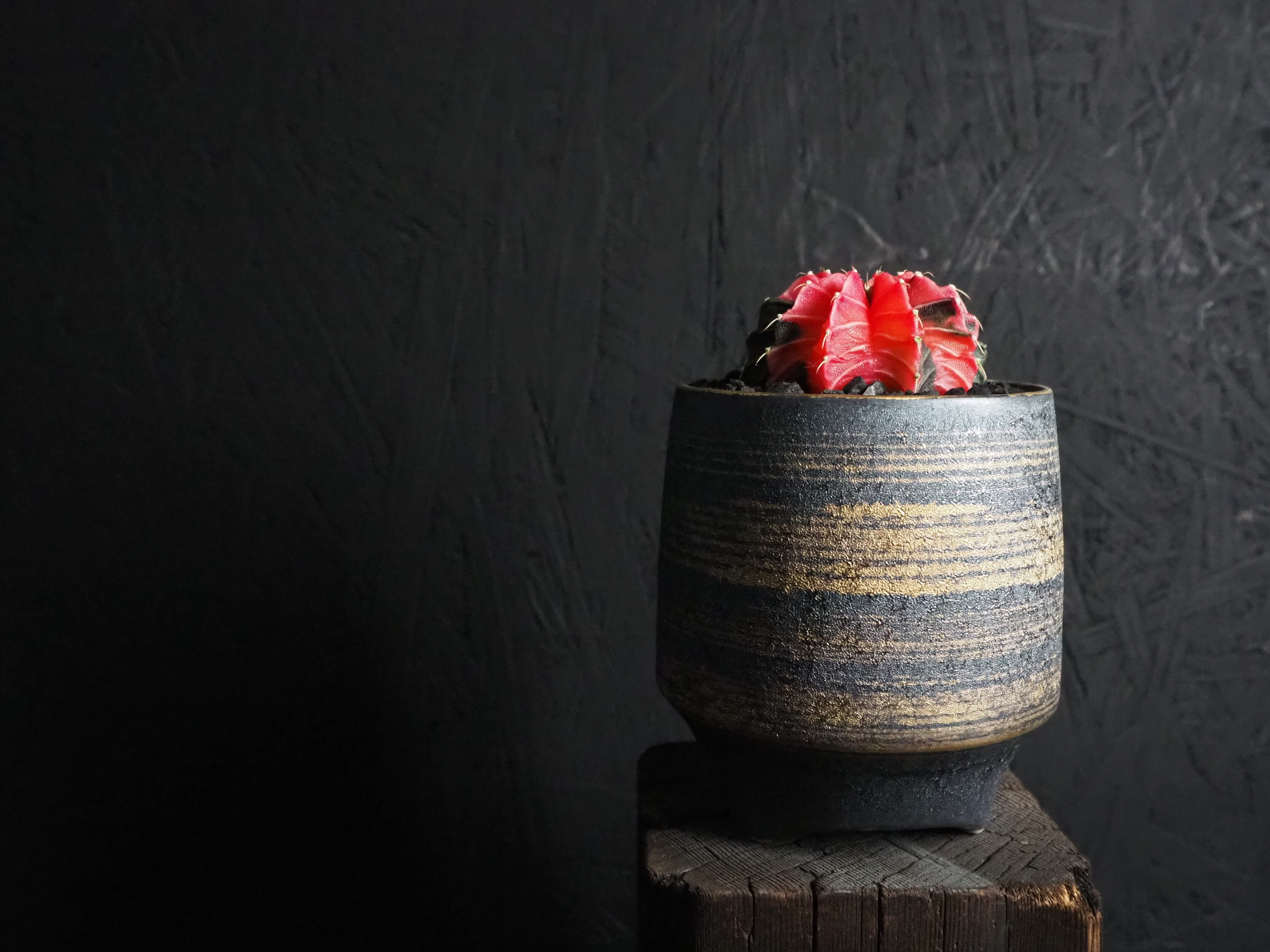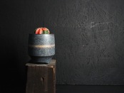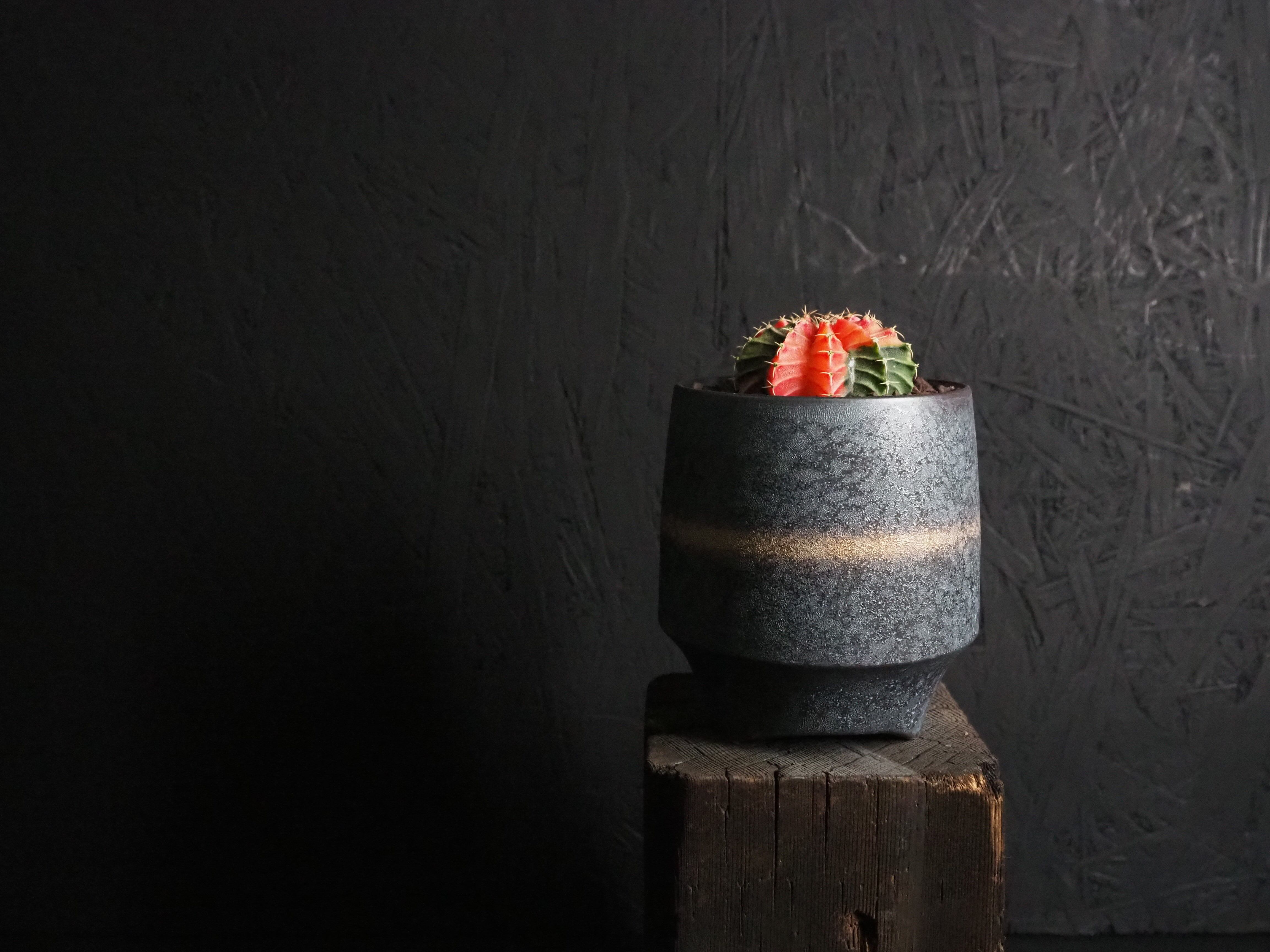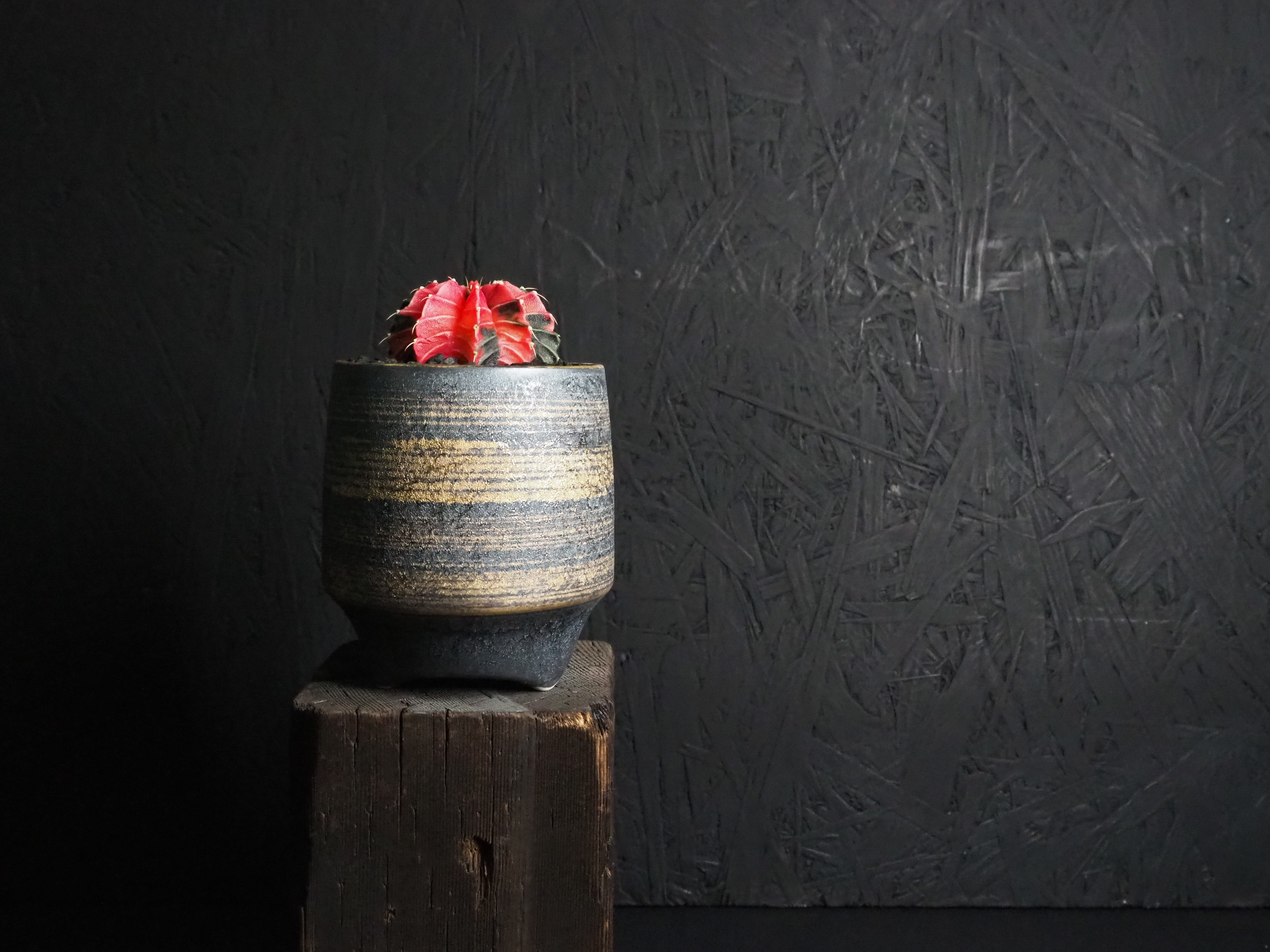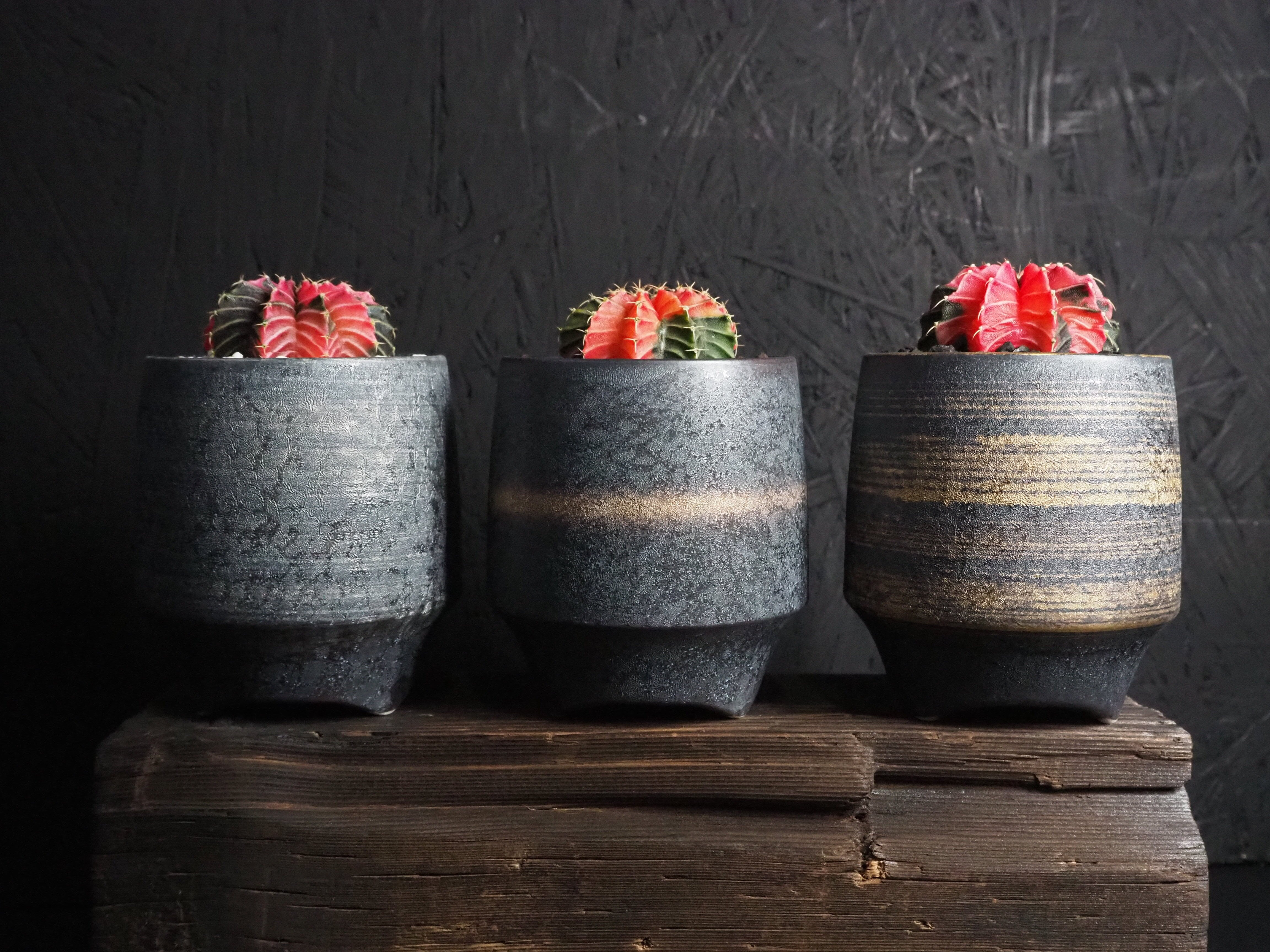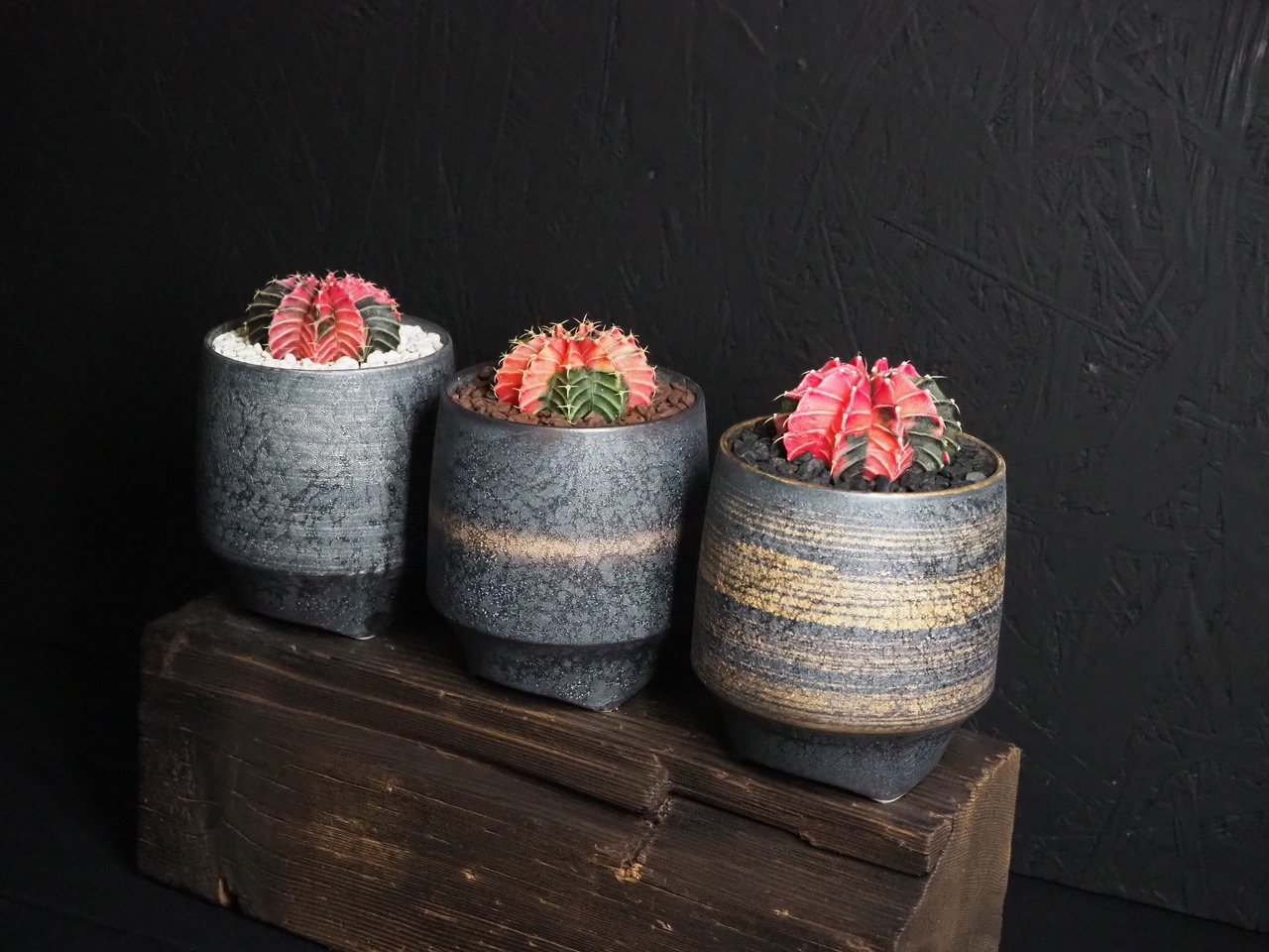 有田波佐見にLB2178ハイブリッド錦を合わせた、ジワジワと渋さが染み出てくるような一品に仕上げました。Trioで並べて観賞すると更に深みが増すような何とも言えない雰囲気を醸し出しています。底穴は23㎜で水捌けも良き。管理しやすいようしっかり考えてフィットさせています。