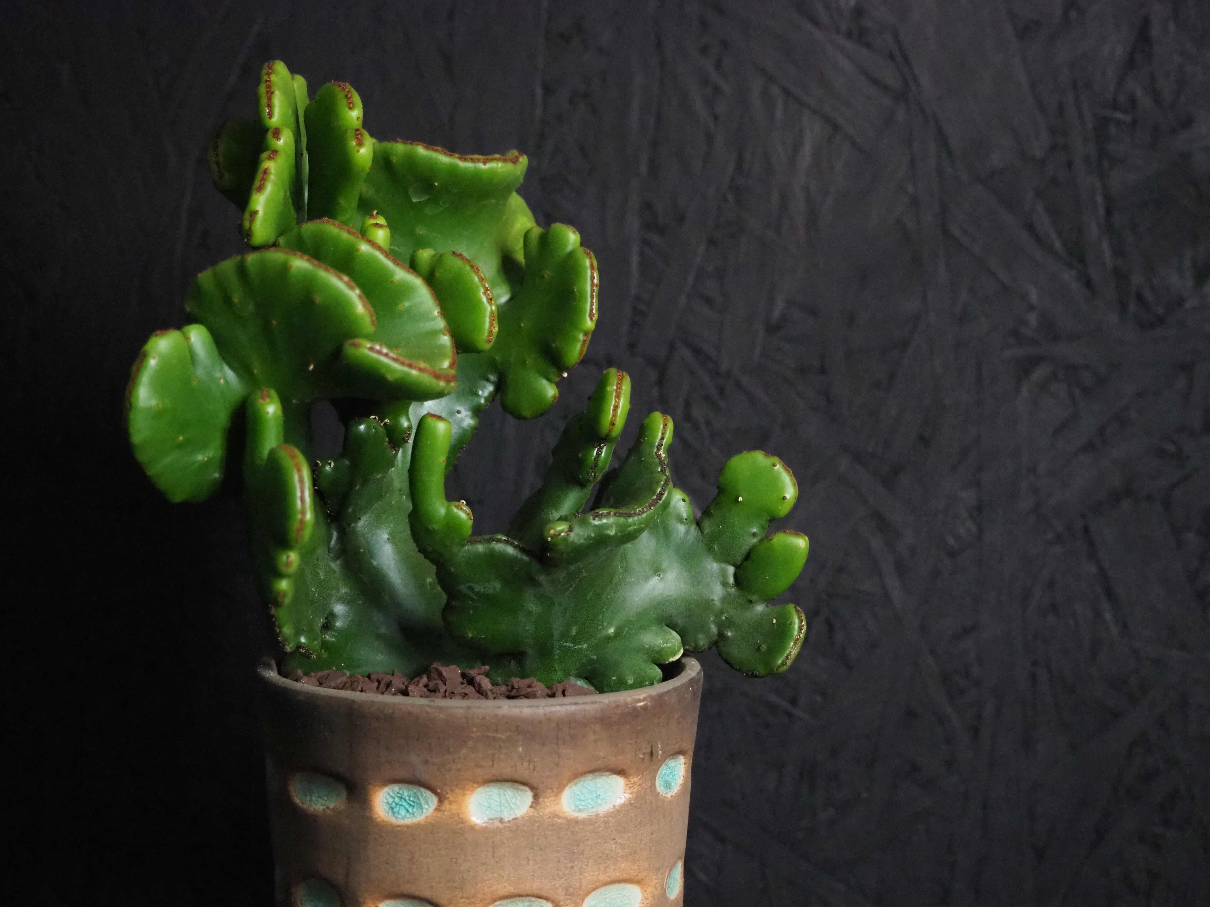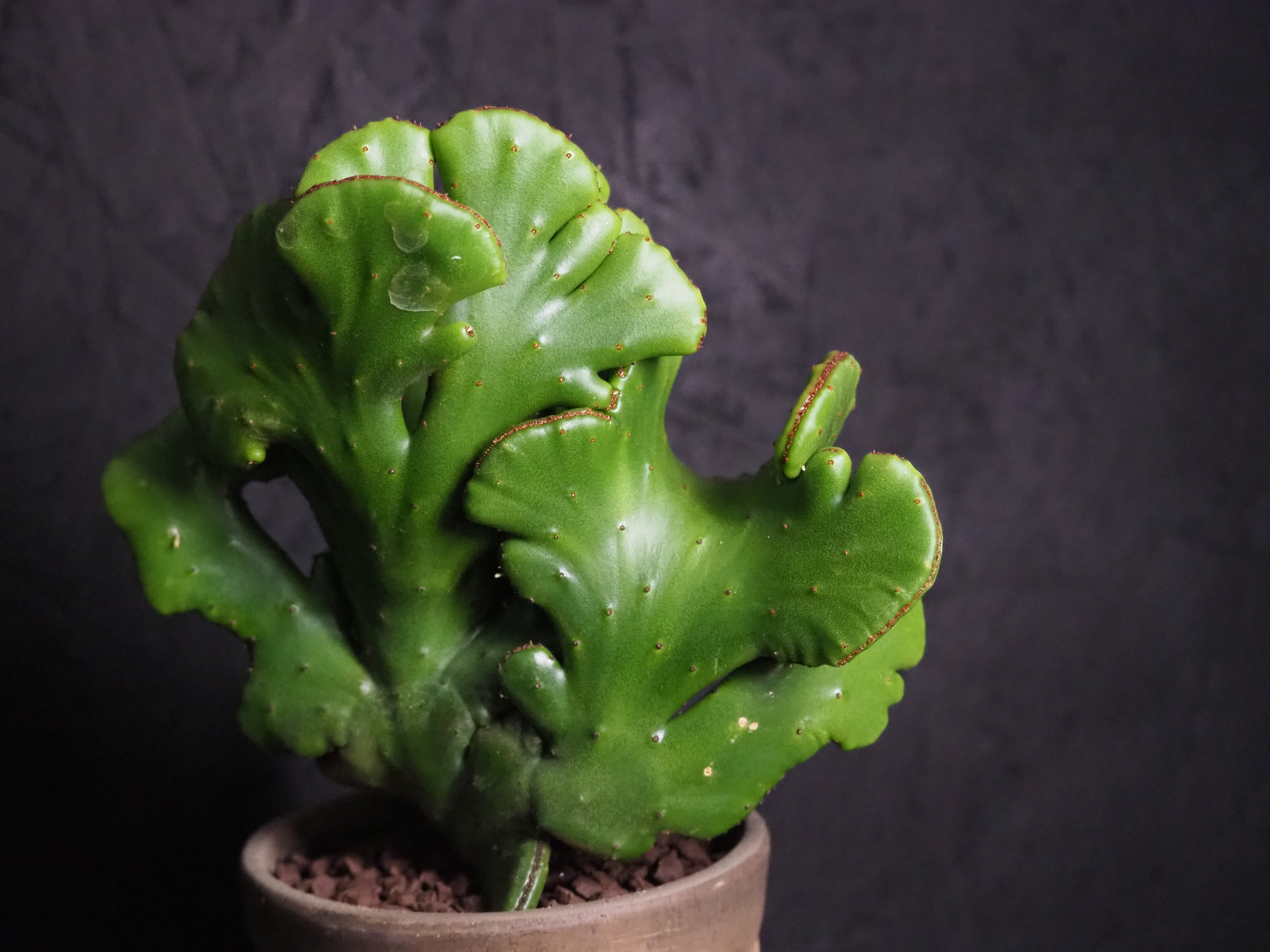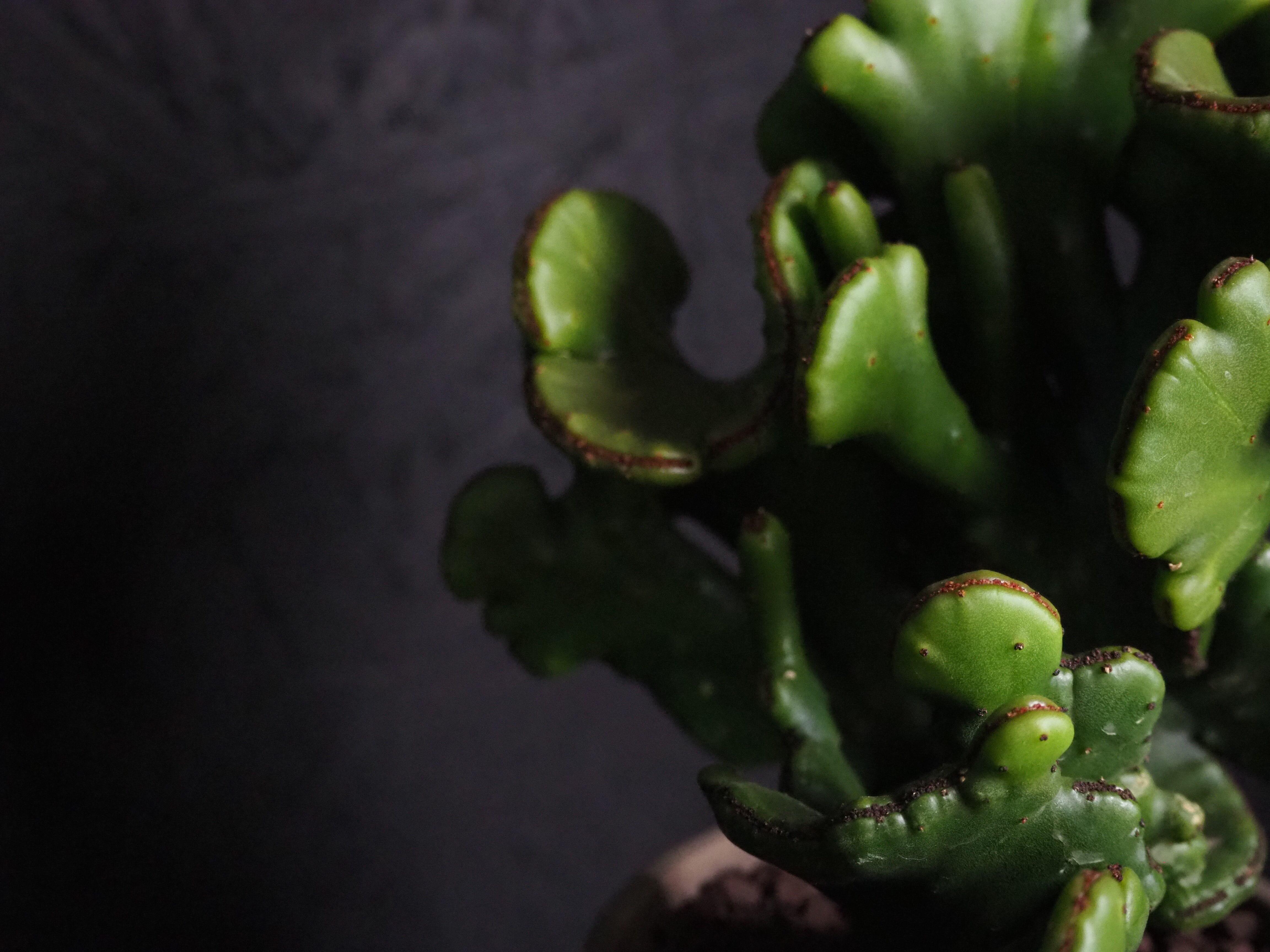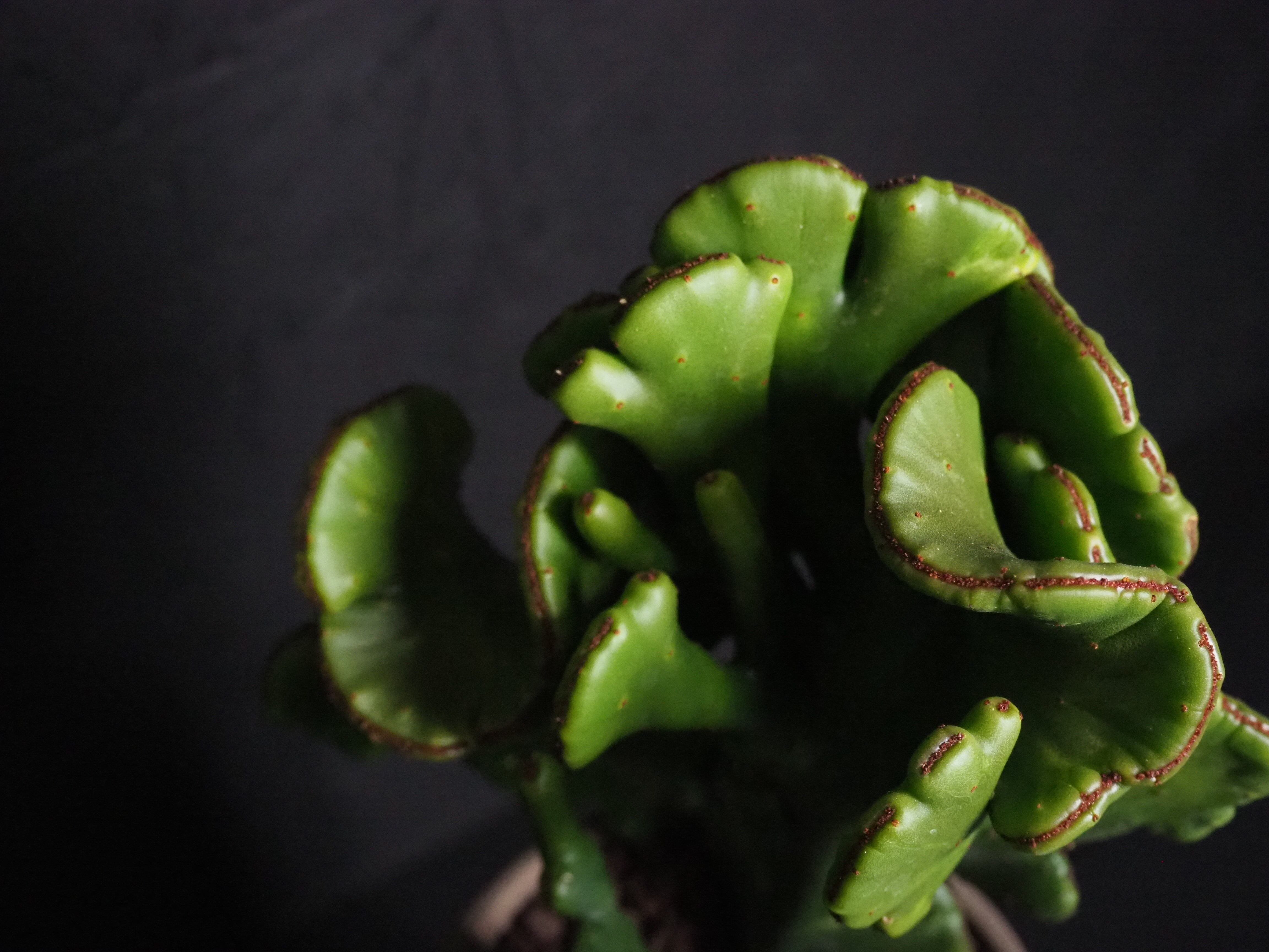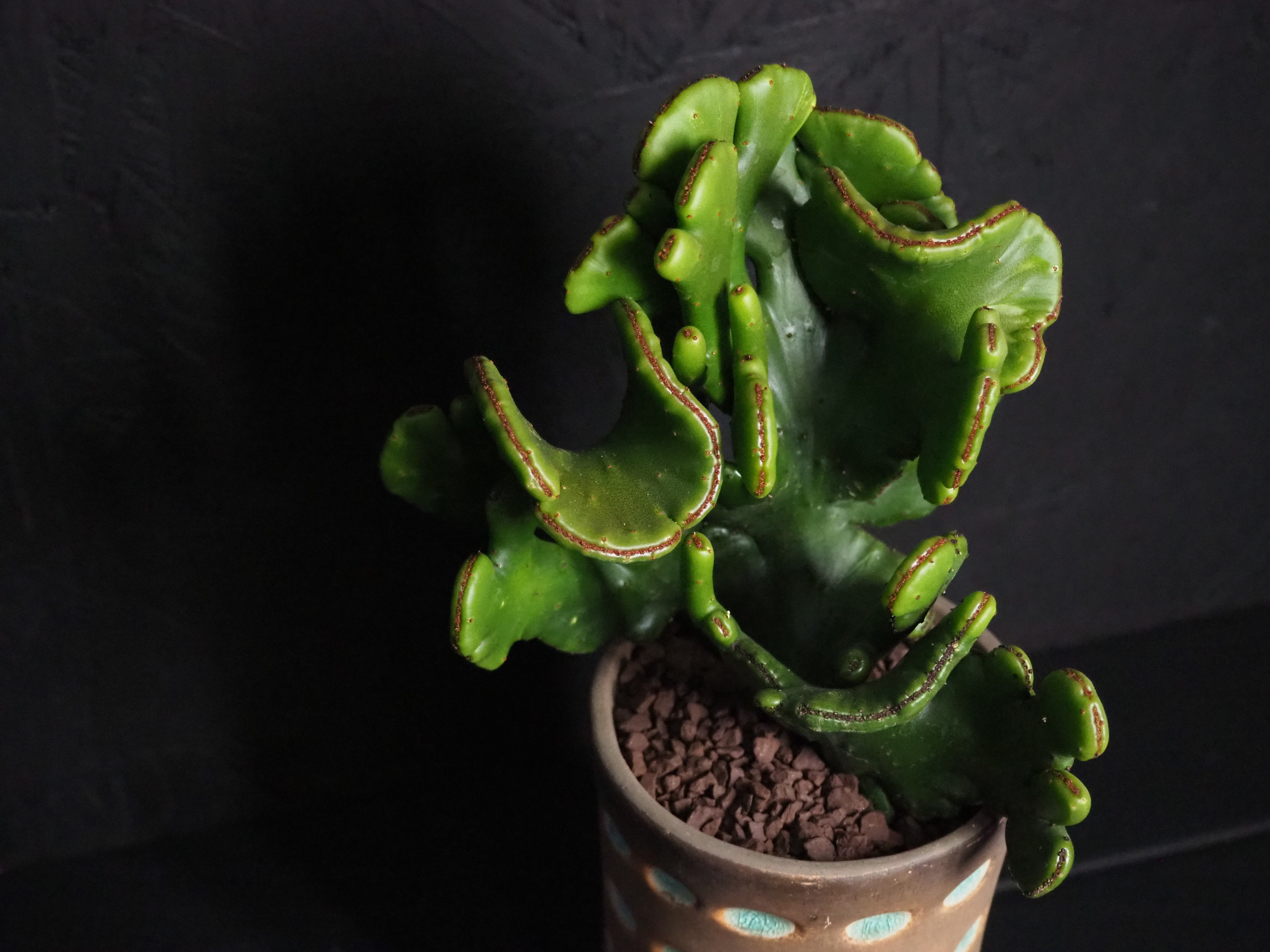 こちらの個体は、本来の棒状の茎が突然変異して平たくユニークな形状に育った綴化個体。生長点がとても変化に富んだ優良株です。色、ツヤ、形状、質感、大きさ、申し分ない綴化っぷりです。