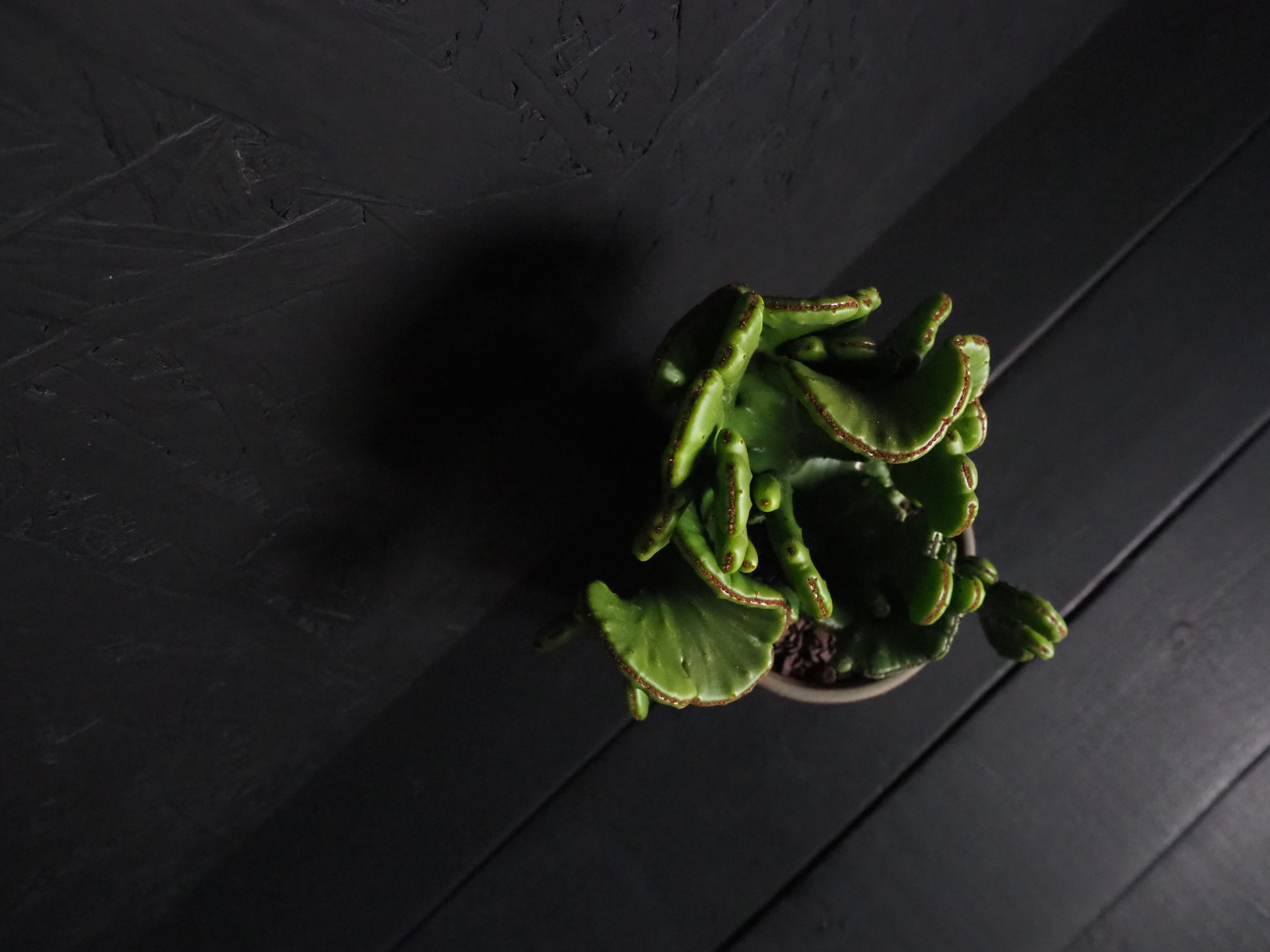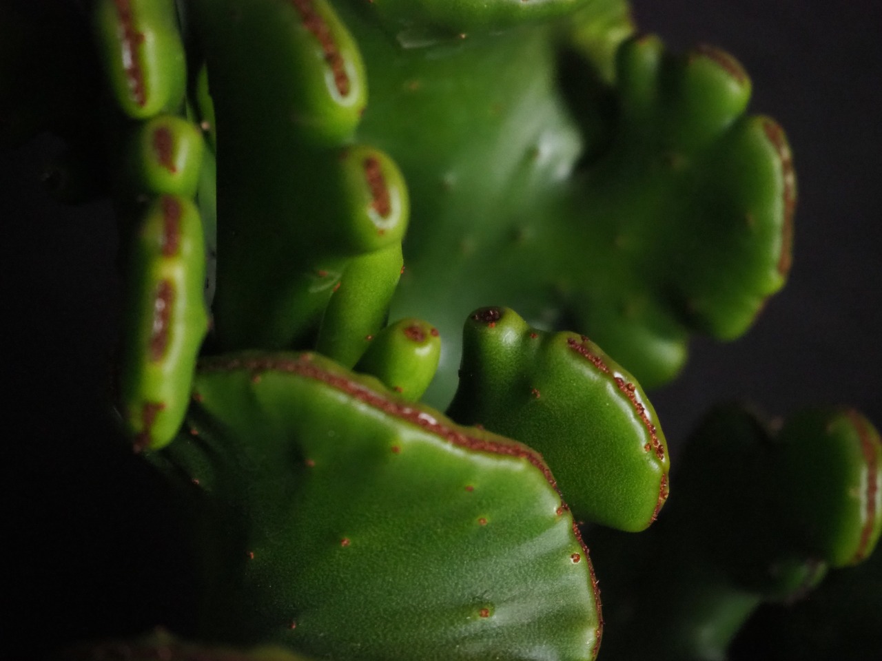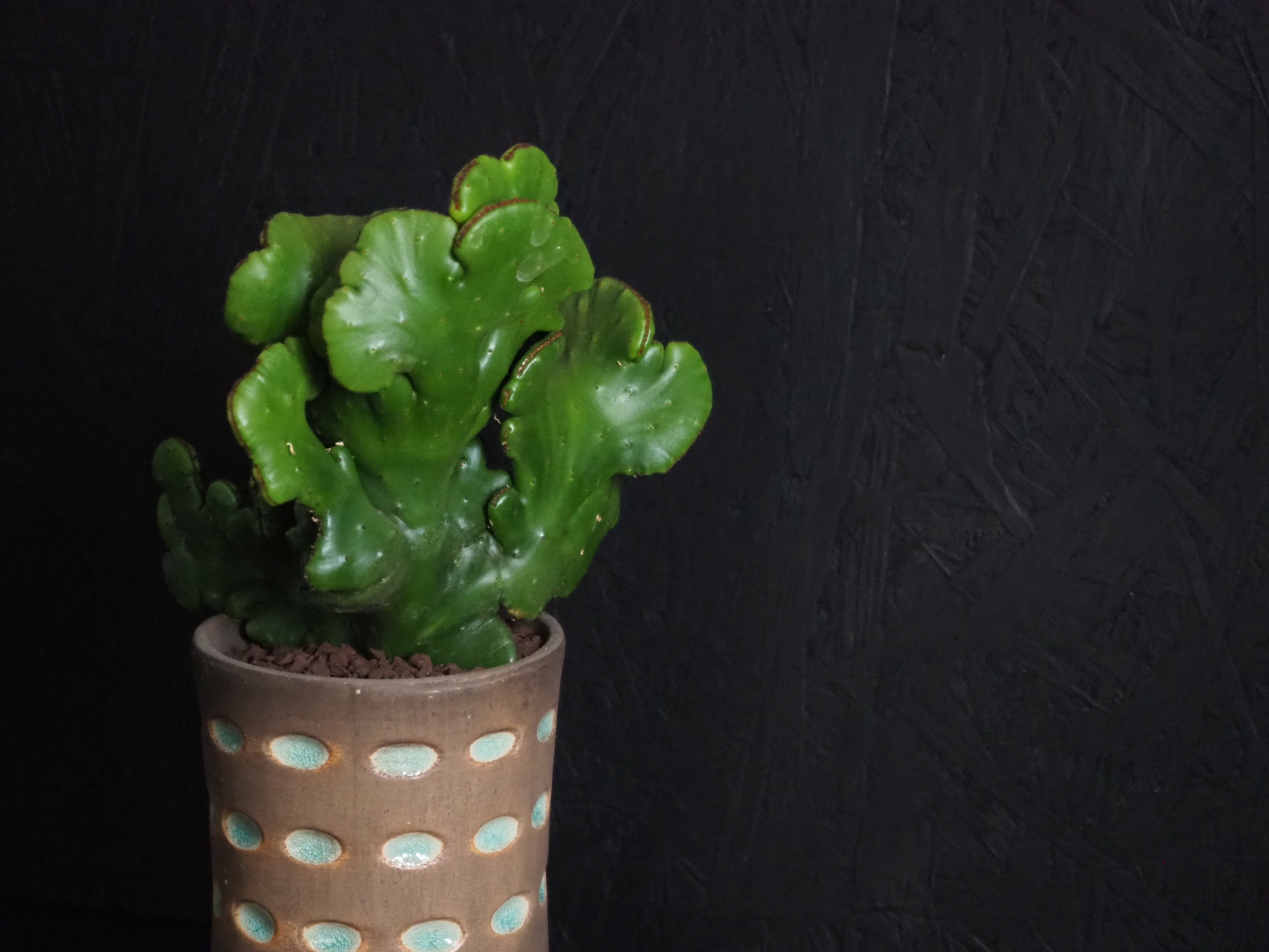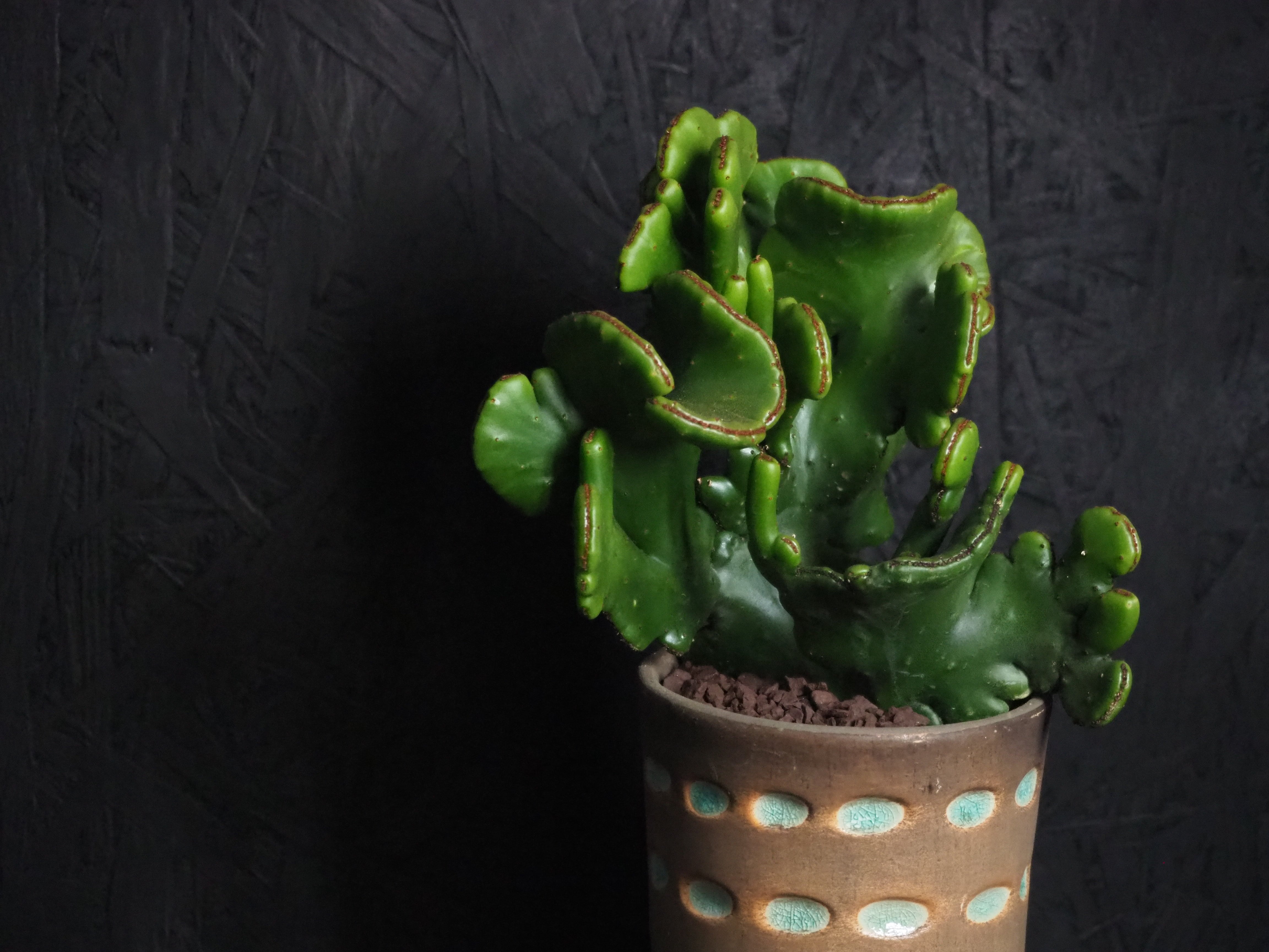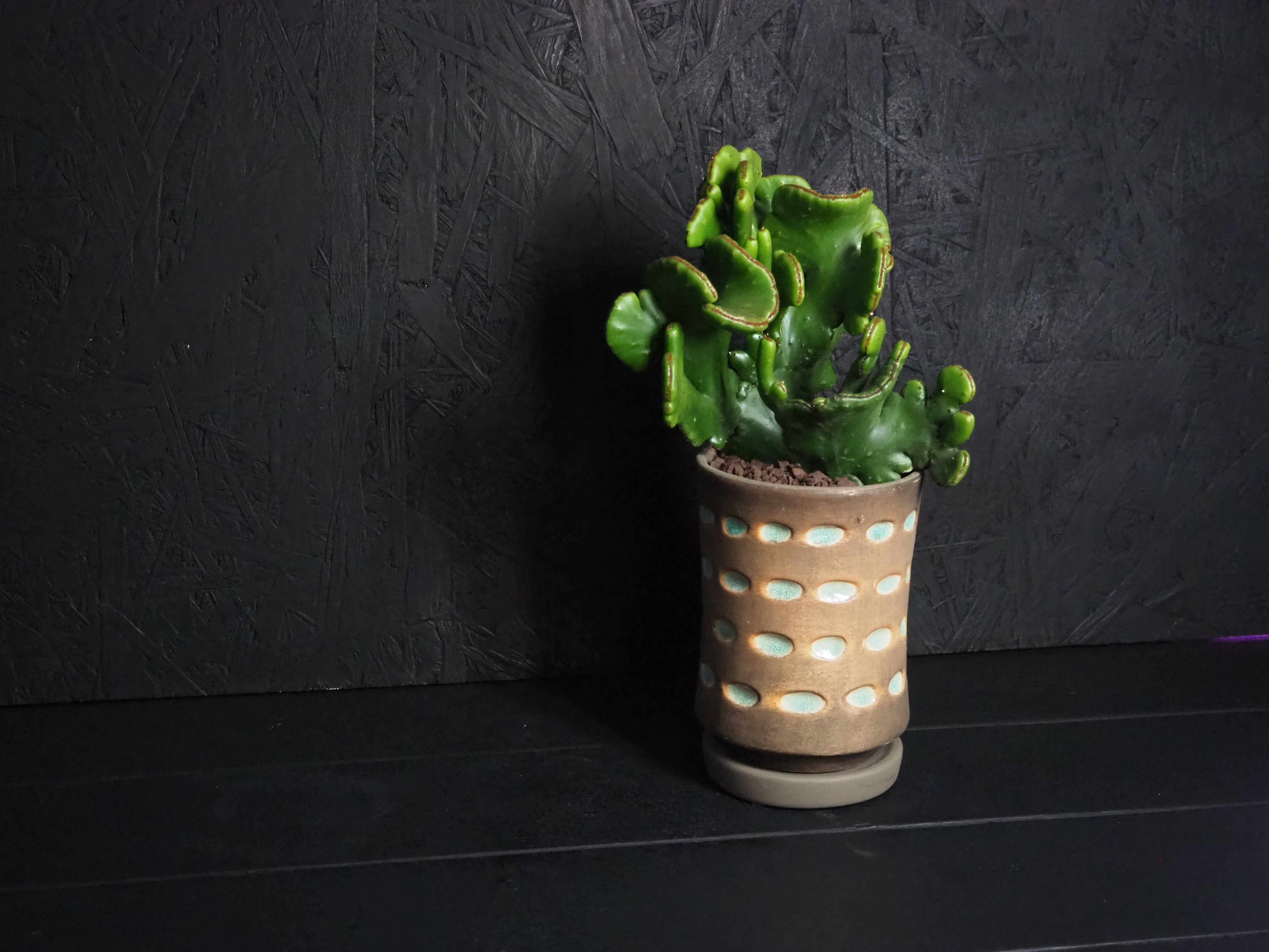 こちらの個体は、本来の棒状の茎が突然変異して平たくユニークな形状に育った綴化個体。生長点がとても変化に富んだ優良株です。色、ツヤ、形状、質感、大きさ、申し分ない綴化っぷりです。