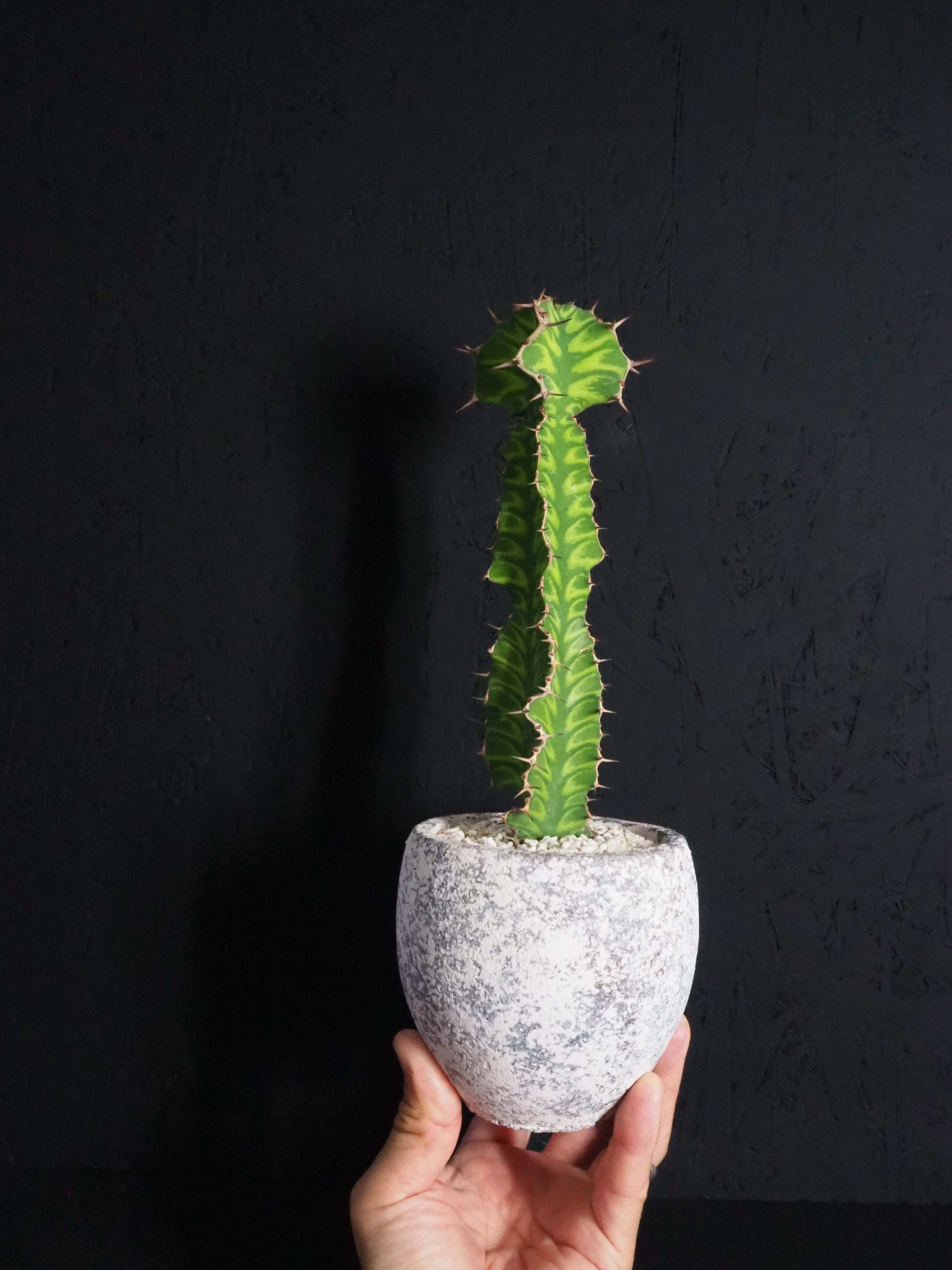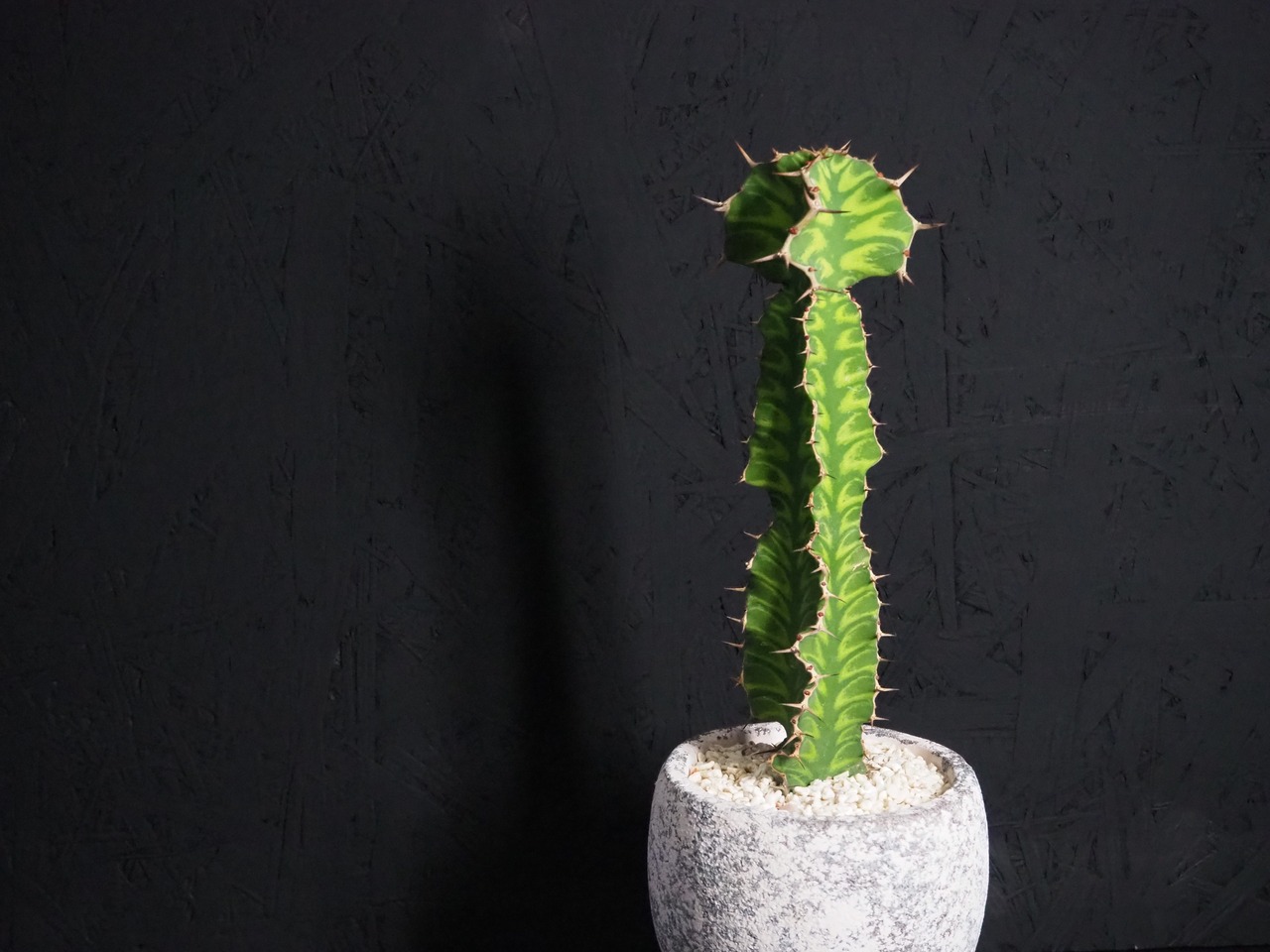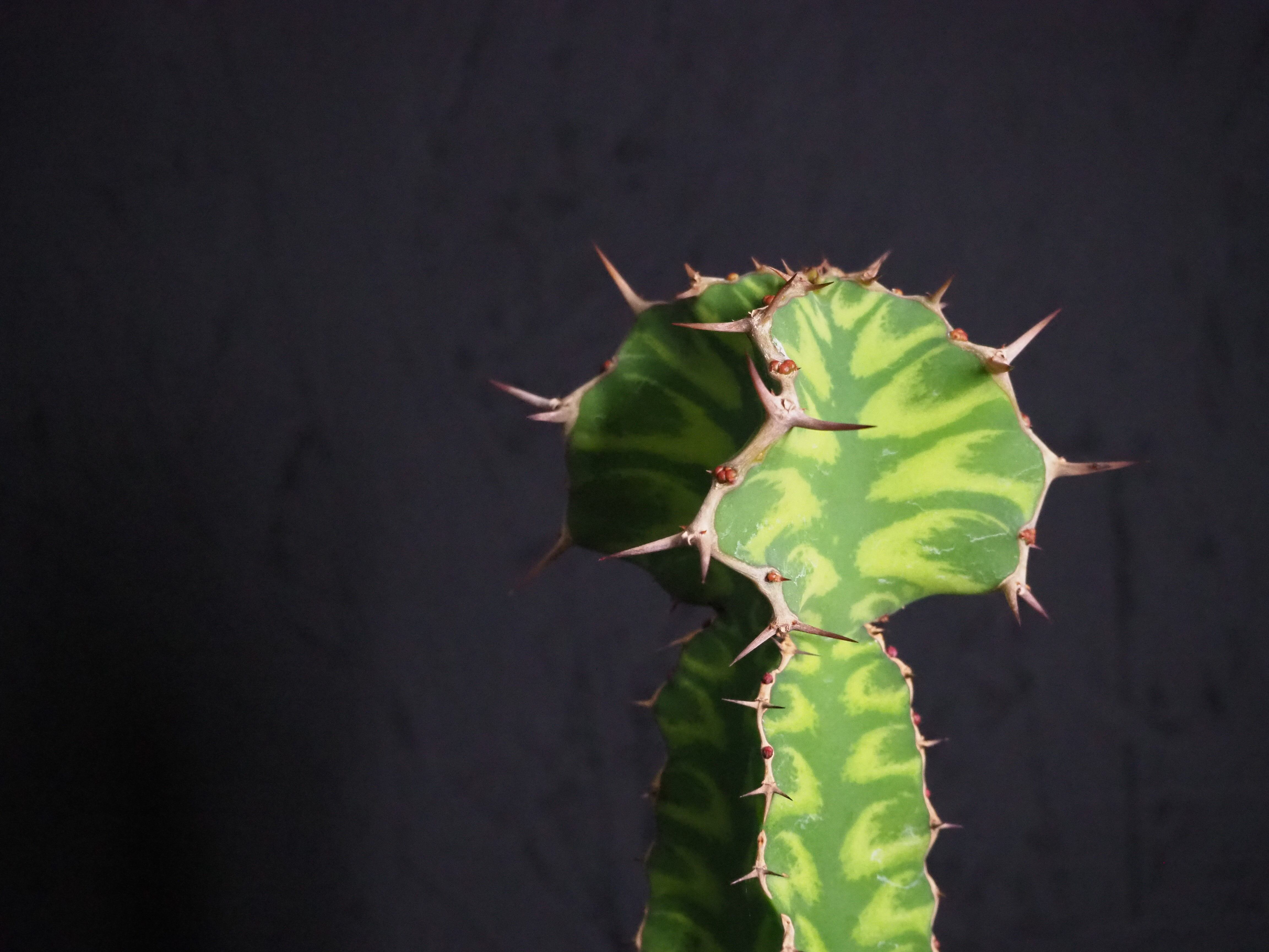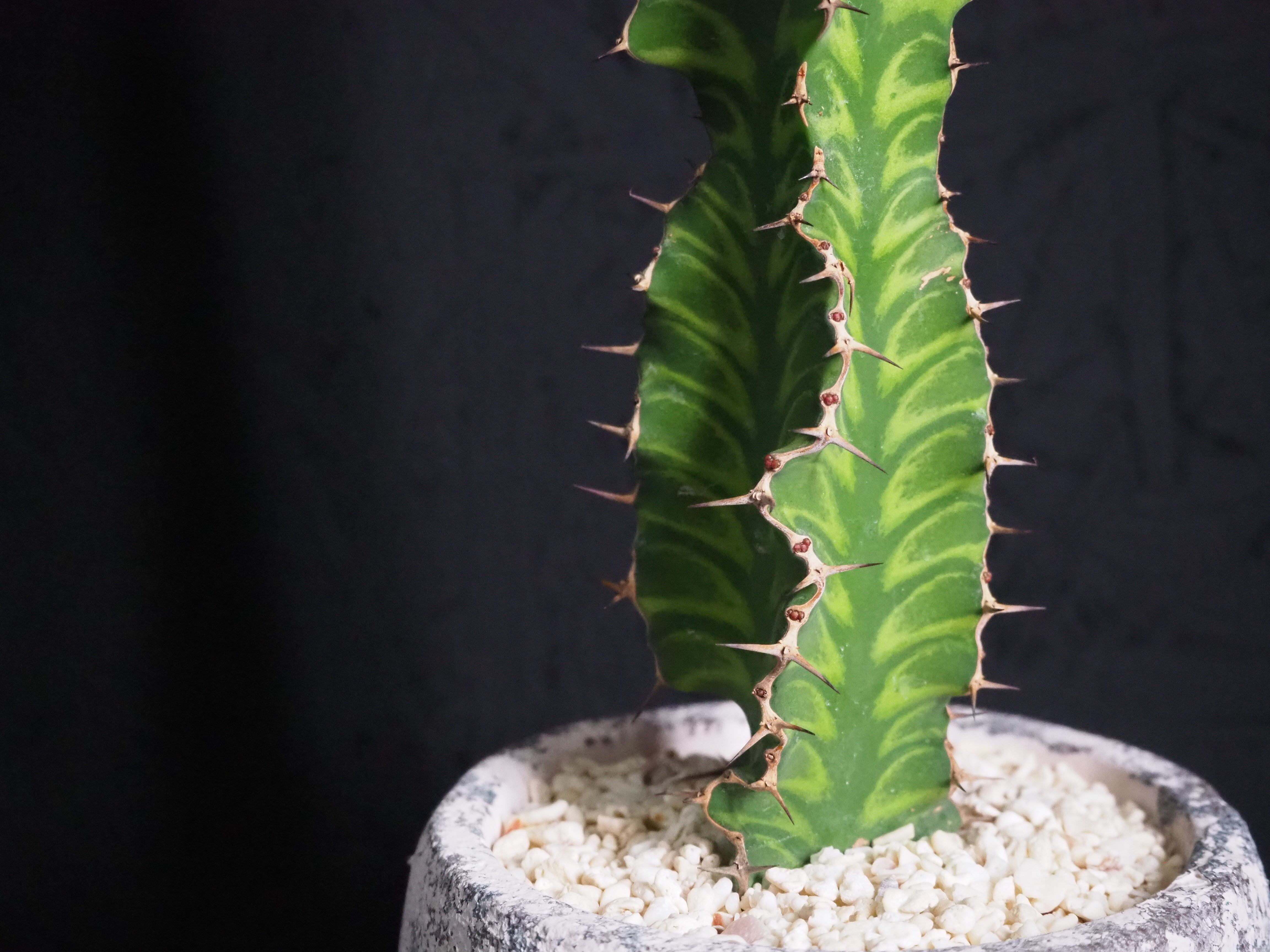 ユーフォルビア春駒(はるこま)、和名はサボテンもどき。ボディーには美しいい縞々模様が入り、棘はバチバチに強いです。陵のうねりも非常に魅力的で脇芽も出ます。胴切りして挿し木も容易、胴切りした株の方は陵から脇目を出してユニークフォルムになりやすいですよ。