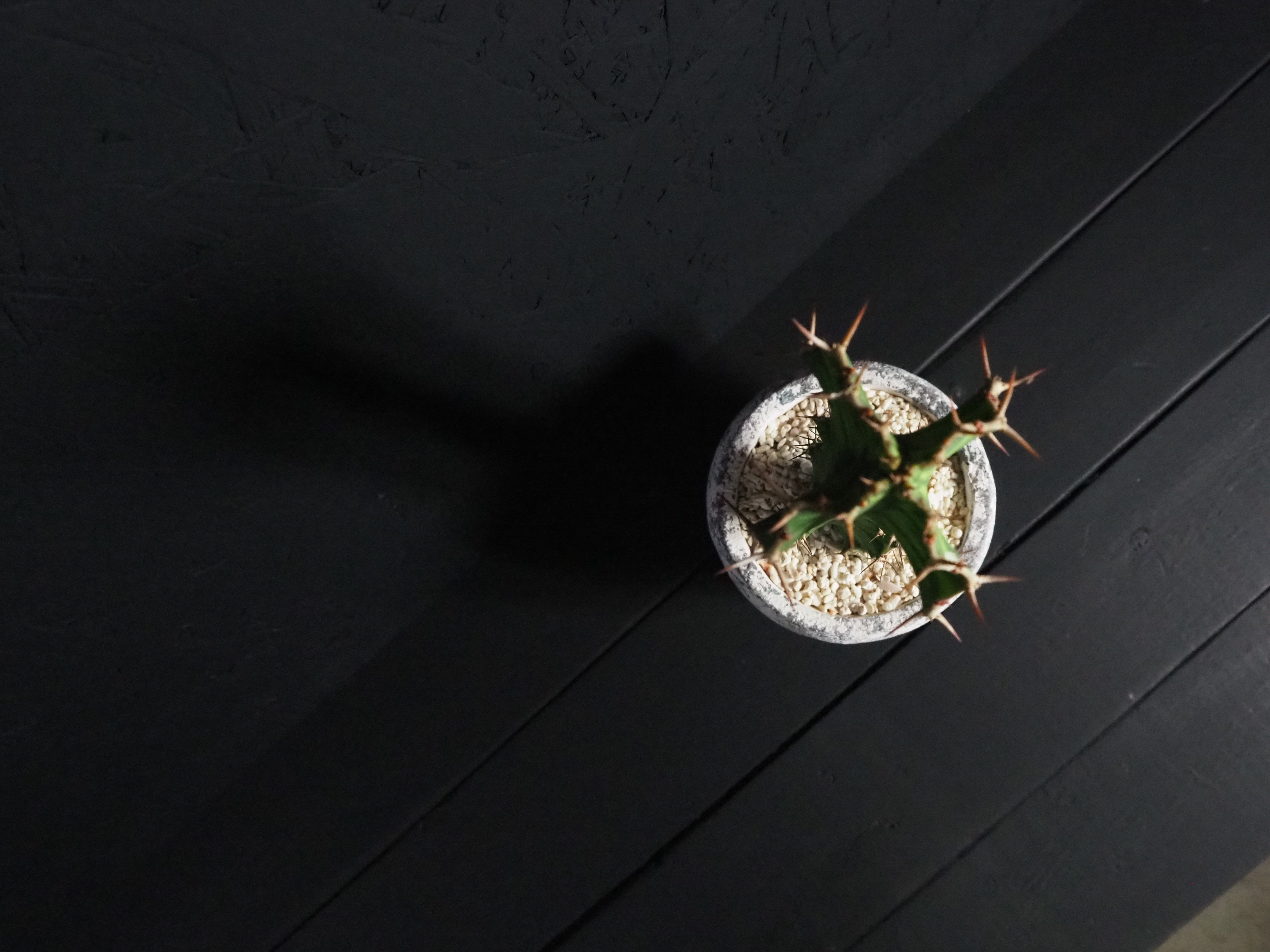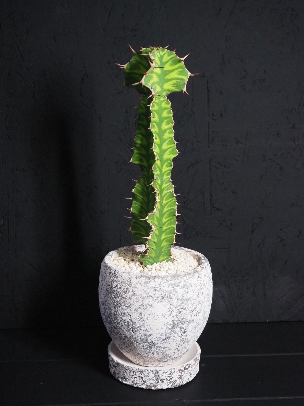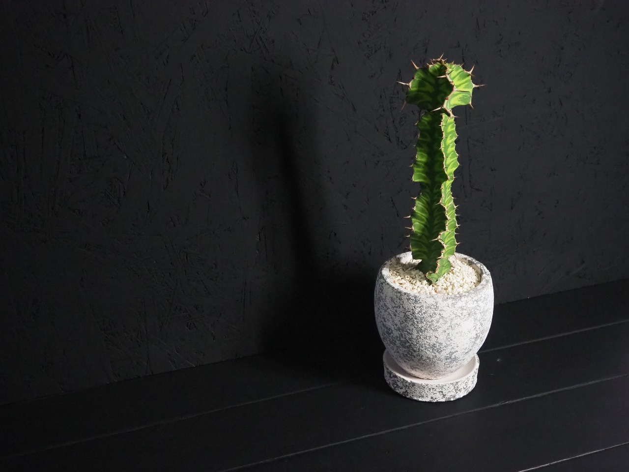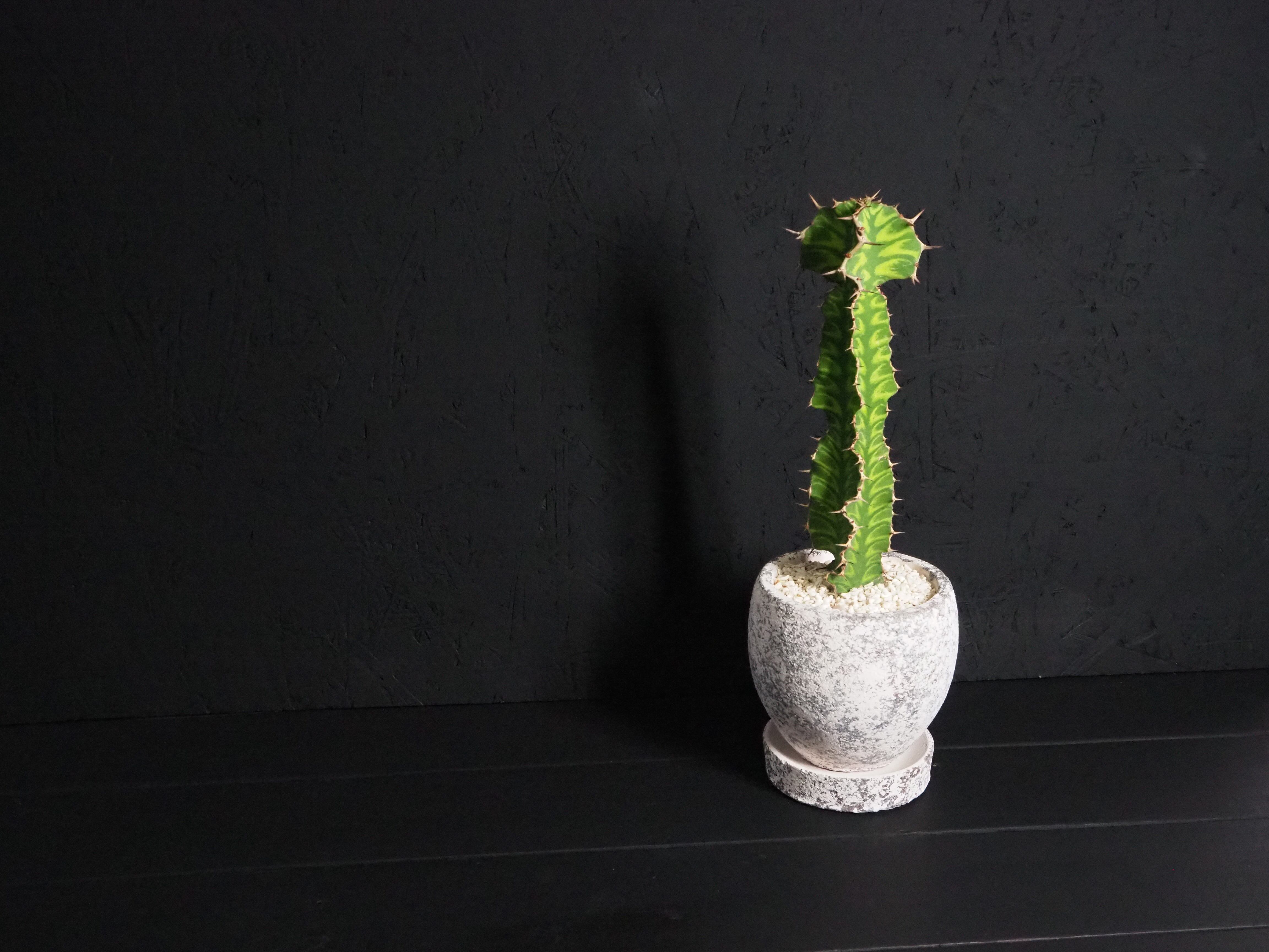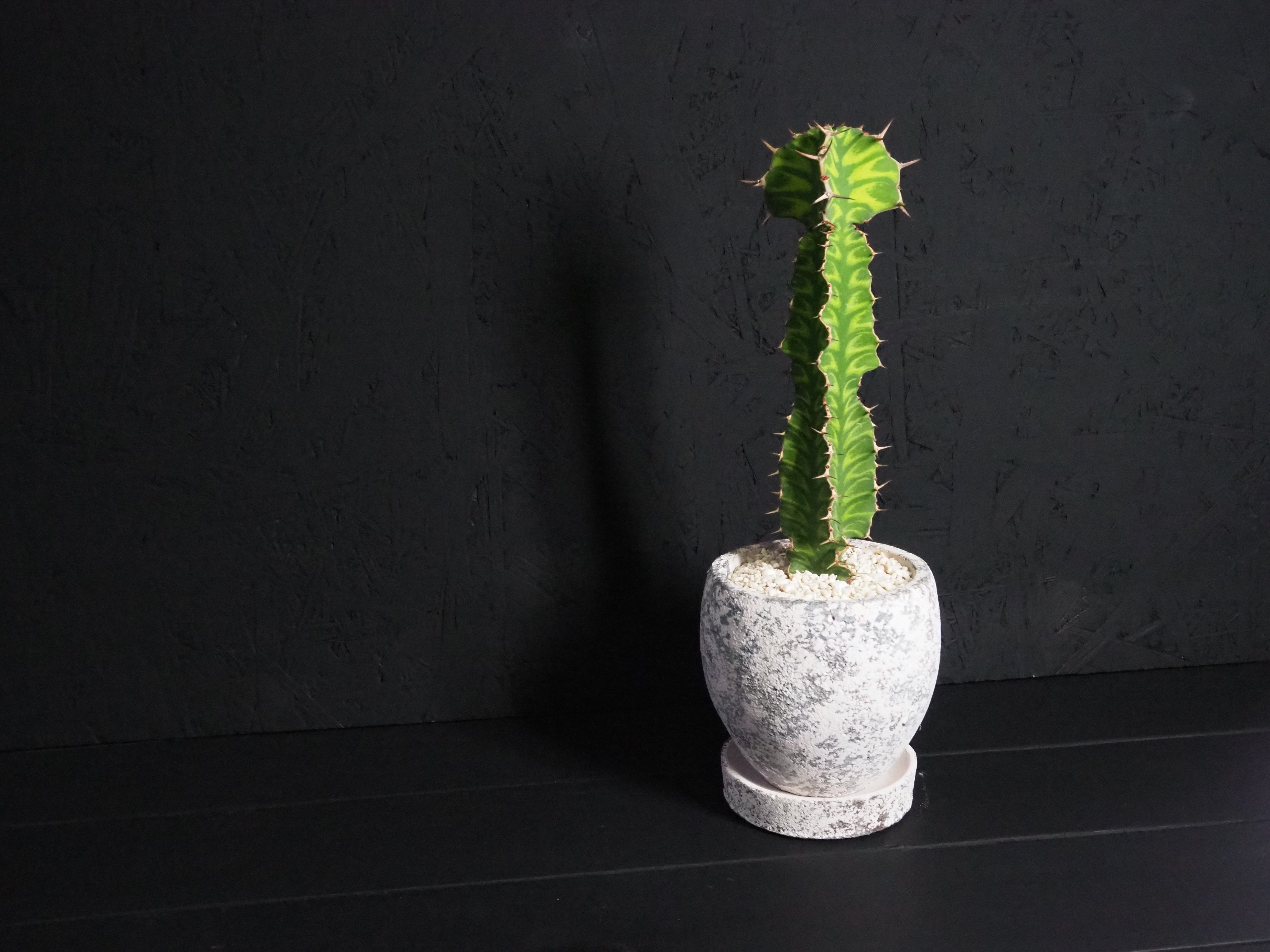 ユーフォルビア春駒(はるこま)、和名はサボテンもどき。ボディーには美しいい縞々模様が入り、棘はバチバチに強いです。陵のうねりも非常に魅力的で脇芽も出ます。胴切りして挿し木も容易、胴切りした株の方は陵から脇目を出してユニークフォルムになりやすいですよ。