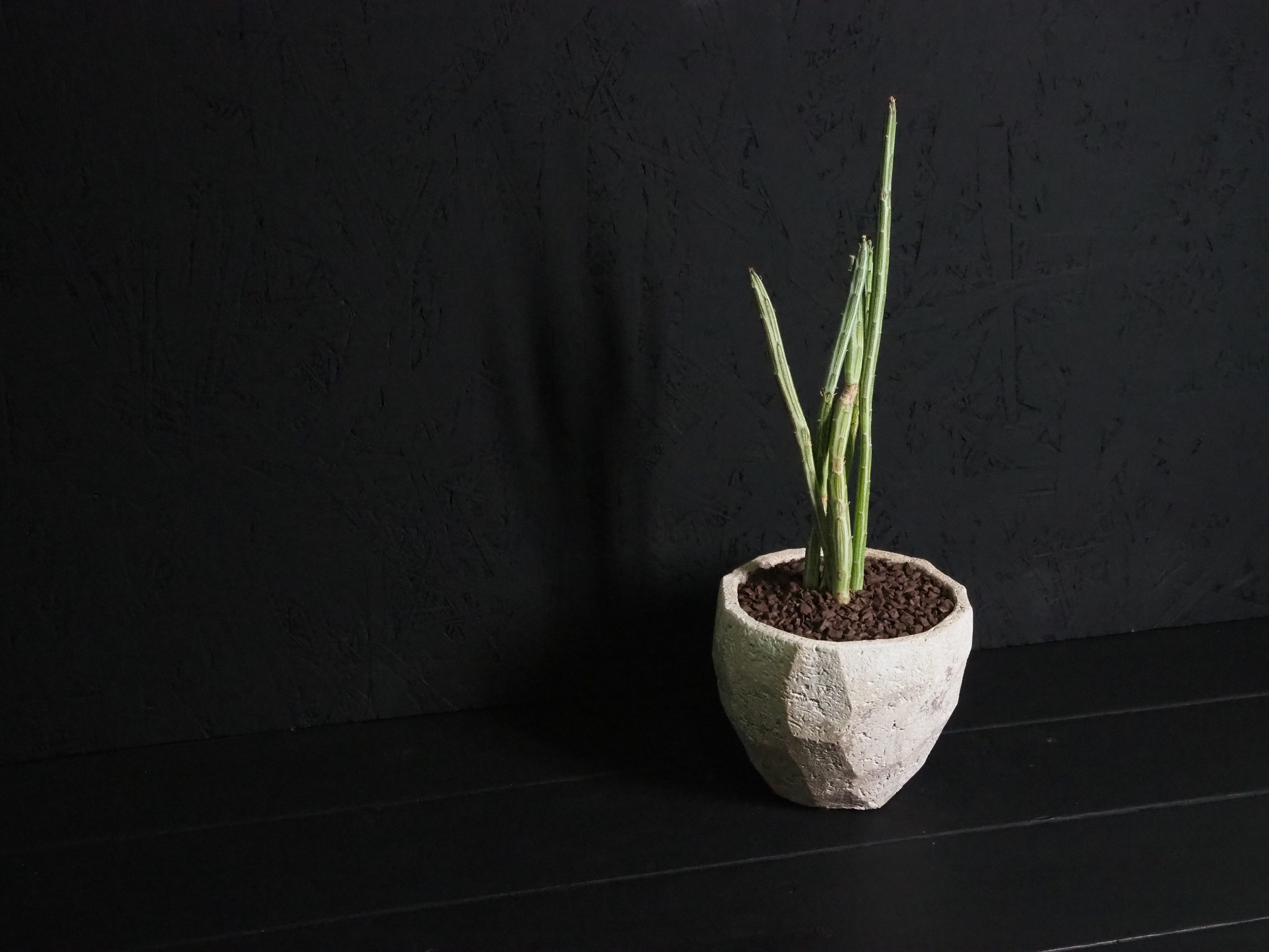 青味かかった緑色の濃淡模様が綺麗で、赤い花を咲かせます。葉のような柔らかく短い棘がありますが、この子はまだ小さいので棘という感じはしません。乾燥地帯で原生する低木なので高さはあまり大きくならず、大体25㎝くらいです。地下茎を伸ばして地上に芽を出します。