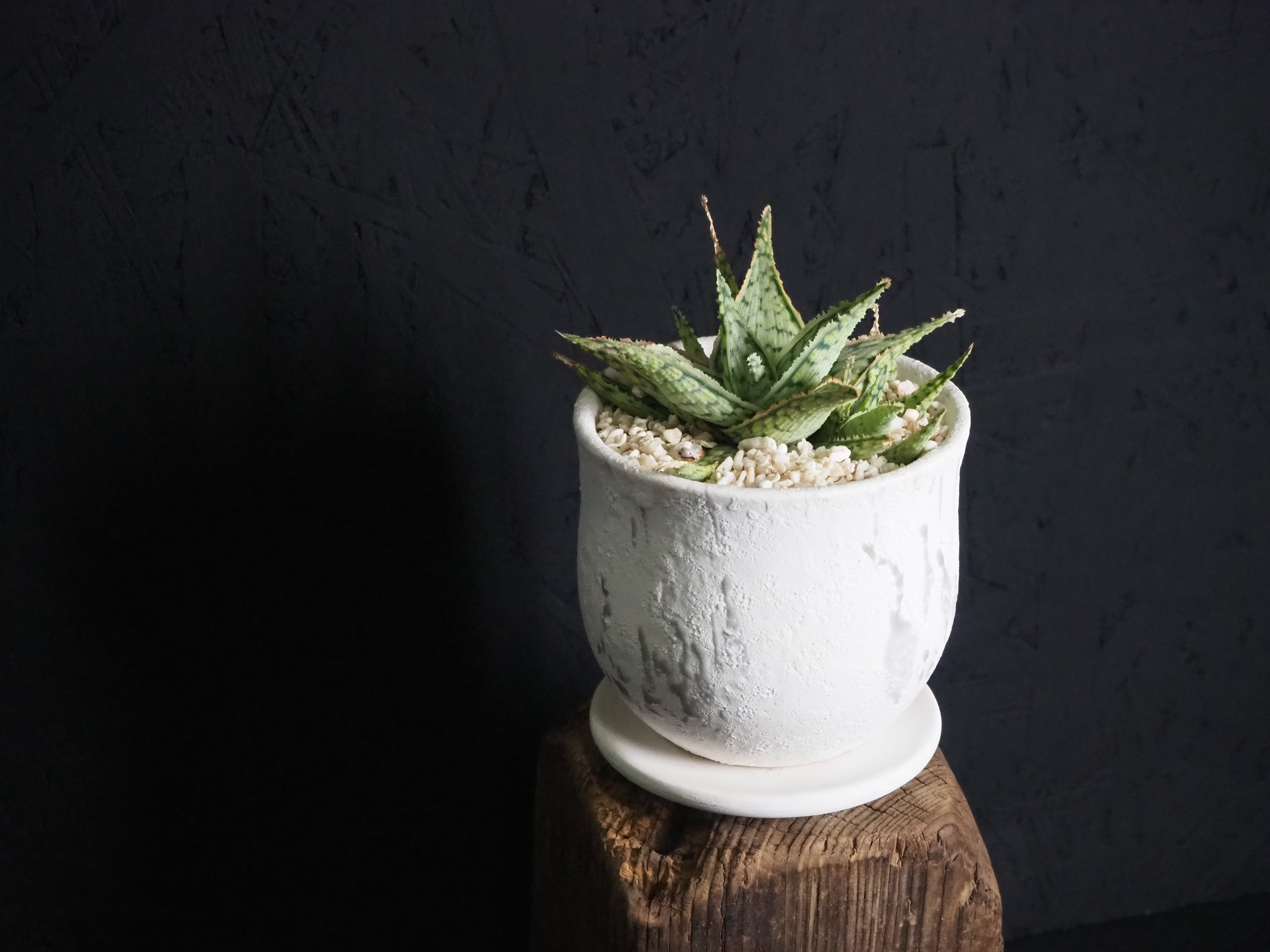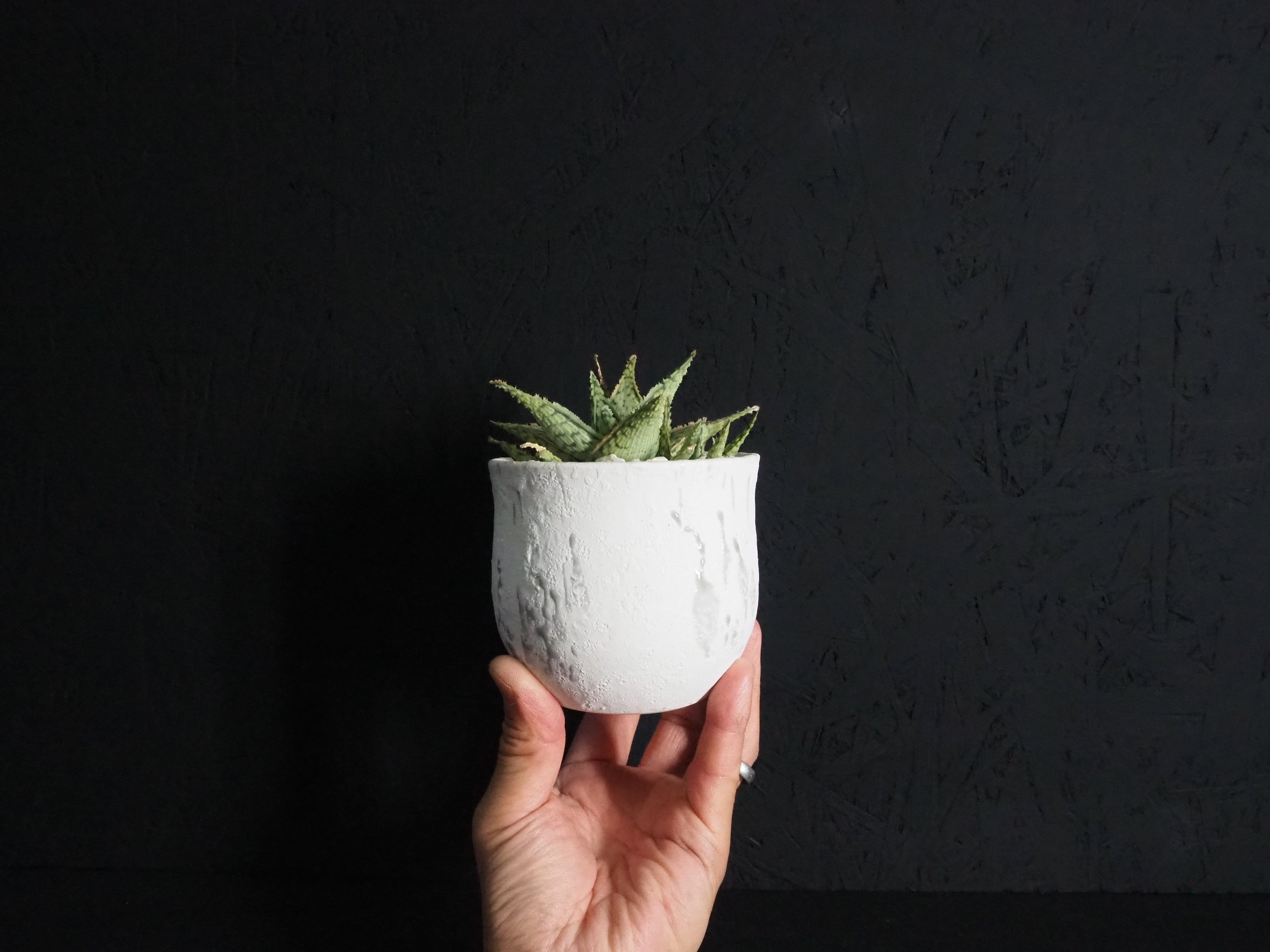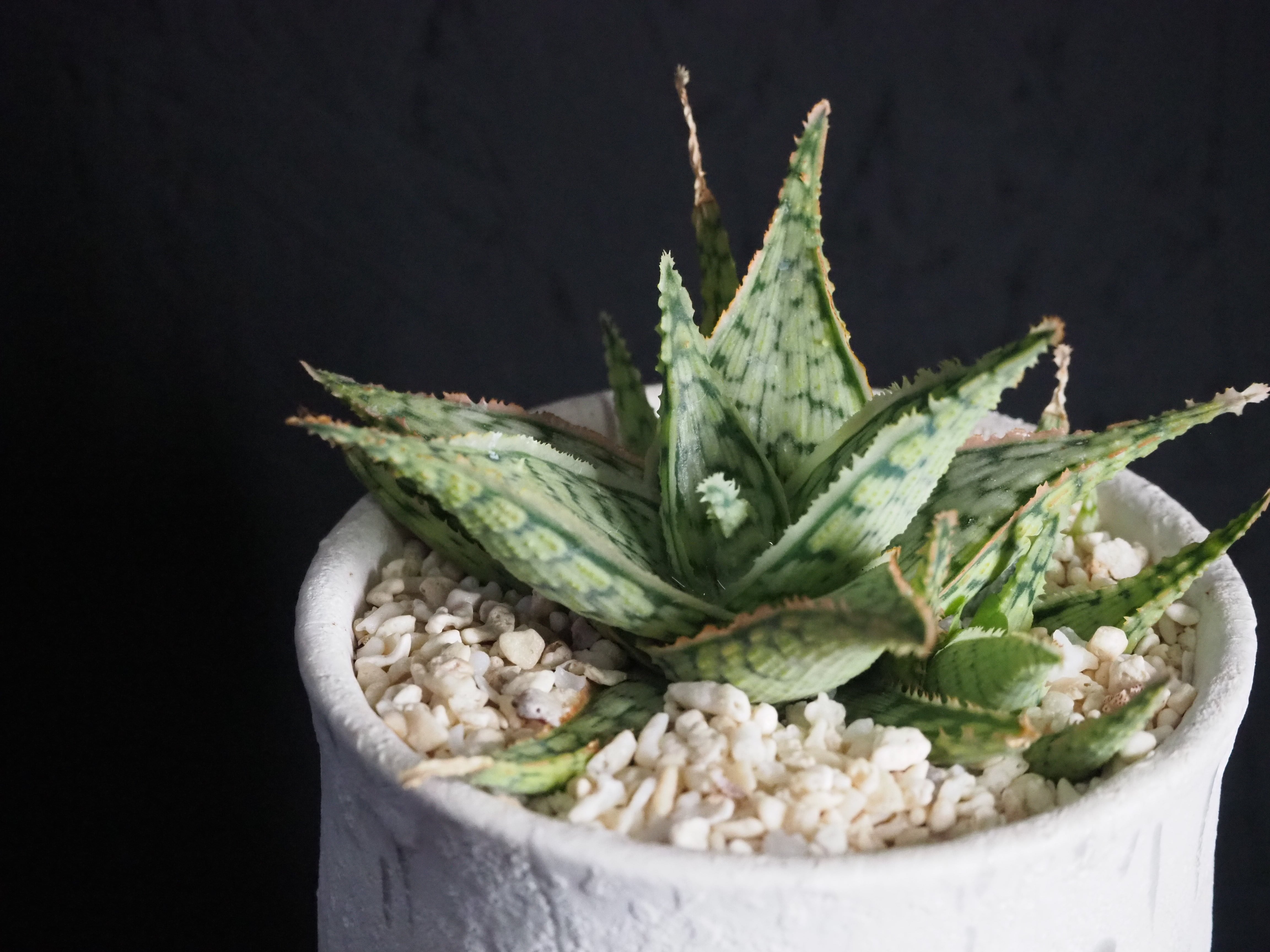 いわずもがな、アロエハイブリッドです。小吹まくり!!これからの葉の発色も楽しみで、白い鉢と葉のピンクのコントラストはより一層美しく見えるはず。