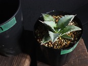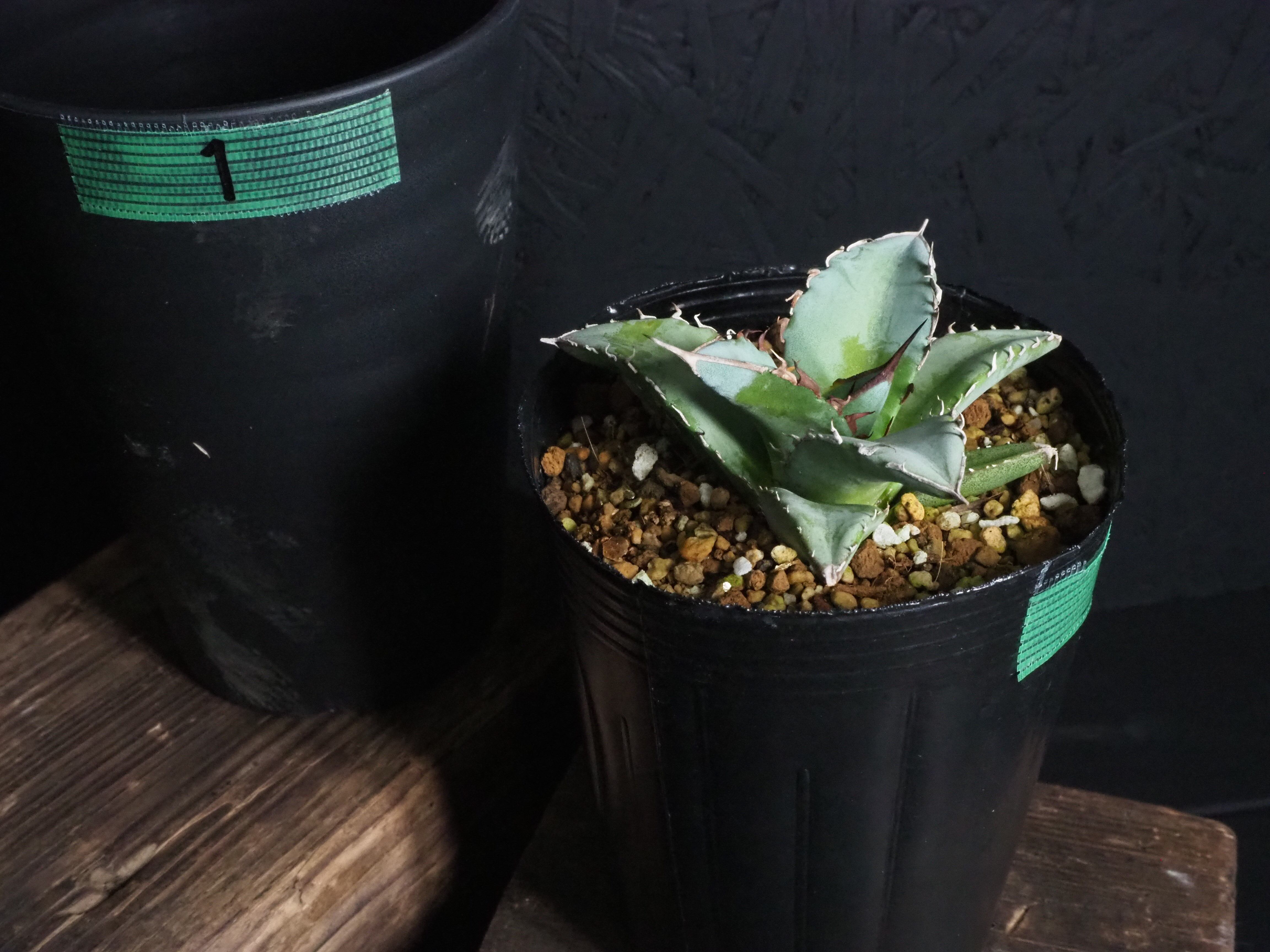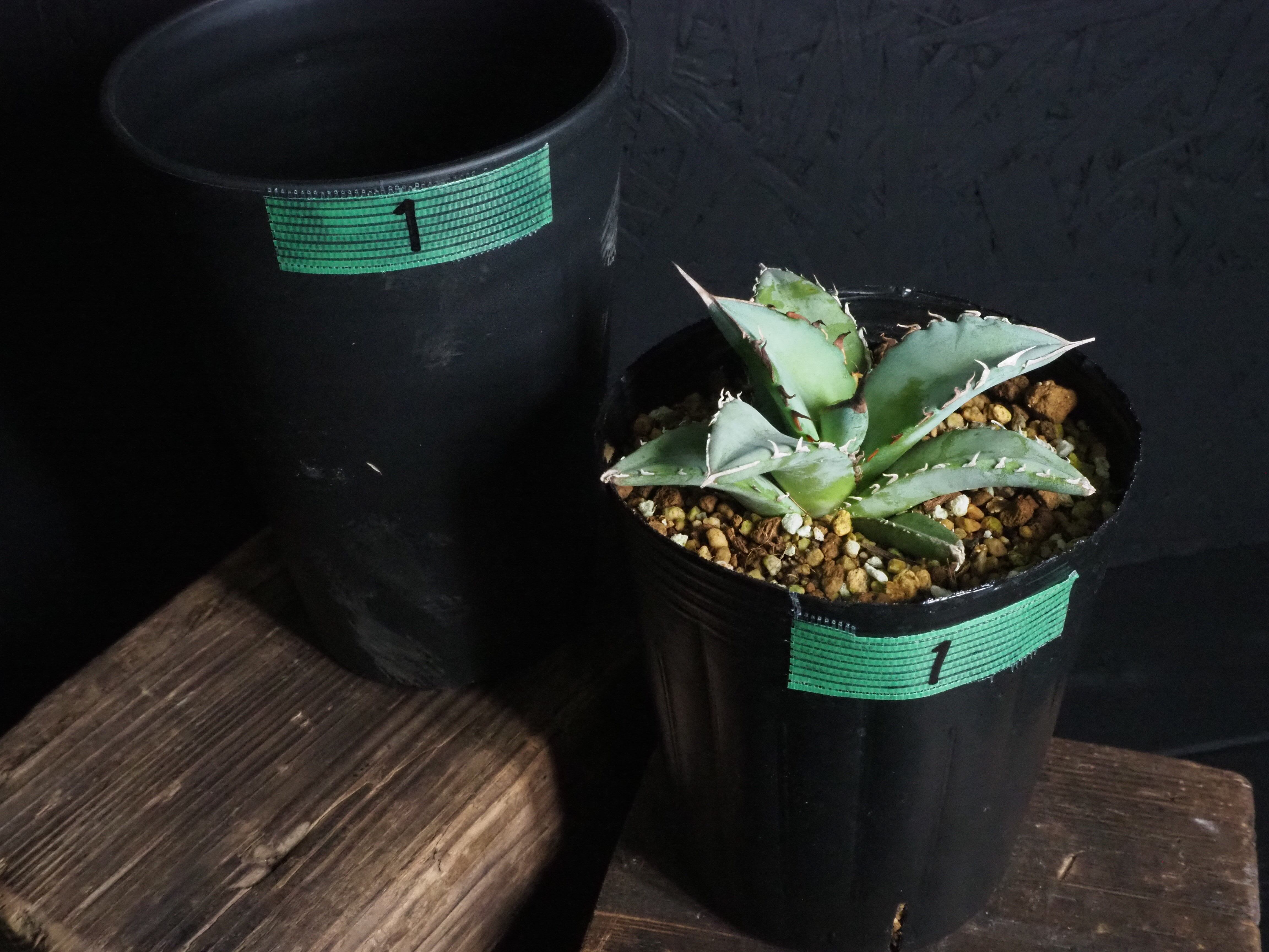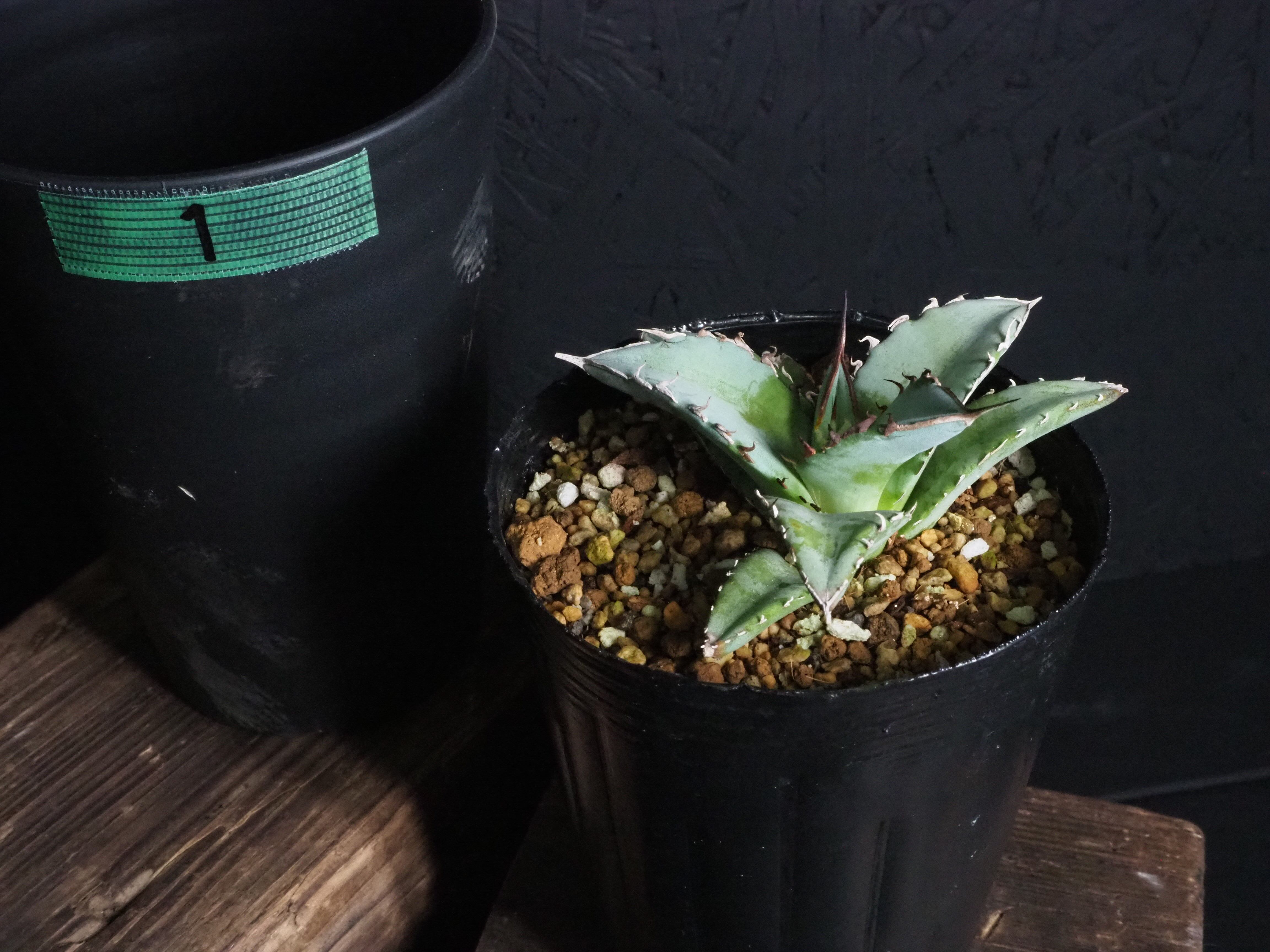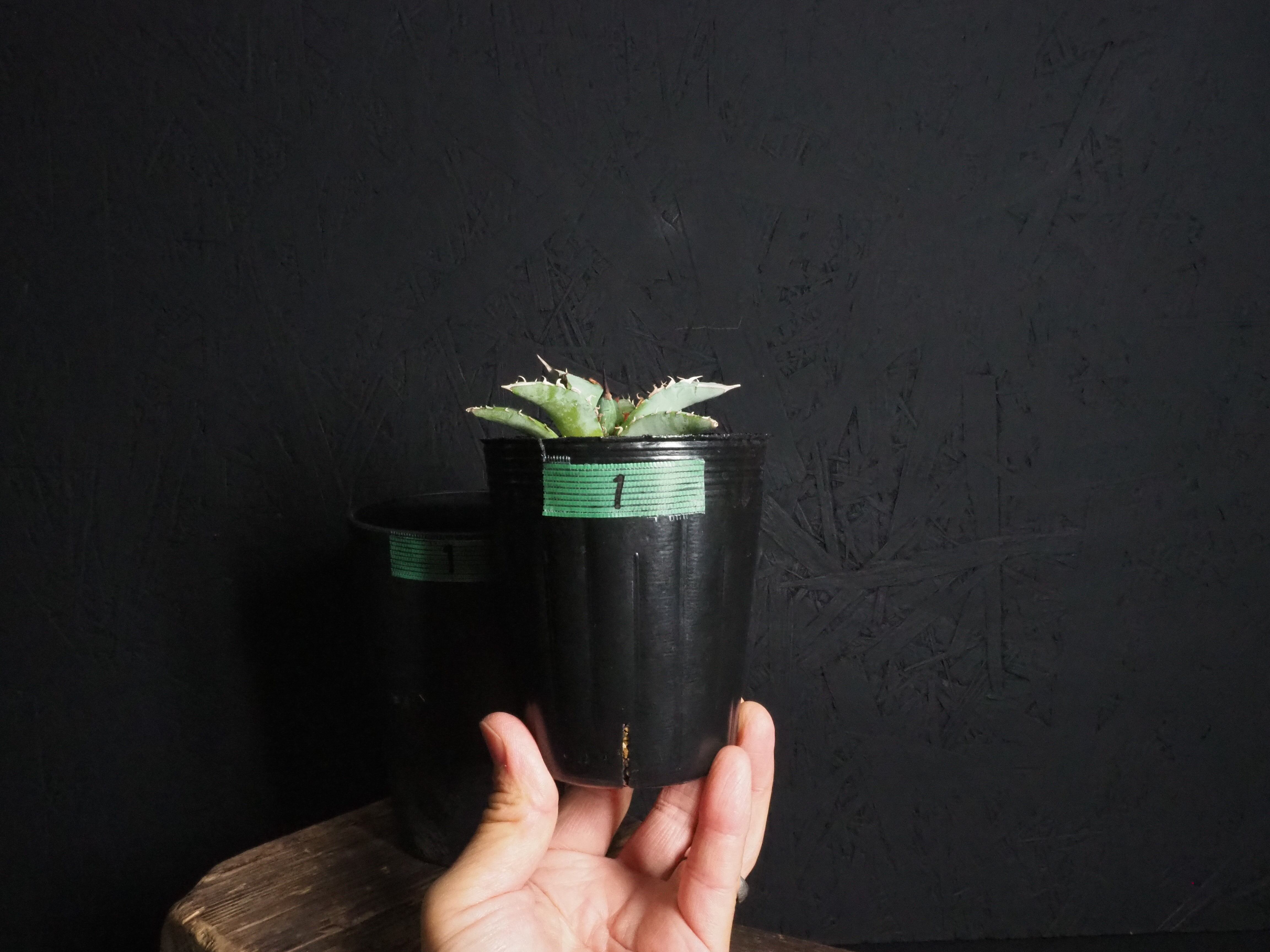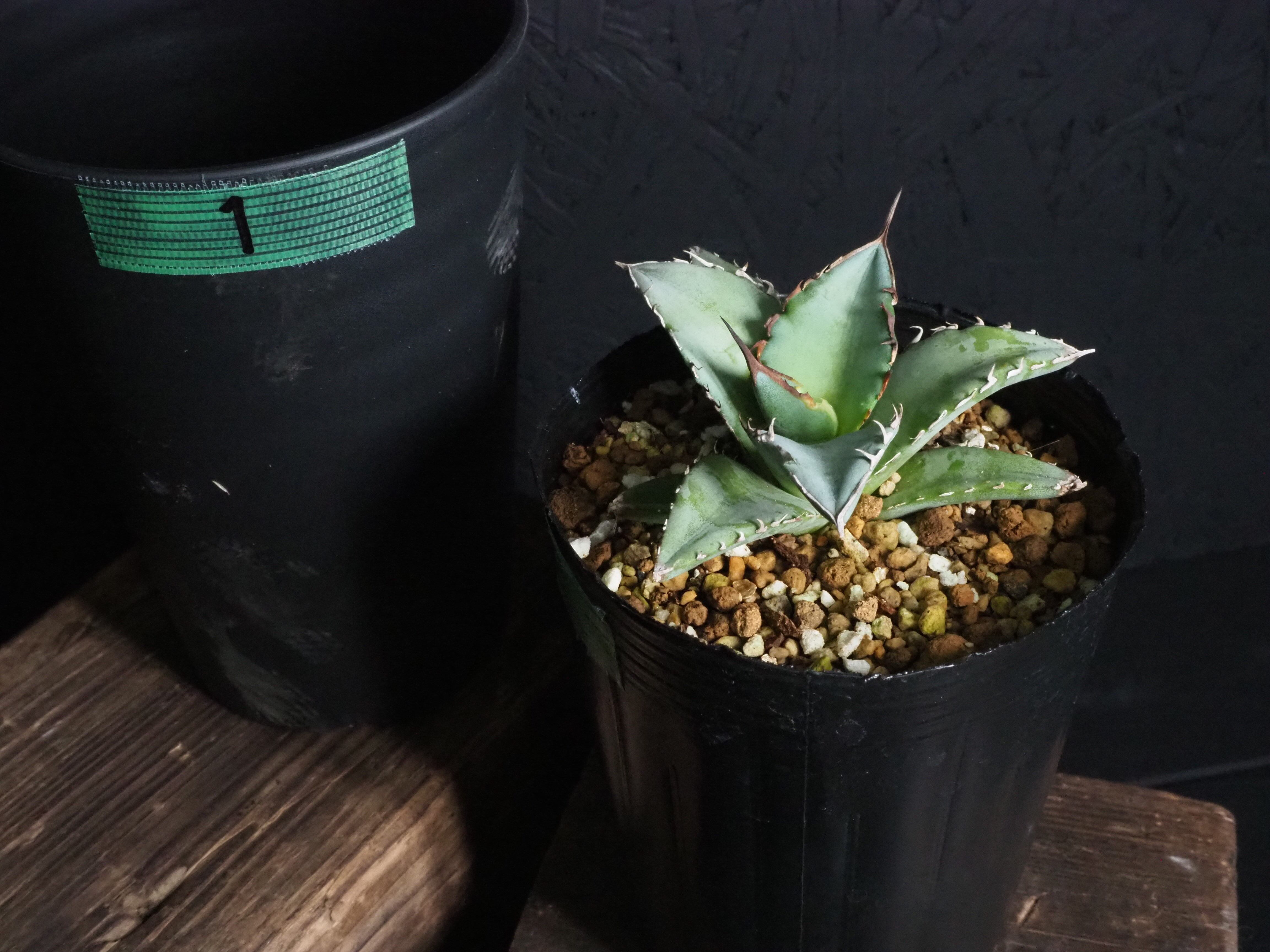 いわずもがな、人気のチタノタ!!「チタノタブルー」は青味かかった肉厚葉に鋭い白棘が特徴のアガベですね。基本、お日様ガンガンで良いのですが真夏の湿気に一日中ドピーカンな場所で管理すると、少し黄緑っぽい葉の色になってしまいます・・・・、いわゆる葉焼けみたいなものですかね。なので、少し遮光気味にすると塩梅いいです。特にこの子のようにまだ小さな内は気を付けてくださいね。外出後、急速に天気が回復して梅雨の晴れ間から強烈な日差しが・・・・数日してみたら「あれ?なんか葉が青くない・・・汗」なパターンにも要注意。ま、それはそれで味があってビンテージ感も出てきていいんですけど。大きくなると直径30㎝位になるアガベです!