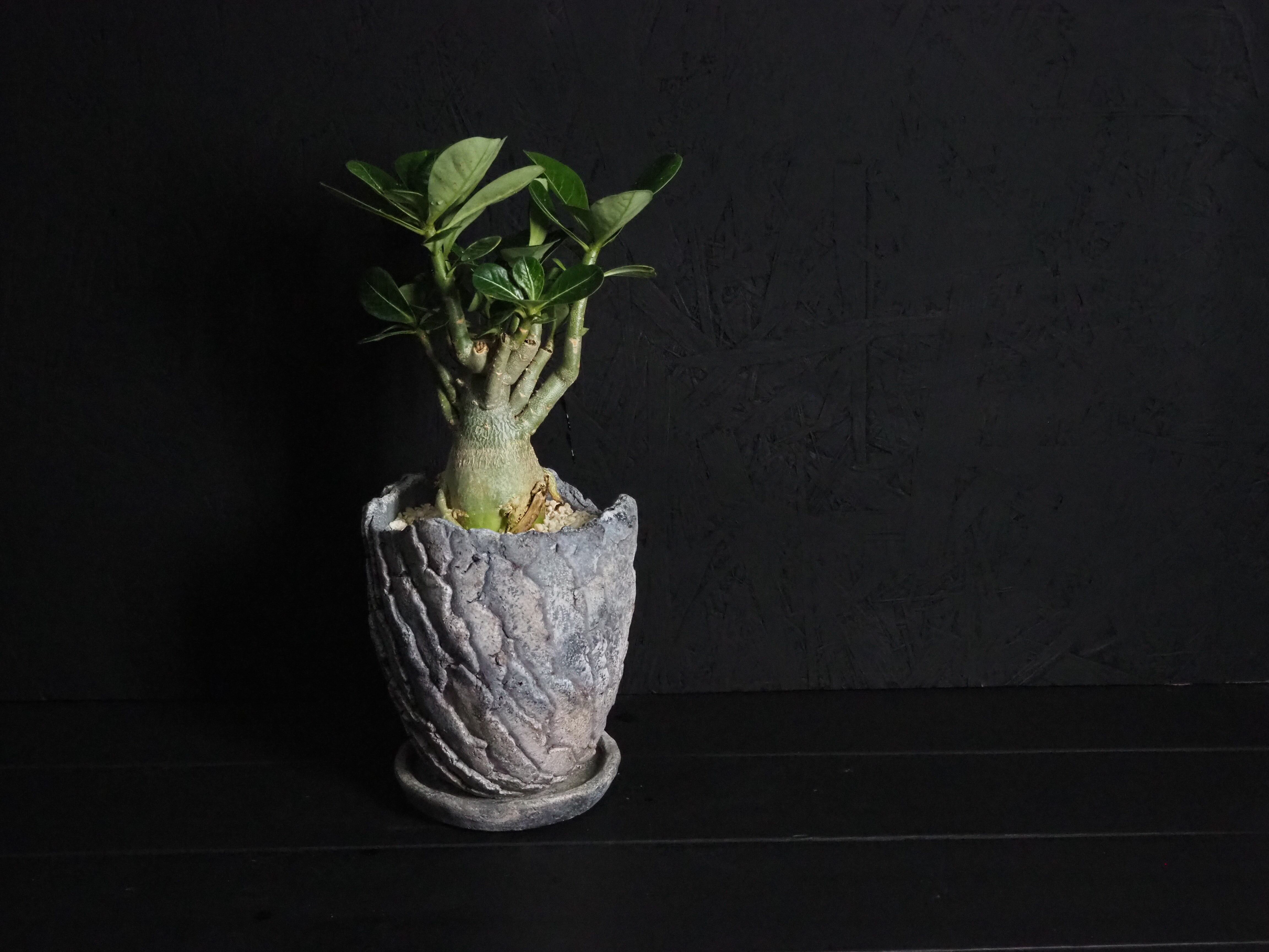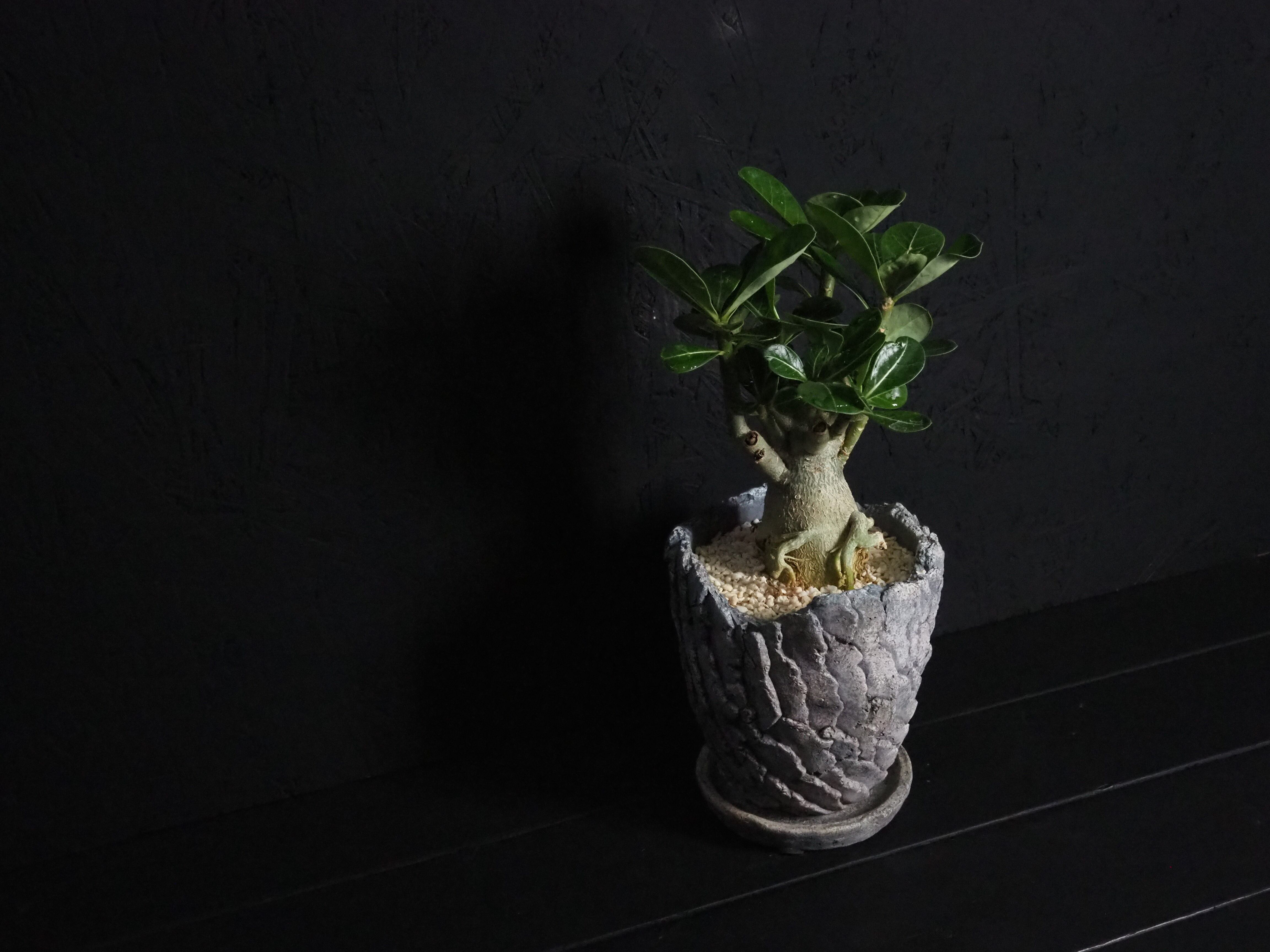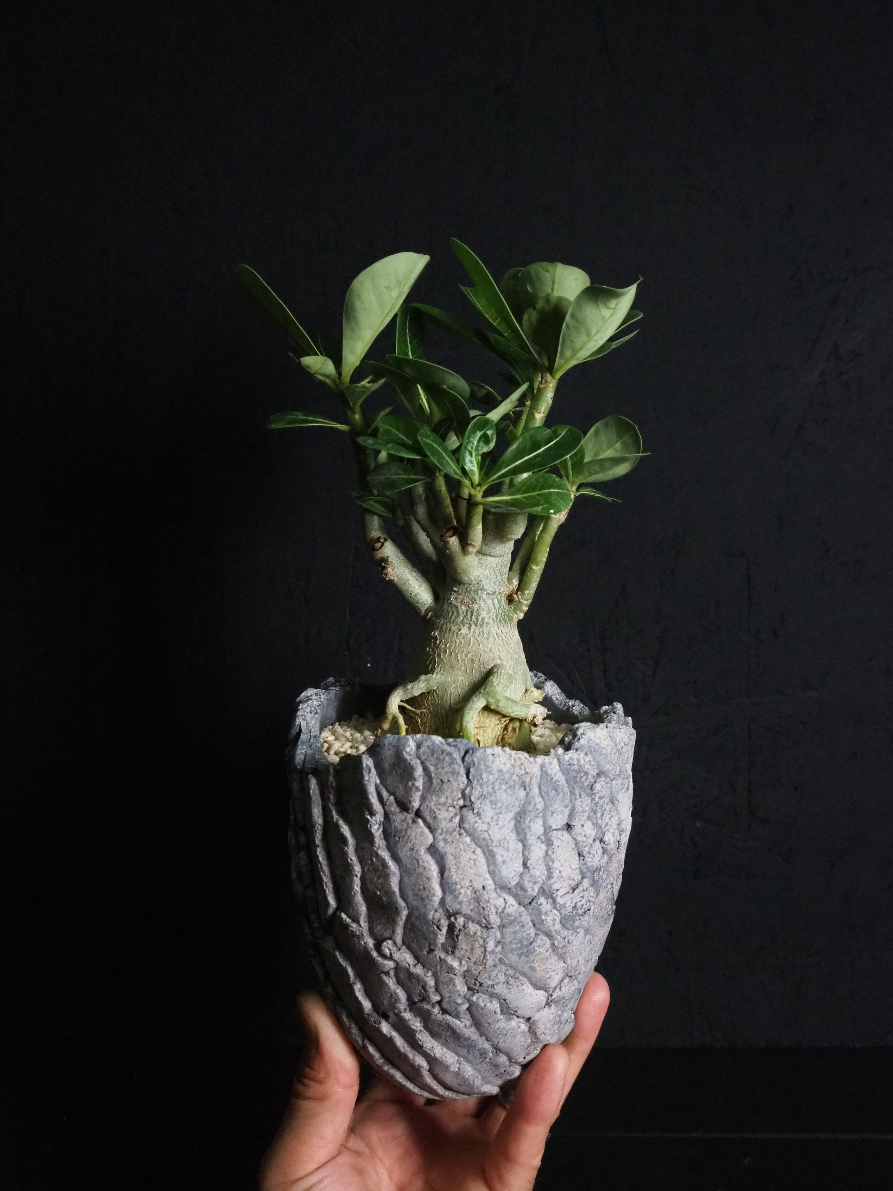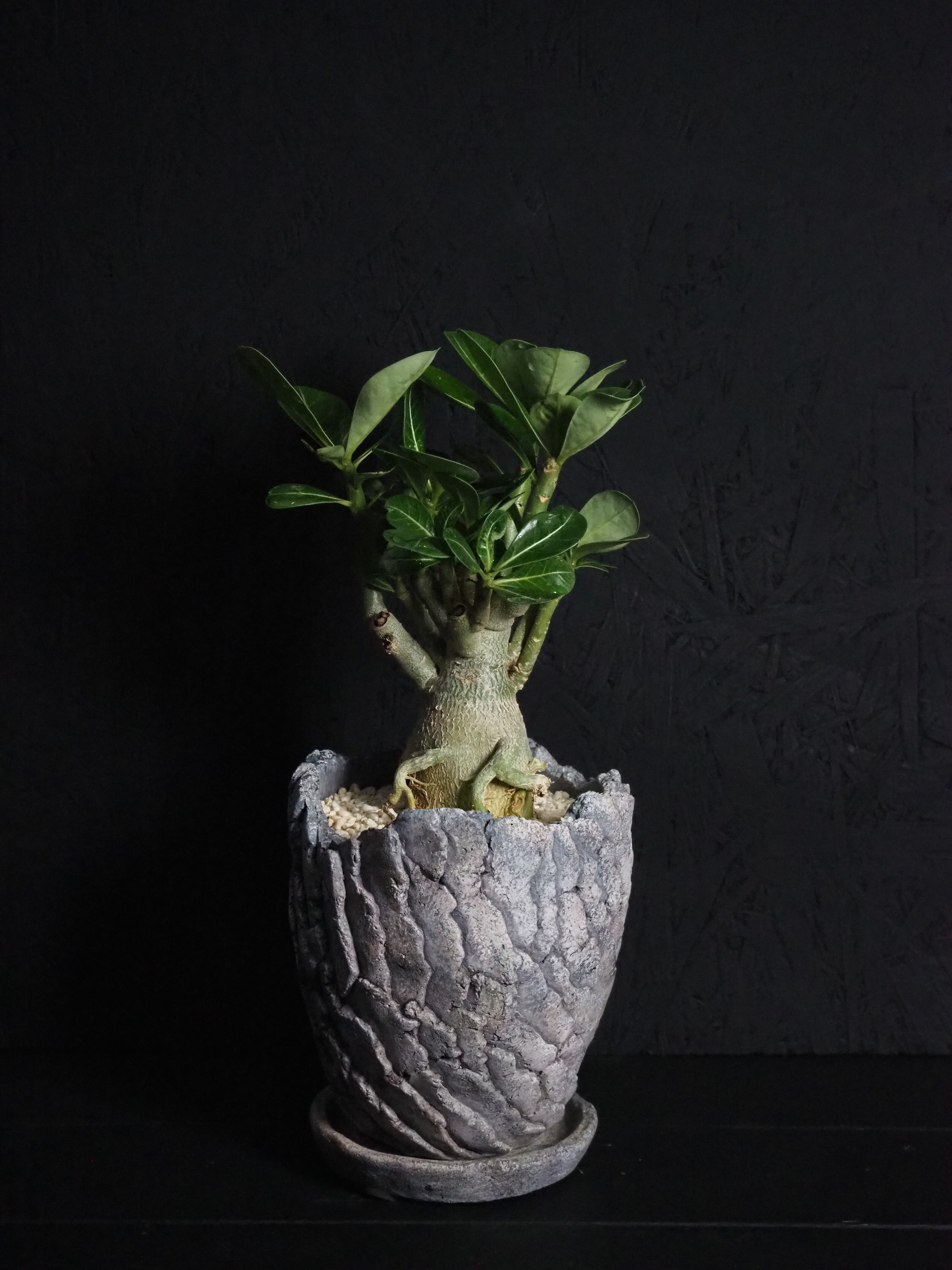 近年多くの品種がみられるようになりましたが、アデニウムといえば「オベスム」が元祖アデニウム。古くから日本では「砂漠のバラ」と呼ばれ、花が美しく鉢花として親しまれてきました。春から初夏に赤~ピンク色の花を咲かせ、白花種や八重咲き種もあります。
