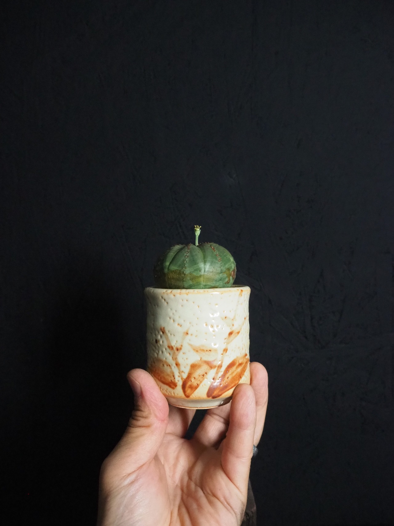 国内実生株、弊社オリジナルで昭和の湯呑を鉢にリノベーションした、他には絶対にない(たぶん・・・)組み合わせ。そして完璧な発根状態です。雄株で撮影時は花が一つ咲いております。雄株をお探しの方は早めにご注文をお願いいたします。雌雄ペアで実生に挑戦したい方には魅力的オベサです!