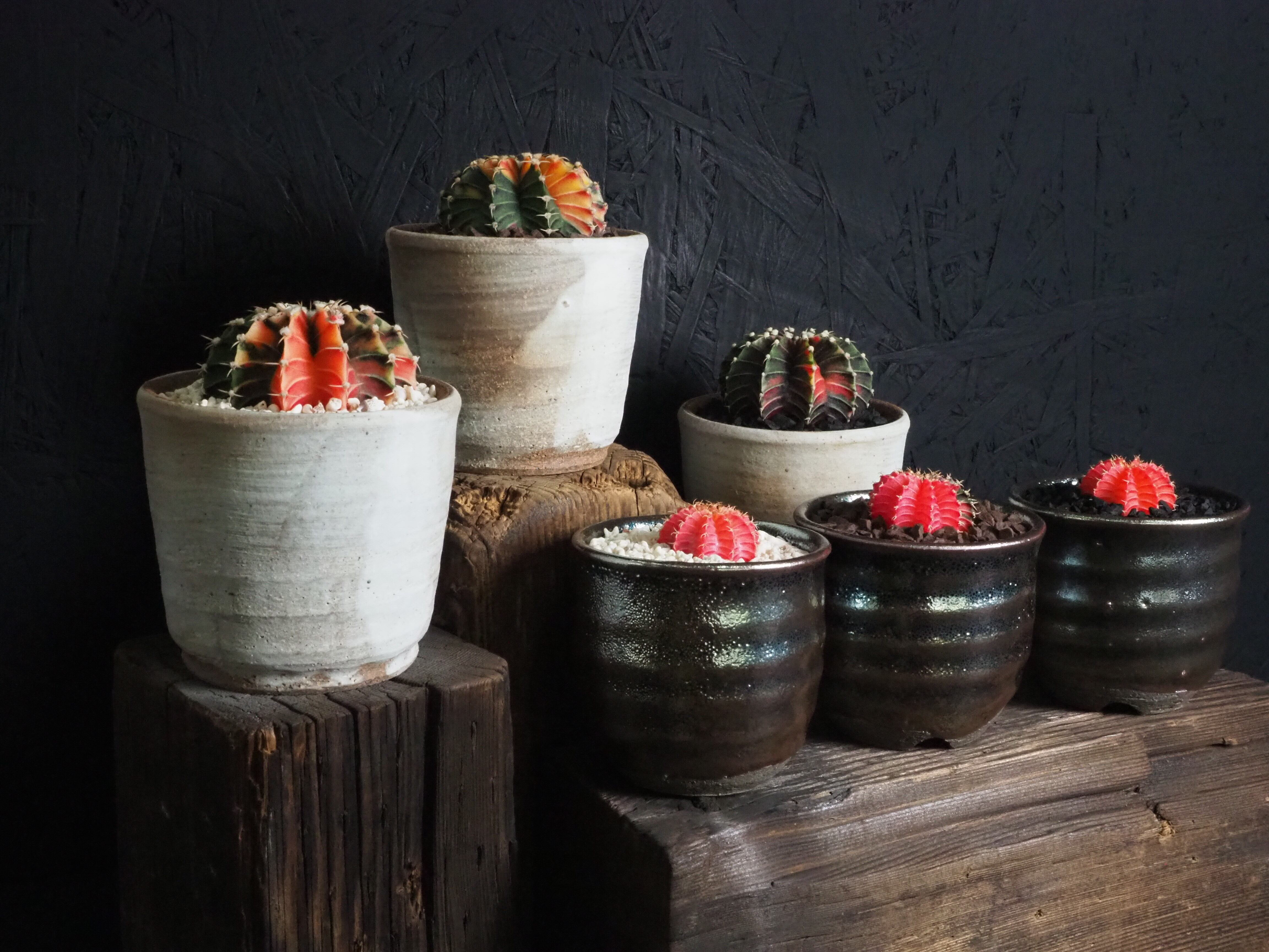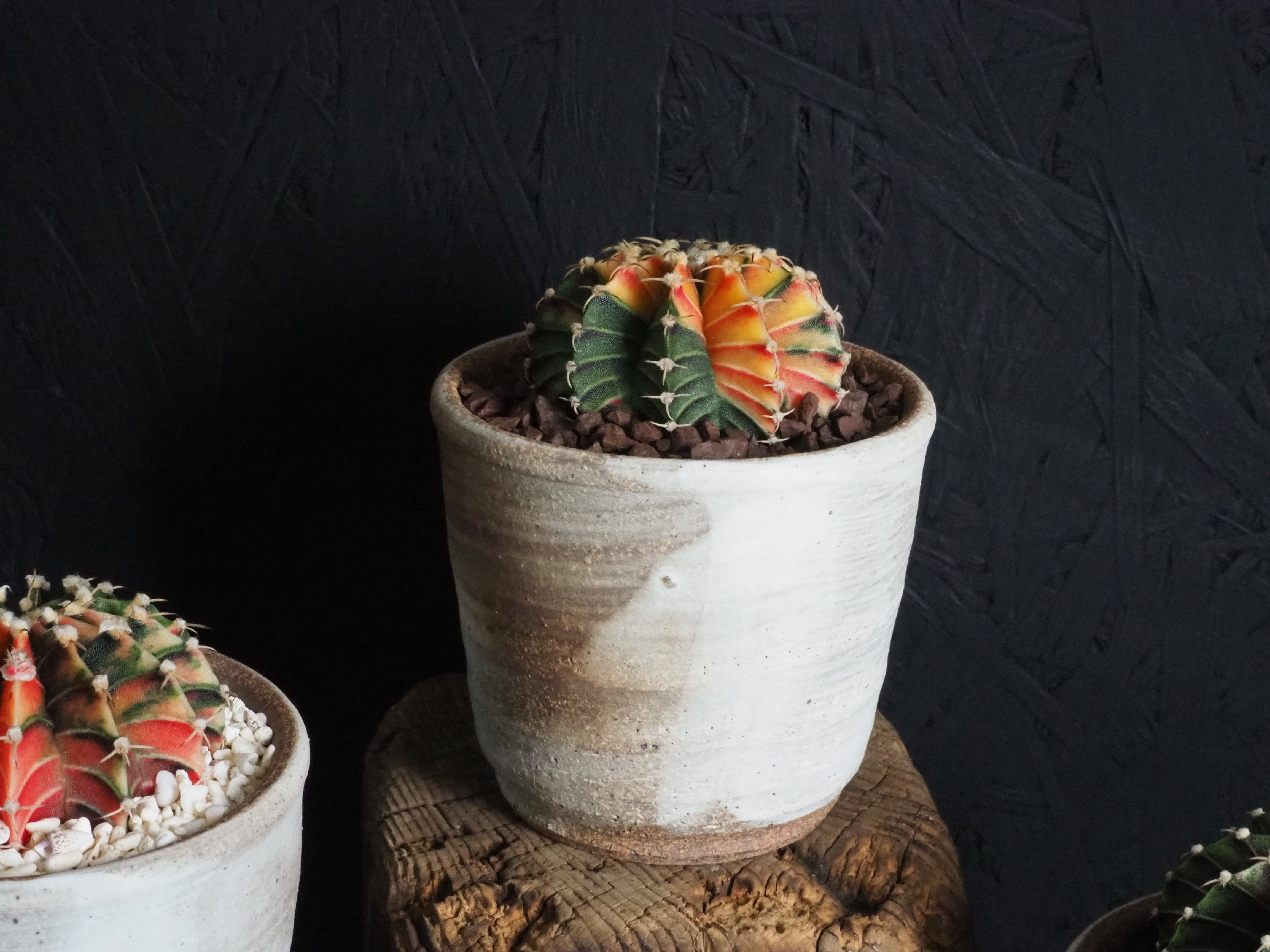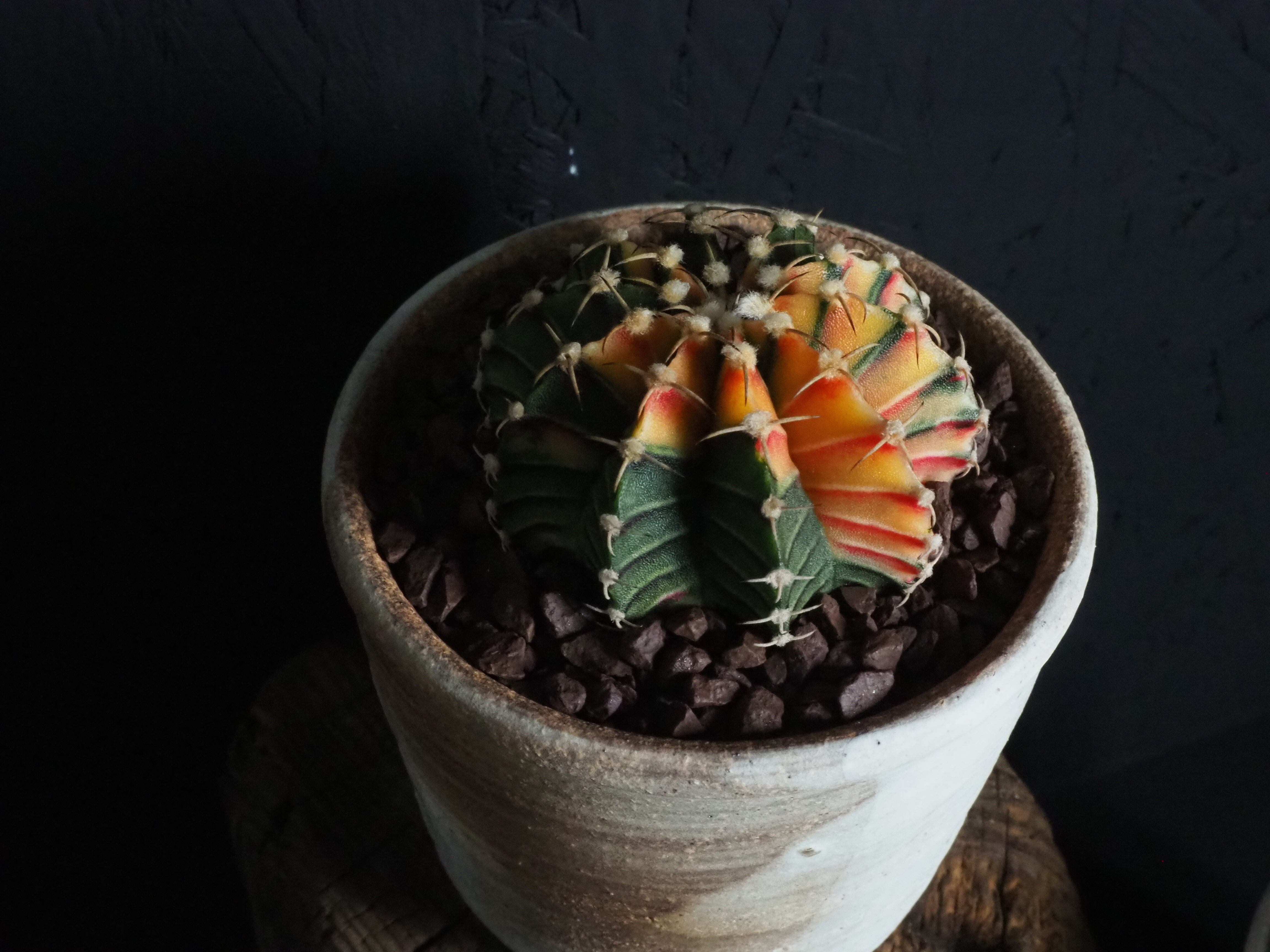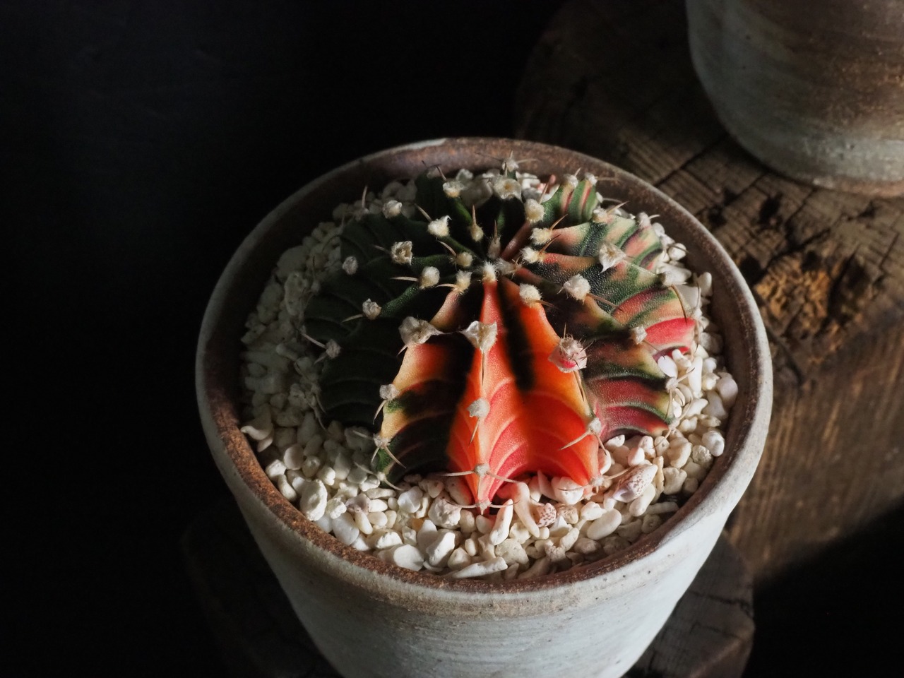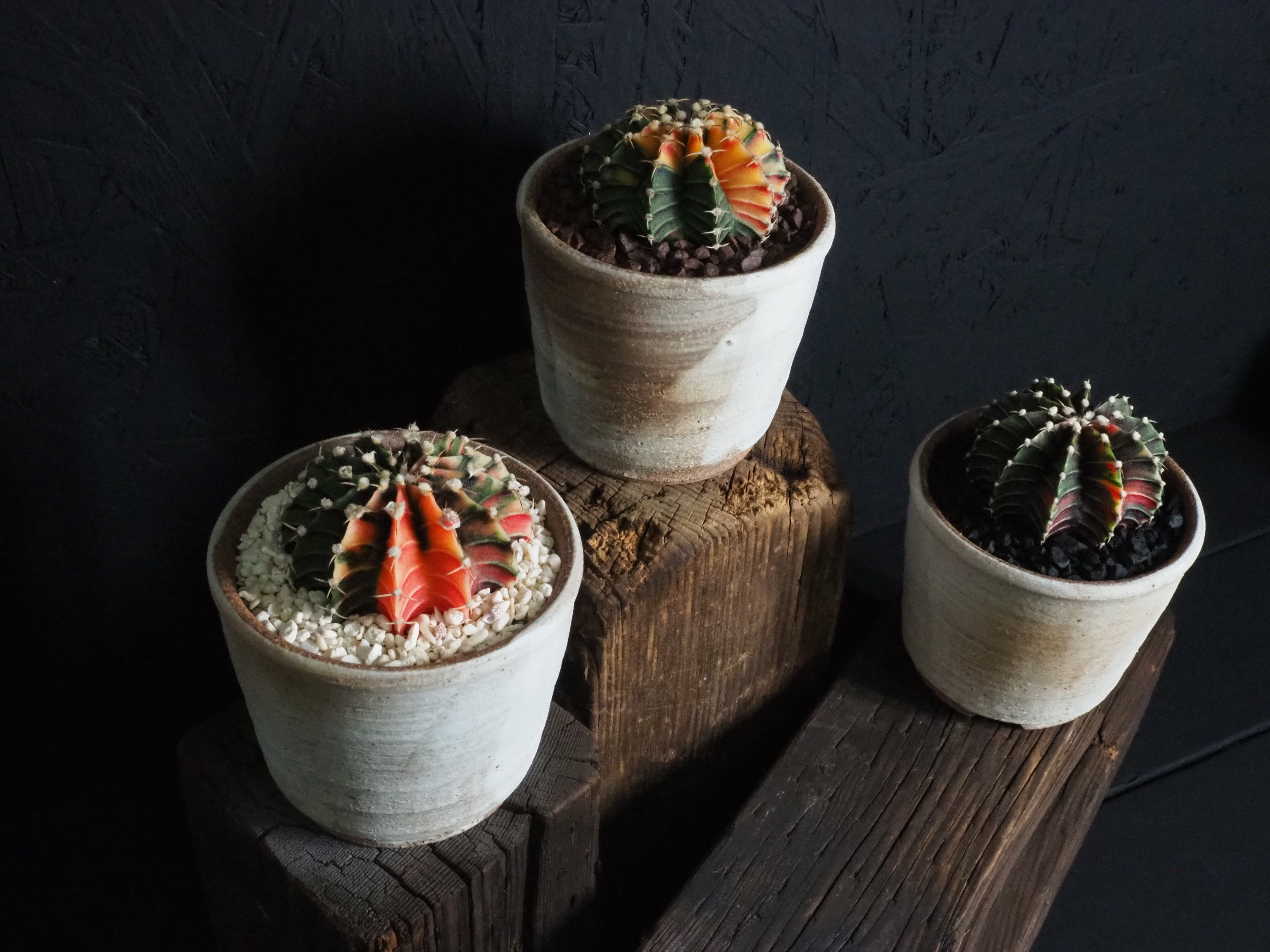 赤系、オレンジ系、ピンク系など、発色が大変強く非常に鮮やかで美しいのが最大の特徴です。それらが幾何学的な模様で絡みあい発色する様は正にアメージング。素晴らしいハイブリッドサボテンです。照度管理の違いで発色の濃淡が現れ、生命の躍動を感じさせてくれます。