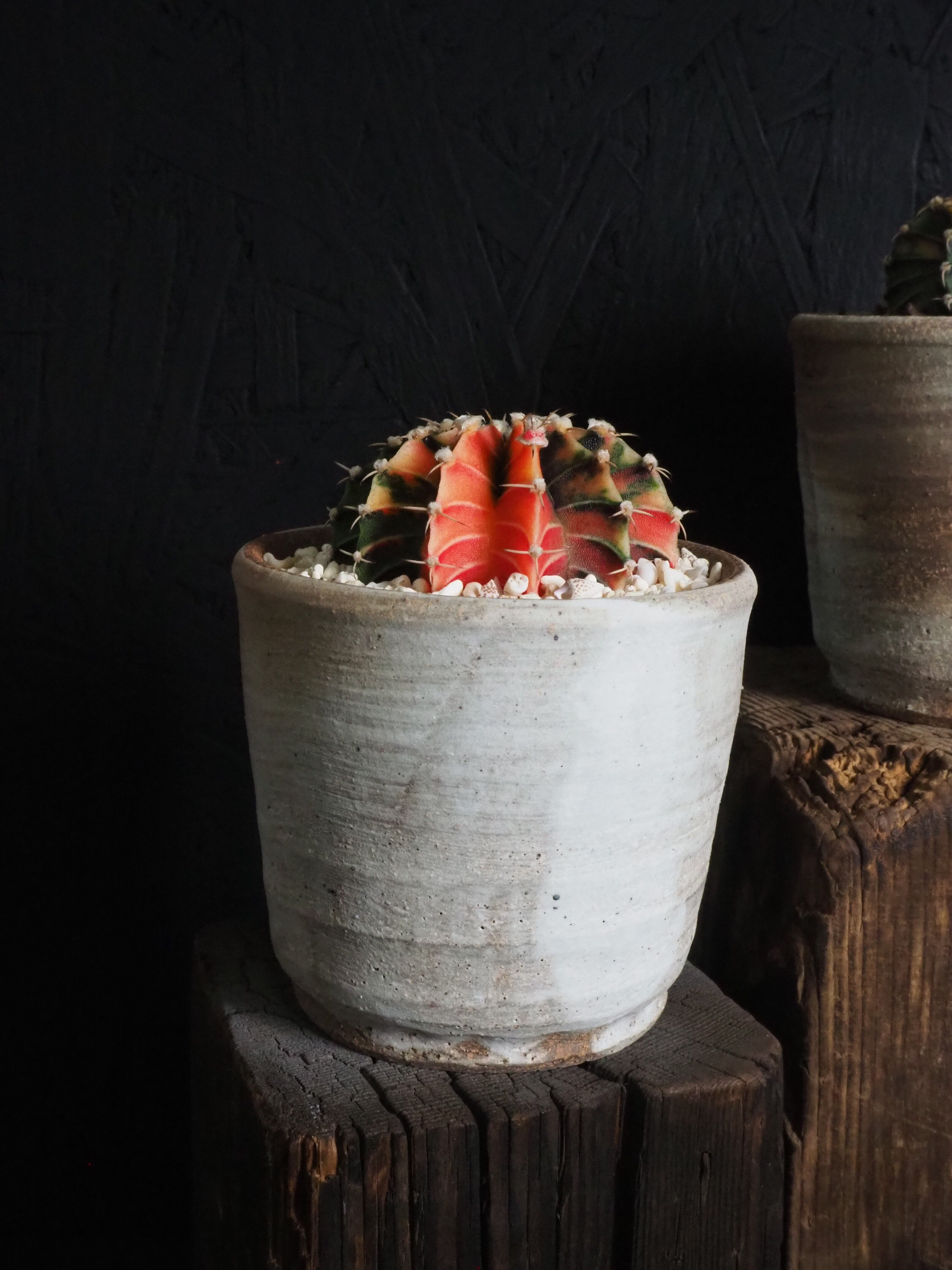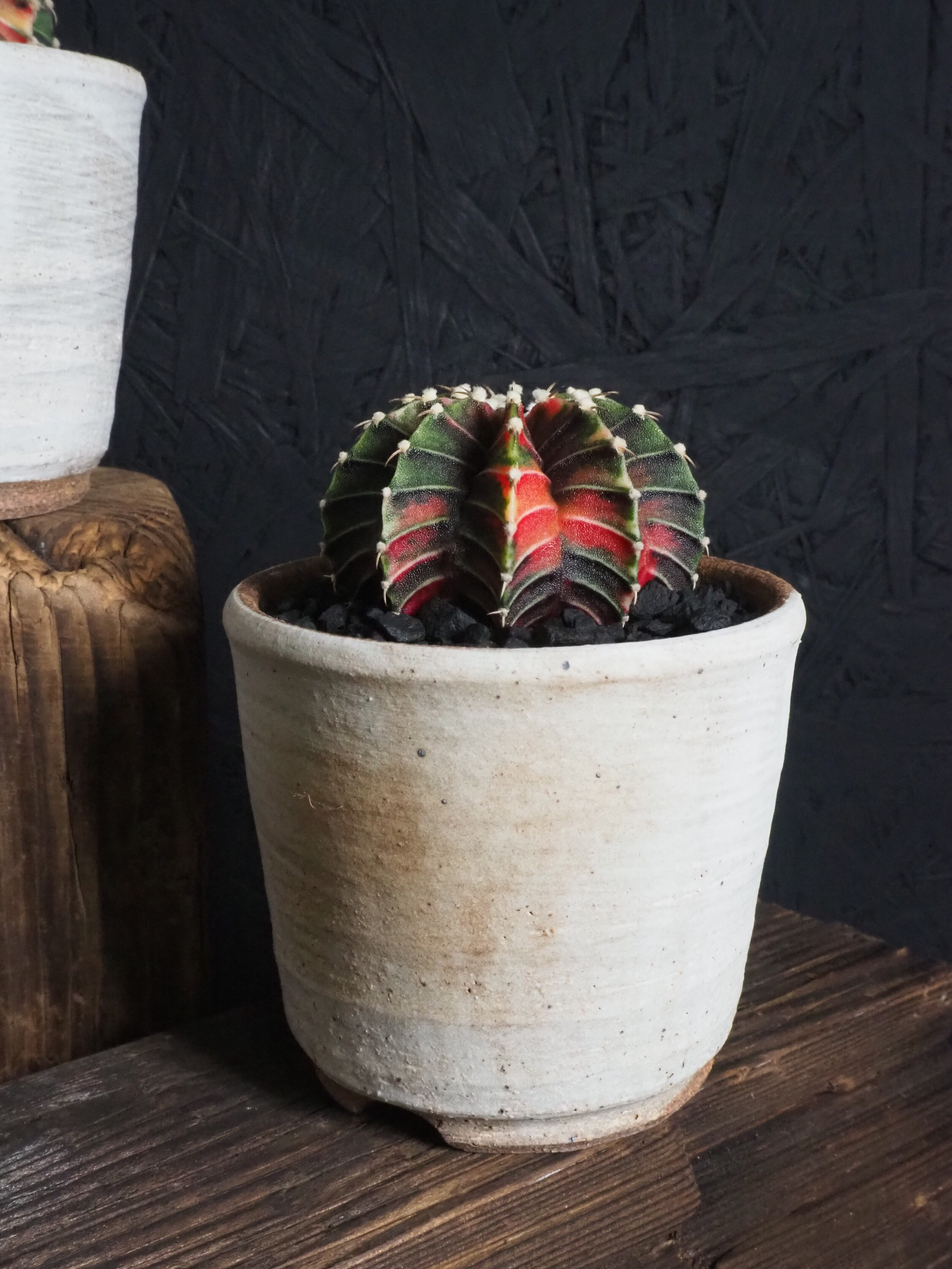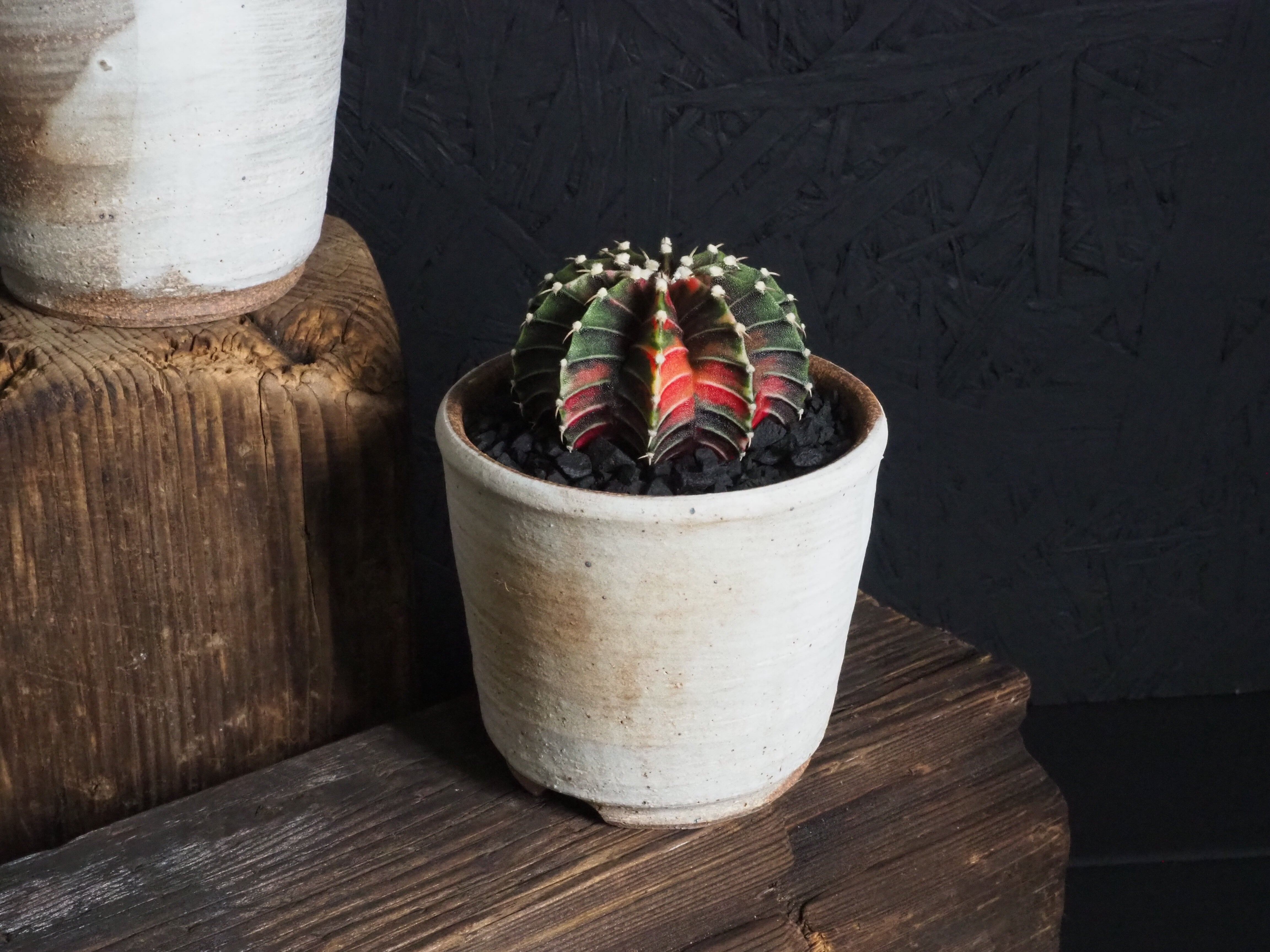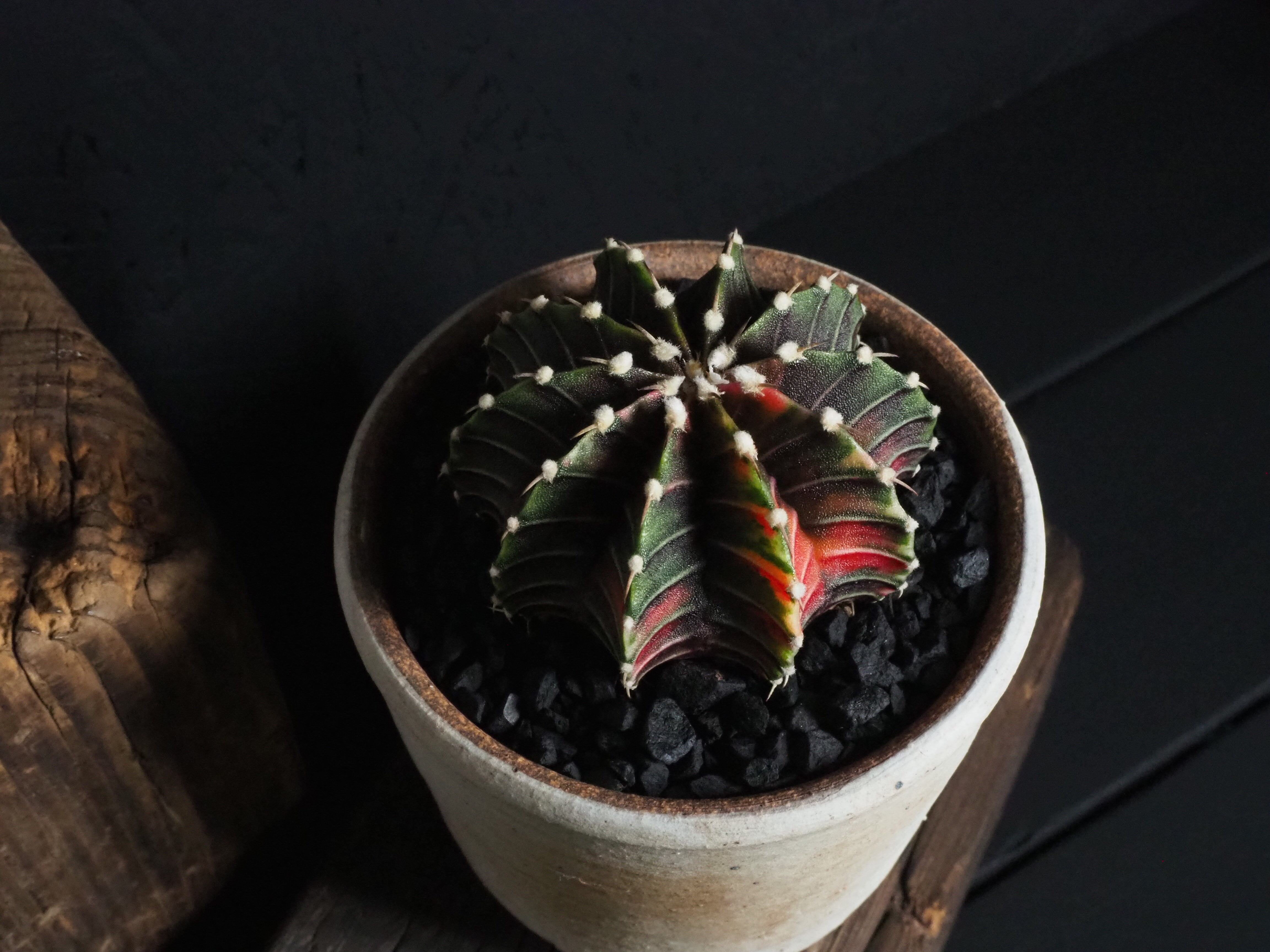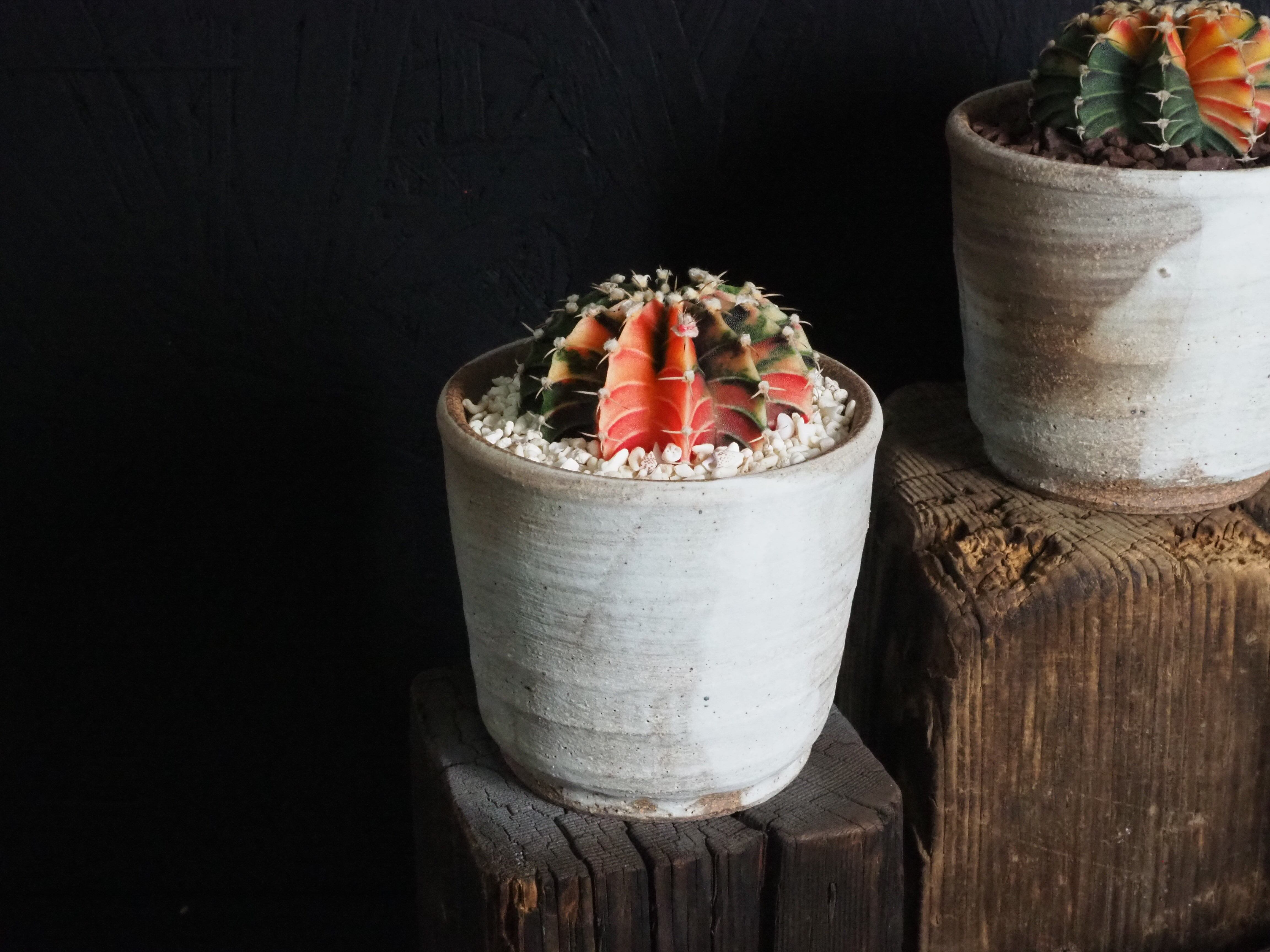 赤系、オレンジ系、ピンク系など、発色が大変強く非常に鮮やかで美しいのが最大の特徴です。それらが幾何学的な模様で絡みあい発色する様は正にアメージング。素晴らしいハイブリッドサボテンです。照度管理の違いで発色の濃淡が現れ、生命の躍動を感じさせてくれます。