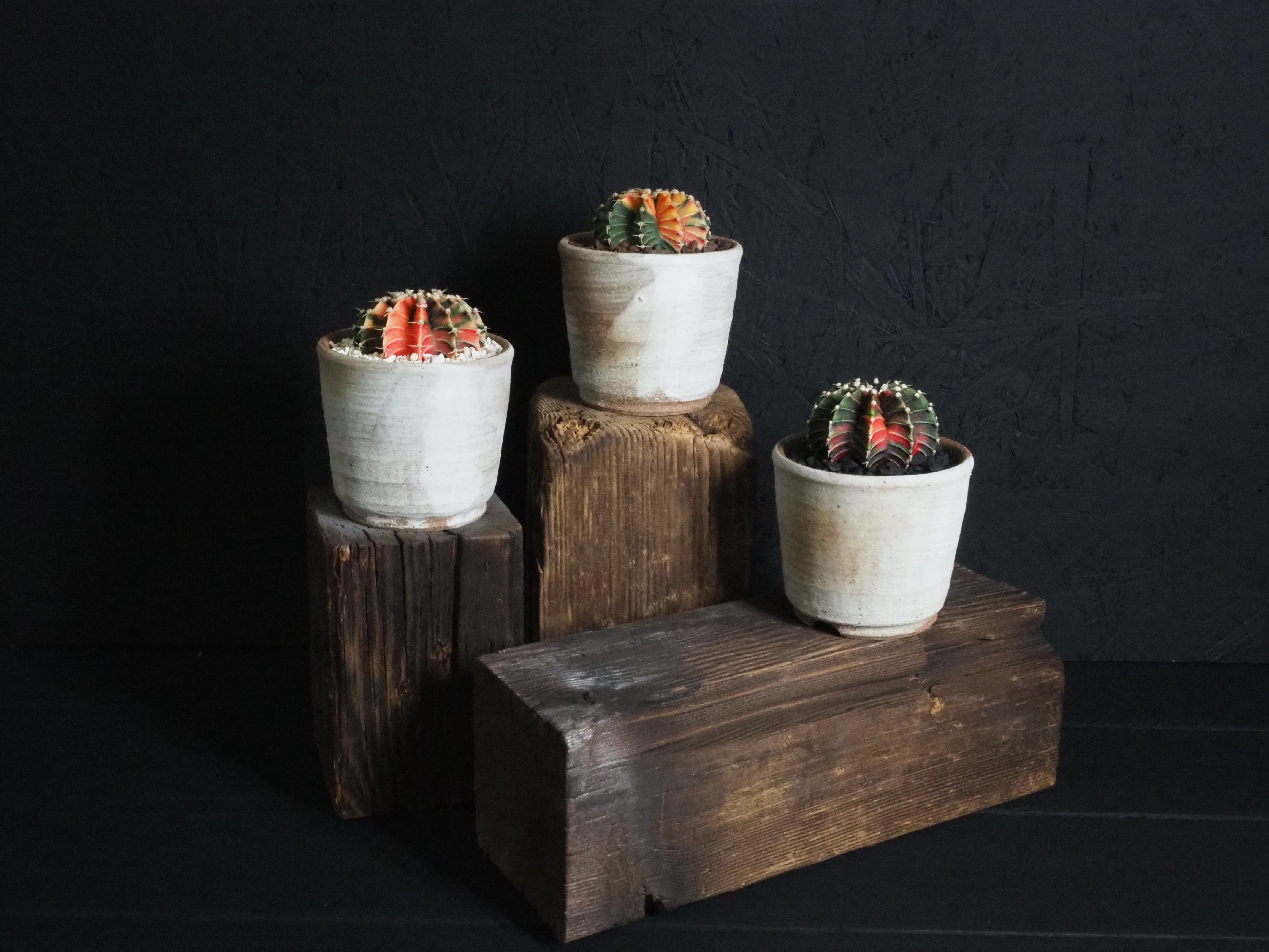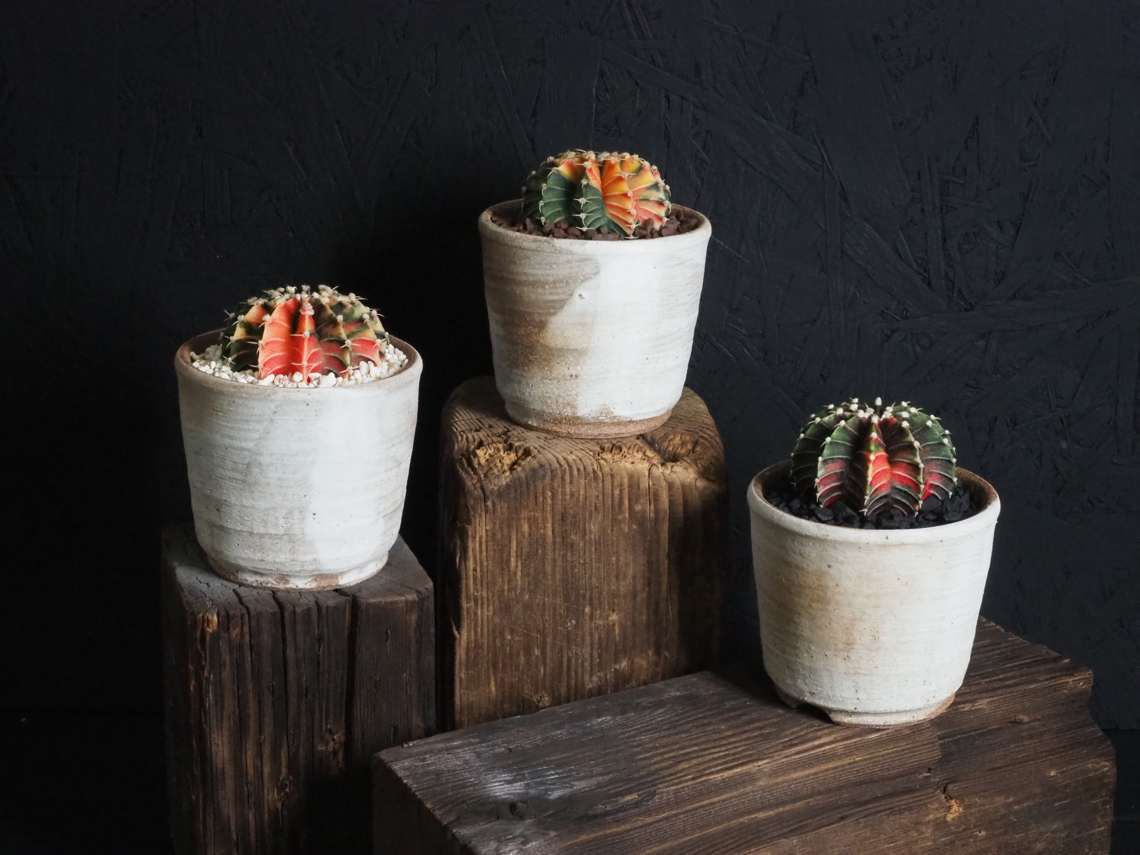 当店イチオシの信楽焼き『白刷毛目』にLB2178ハイブリッド錦を合わせ、深みと渋さが染み入るような一品に仕上げました。贅沢に三株で並べて観賞すると更に深みが増すような何とも言えない雰囲気を醸し出してくれています。