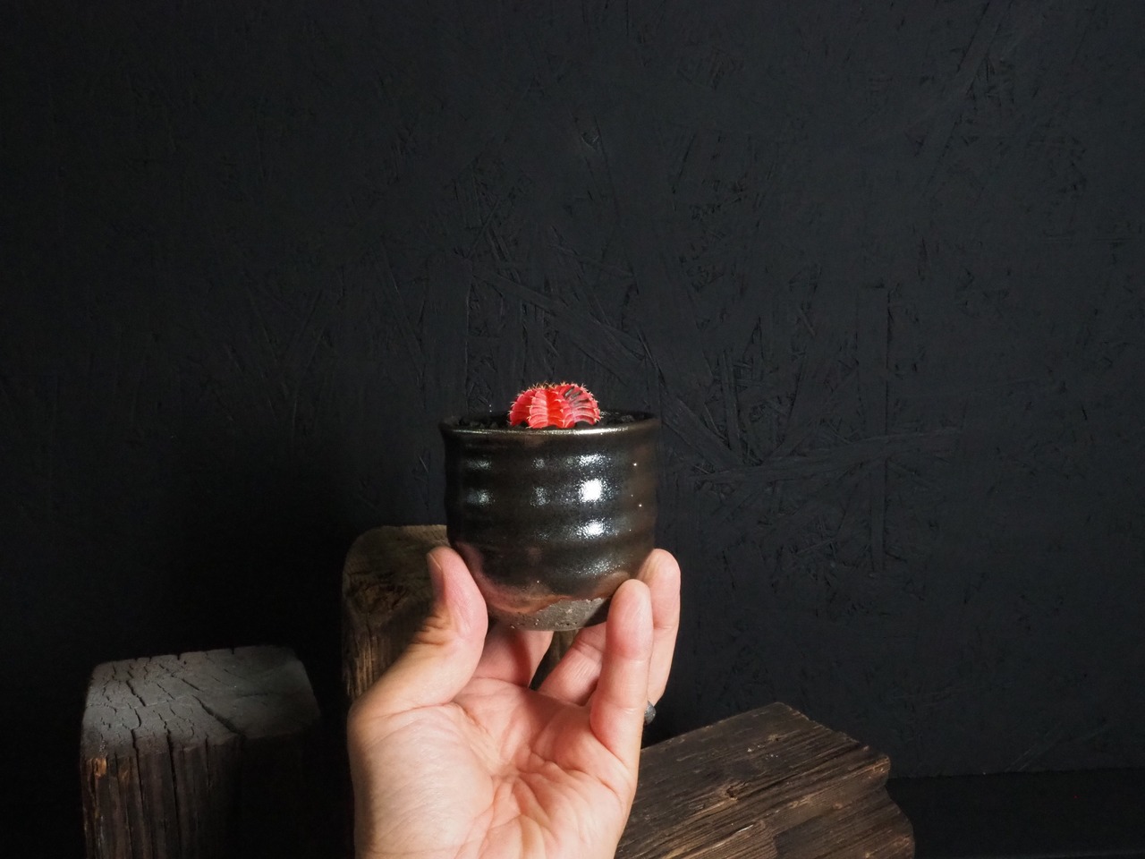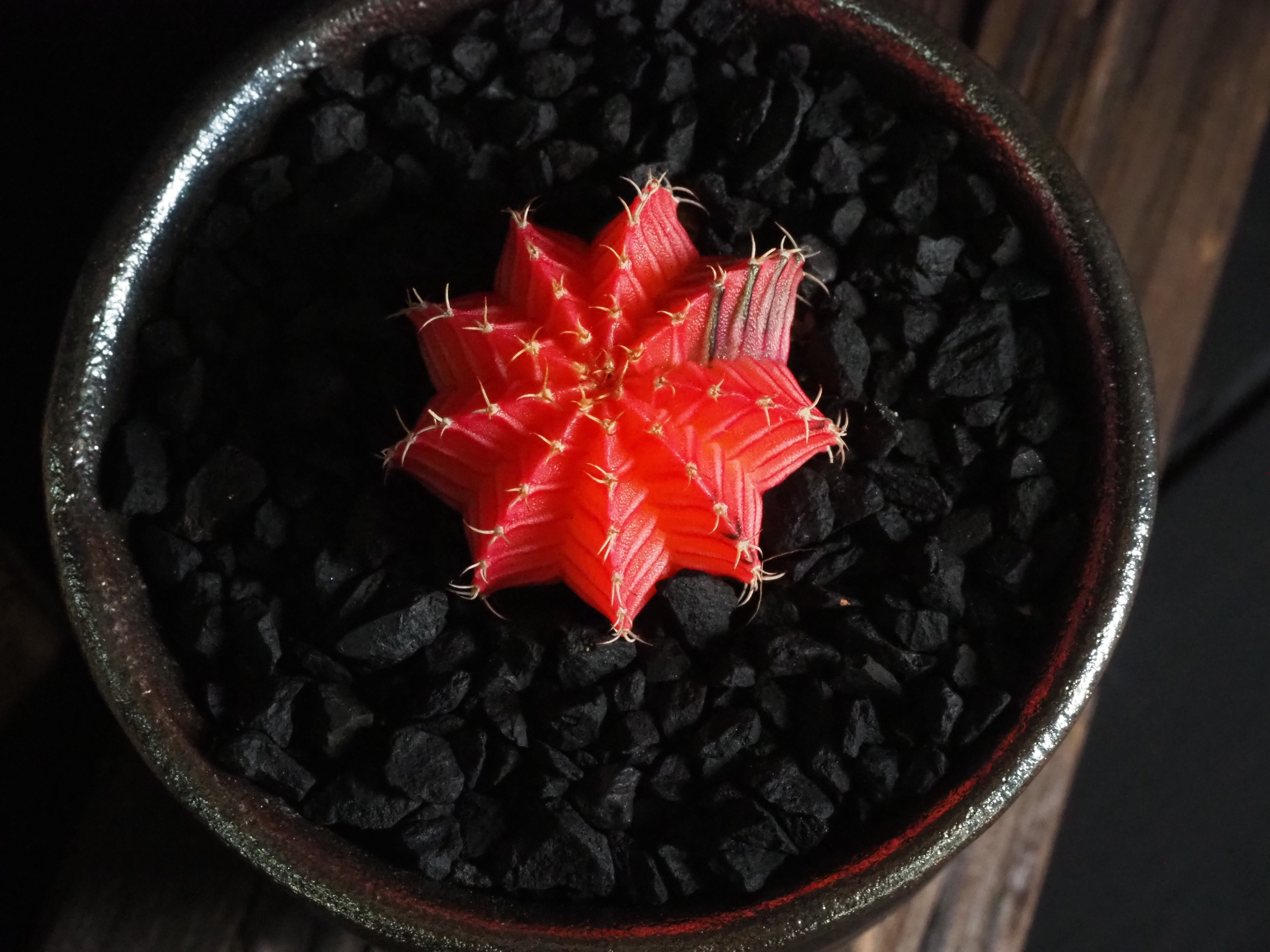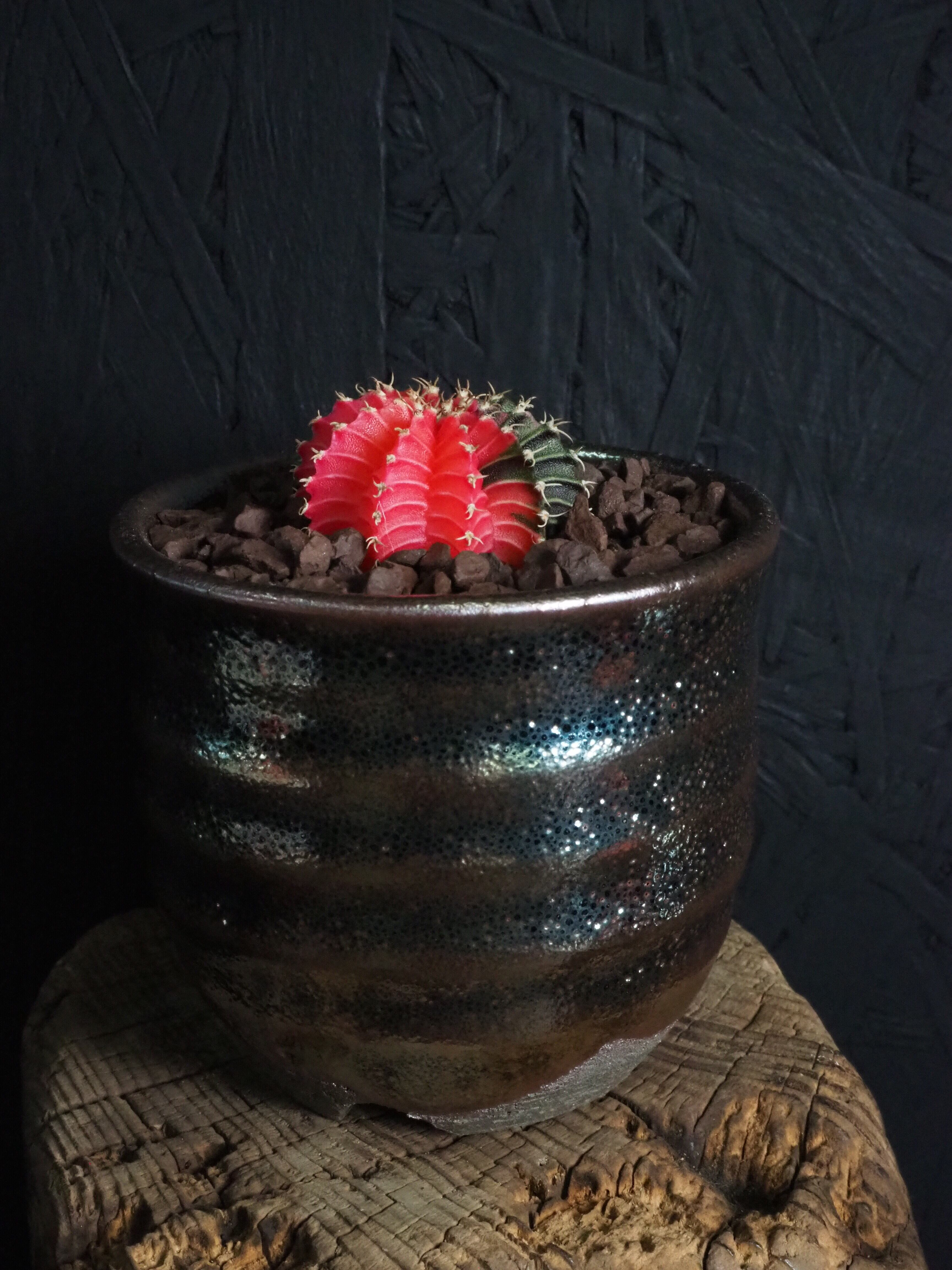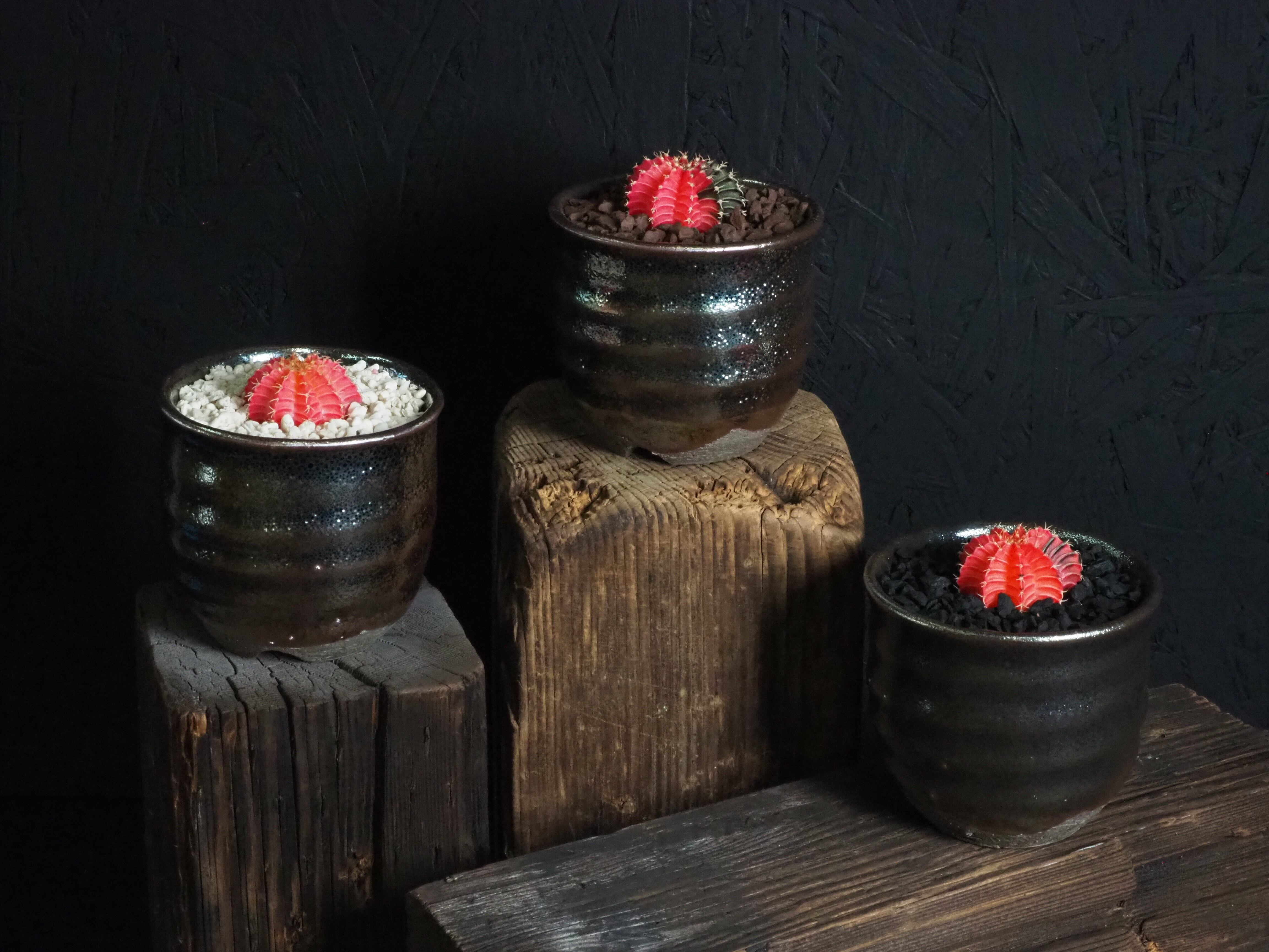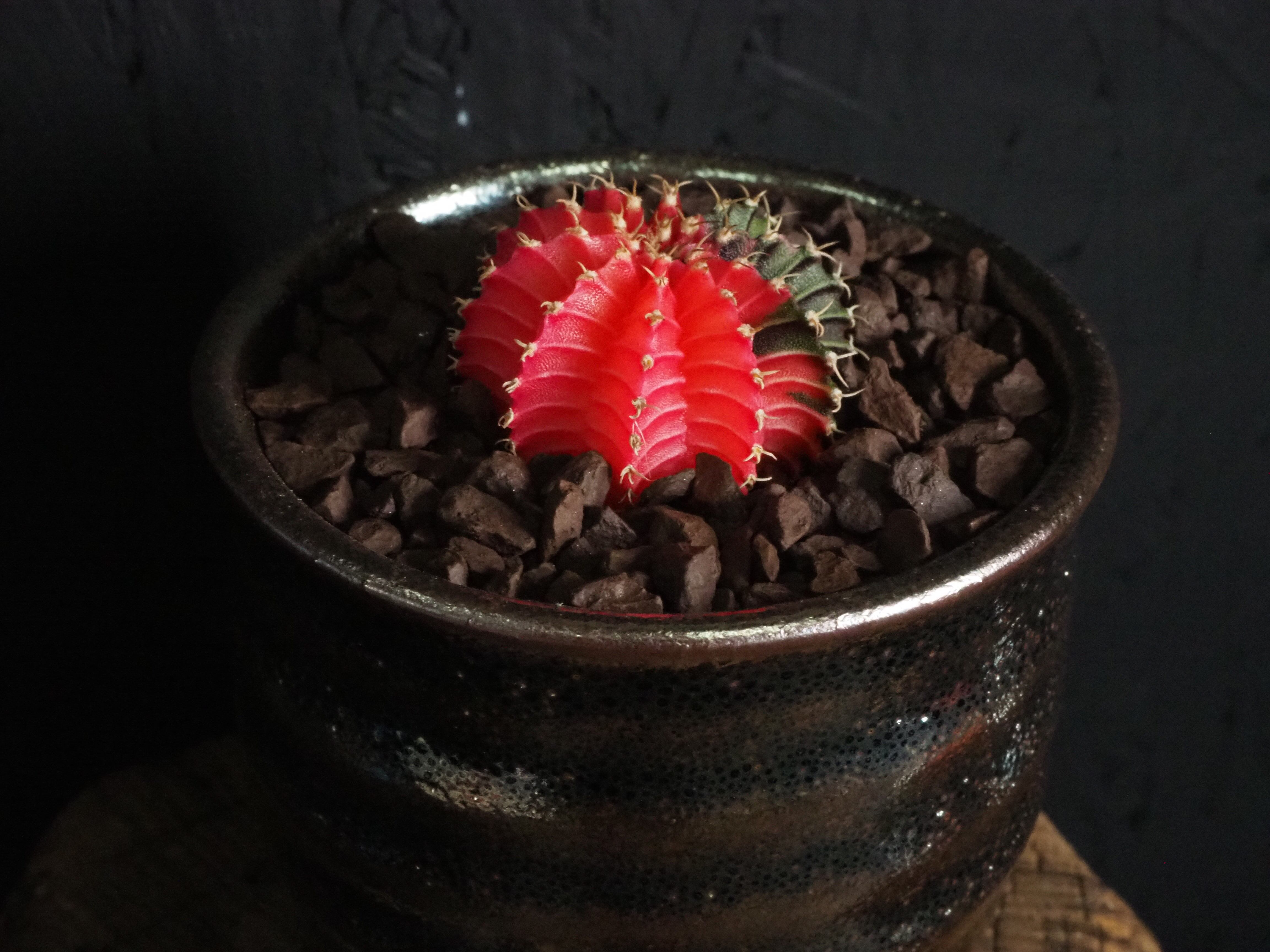 赤系、オレンジ系、ピンク系など、発色が大変強く非常に鮮やかで美しいのが最大の特徴です。それらが幾何学的な模様で絡みあい発色する様は正にアメージング。素晴らしいハイブリッドサボテンです。照度管理の違いで発色の濃淡が現れ、生命の躍動を感じさせてくれます。