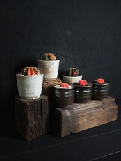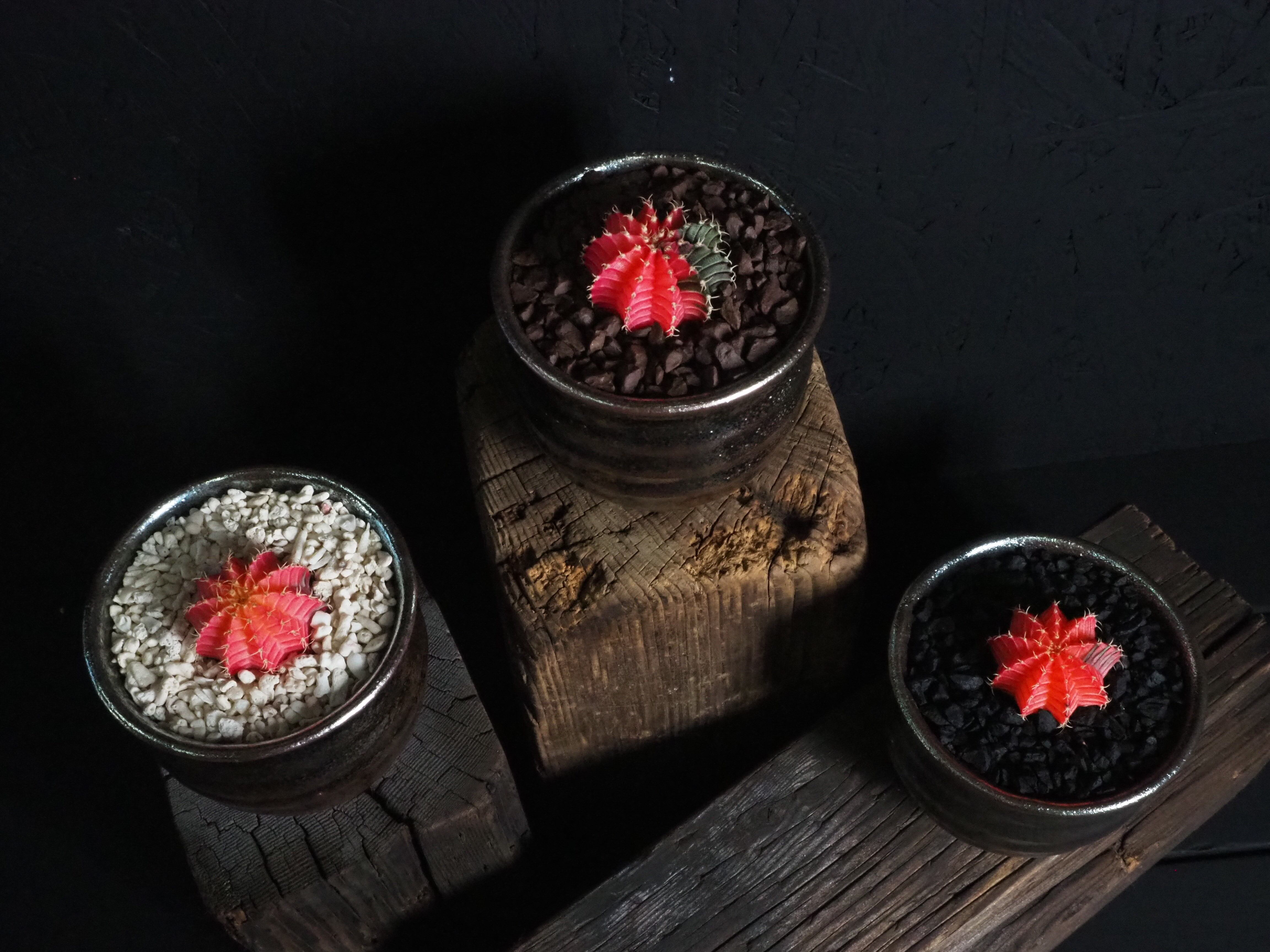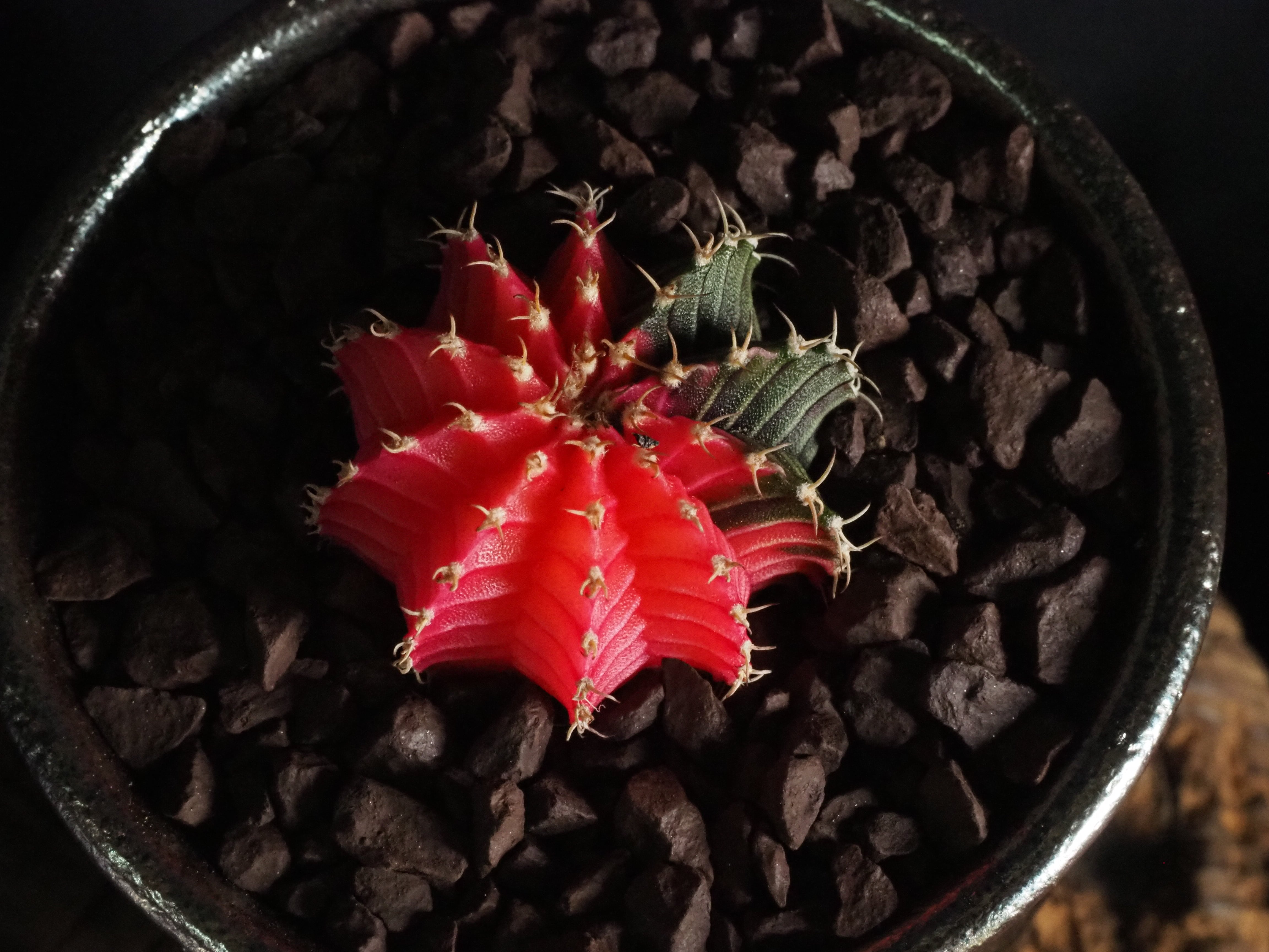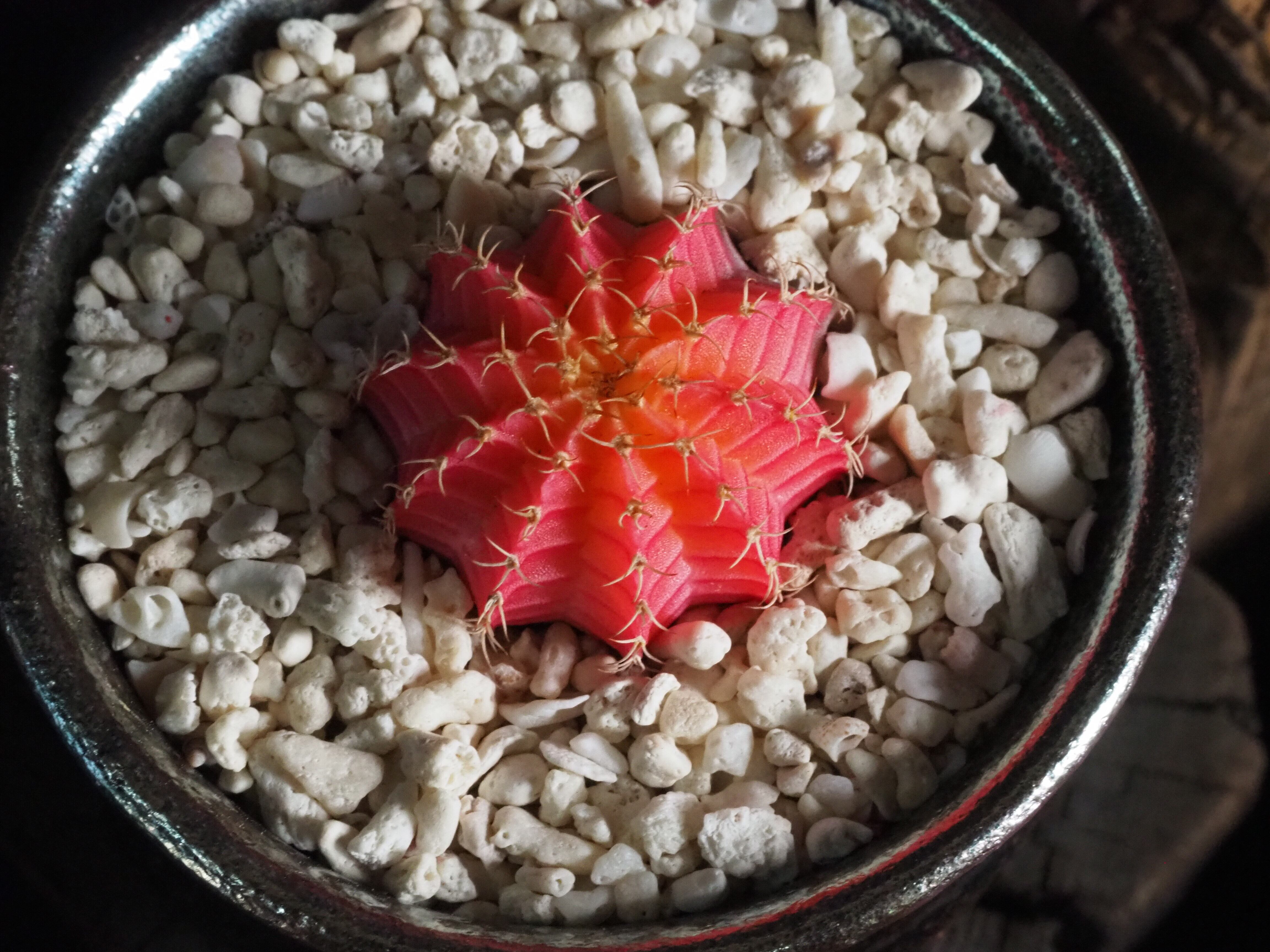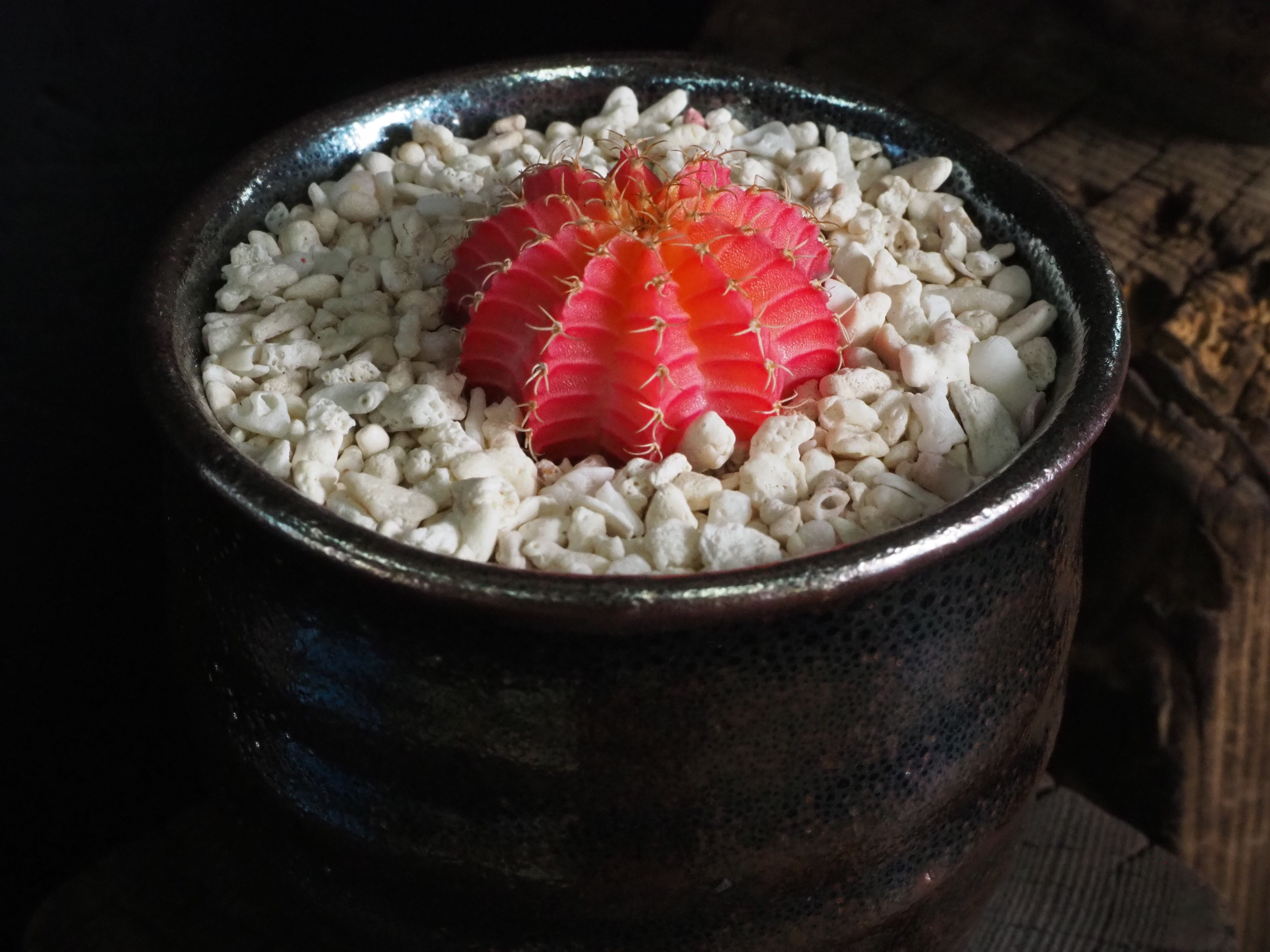 赤系、オレンジ系、ピンク系など、発色が大変強く非常に鮮やかで美しいのが最大の特徴です。それらが幾何学的な模様で絡みあい発色する様は正にアメージング。素晴らしいハイブリッドサボテンです。照度管理の違いで発色の濃淡が現れ、生命の躍動を感じさせてくれます。