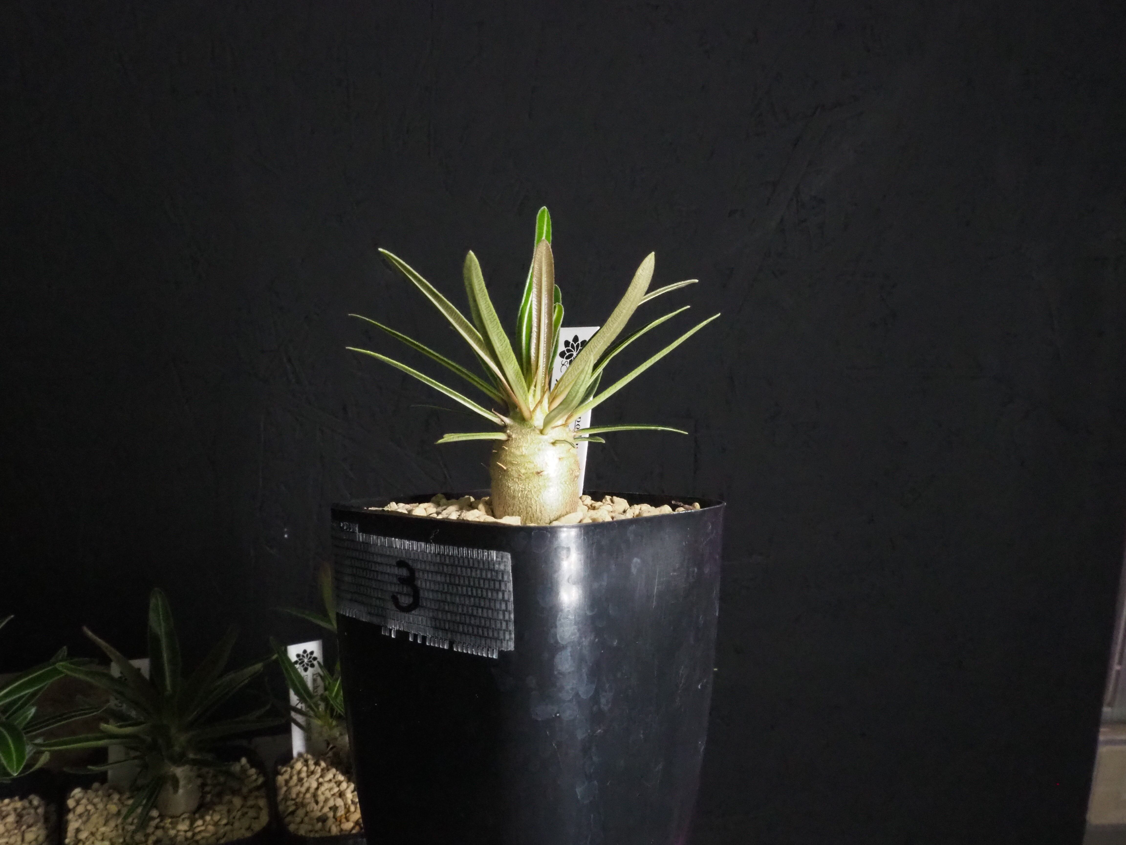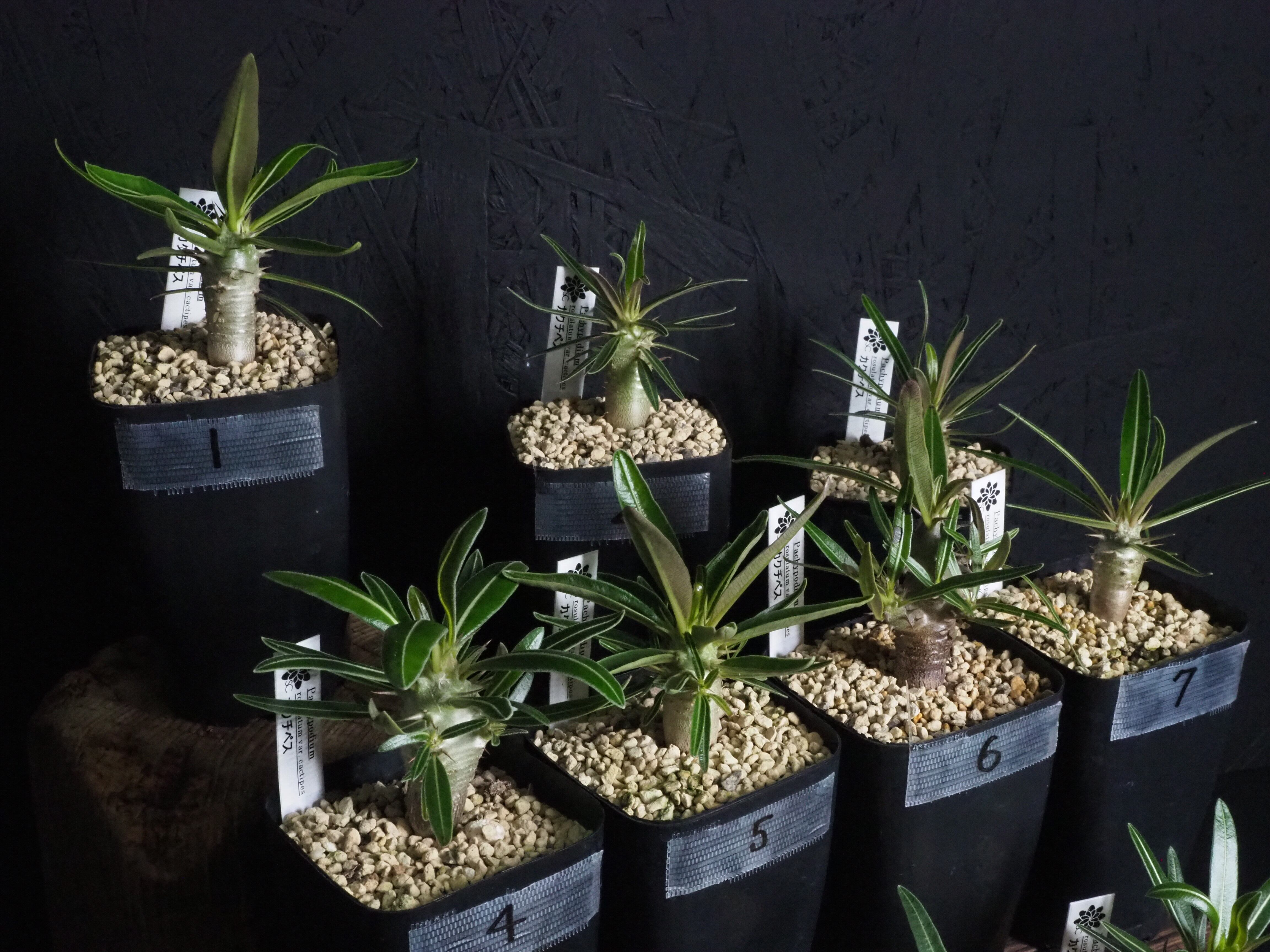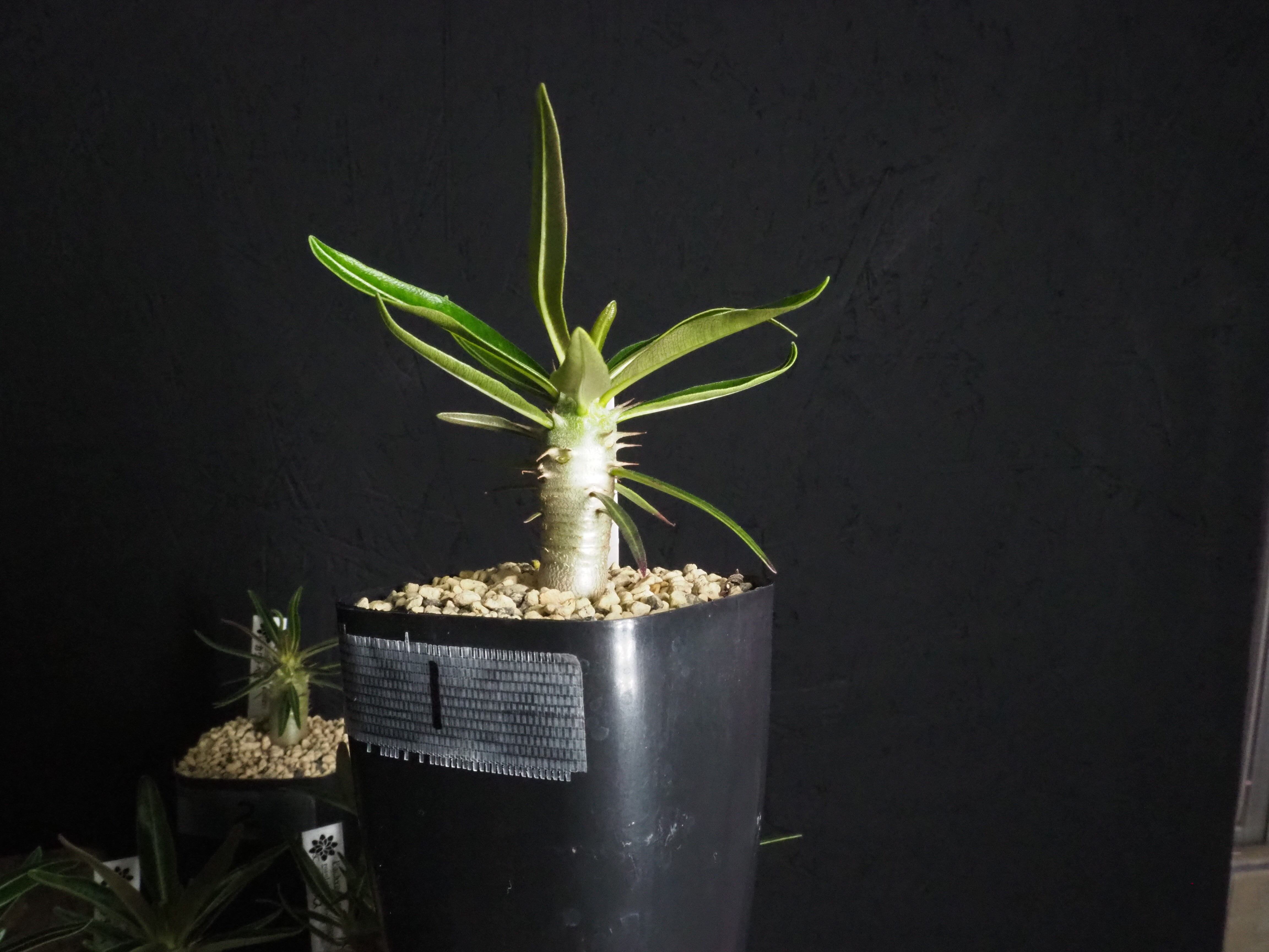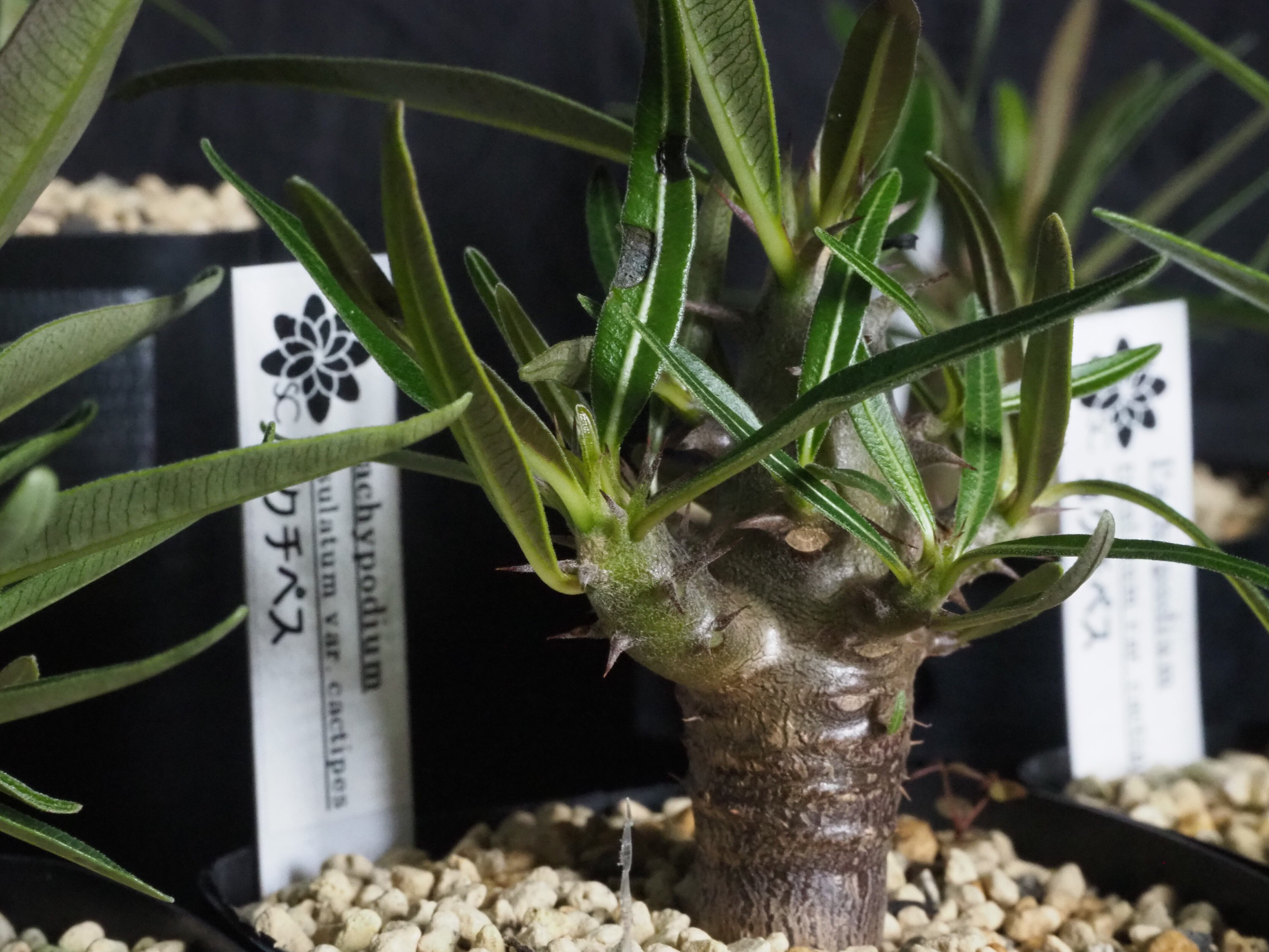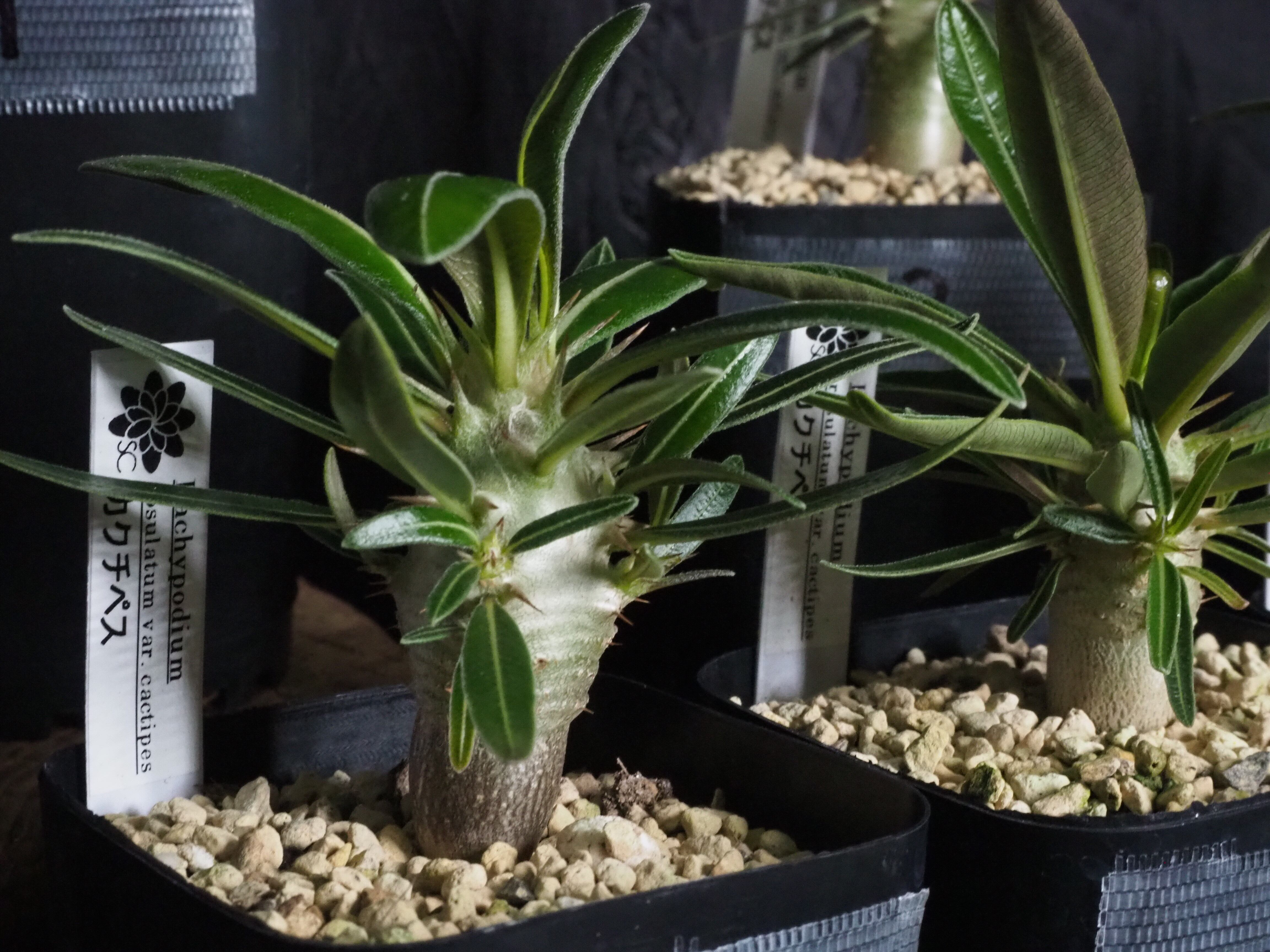 パキポディウム・カクチペス<実生>になります。実生のチビですが、日に良く当ててある程度大きくなってくるとカクチペスの特徴でもある「赤肌」になり、そしてレモンイエローの花が咲きますよ。生長期は風通し良い場所でとにかく日に良く当てることで生長スイッチが入ります。梅雨時の長雨は気を付ける必要がありますが、基本雨ざらしの直射日光下で管理した方が丈夫に育ちます。寒さにはパキポディウムの中でも弱い方なので、冬は日の当たる暖かい屋内で管理しましょう。基本的には他のパキポディウム達と想用の扱いをしてください。