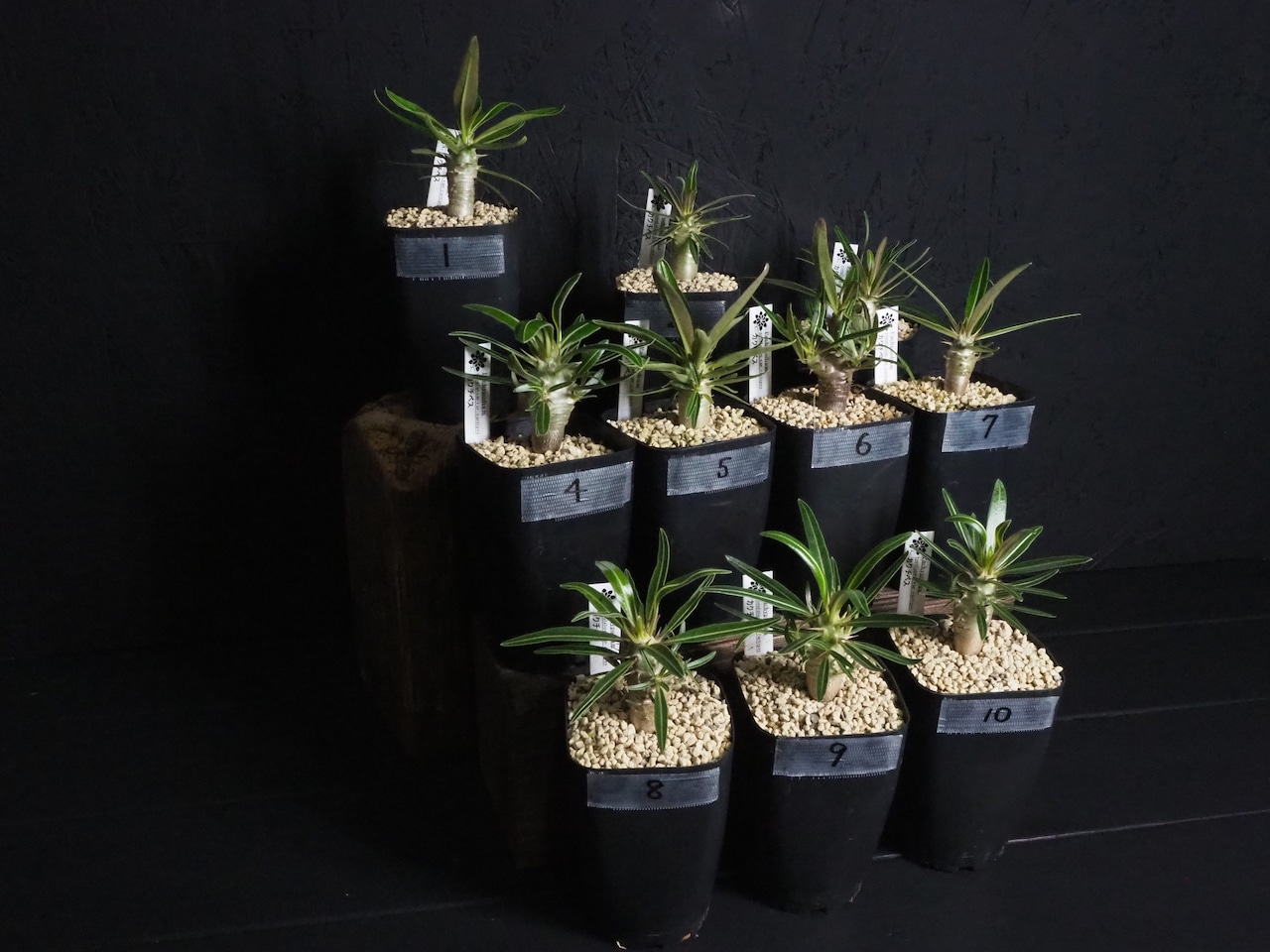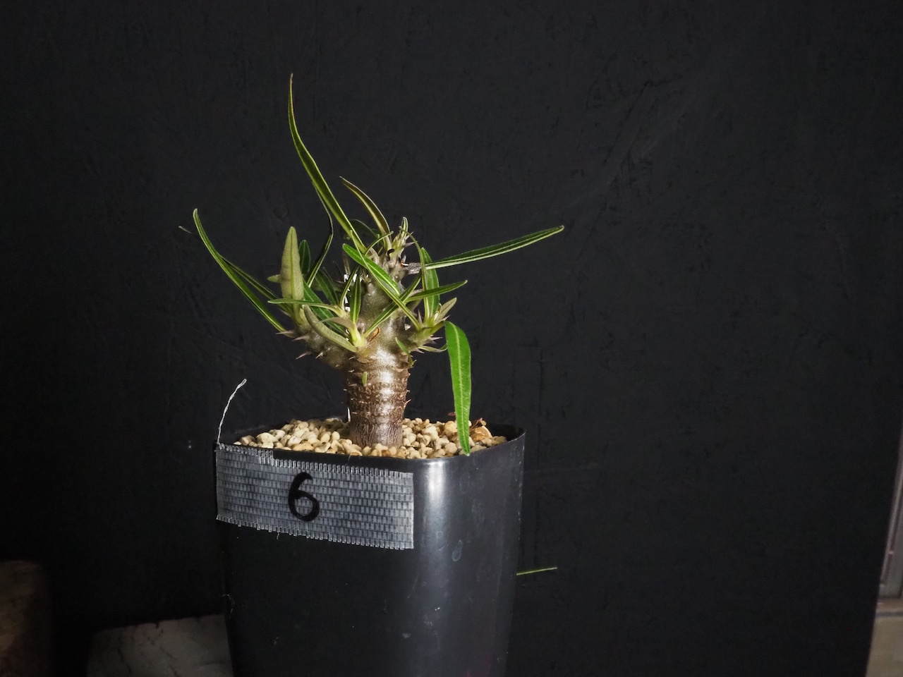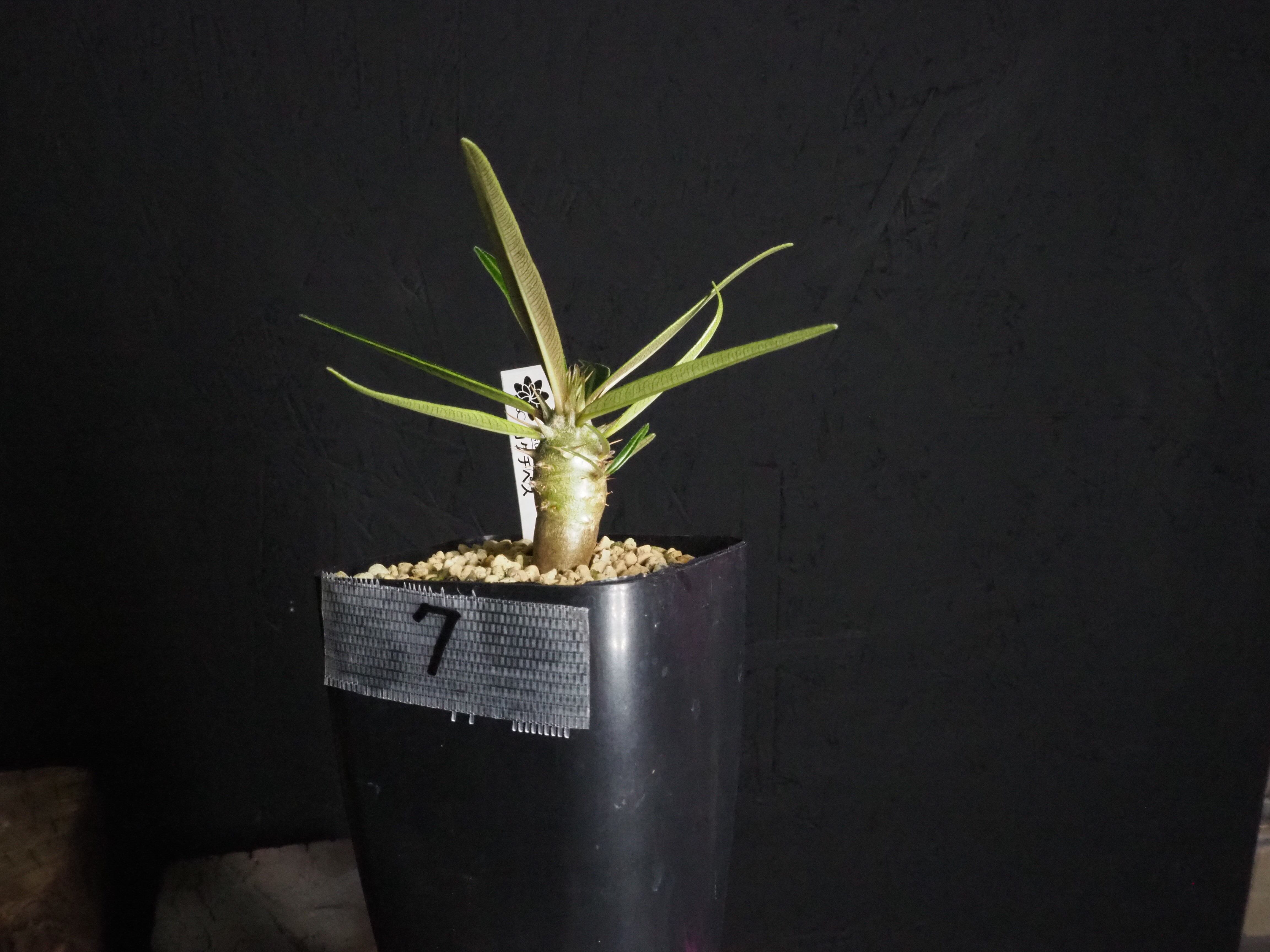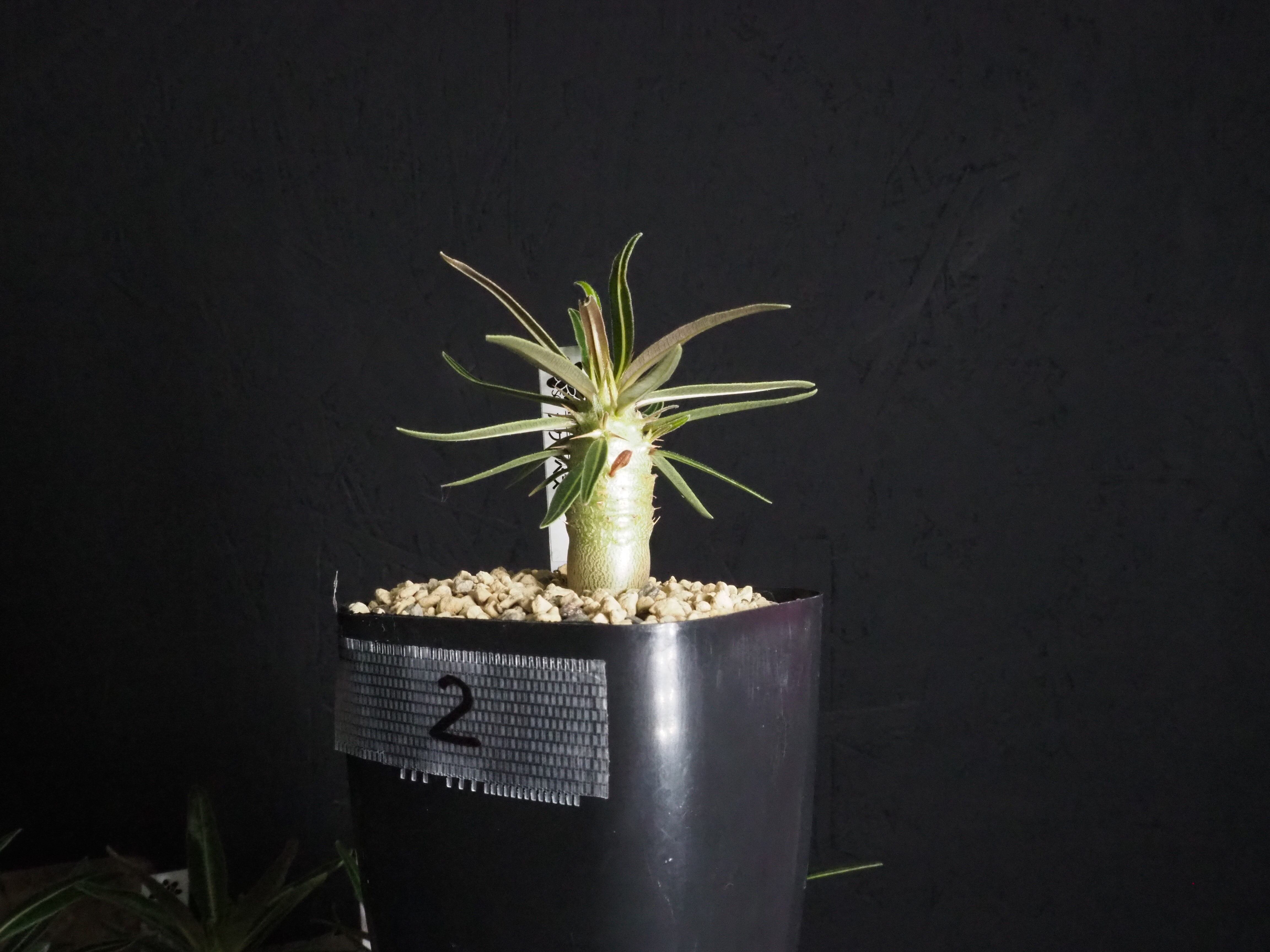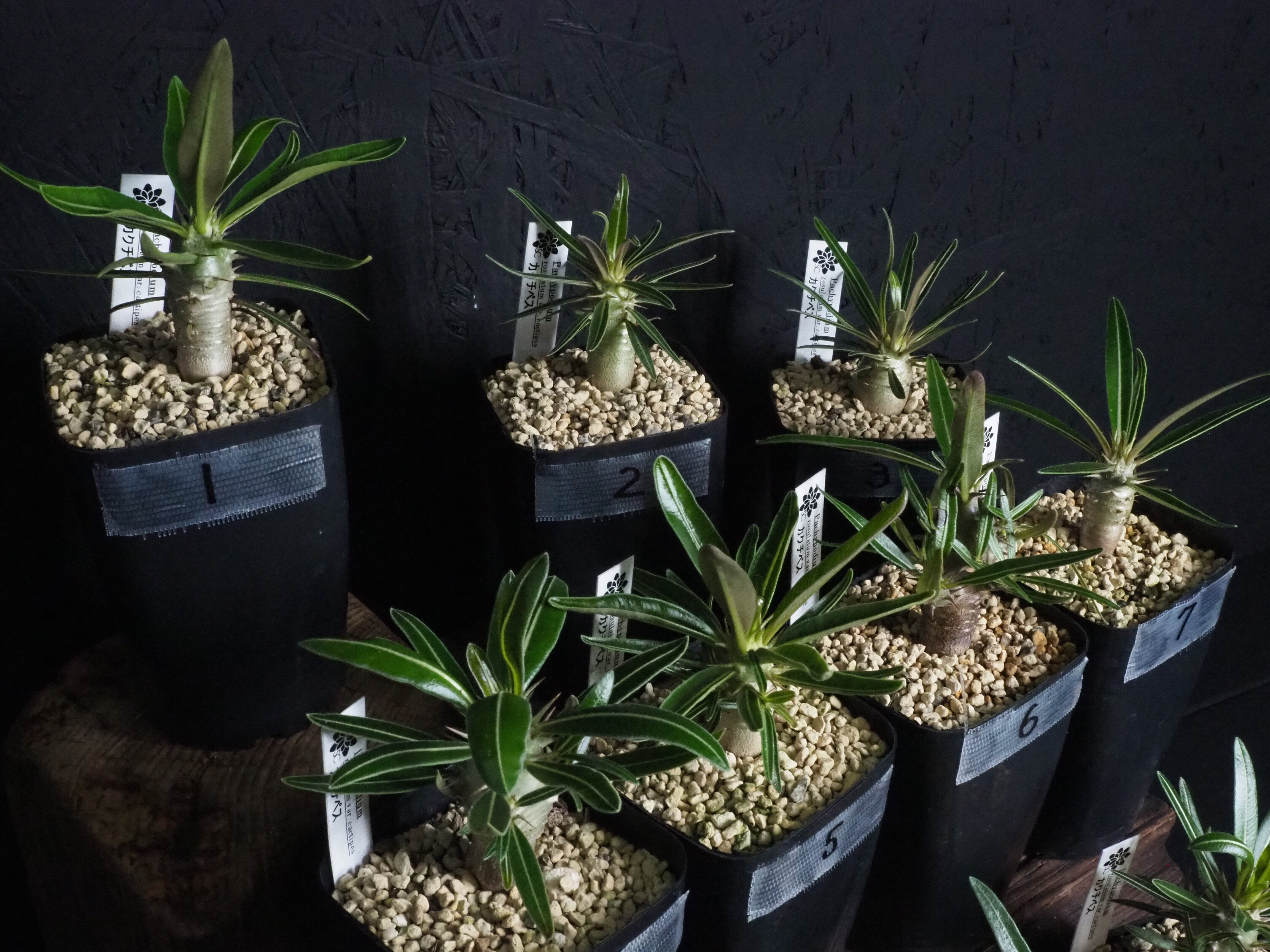 パキポディウム・カクチペス<実生>になります。実生のチビですが、日に良く当ててある程度大きくなってくるとカクチペスの特徴でもある「赤肌」になり、そしてレモンイエローの花が咲きますよ。生長期は風通し良い場所でとにかく日に良く当てることで生長スイッチが入ります。梅雨時の長雨は気を付ける必要がありますが、基本雨ざらしの直射日光下で管理した方が丈夫に育ちます。寒さにはパキポディウムの中でも弱い方なので、冬は日の当たる暖かい屋内で管理しましょう。基本的には他のパキポディウム達と想用の扱いをしてください。