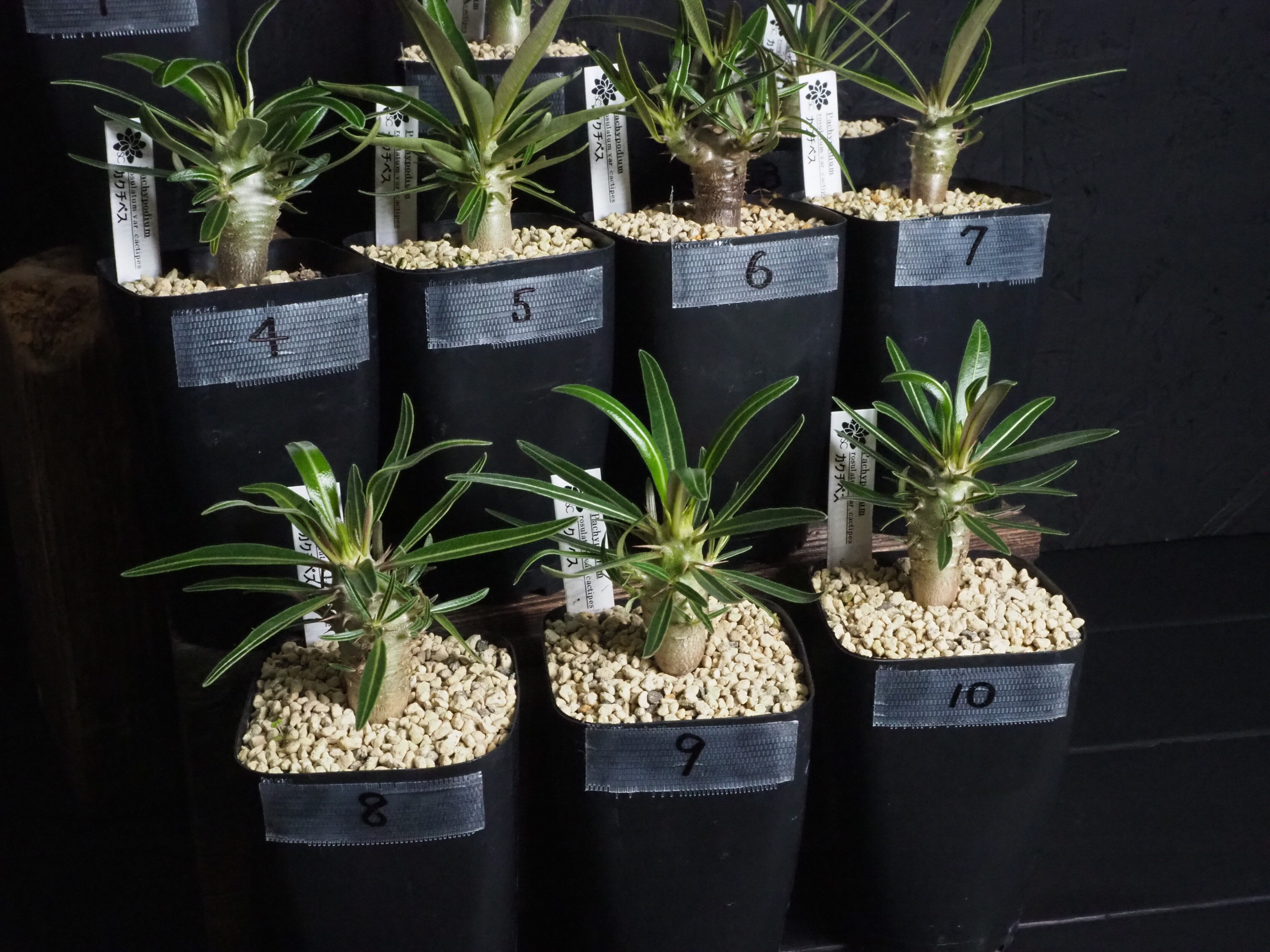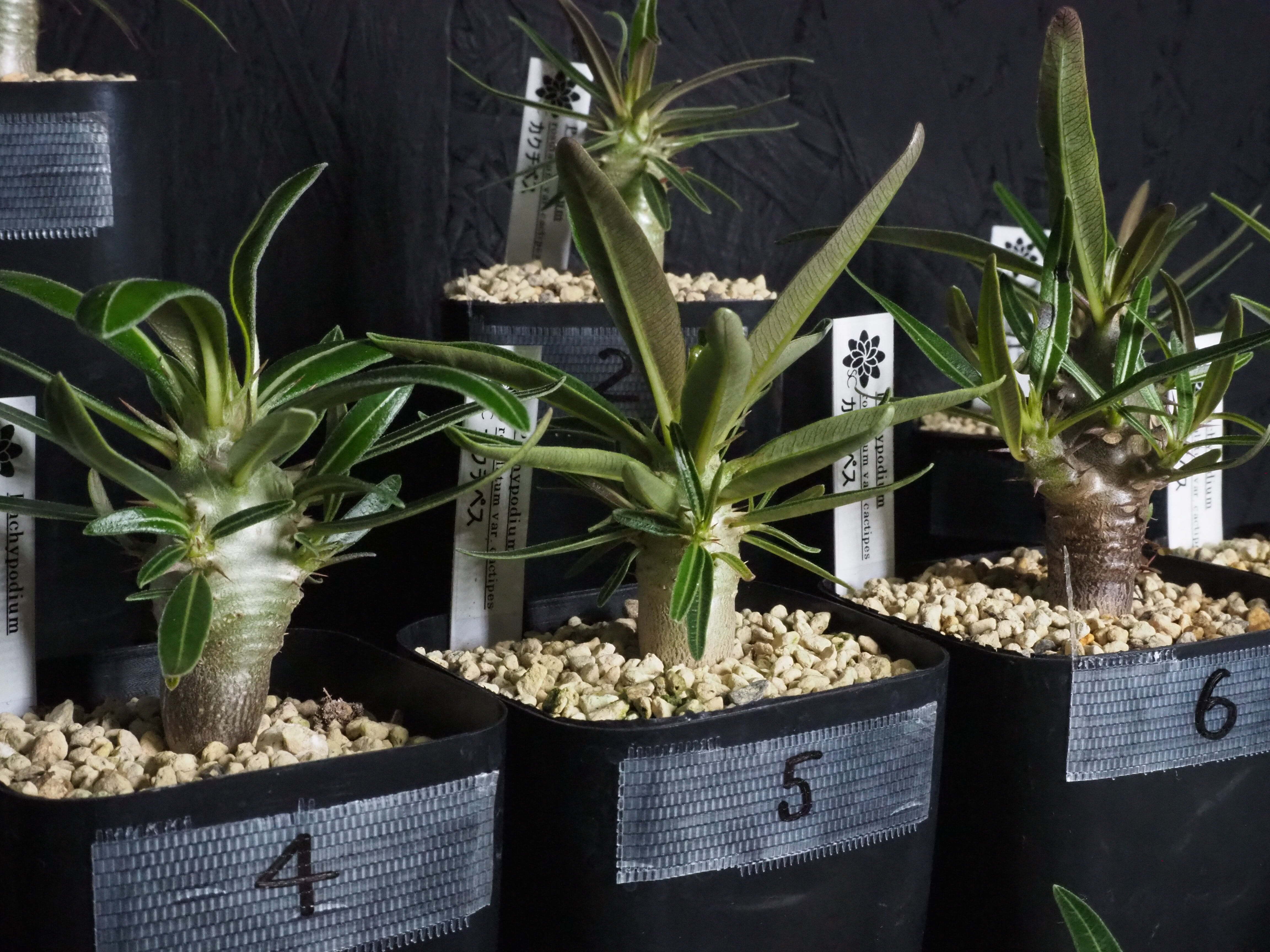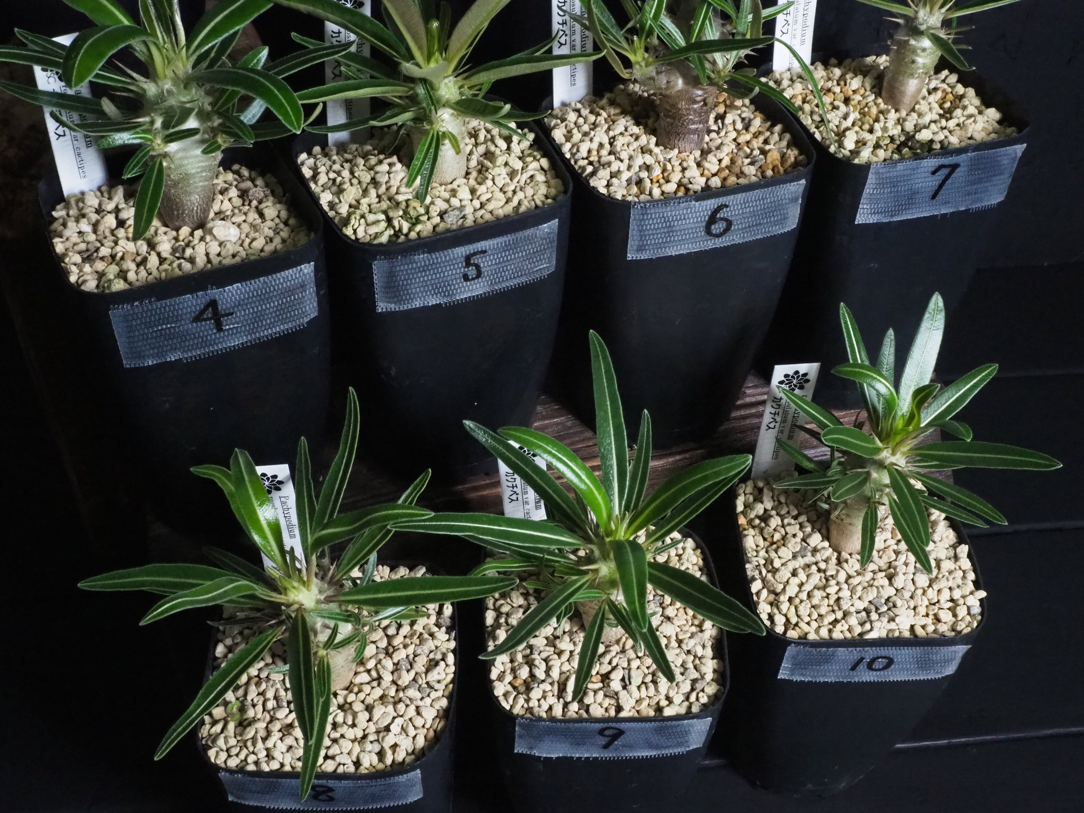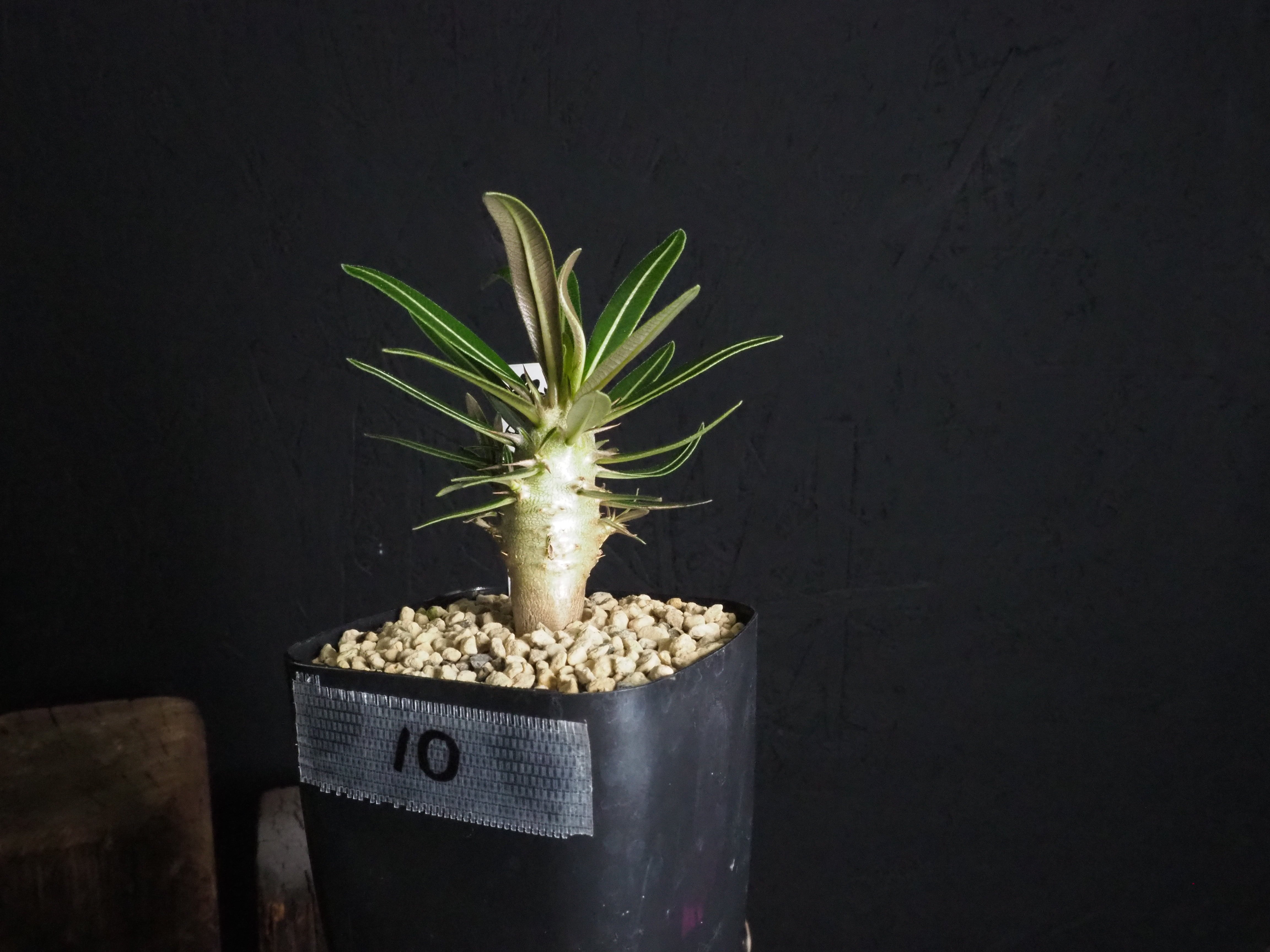 パキポディウム・カクチペス<実生>になります。実生のチビですが、日に良く当ててある程度大きくなってくるとカクチペスの特徴でもある「赤肌」になり、そしてレモンイエローの花が咲きますよ。生長期は風通し良い場所でとにかく日に良く当てることで生長スイッチが入ります。梅雨時の長雨は気を付ける必要がありますが、基本雨ざらしの直射日光下で管理した方が丈夫に育ちます。寒さにはパキポディウムの中でも弱い方なので、冬は日の当たる暖かい屋内で管理しましょう。基本的には他のパキポディウム達と想用の扱いをしてください。