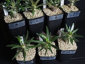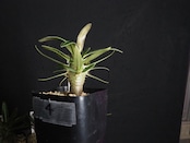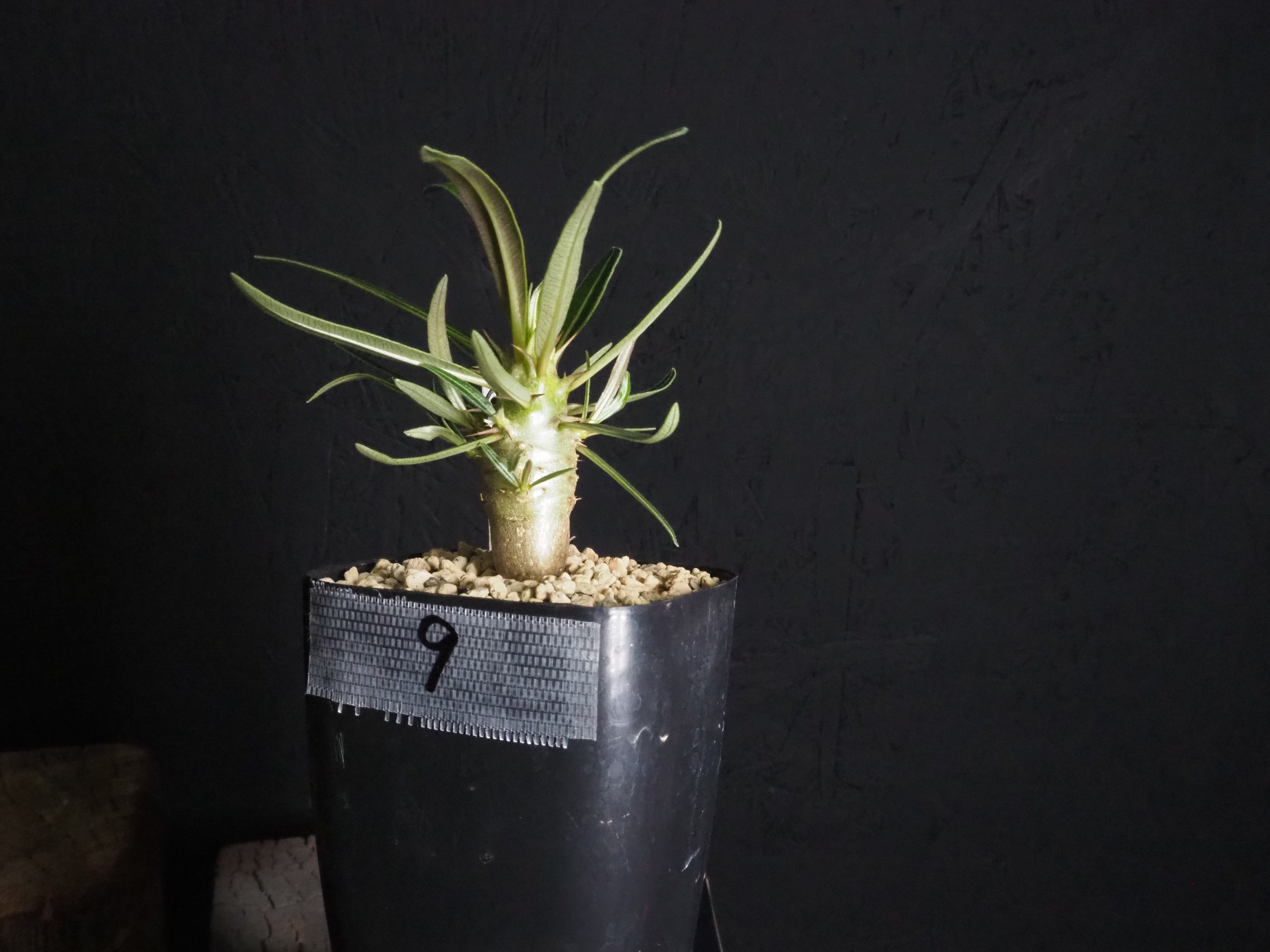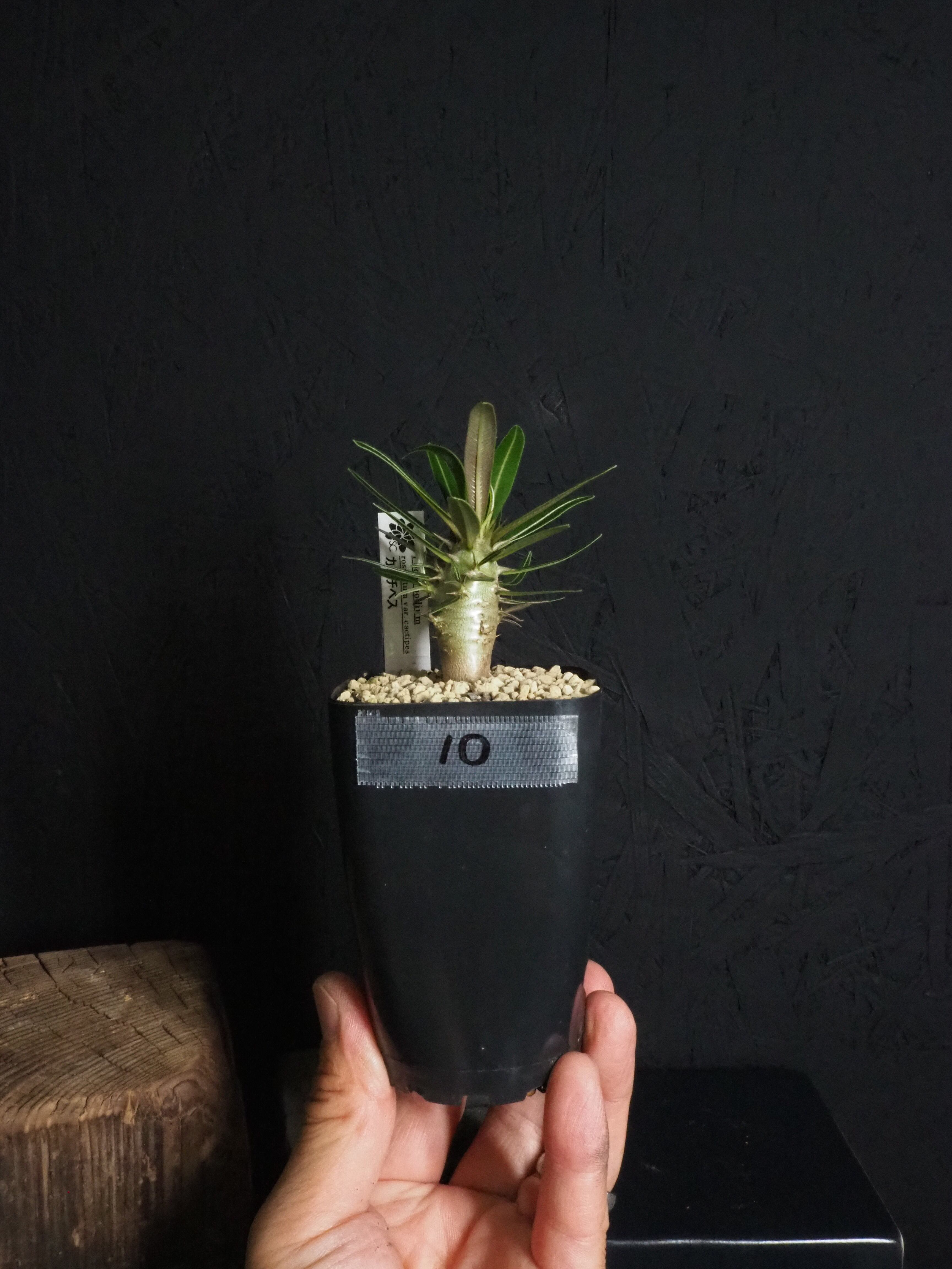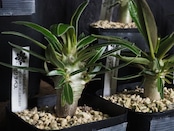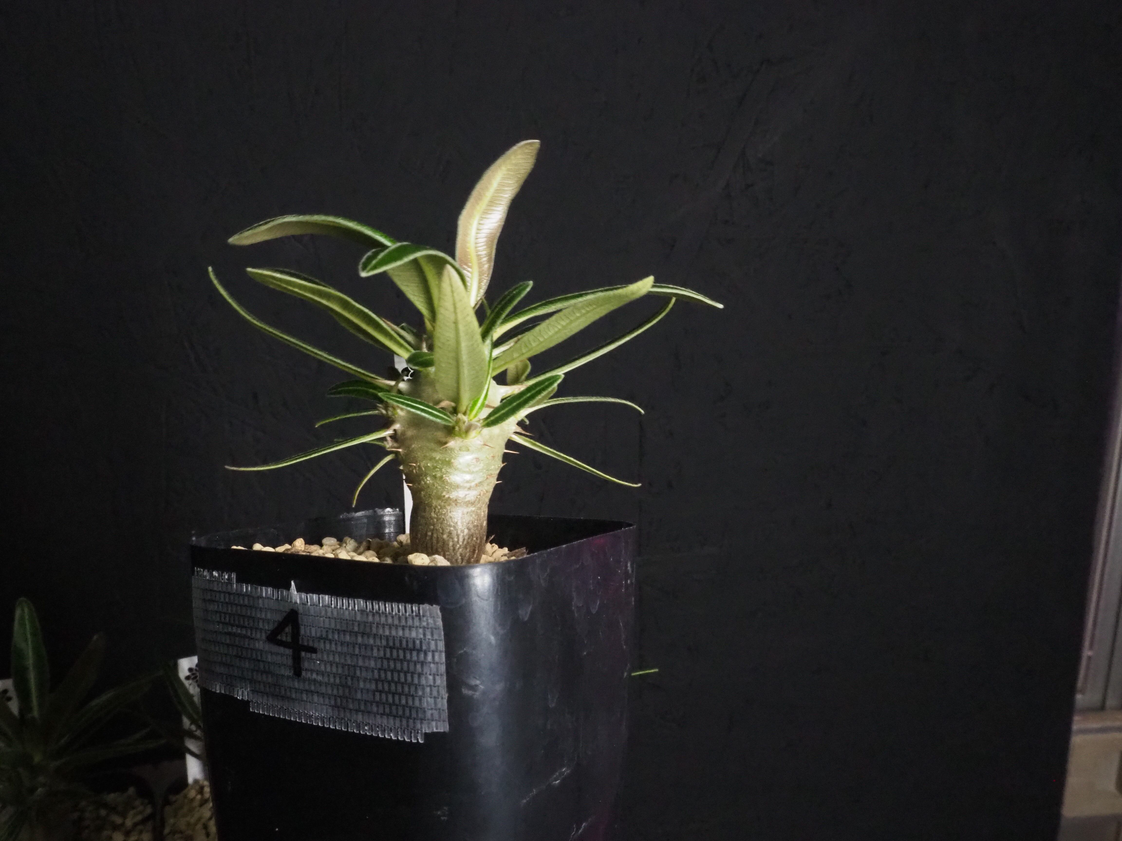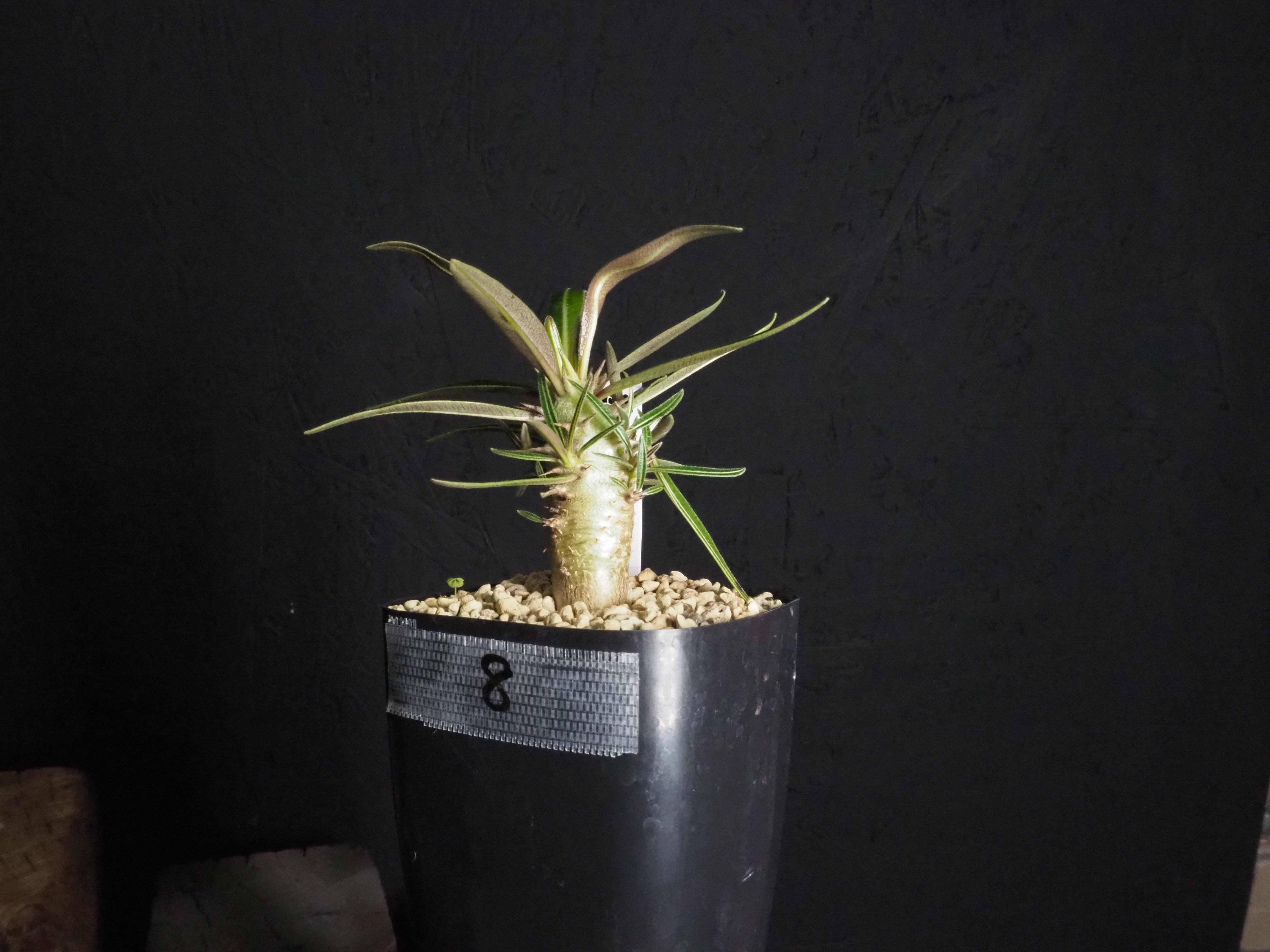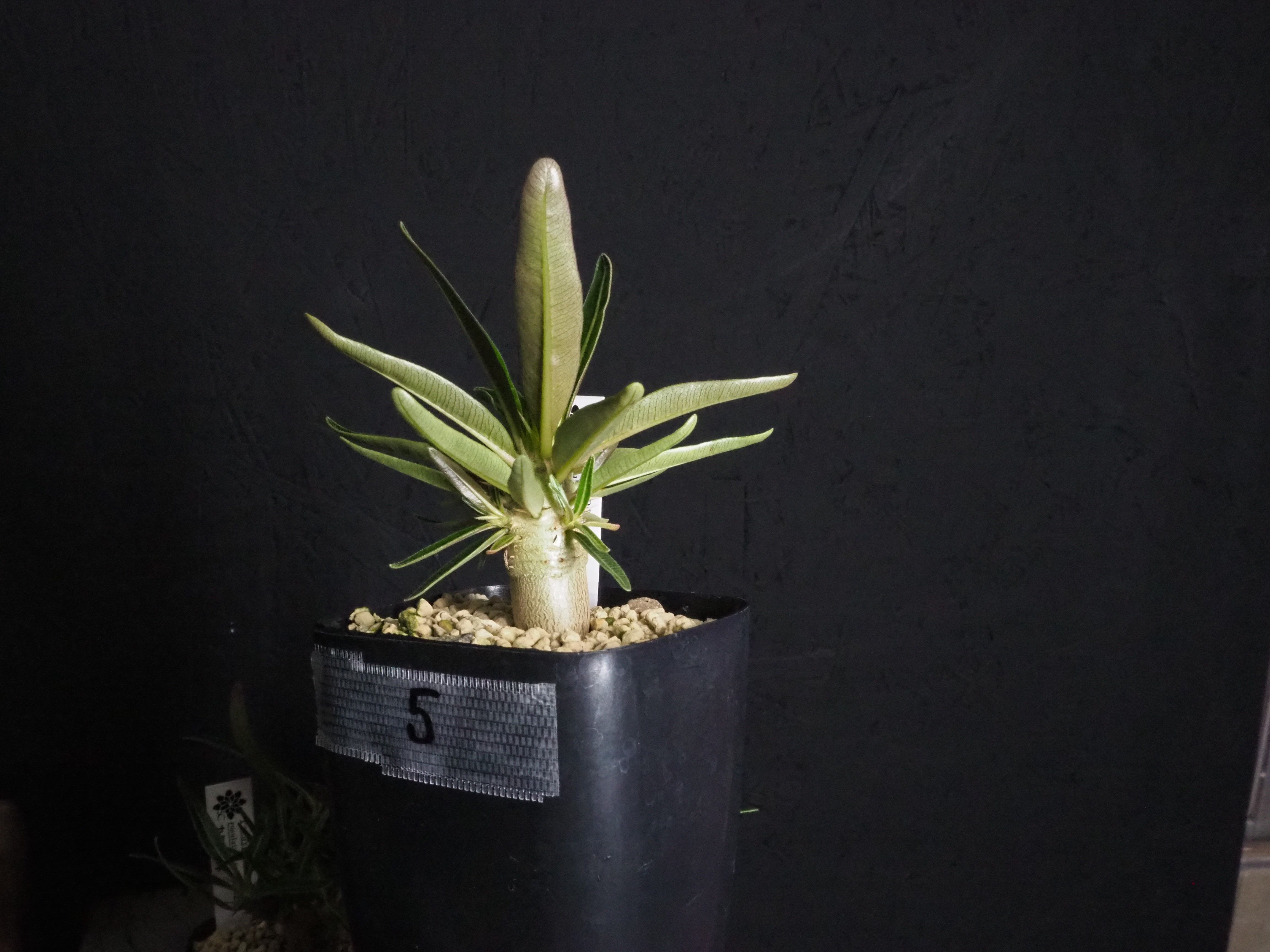 パキポディウム・カクチペス<実生>になります。実生のチビですが、日に良く当ててある程度大きくなってくるとカクチペスの特徴でもある「赤肌」になり、そしてレモンイエローの花が咲きますよ。生長期は風通し良い場所でとにかく日に良く当てることで生長スイッチが入ります。梅雨時の長雨は気を付ける必要がありますが、基本雨ざらしの直射日光下で管理した方が丈夫に育ちます。寒さにはパキポディウムの中でも弱い方なので、冬は日の当たる暖かい屋内で管理しましょう。基本的には他のパキポディウム達と想用の扱いをしてください。