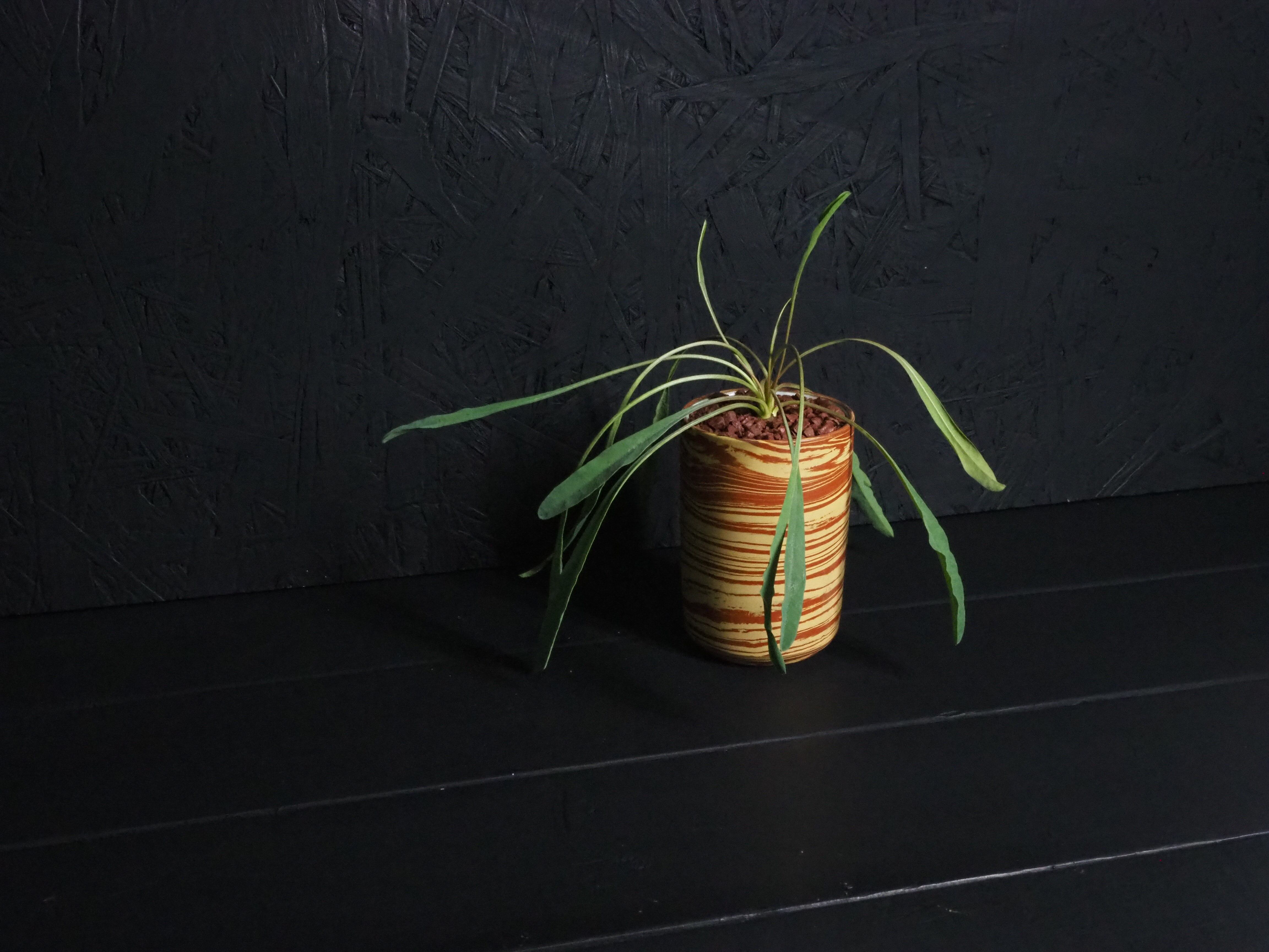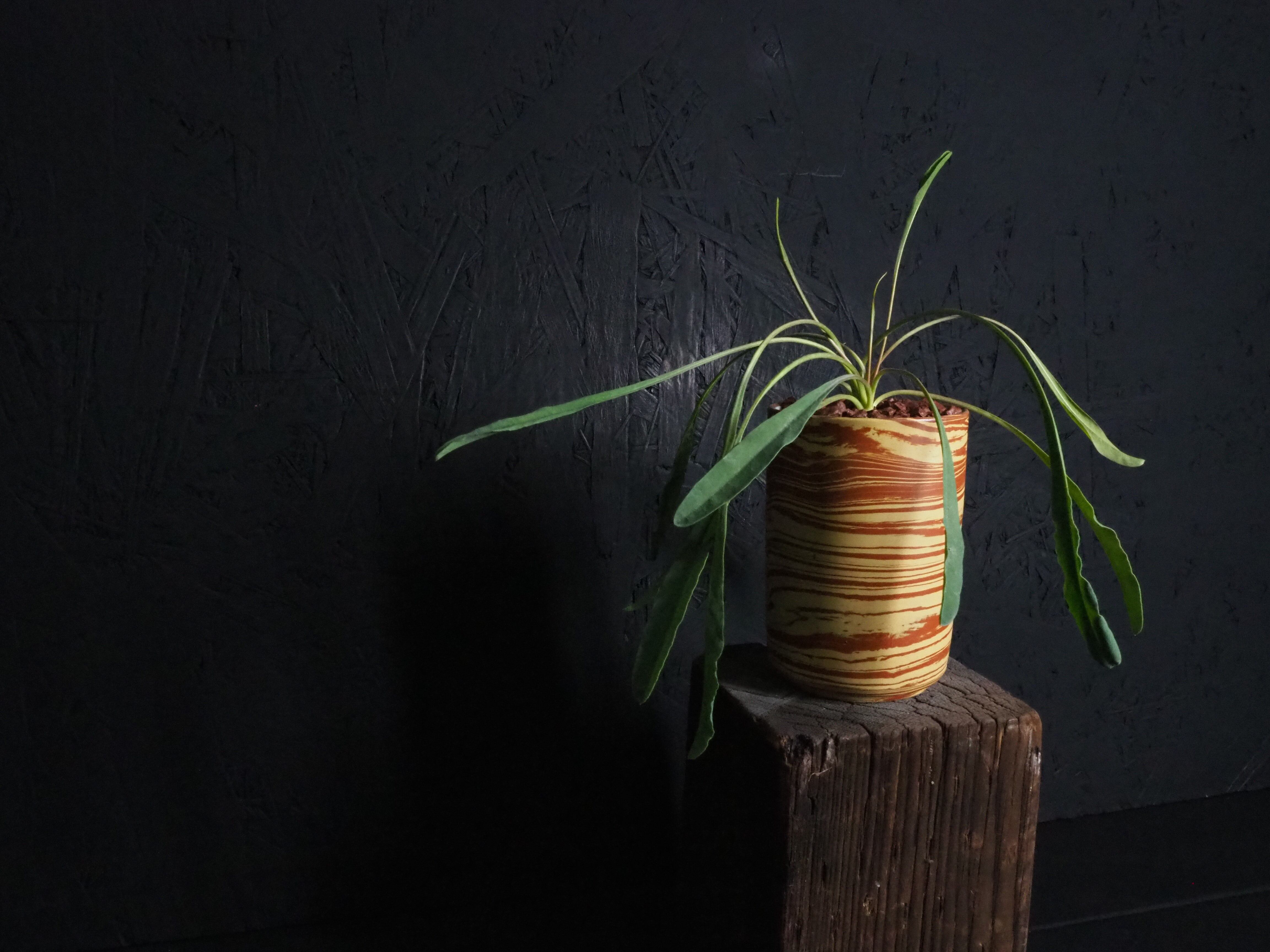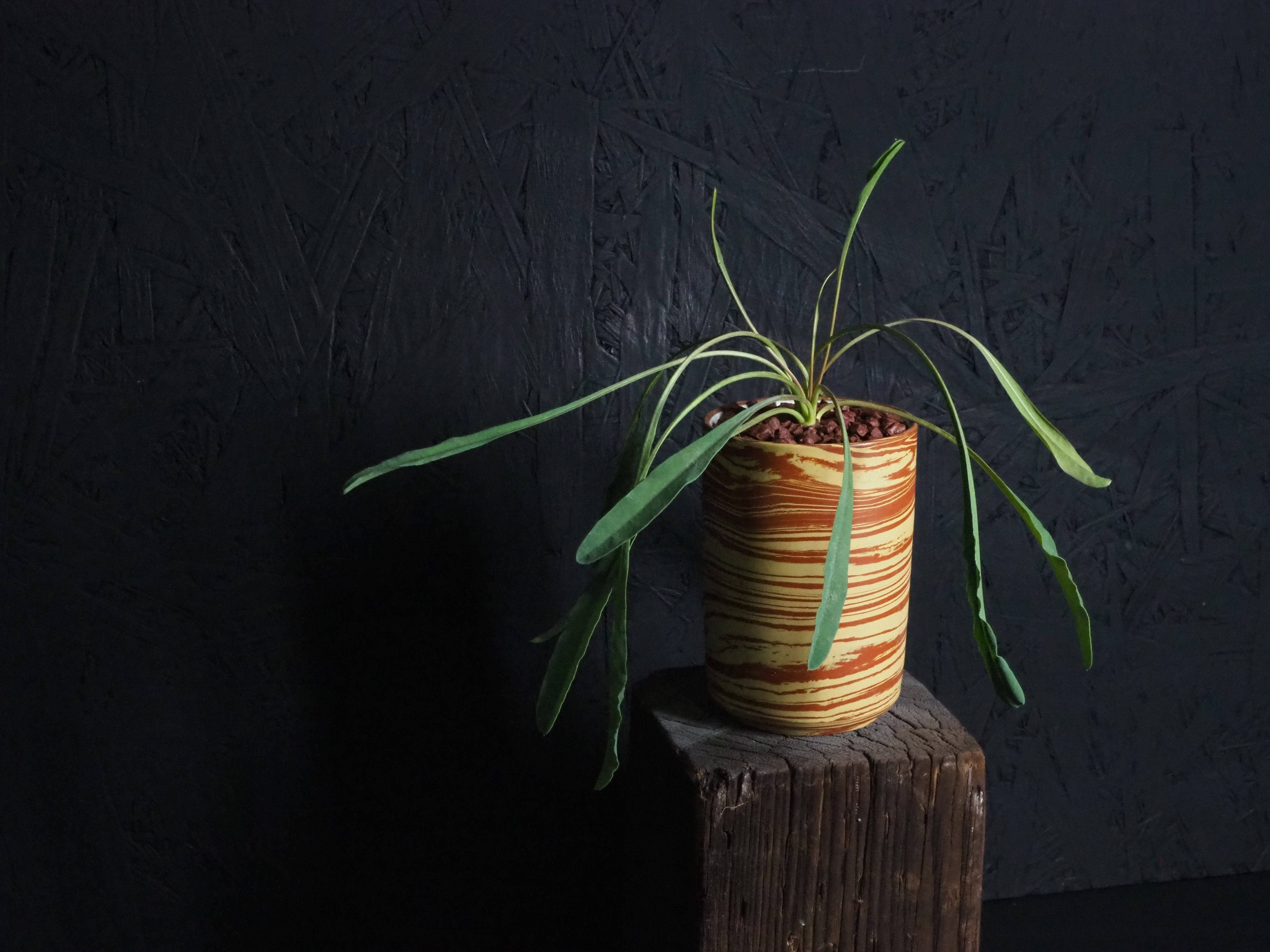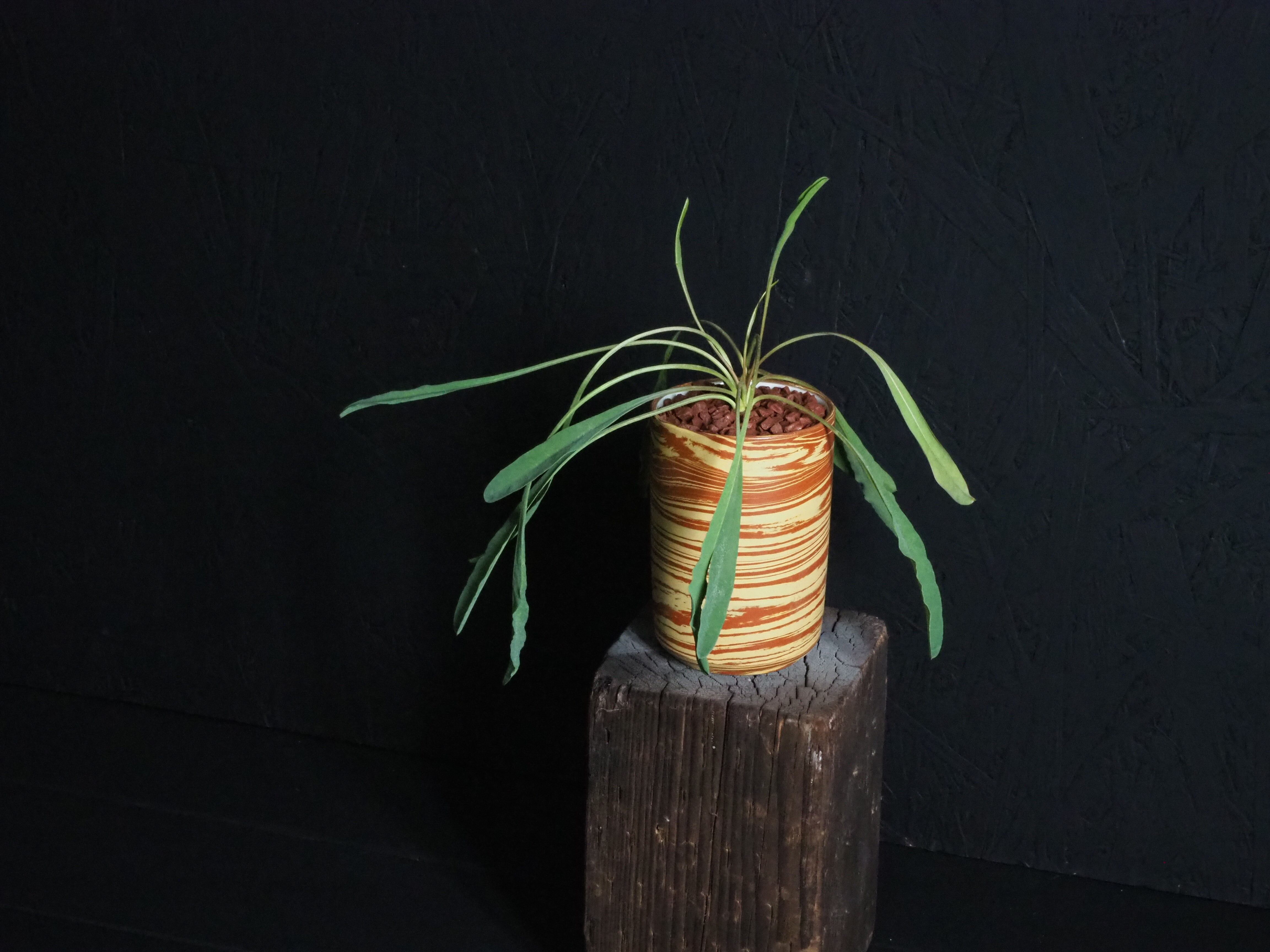 この子は実生のおチビさんなので地中に埋めて上助を行っています。塊根部の直径は10㎜程で、まだまだ幼体型なので細長く伸びて垂れている葉は、本来の成葉の形状ではありません。