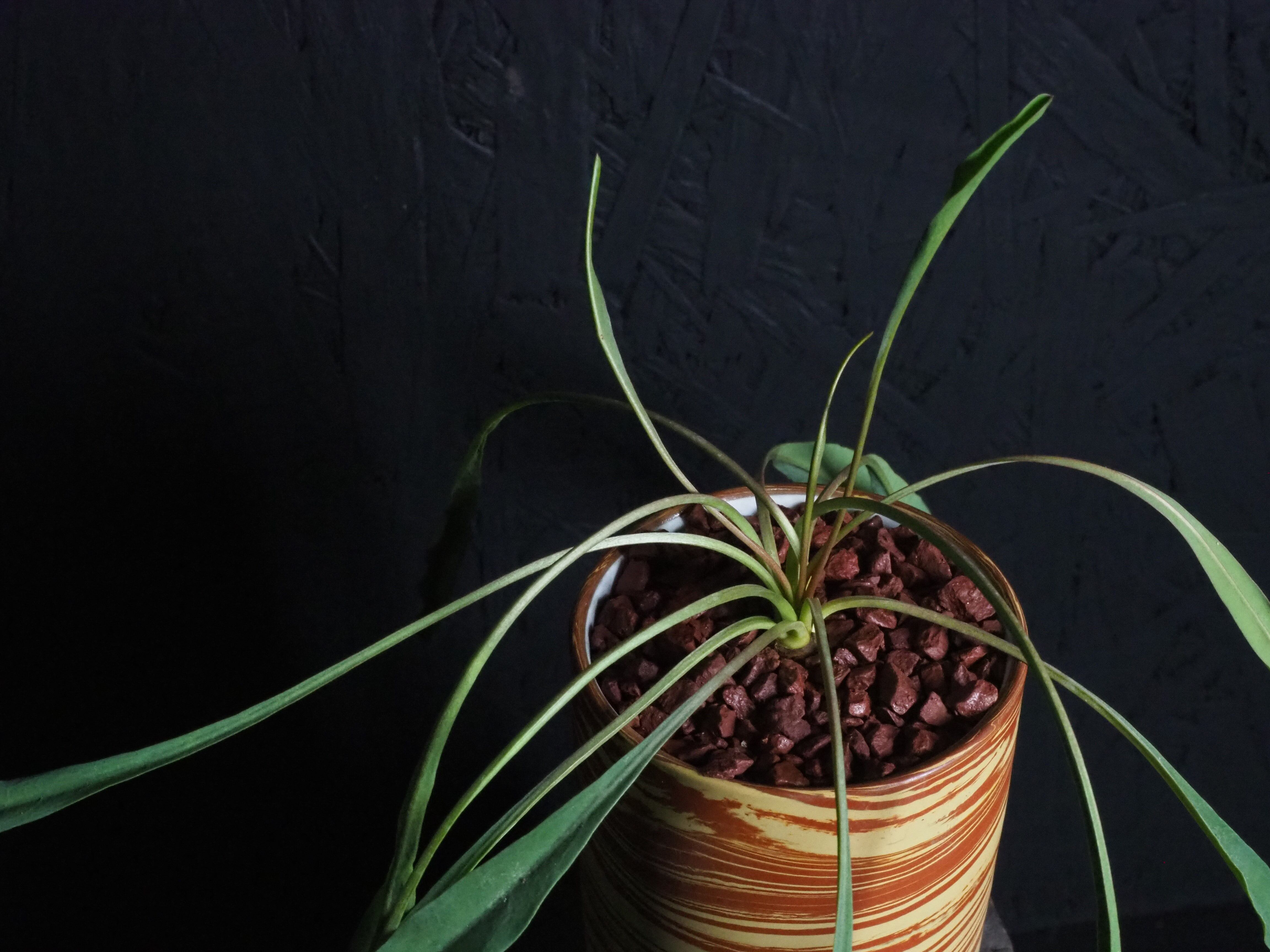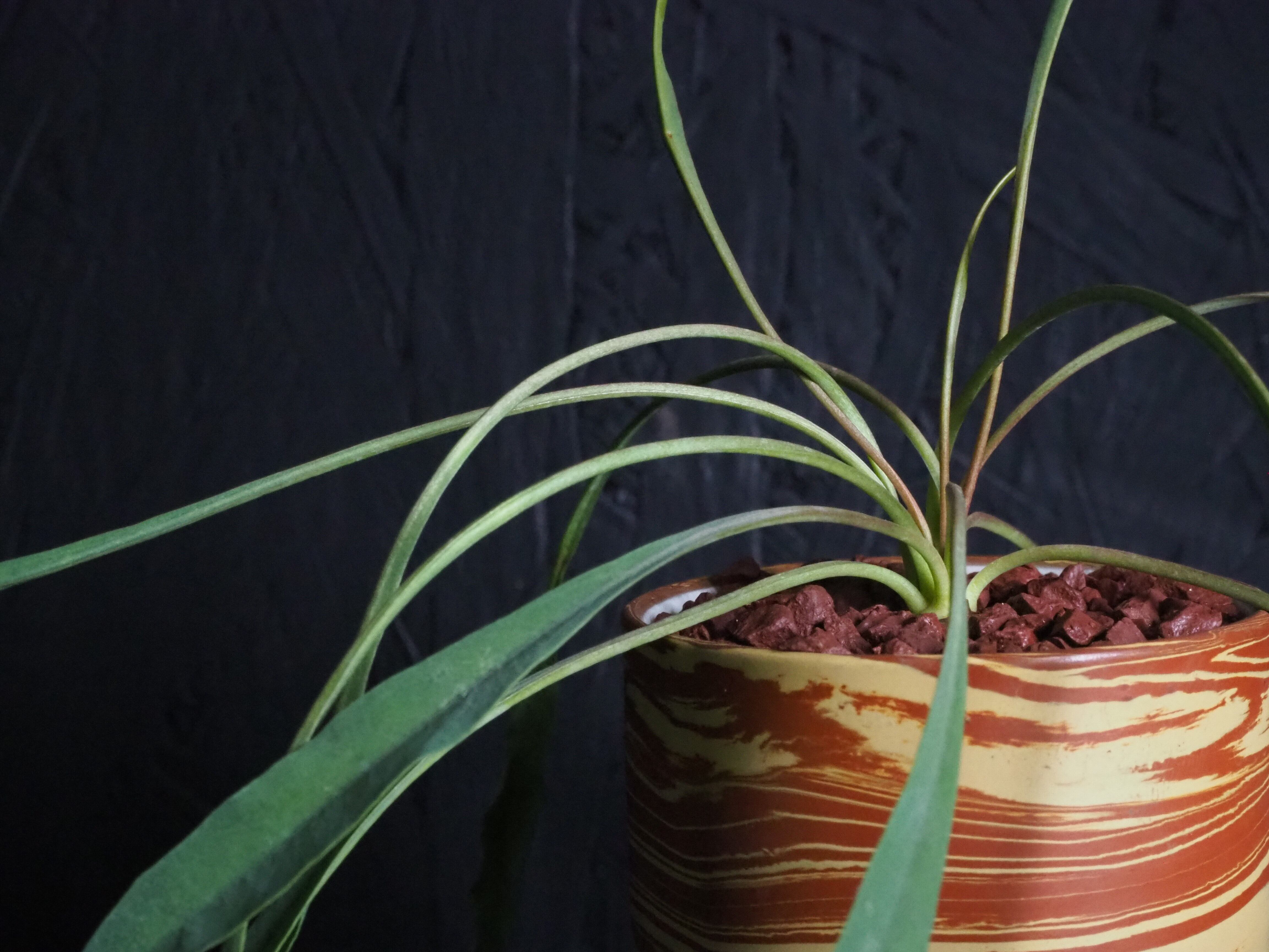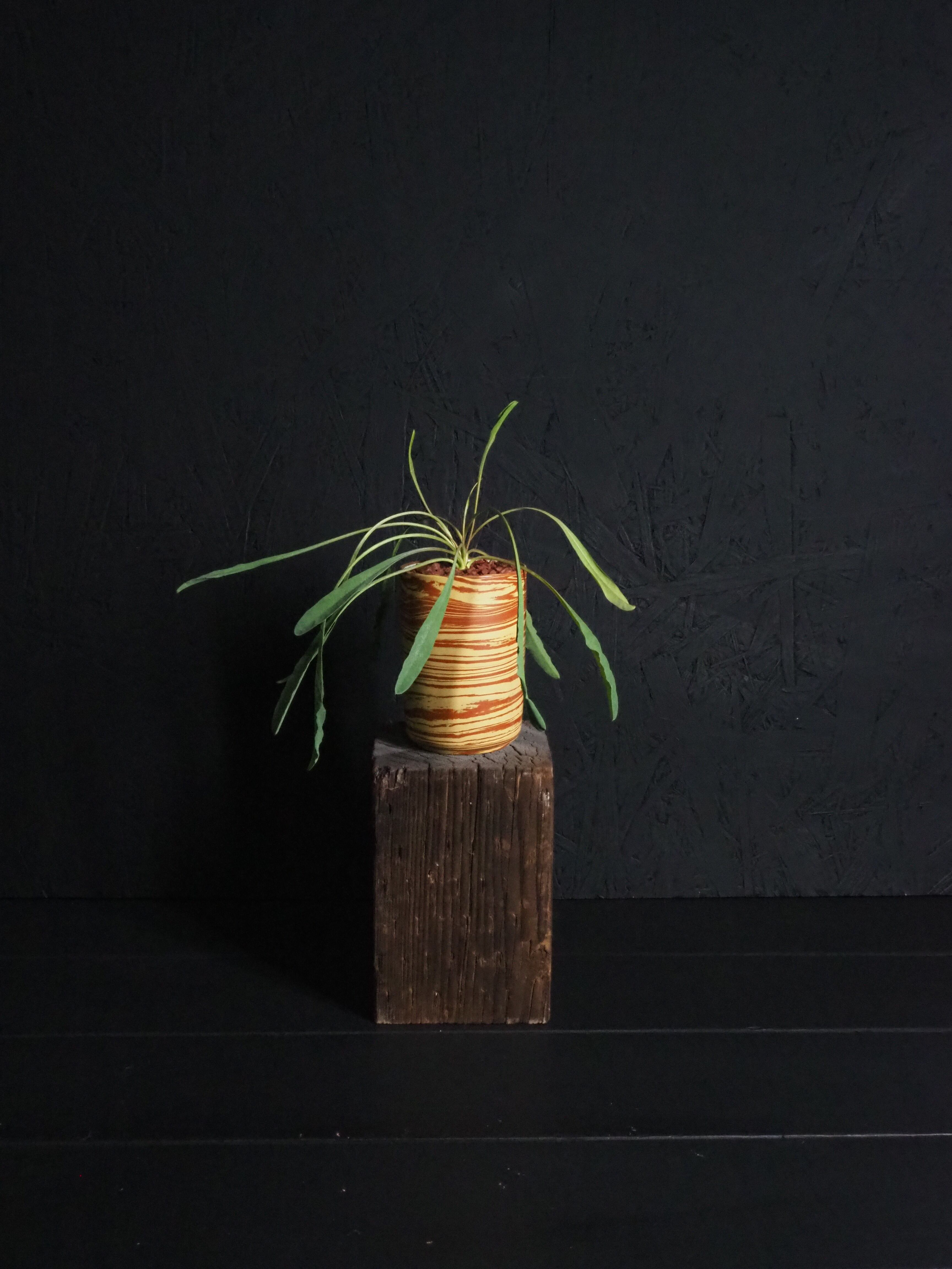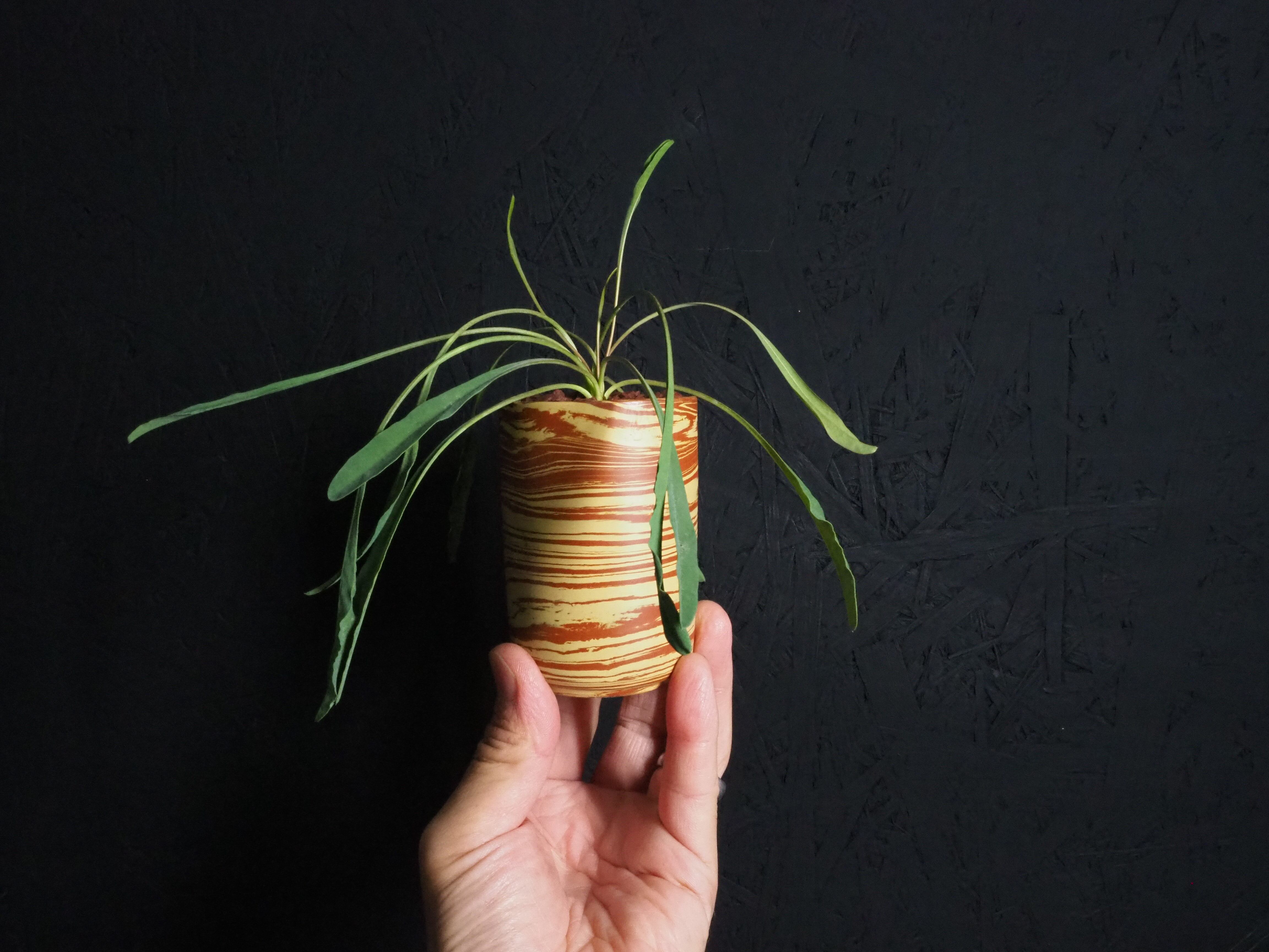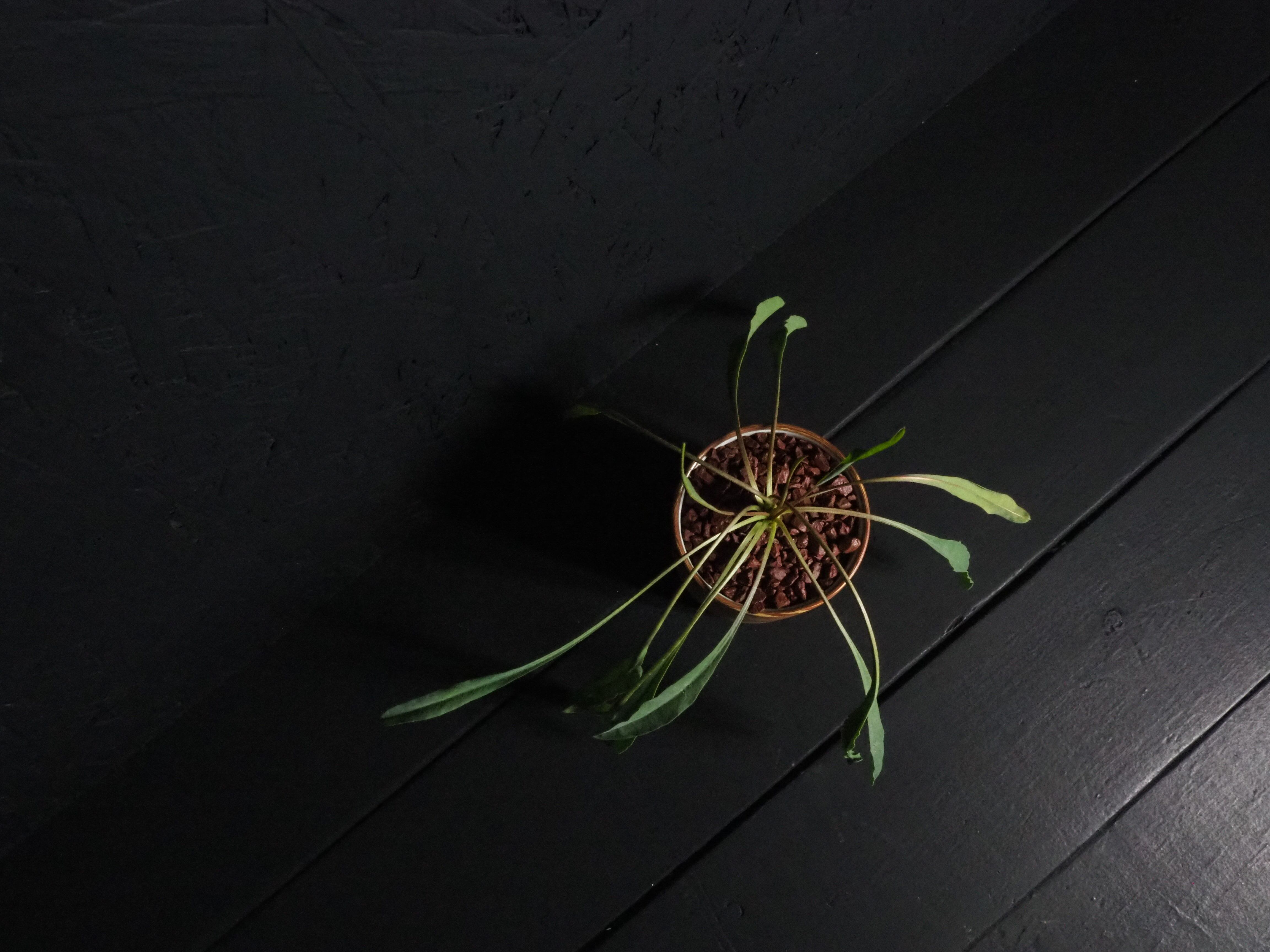 この子は実生のおチビさんなので地中に埋めて上助を行っています。塊根部の直径は10㎜程で、まだまだ幼体型なので細長く伸びて垂れている葉は、本来の成葉の形状ではありません。