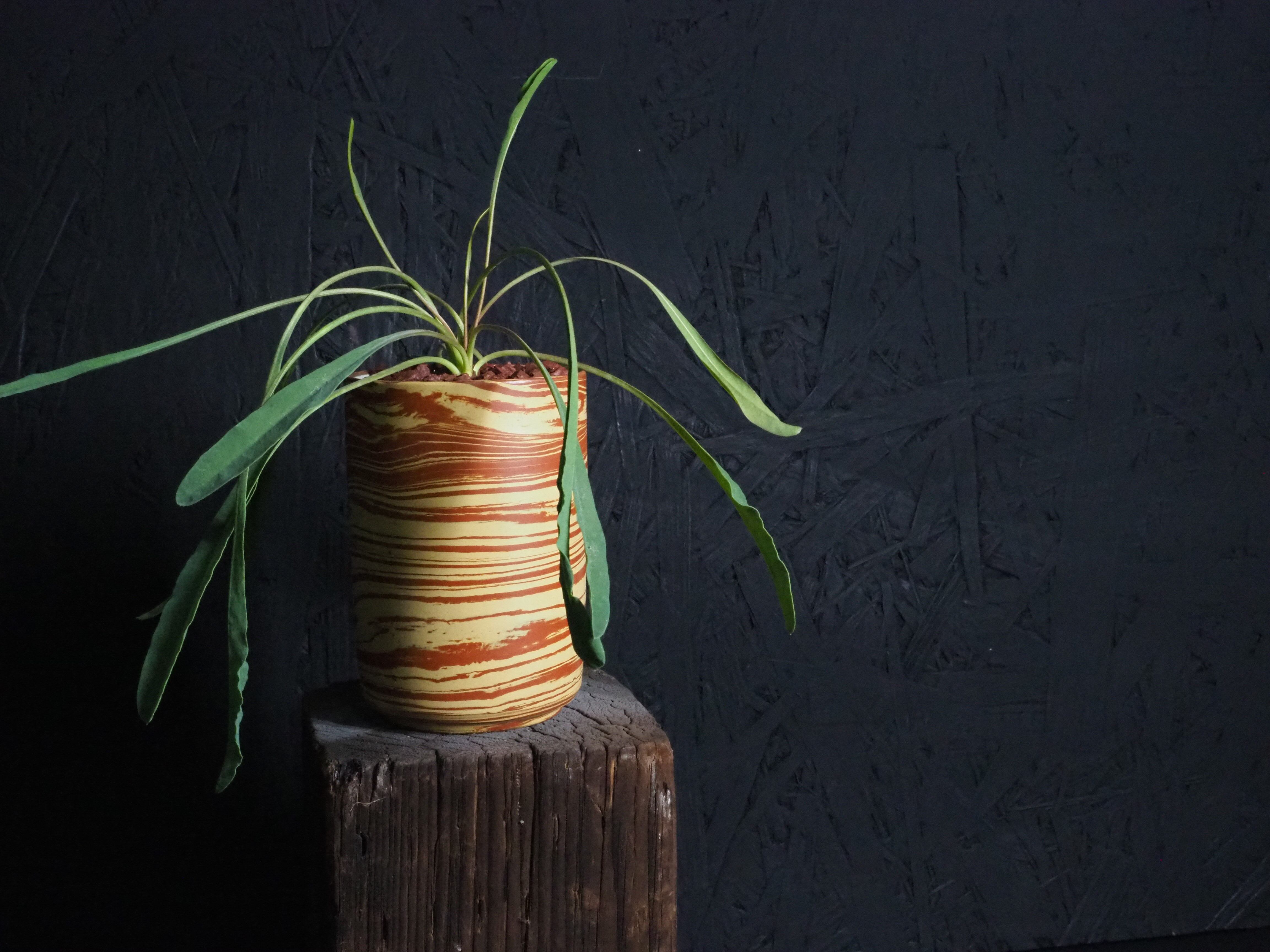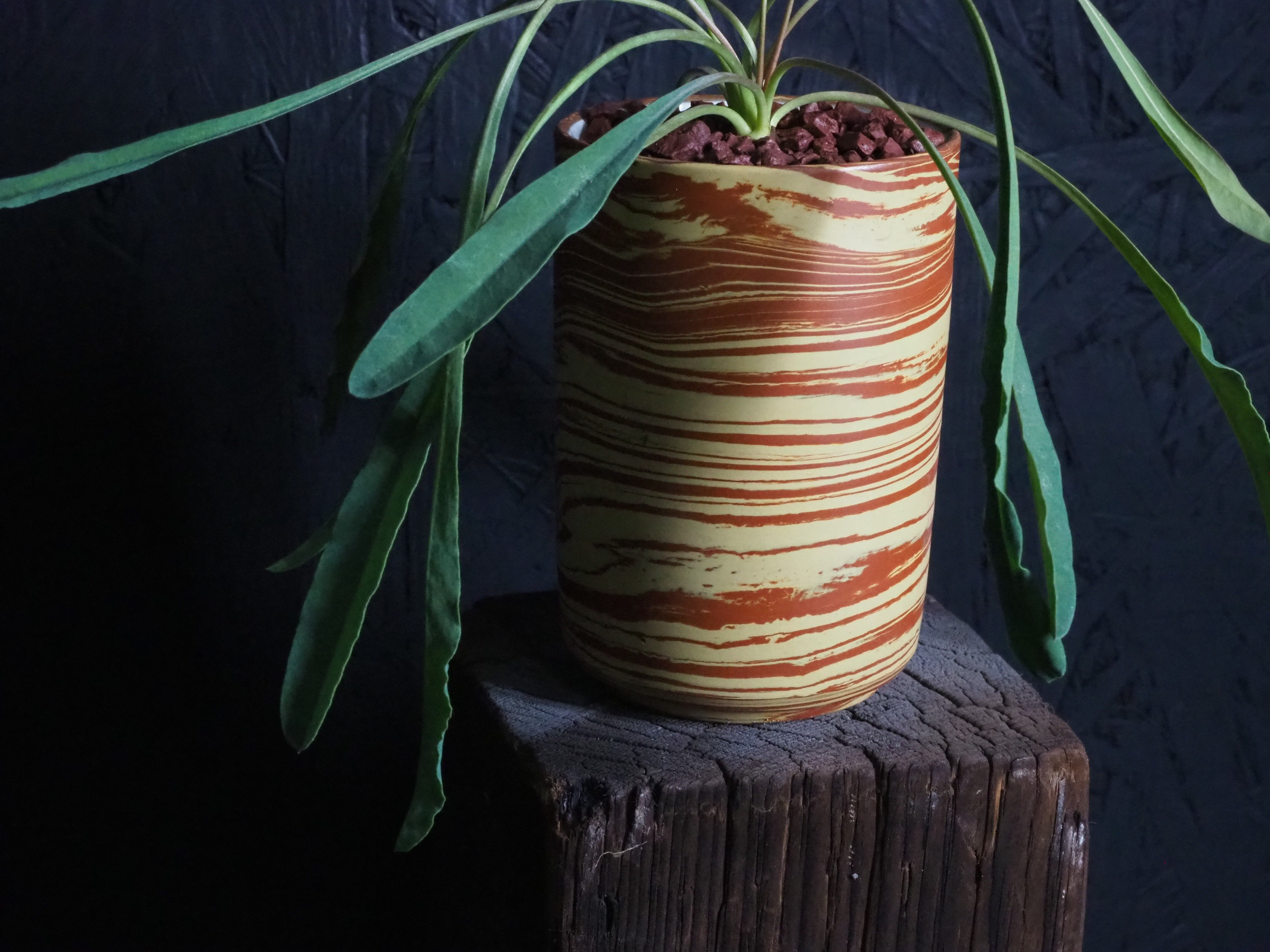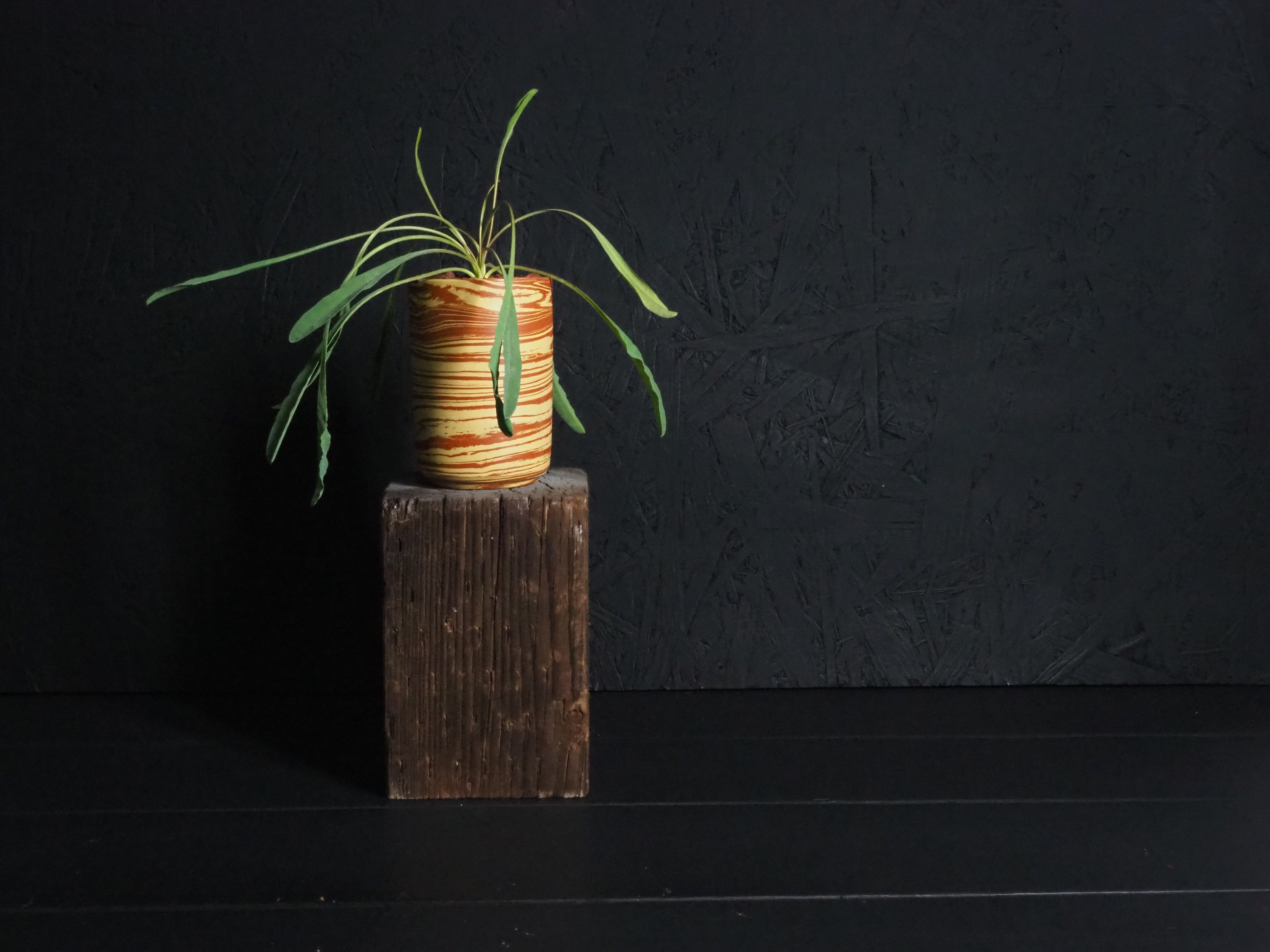 マーブル模様の瀬戸物を鉢にリメイクして使用しています。底穴は大きく水捌け抜群です。