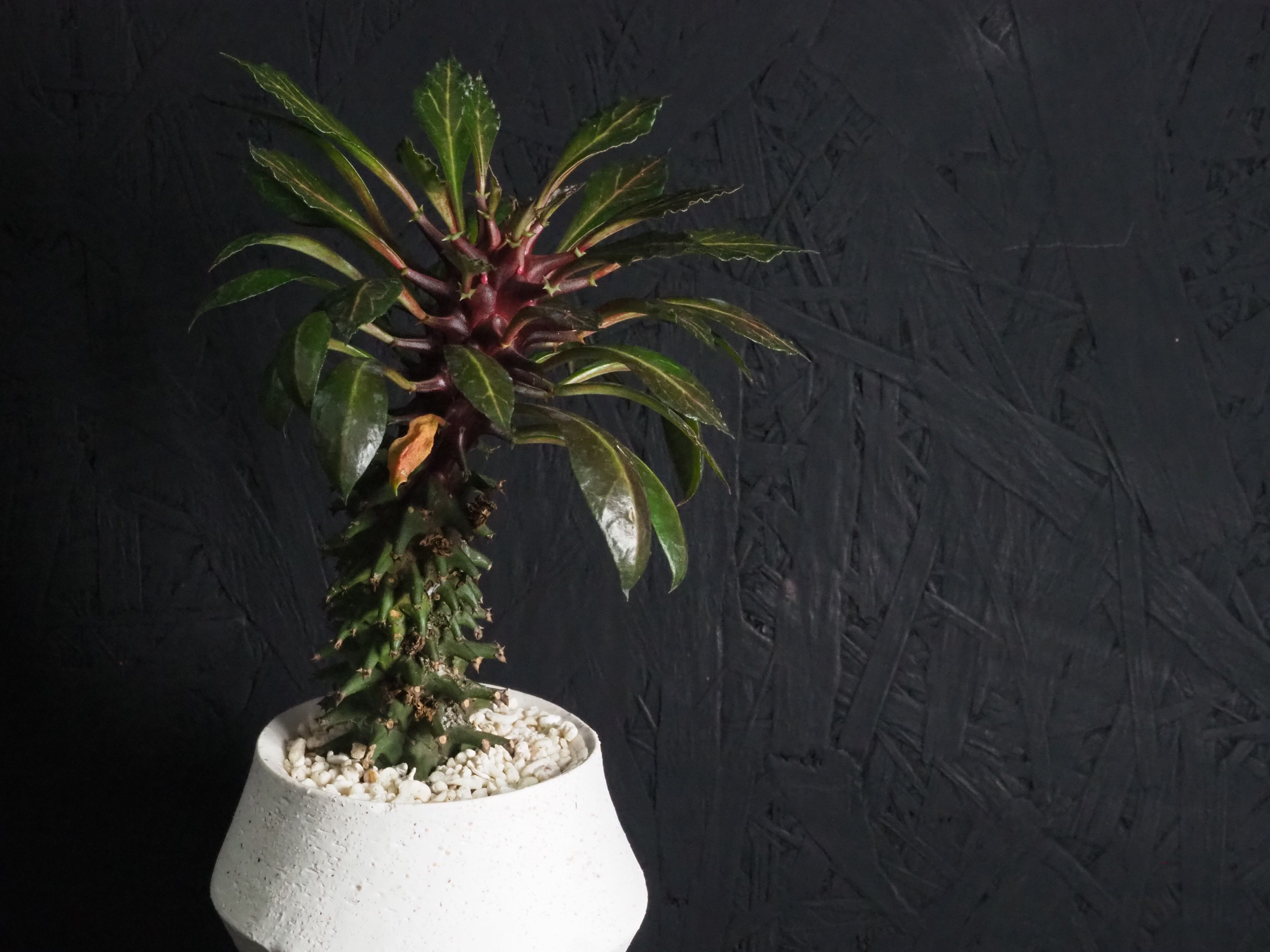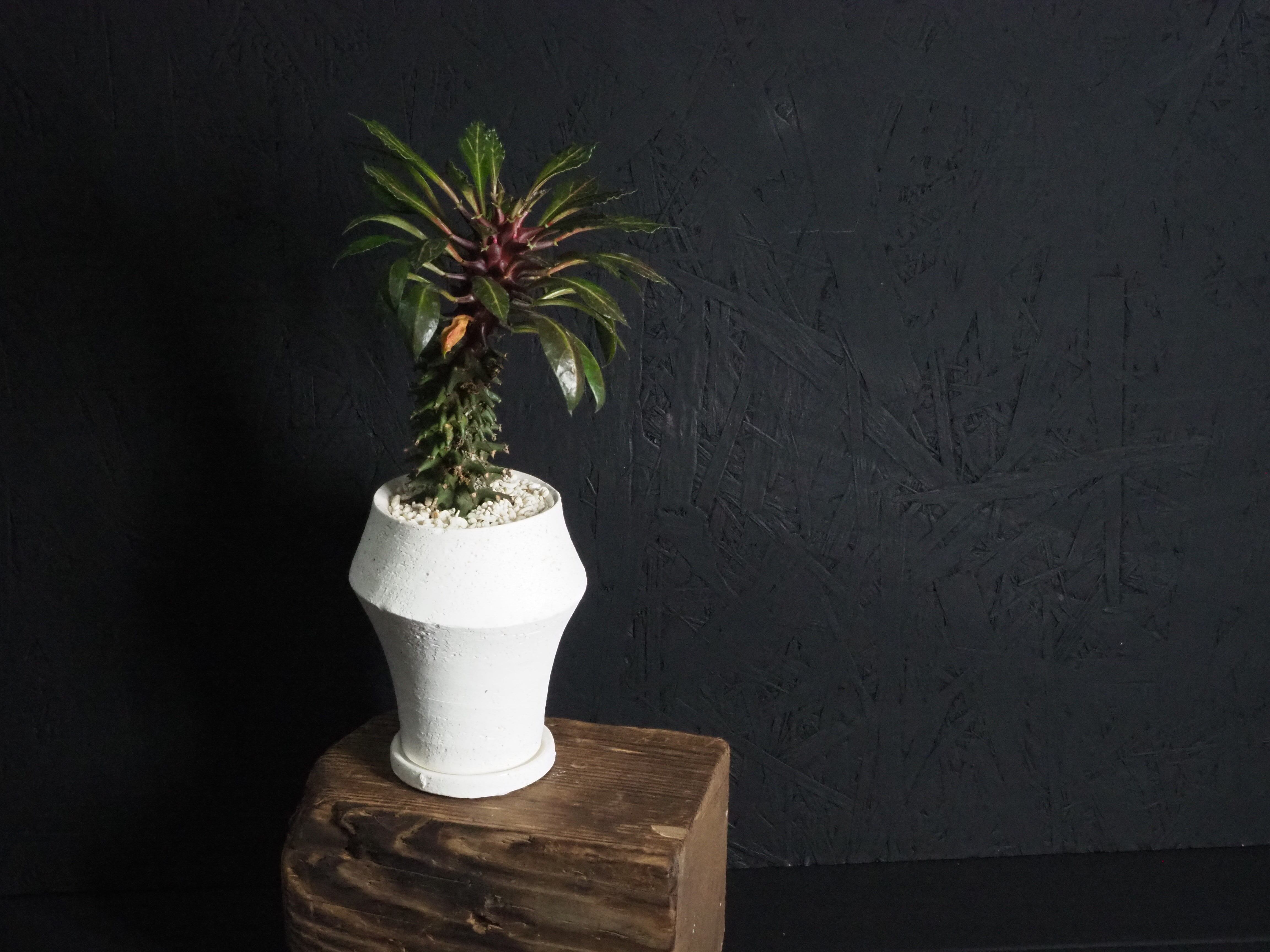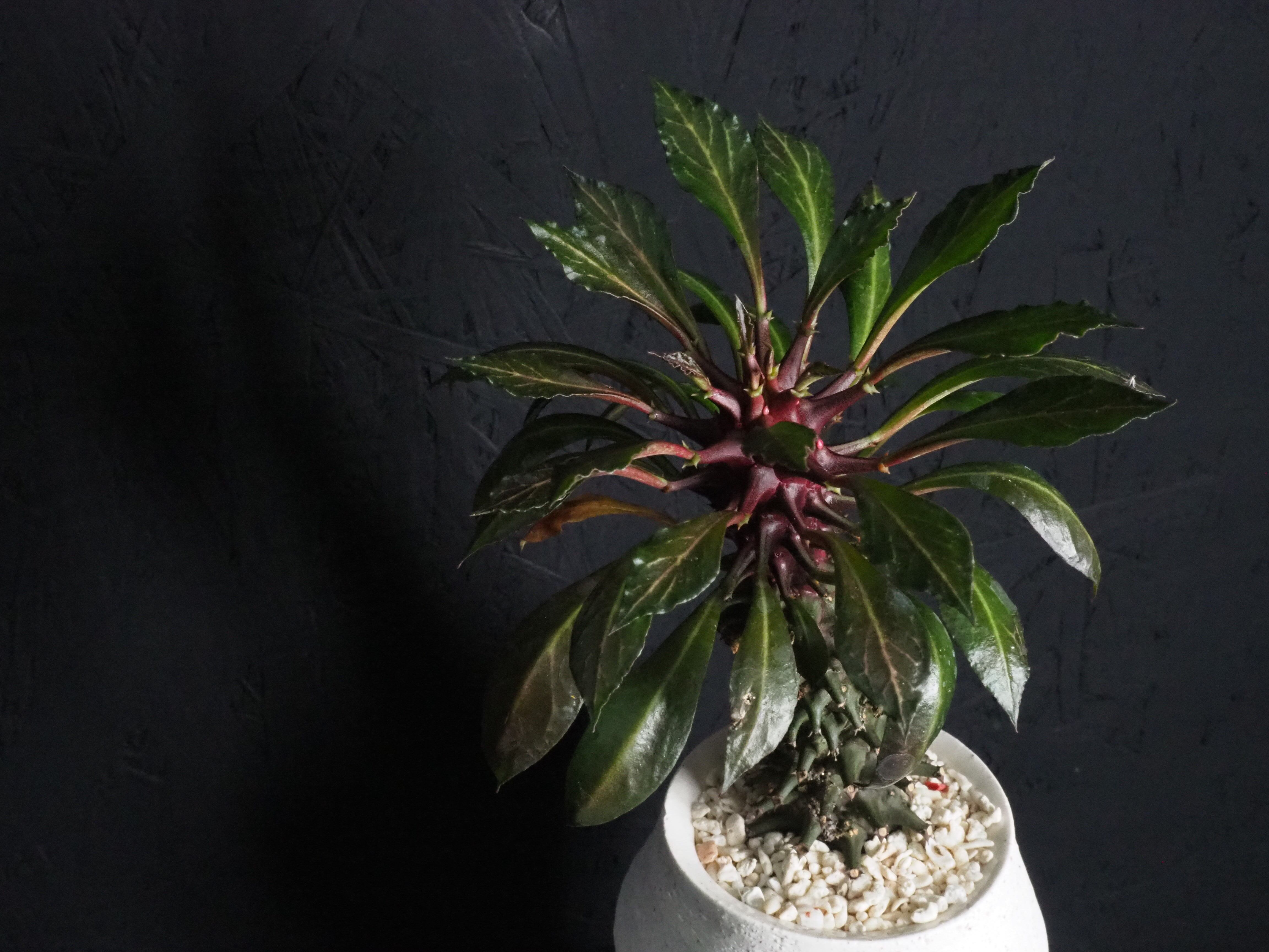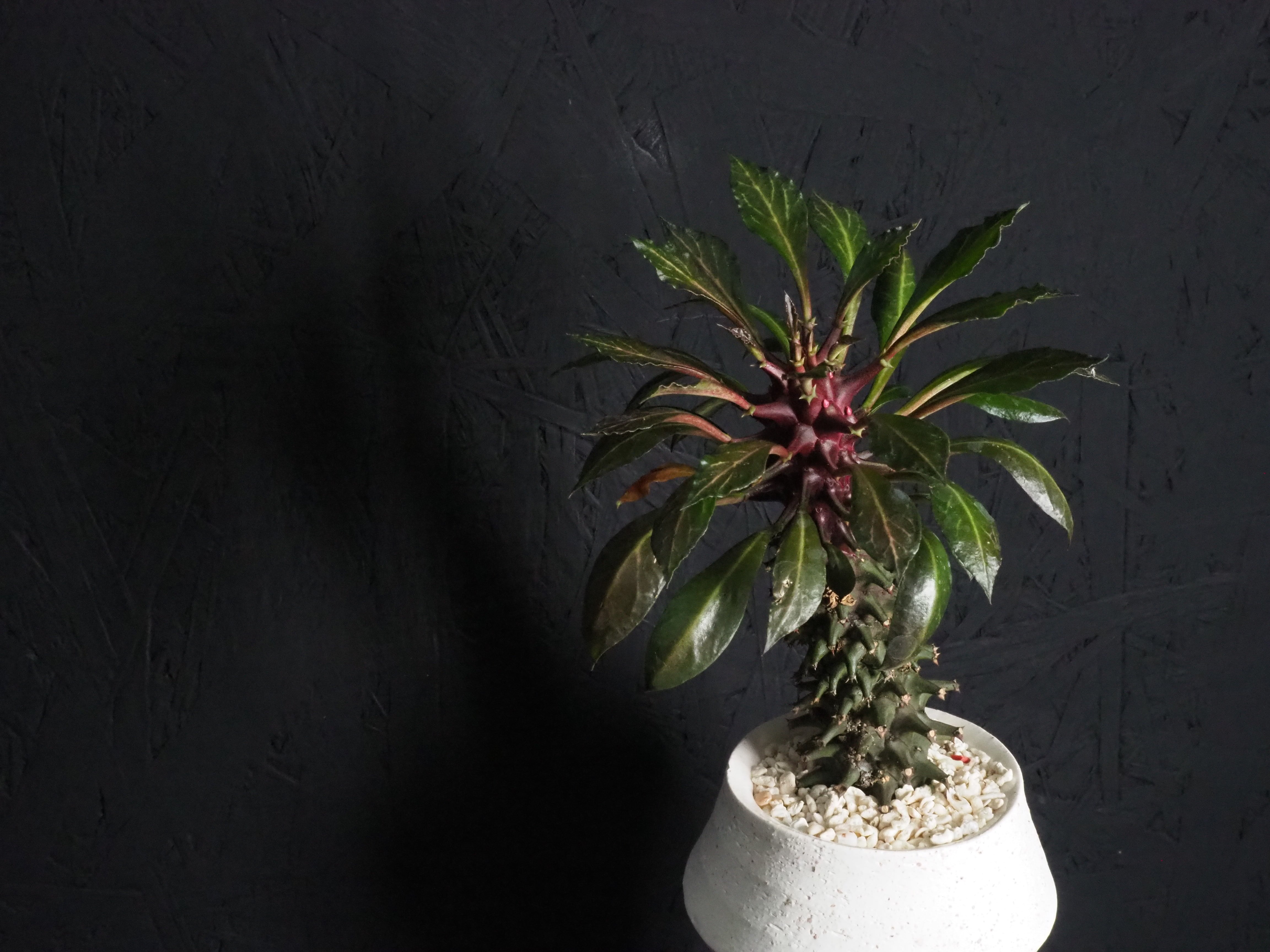 生長期には枝の先端から多肉質の葉が生えてきます。通年で良く日光に当てて、風通しのよい場所で管理してください。照度が不足するとせっかくの美しい赤色が薄くなってしまうので注意しましょう。標高の高い場所に原生しているせいか、春や秋に一日の寒暖差が顕著になってくると生育が盛んになり、春まで生育します(真冬を除く)。モナデニウムの中では比較的寒さに強いタイプですが、枯死しない最低温度は5℃が目安。あまり頑張り過ぎて寒さに晒すとサヨナラになってしまいますのでご注意ください。