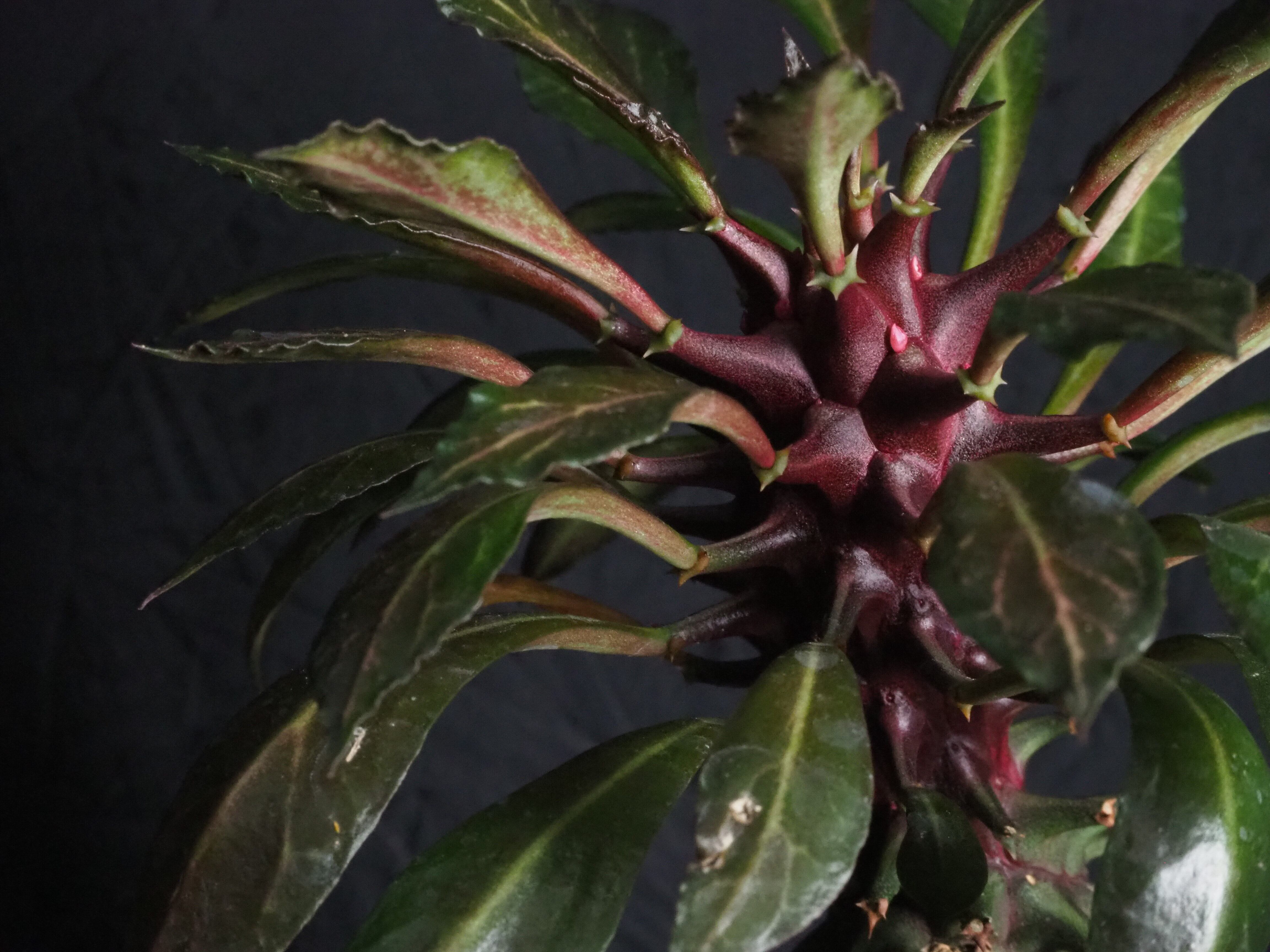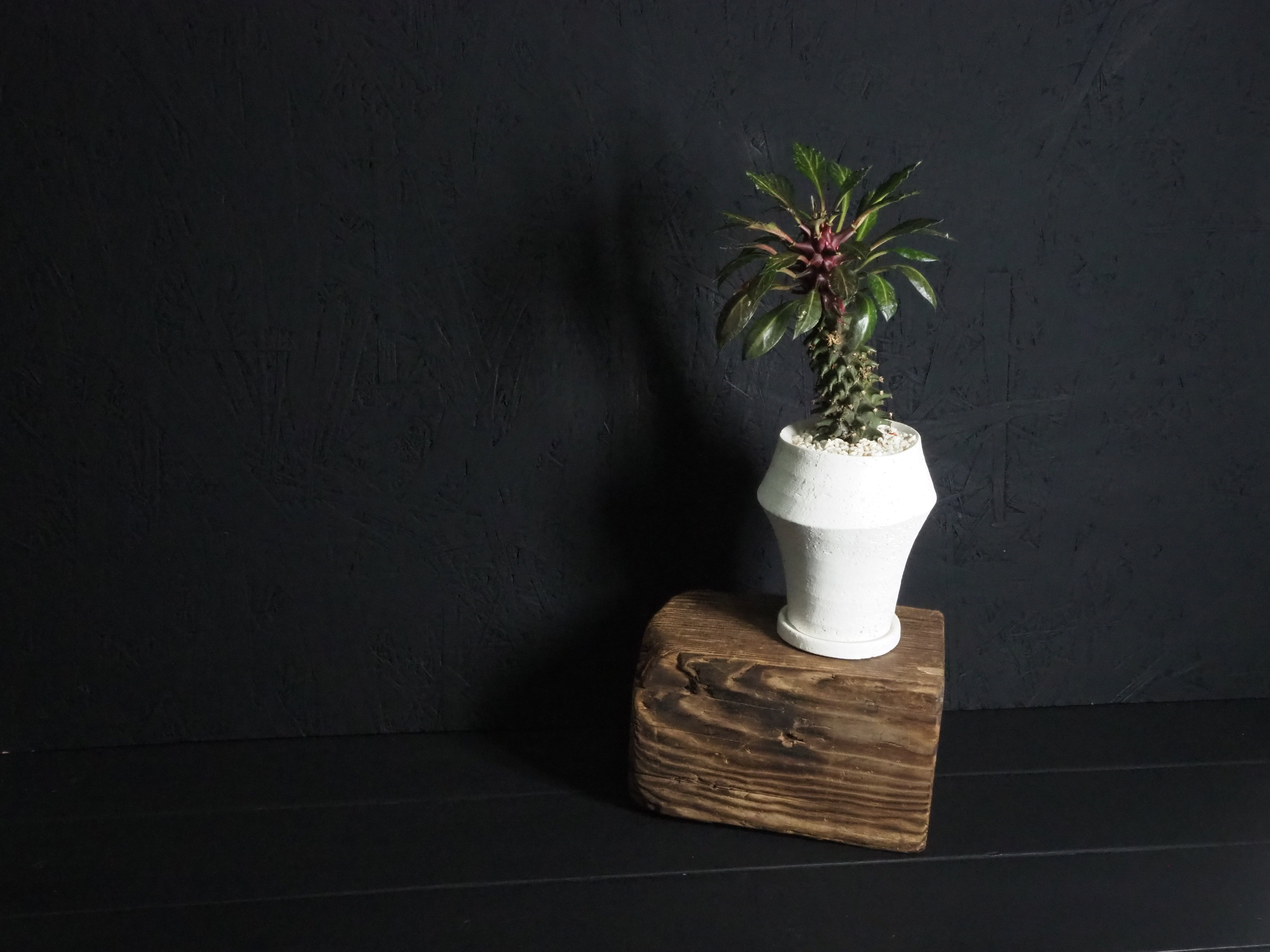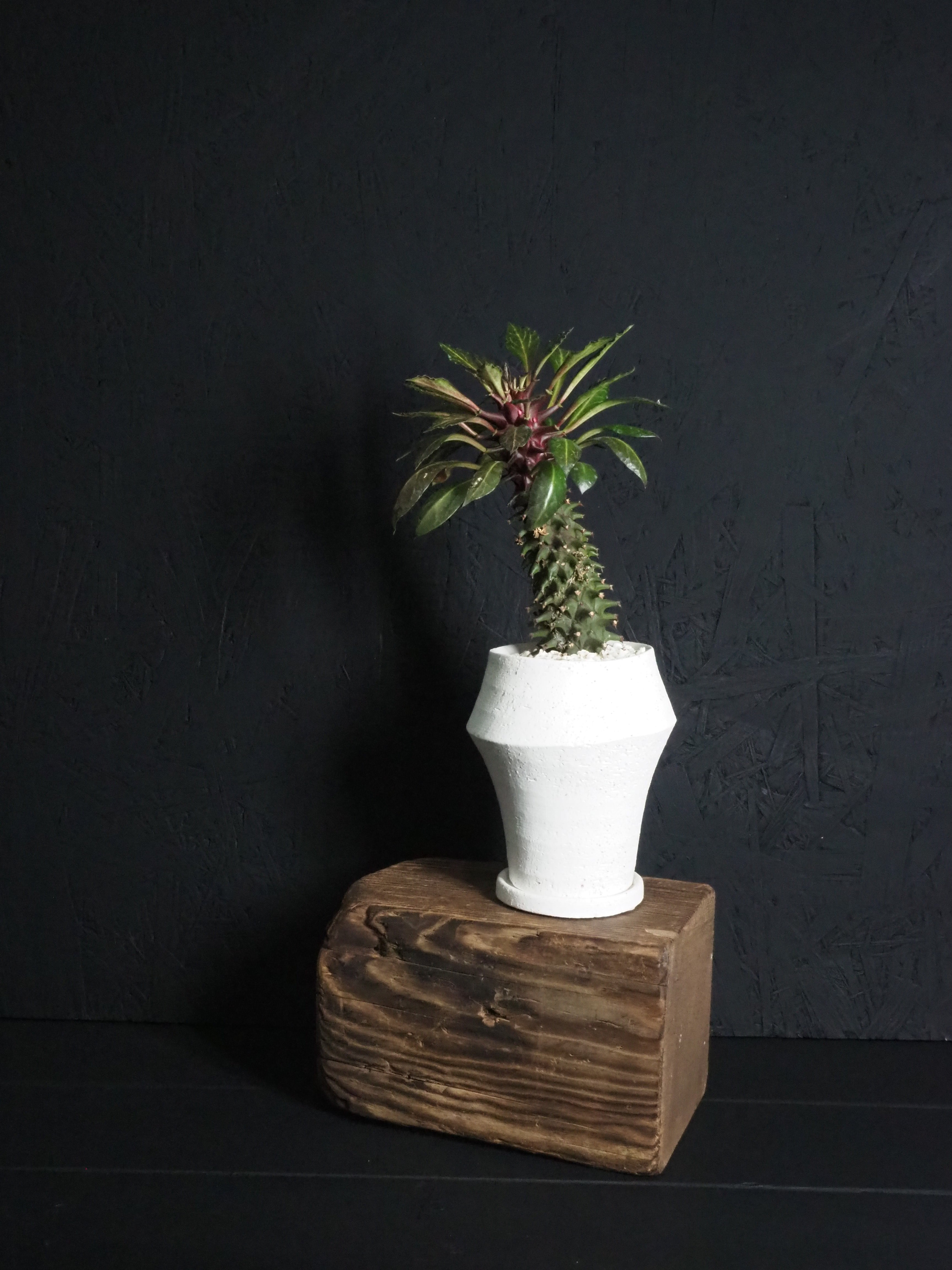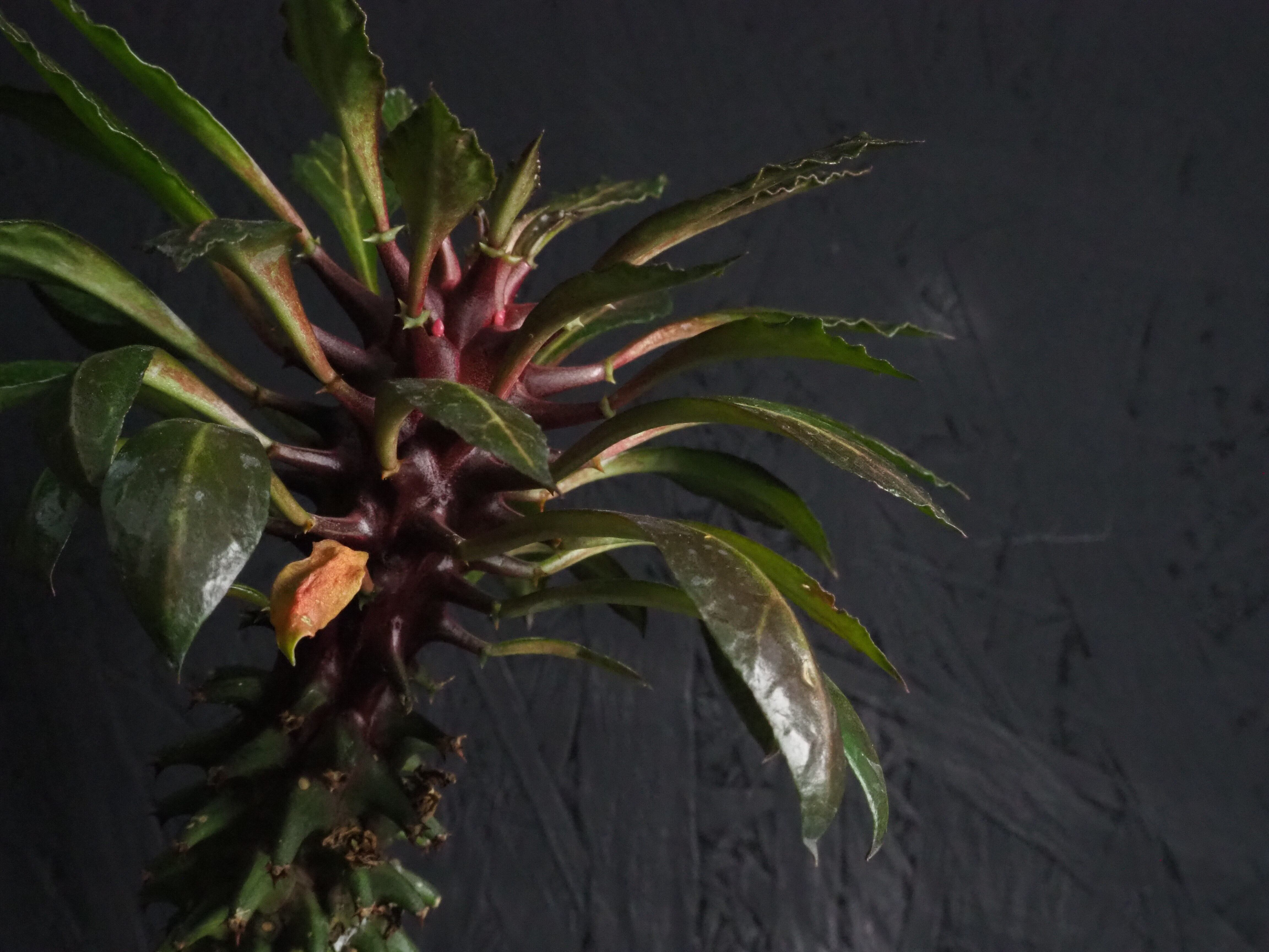 生長期には枝の先端から多肉質の葉が生えてきます。通年で良く日光に当てて、風通しのよい場所で管理してください。照度が不足するとせっかくの美しい赤色が薄くなってしまうので注意しましょう。標高の高い場所に原生しているせいか、春や秋に一日の寒暖差が顕著になってくると生育が盛んになり、春まで生育します(真冬を除く)。モナデニウムの中では比較的寒さに強いタイプですが、枯死しない最低温度は5℃が目安。あまり頑張り過ぎて寒さに晒すとサヨナラになってしまいますのでご注意ください。