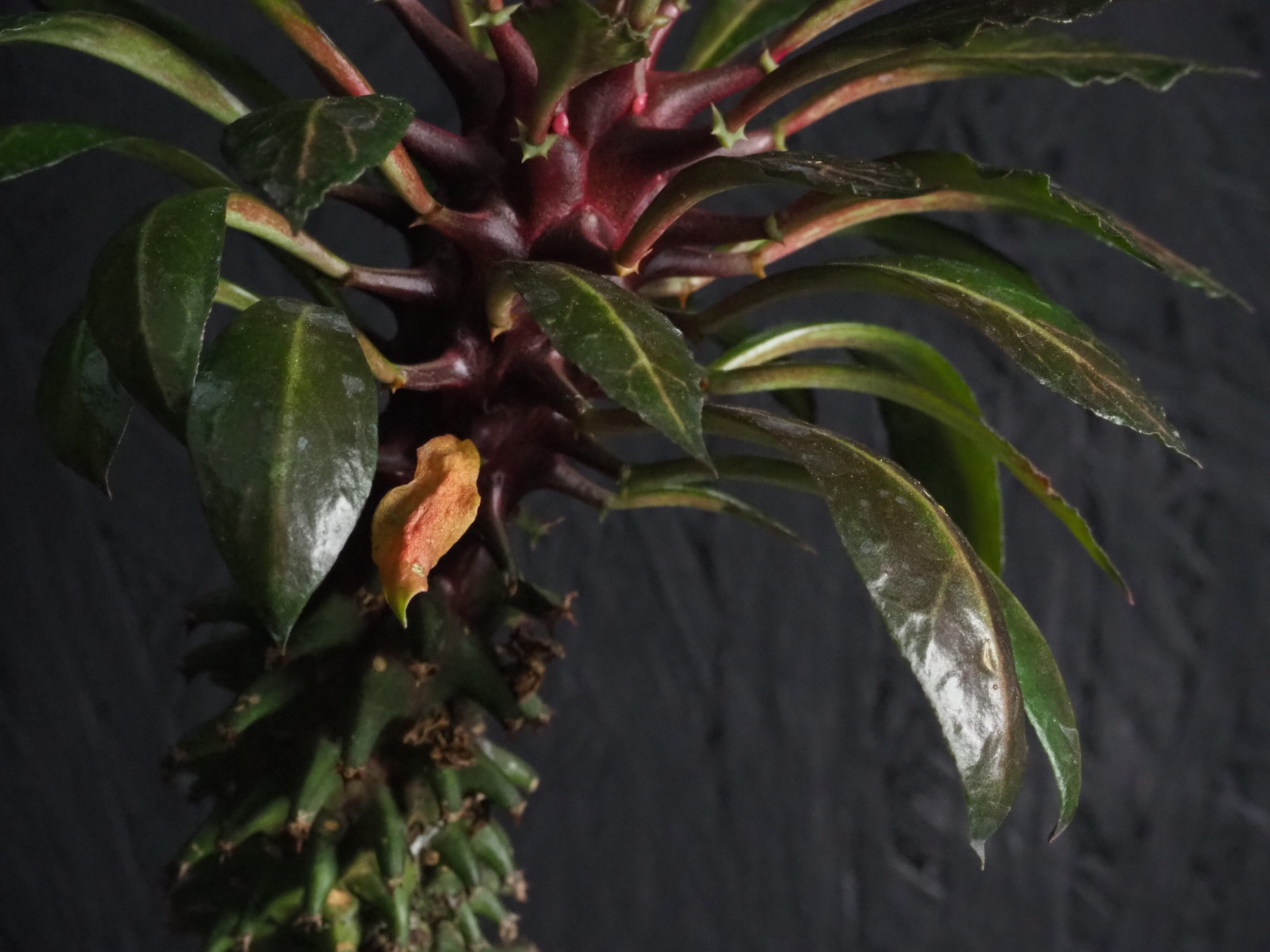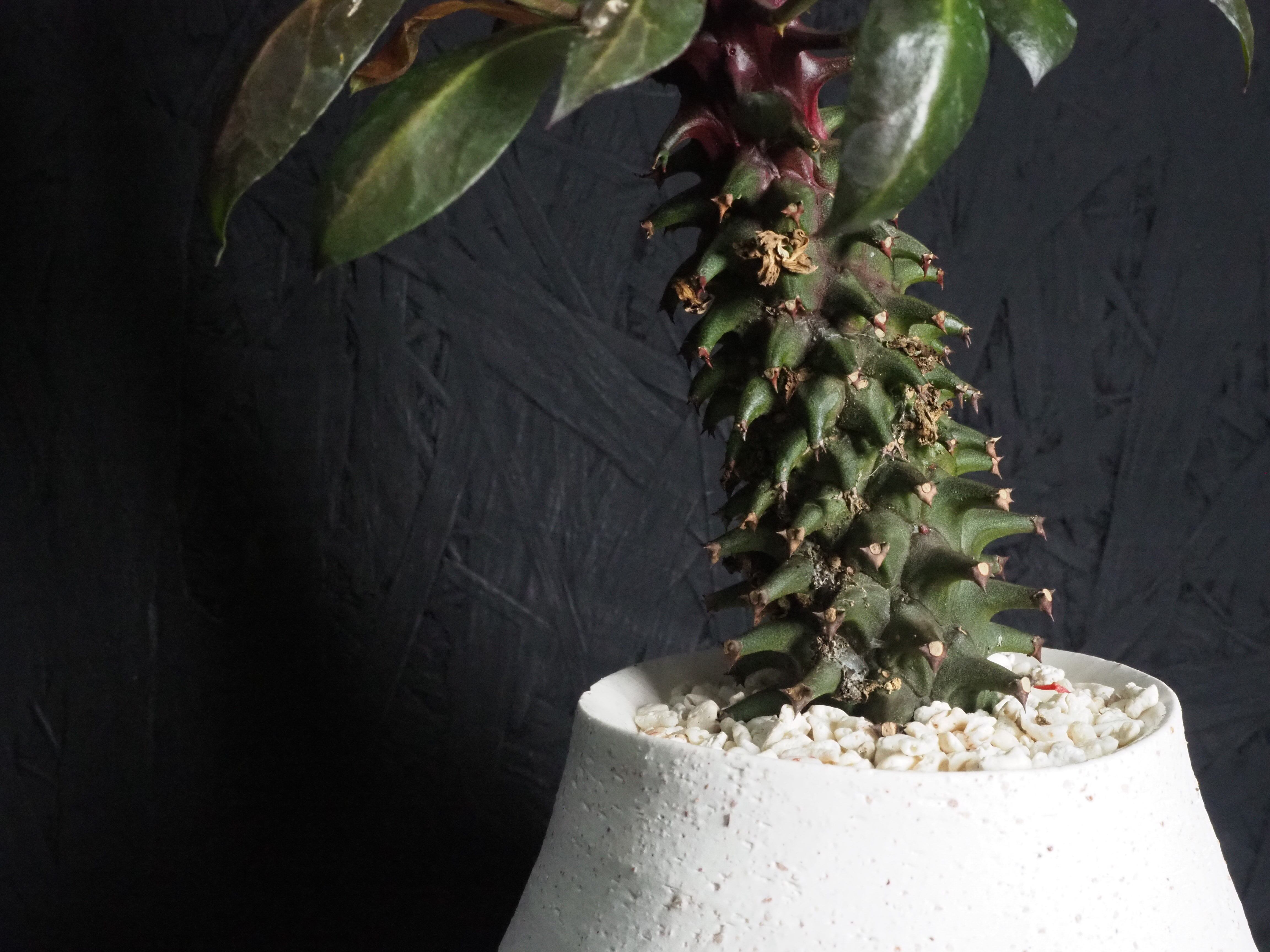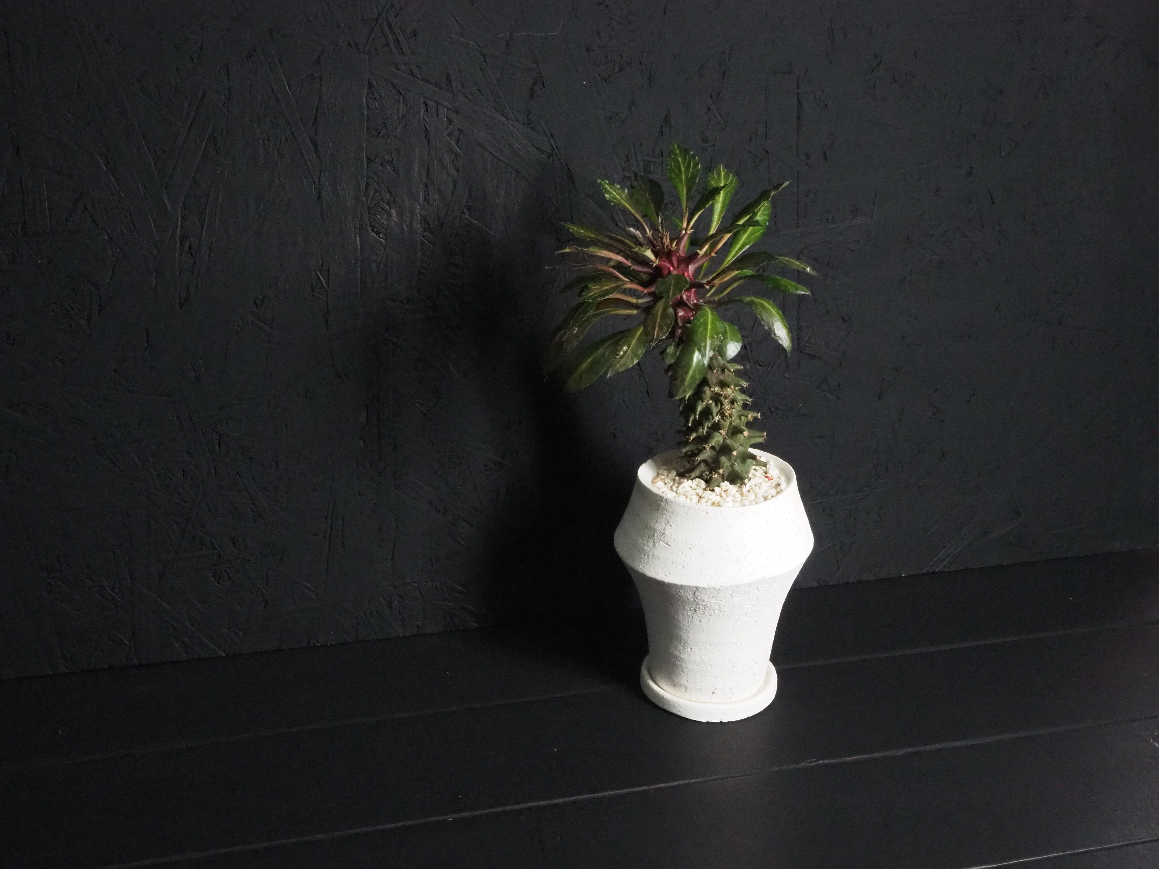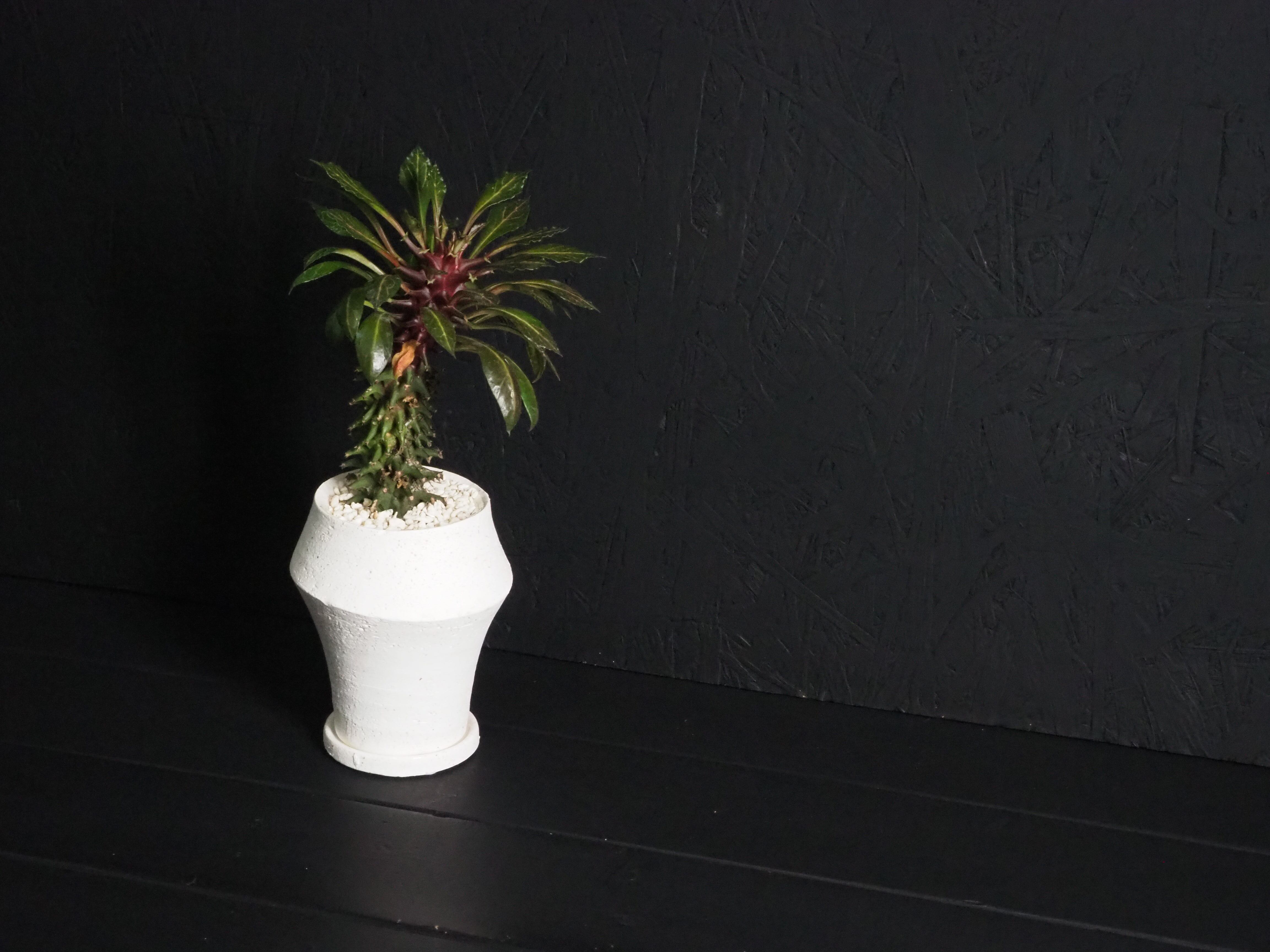生長期には枝の先端から多肉質の葉が生えてきます。通年で良く日光に当てて、風通しのよい場所で管理してください。照度が不足するとせっかくの美しい赤色が薄くなってしまうので注意しましょう。標高の高い場所に原生しているせいか、春や秋に一日の寒暖差が顕著になってくると生育が盛んになり、春まで生育します(真冬を除く)。モナデニウムの中では比較的寒さに強いタイプですが、枯死しない最低温度は5℃が目安。あまり頑張り過ぎて寒さに晒すとサヨナラになってしまいますのでご注意ください。