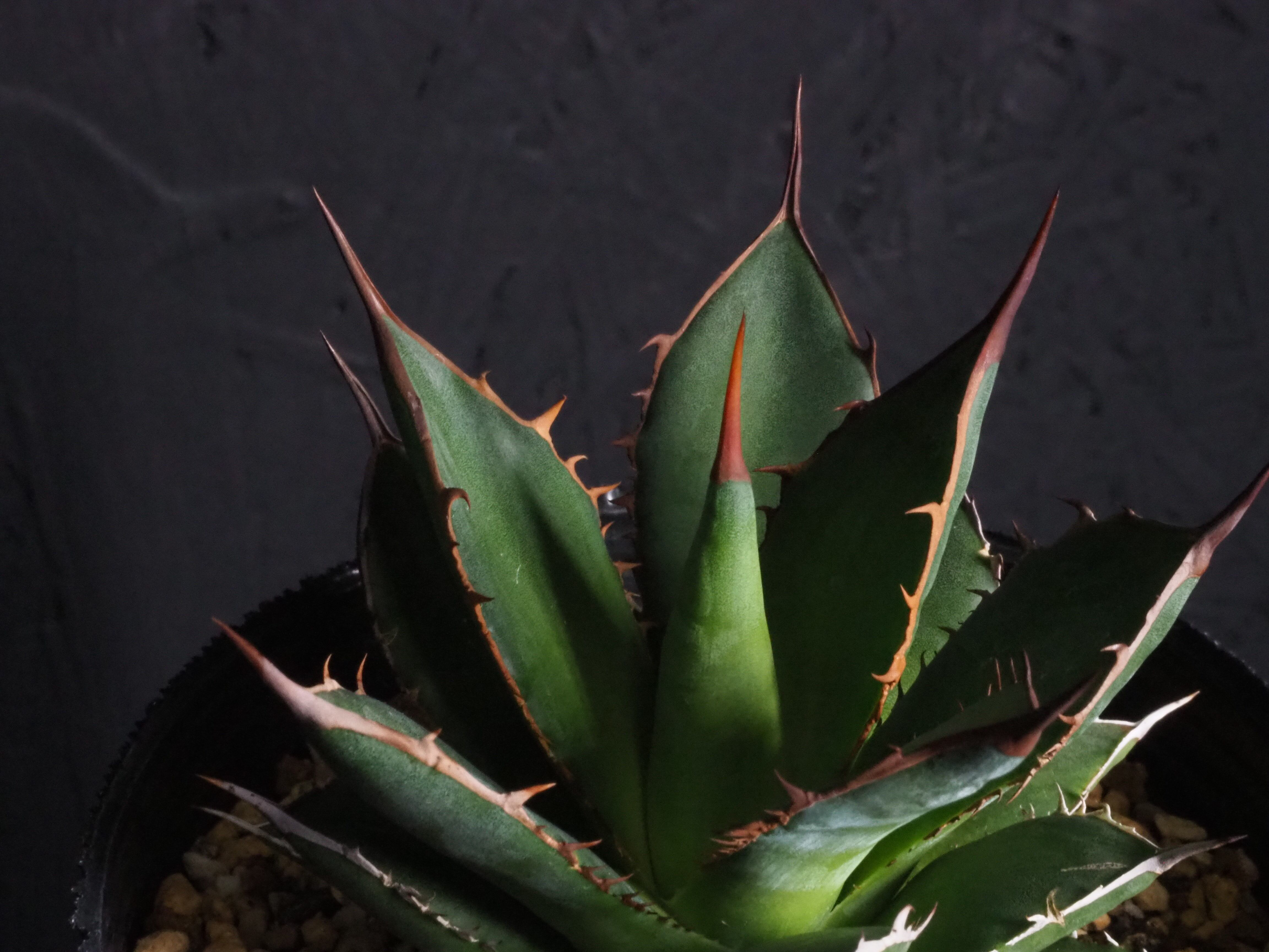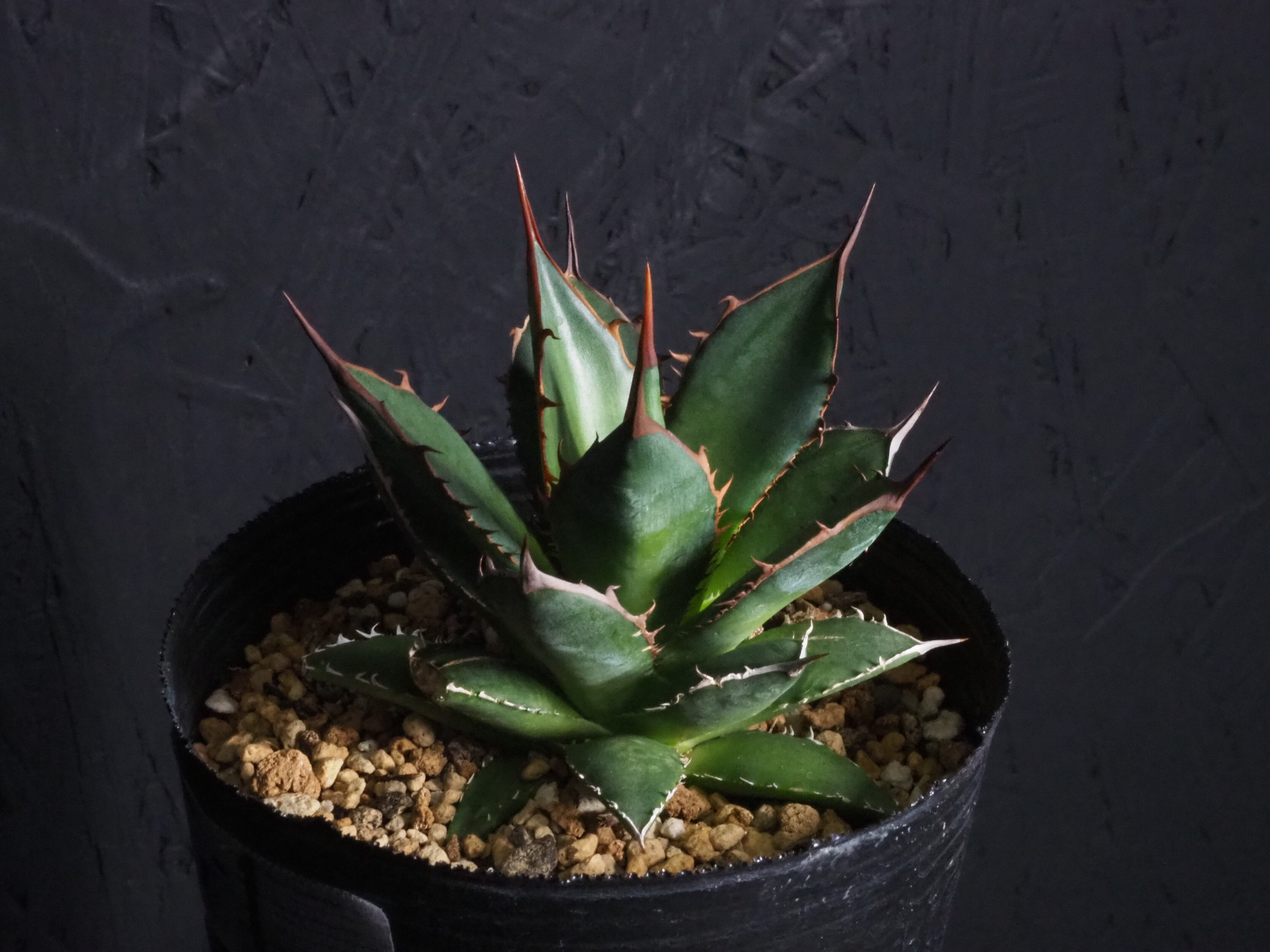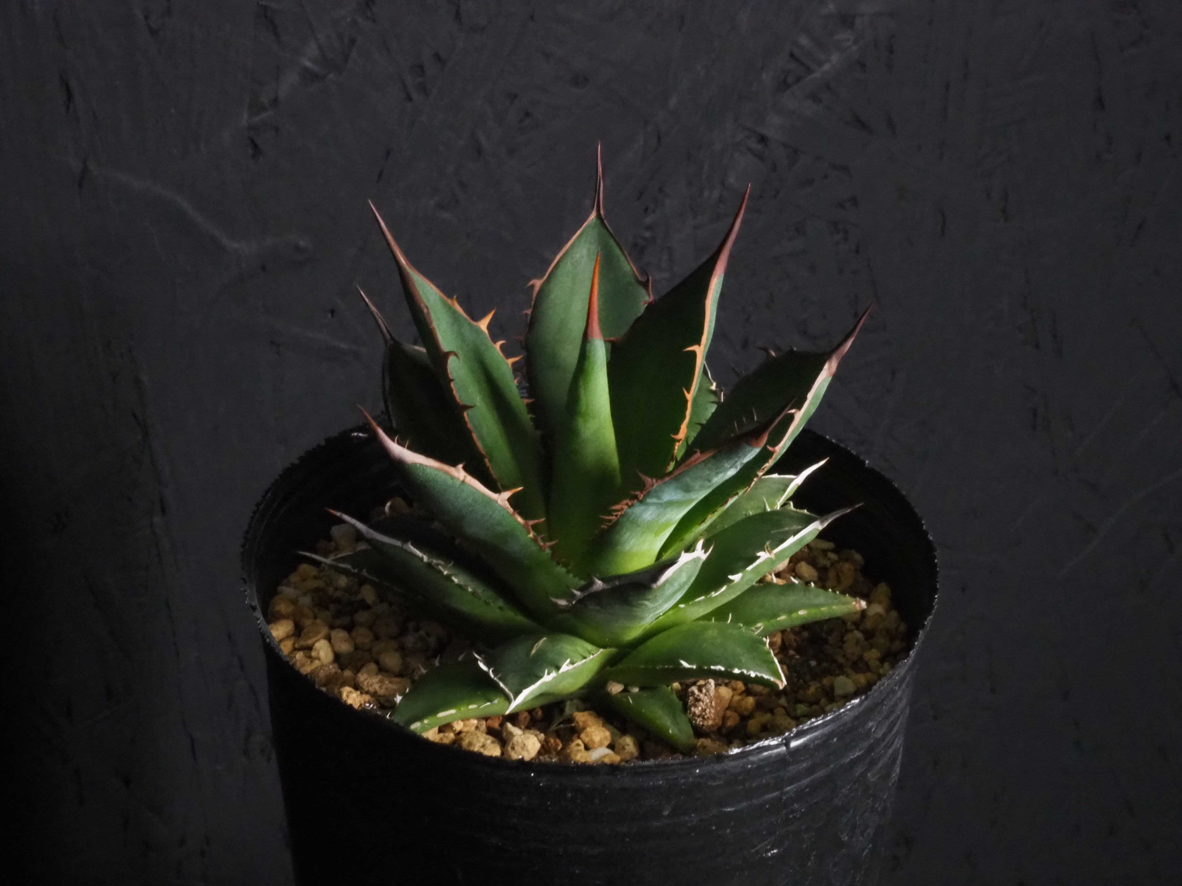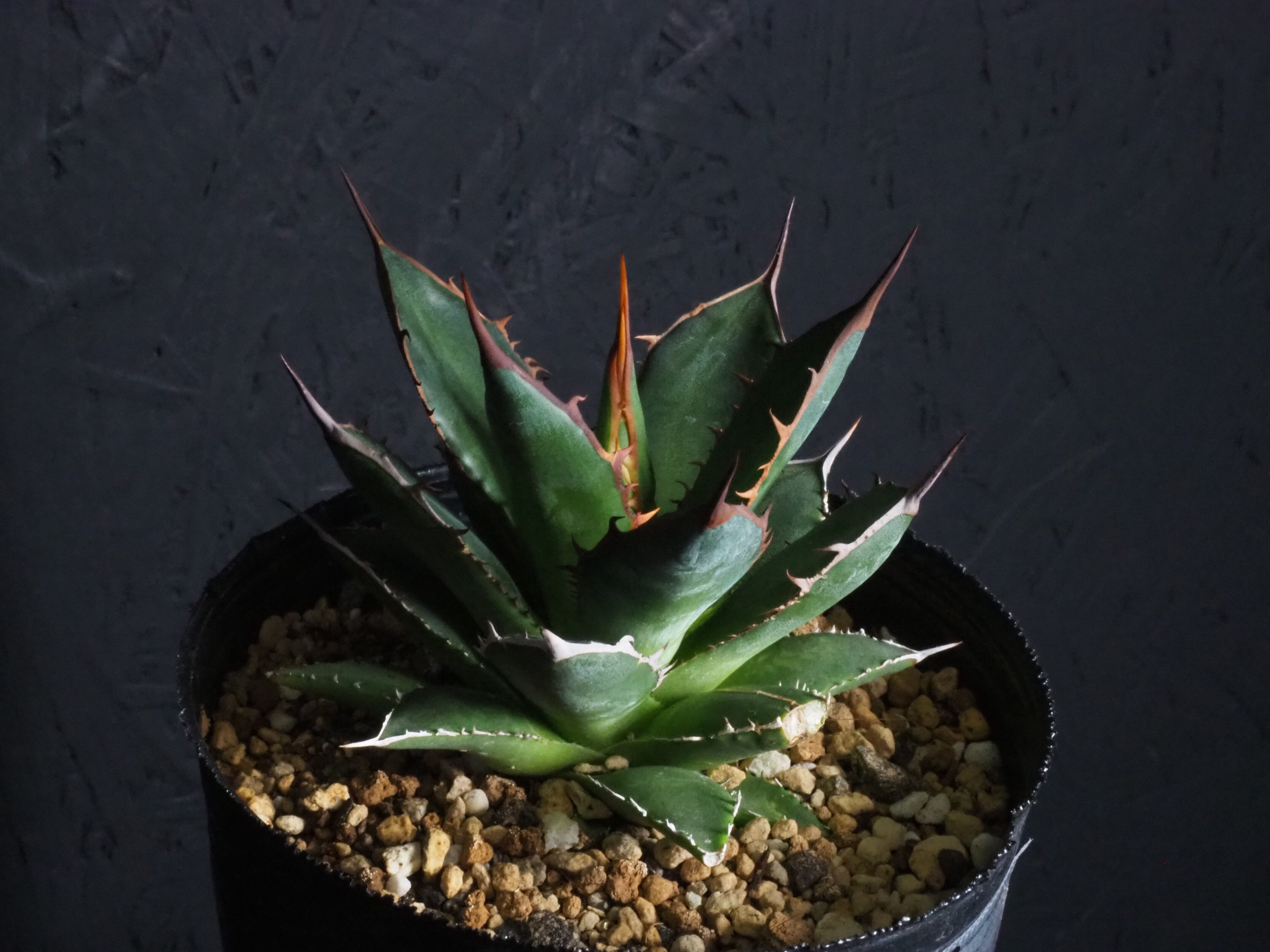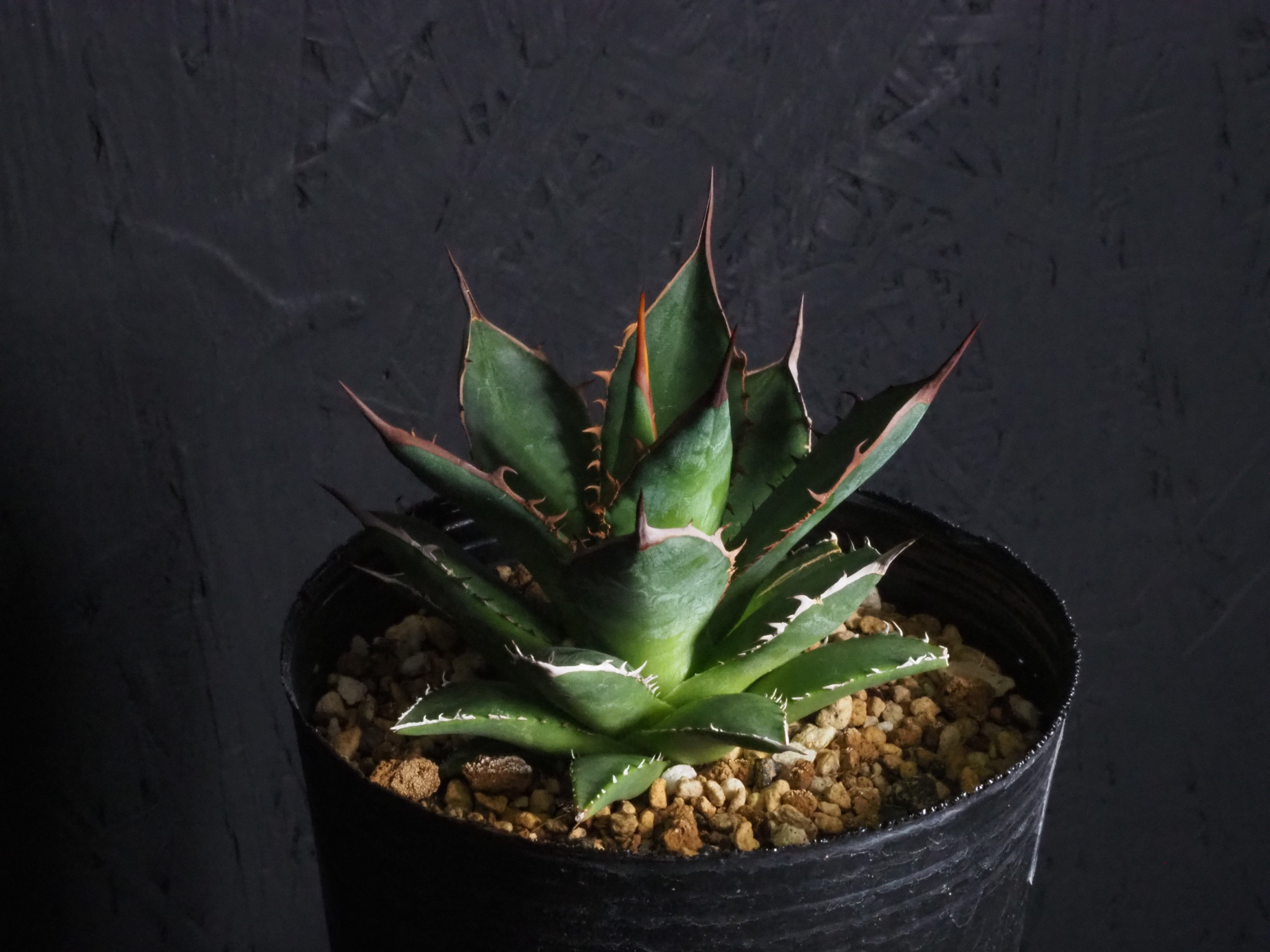 アガベの中型種ホリダ、シャープな葉と強烈な棘が特徴のアガベのトップランカーです。小型~中型であまり大きくならないのが特徴。地植えでは70~80㎝になりますが、締めて管理すれば直径30㎝以内に保つことも可能なアガベです。生長と共に厳つい葉が勢いよく天に向かって伸びる様は本当にカッコイイです。幼体型の内は強い日光は葉焼けを起こしやすいので、環境変化や季節の変わり目は要注意です。少し遮光して管理してあげると調子よくご機嫌ですよ。成株では耐寒性は零下4度くらいまで。この子のようにまだ子株の内は凍結はNGです。