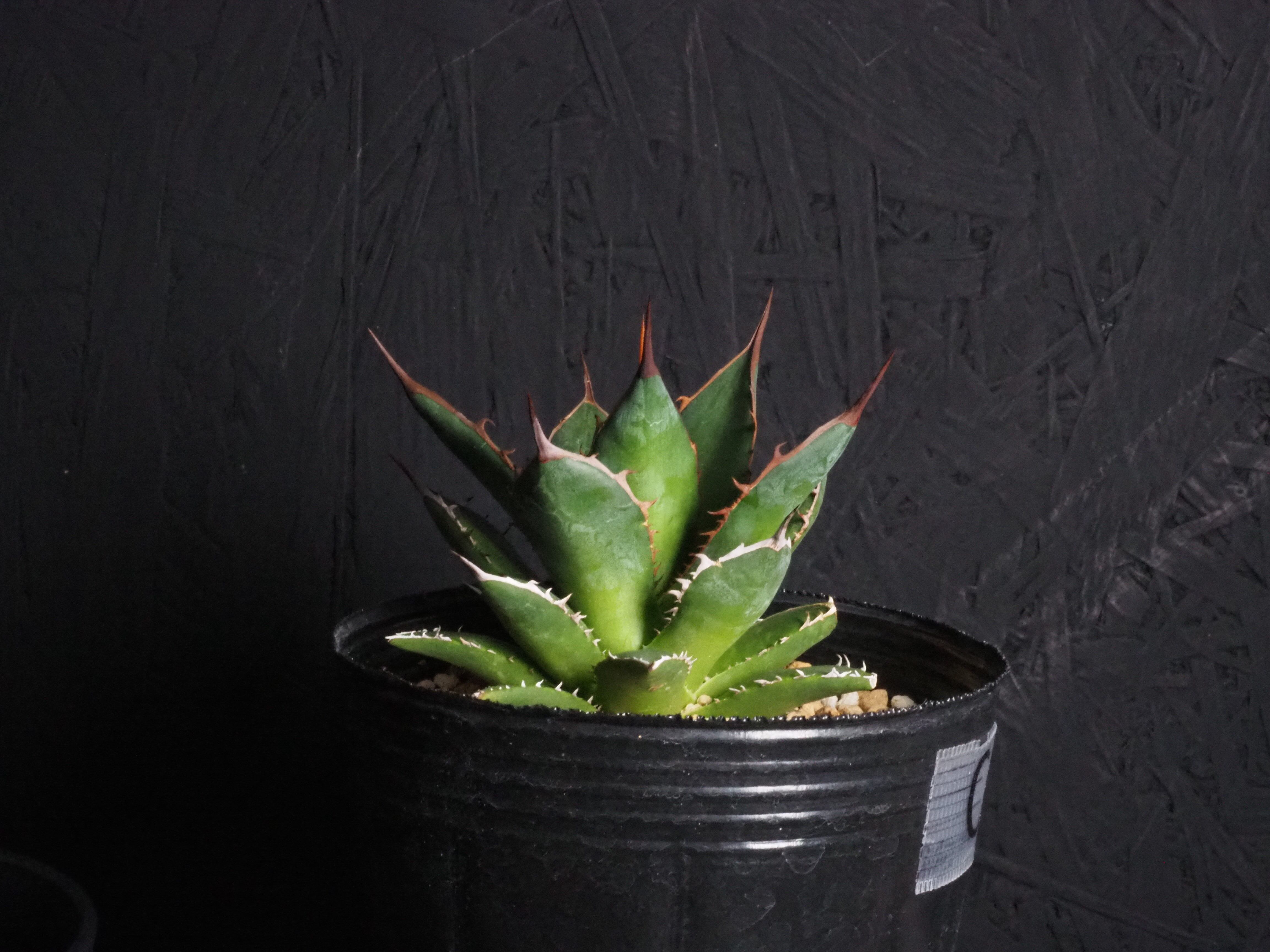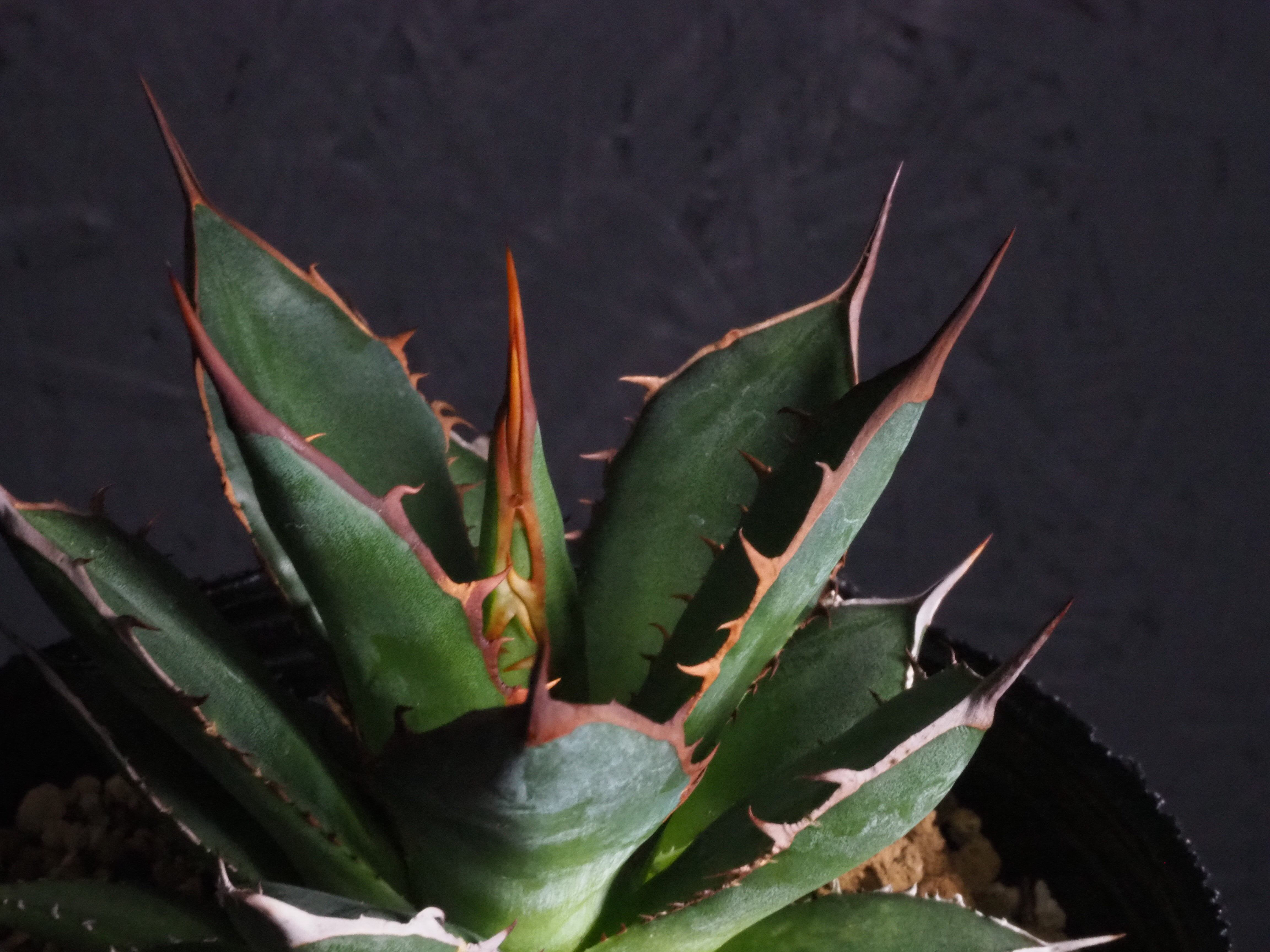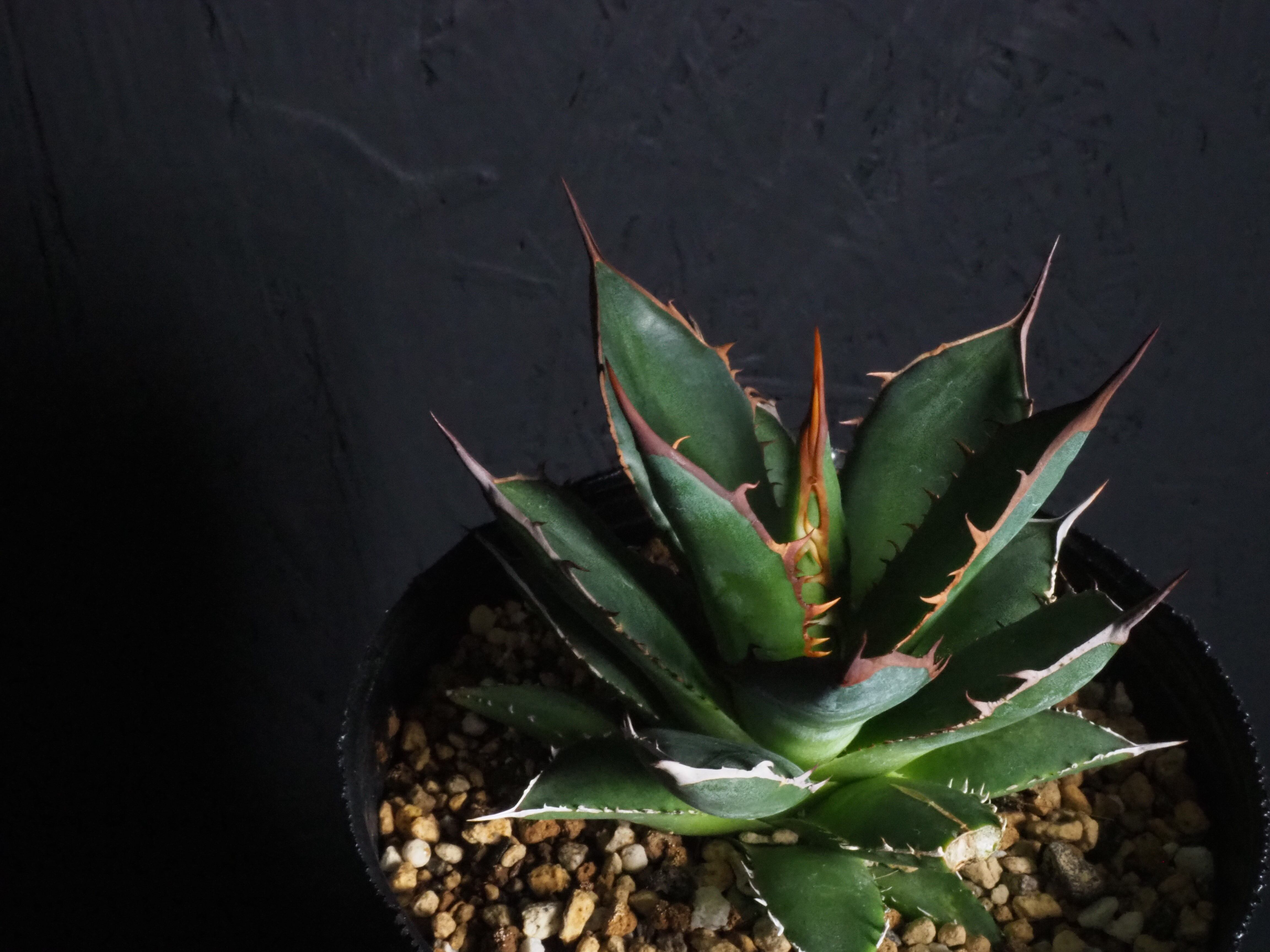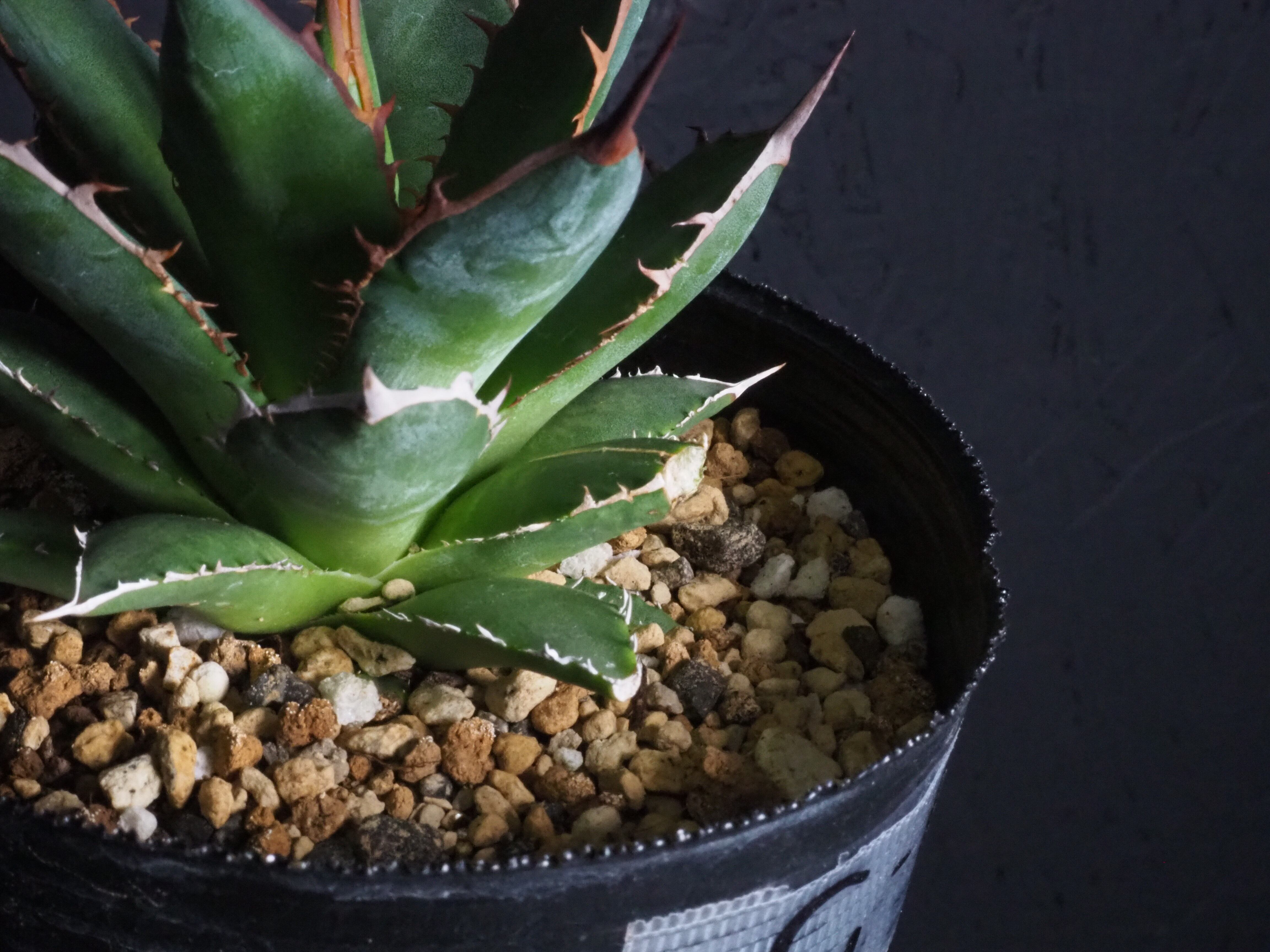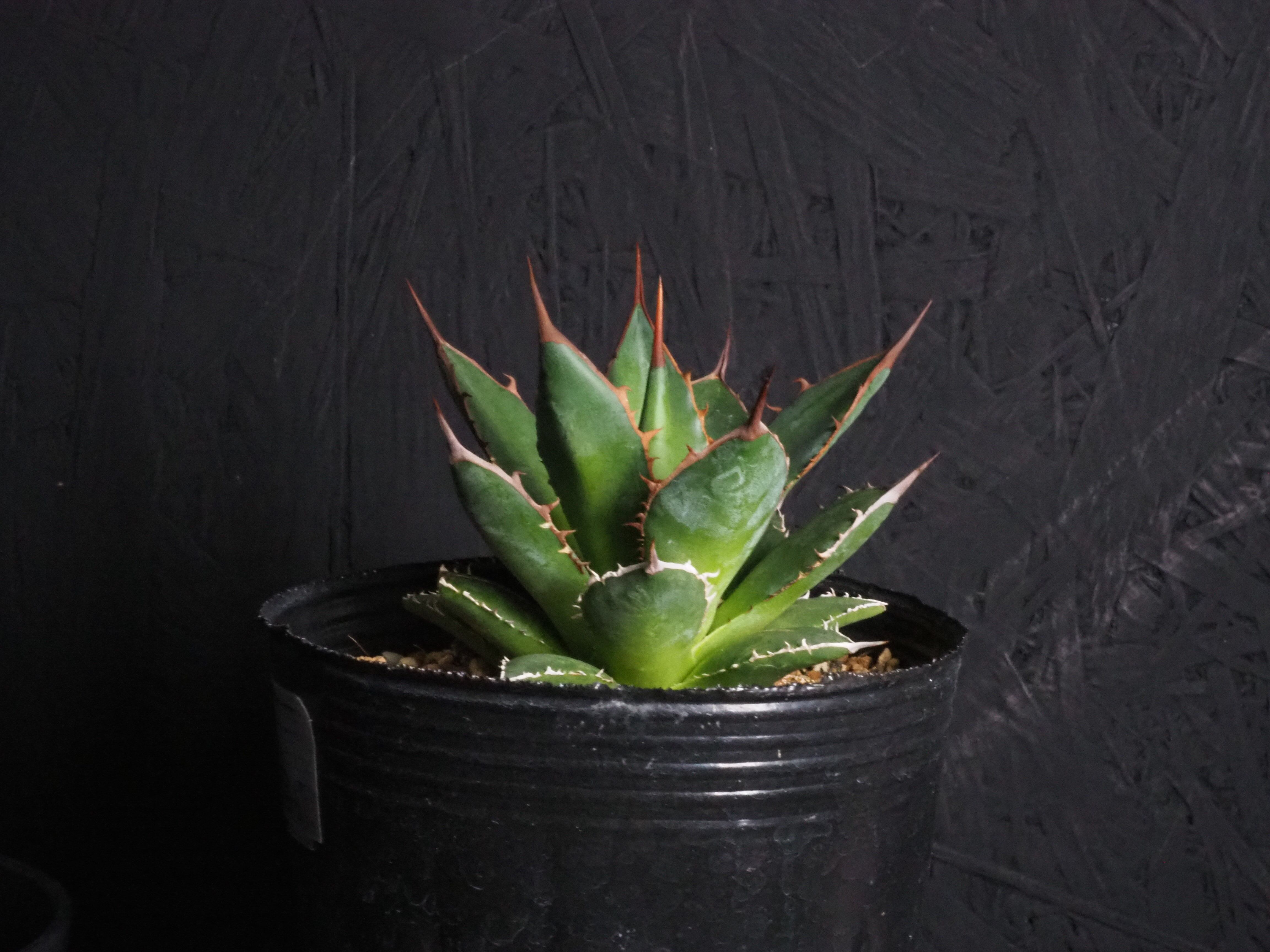 アガベの中型種ホリダ、シャープな葉と強烈な棘が特徴のアガベのトップランカーです。小型~中型であまり大きくならないのが特徴。地植えでは70~80㎝になりますが、締めて管理すれば直径30㎝以内に保つことも可能なアガベです。生長と共に厳つい葉が勢いよく天に向かって伸びる様は本当にカッコイイです。幼体型の内は強い日光は葉焼けを起こしやすいので、環境変化や季節の変わり目は要注意です。少し遮光して管理してあげると調子よくご機嫌ですよ。成株では耐寒性は零下4度くらいまで。この子のようにまだ子株の内は凍結はNGです。