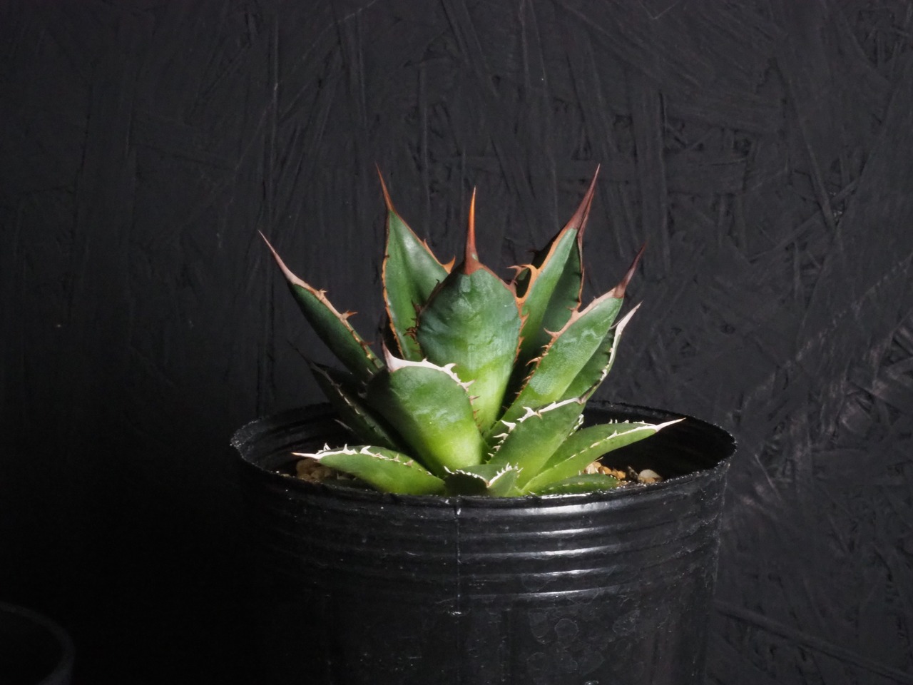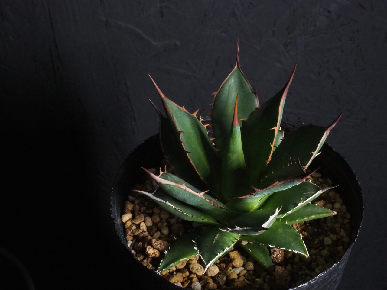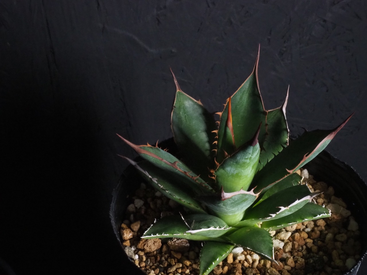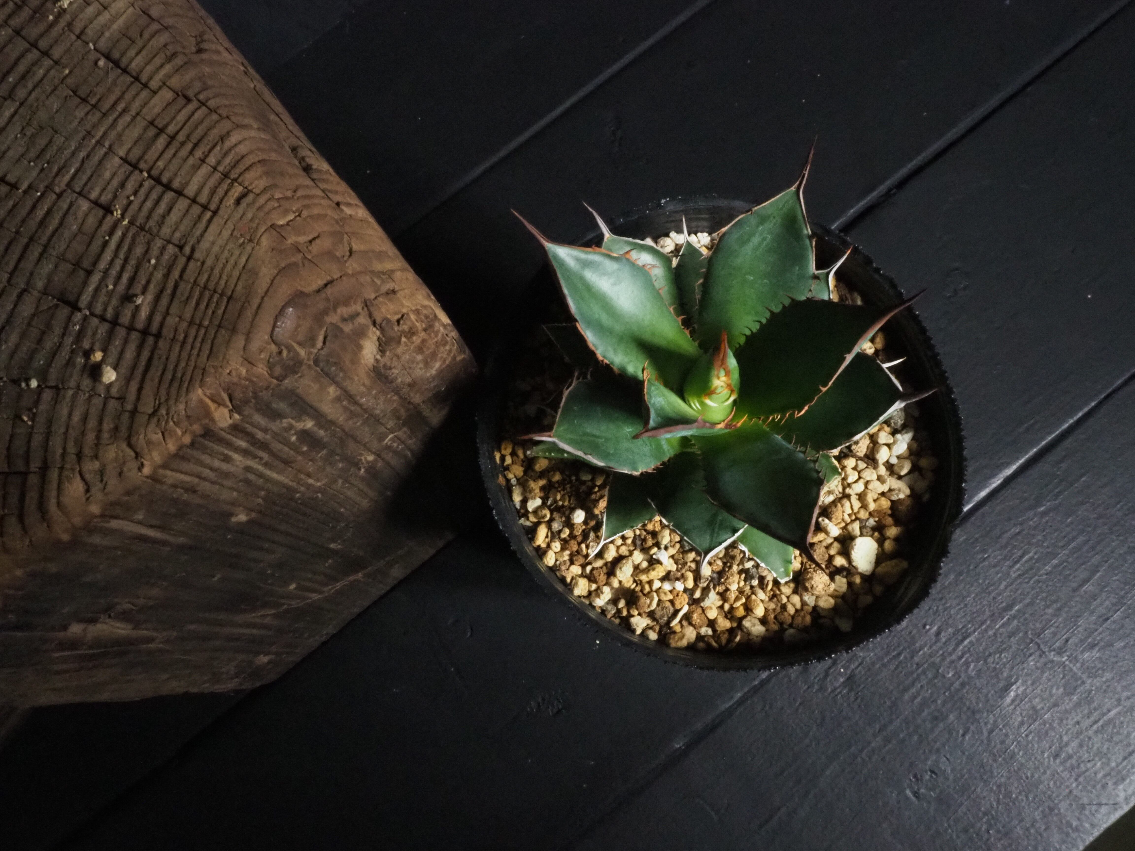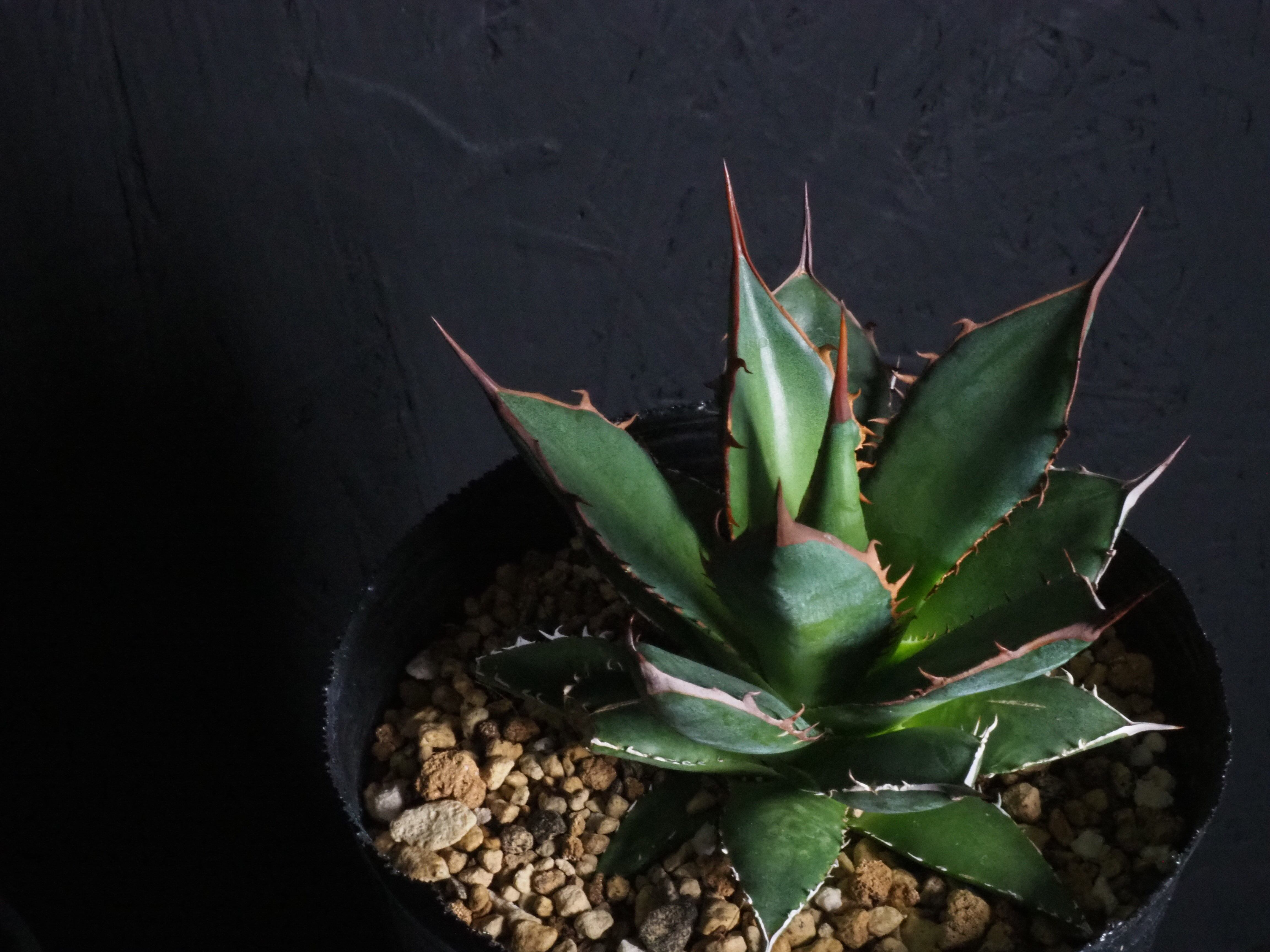 アガベの中型種ホリダ、シャープな葉と強烈な棘が特徴のアガベのトップランカーです。小型~中型であまり大きくならないのが特徴。地植えでは70~80㎝になりますが、締めて管理すれば直径30㎝以内に保つことも可能なアガベです。生長と共に厳つい葉が勢いよく天に向かって伸びる様は本当にカッコイイです。幼体型の内は強い日光は葉焼けを起こしやすいので、環境変化や季節の変わり目は要注意です。少し遮光して管理してあげると調子よくご機嫌ですよ。成株では耐寒性は零下4度くらいまで。この子のようにまだ子株の内は凍結はNGです。