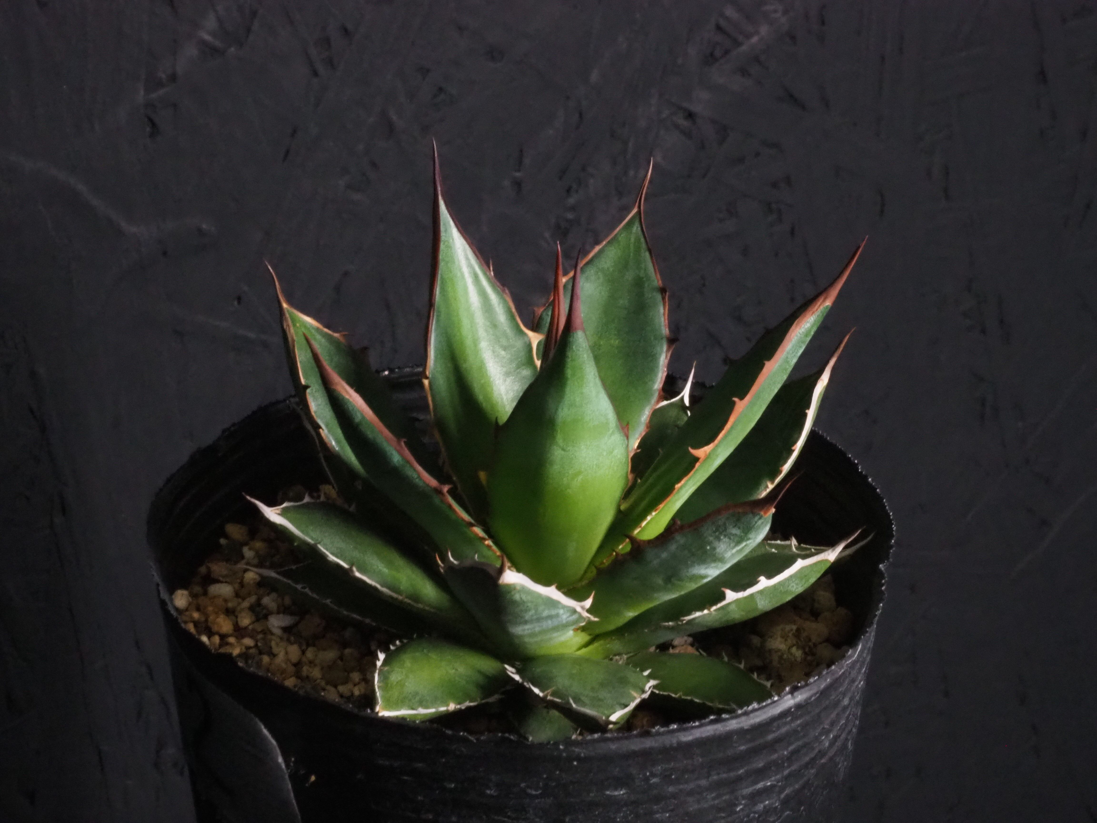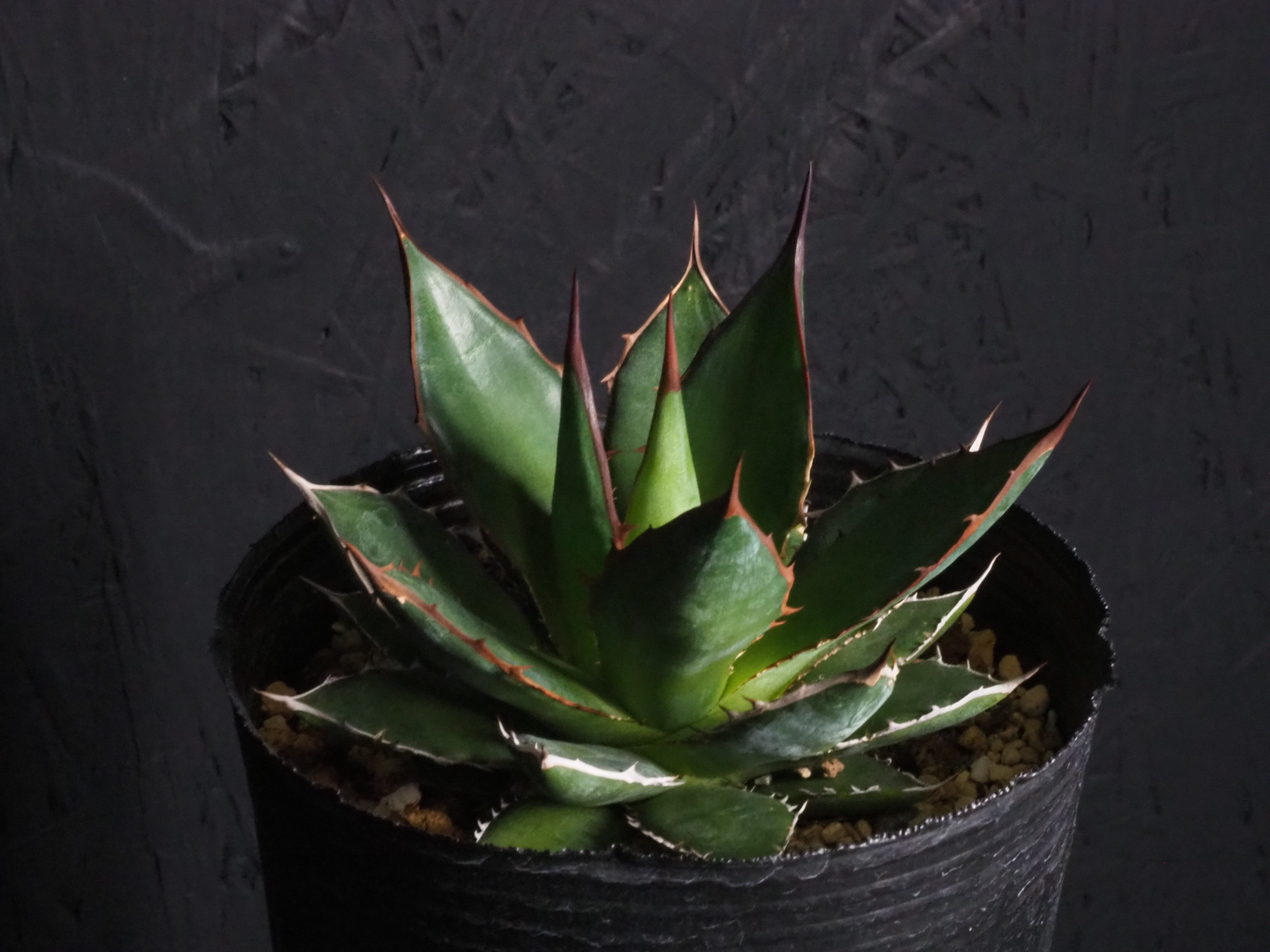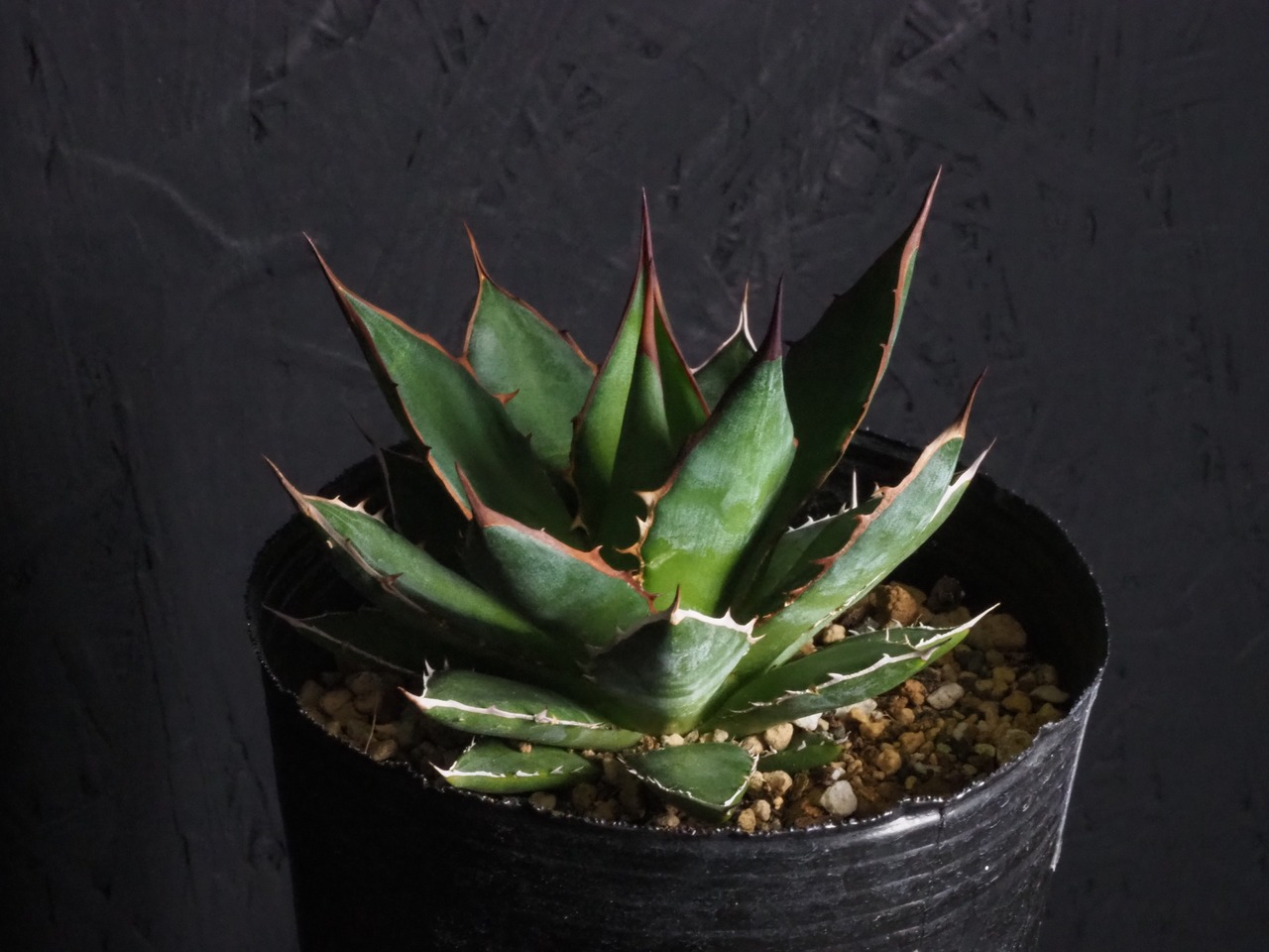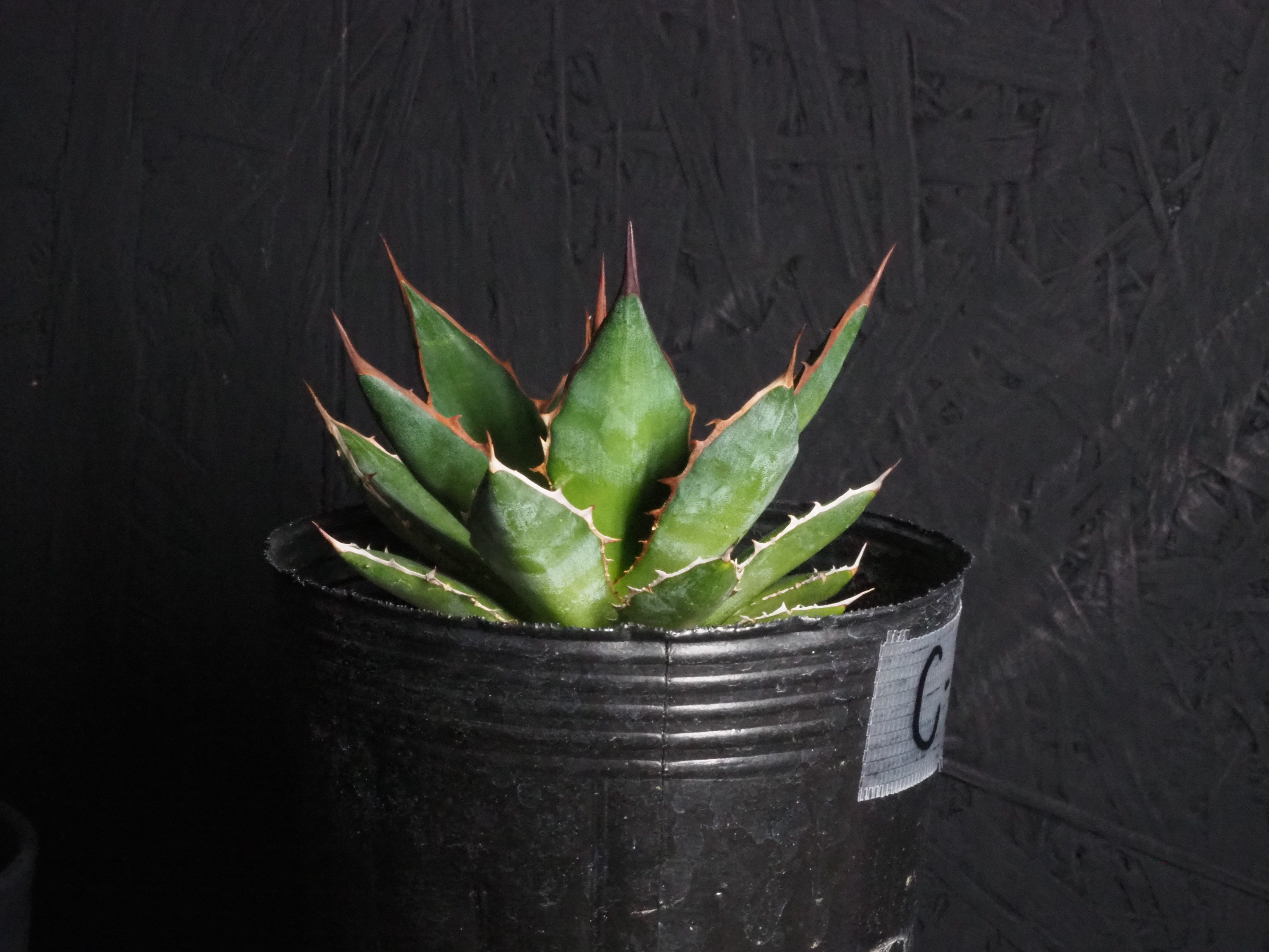 アガベの中型種ホリダ、シャープな葉と強烈な棘が特徴のアガベのトップランカーです。小型~中型であまり大きくならないのが特徴。地植えでは70~80㎝になりますが、締めて管理すれば直径30㎝以内に保つことも可能なアガベです。生長と共に厳つい葉が勢いよく天に向かって伸びる様は本当にカッコイイです。幼体型の内は強い日光は葉焼けを起こしやすいので、環境変化や季節の変わり目は要注意です。少し遮光して管理してあげると調子よくご機嫌ですよ。成株では耐寒性は零下4度くらいまで。この子のようにまだ子株の内は凍結はNGです。