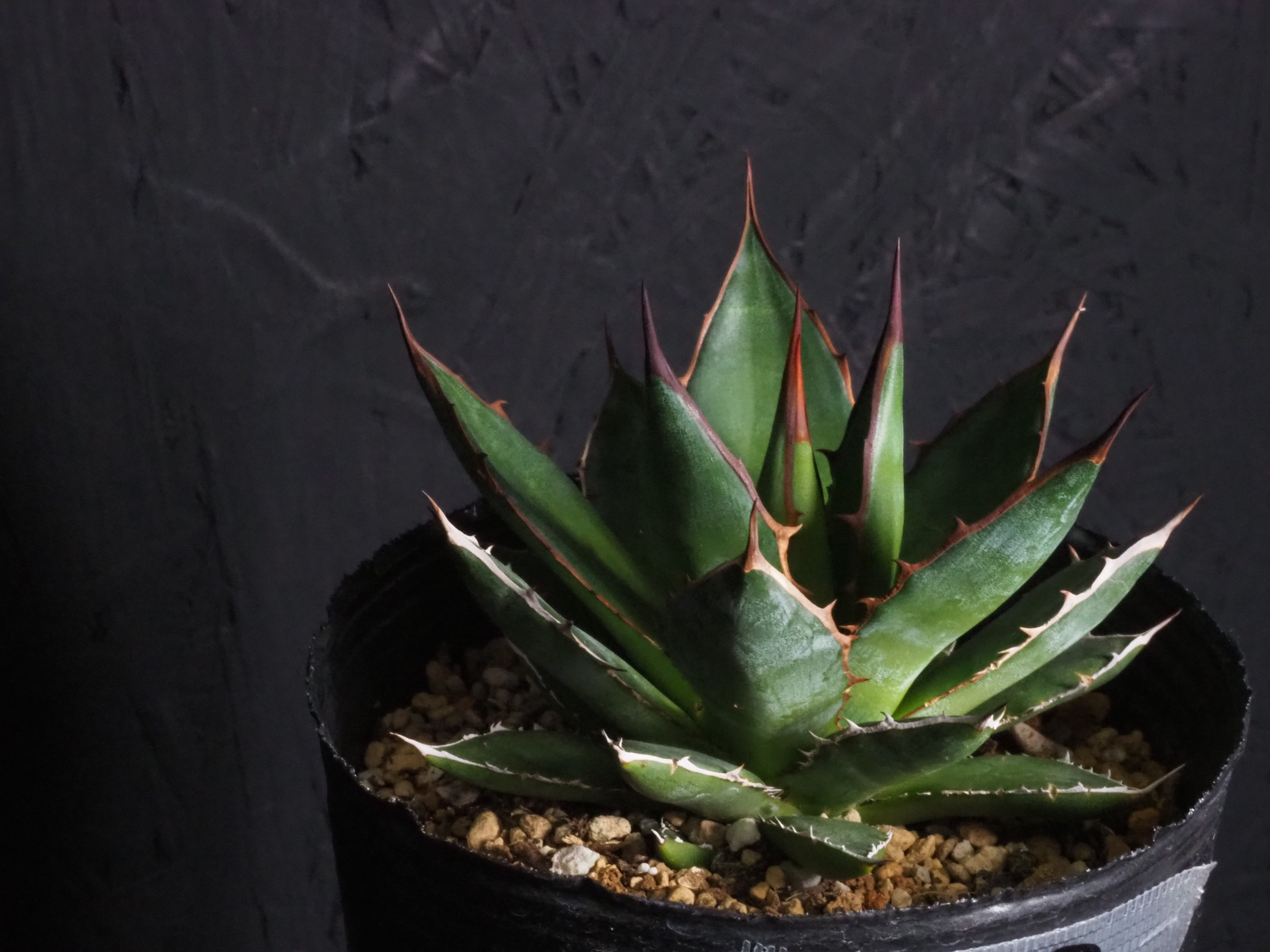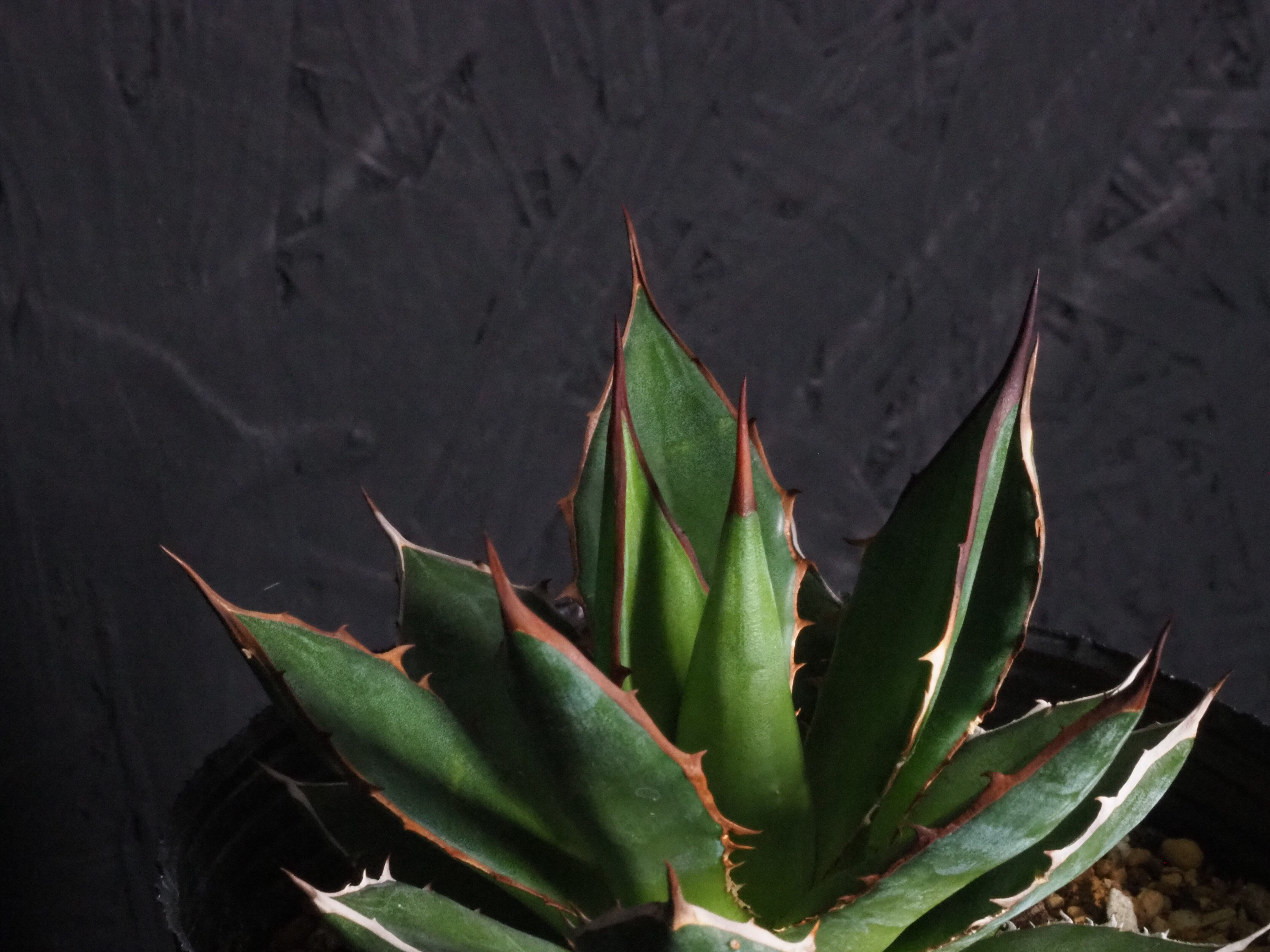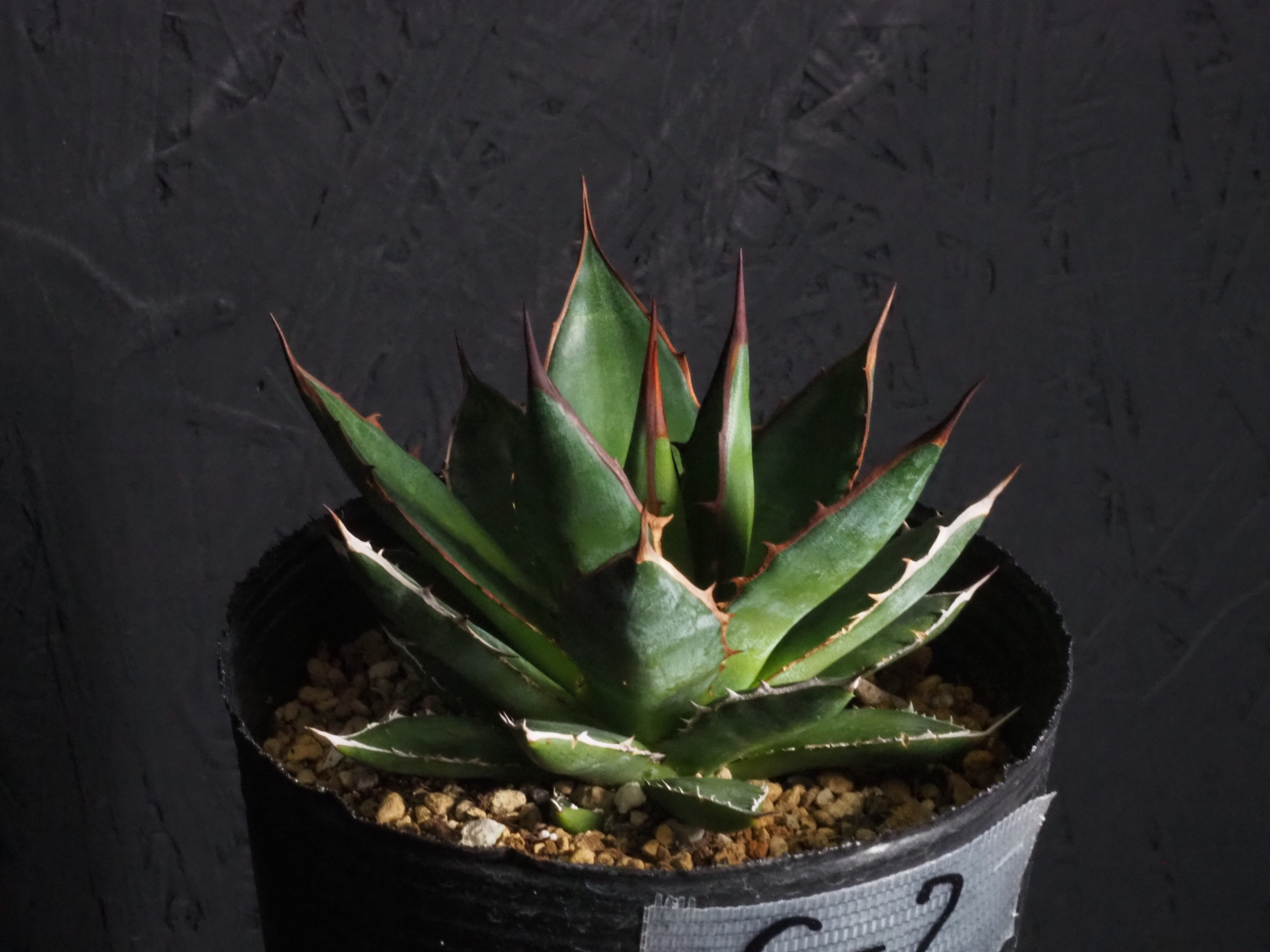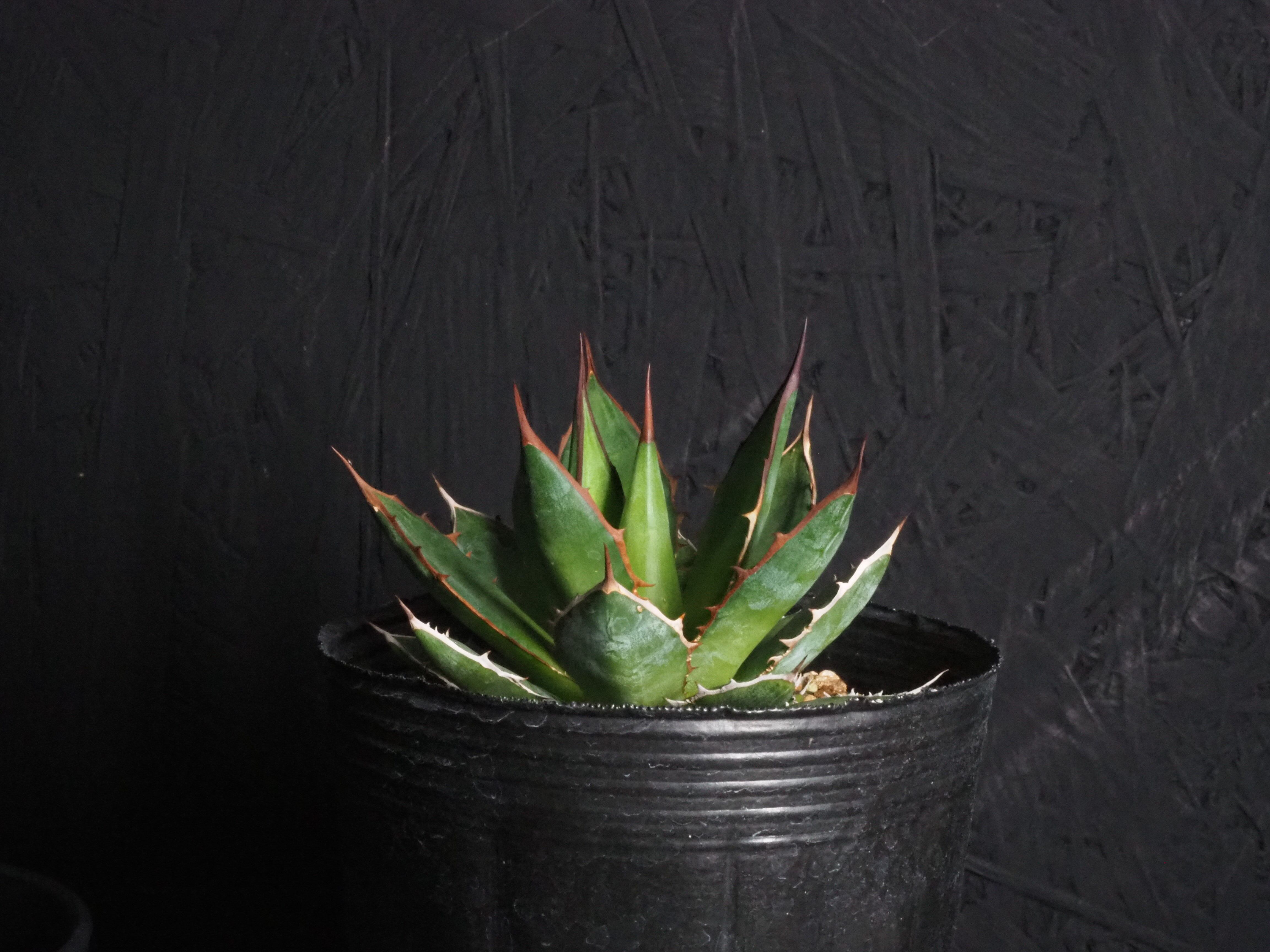 アガベの中型種ホリダ、シャープな葉と強烈な棘が特徴のアガベのトップランカーです。小型~中型であまり大きくならないのが特徴。地植えでは70~80㎝になりますが、締めて管理すれば直径30㎝以内に保つことも可能なアガベです。生長と共に厳つい葉が勢いよく天に向かって伸びる様は本当にカッコイイです。幼体型の内は強い日光は葉焼けを起こしやすいので、環境変化や季節の変わり目は要注意です。少し遮光して管理してあげると調子よくご機嫌ですよ。成株では耐寒性は零下4度くらいまで。この子のようにまだ子株の内は凍結はNGです。