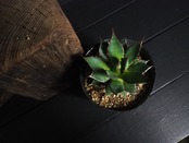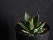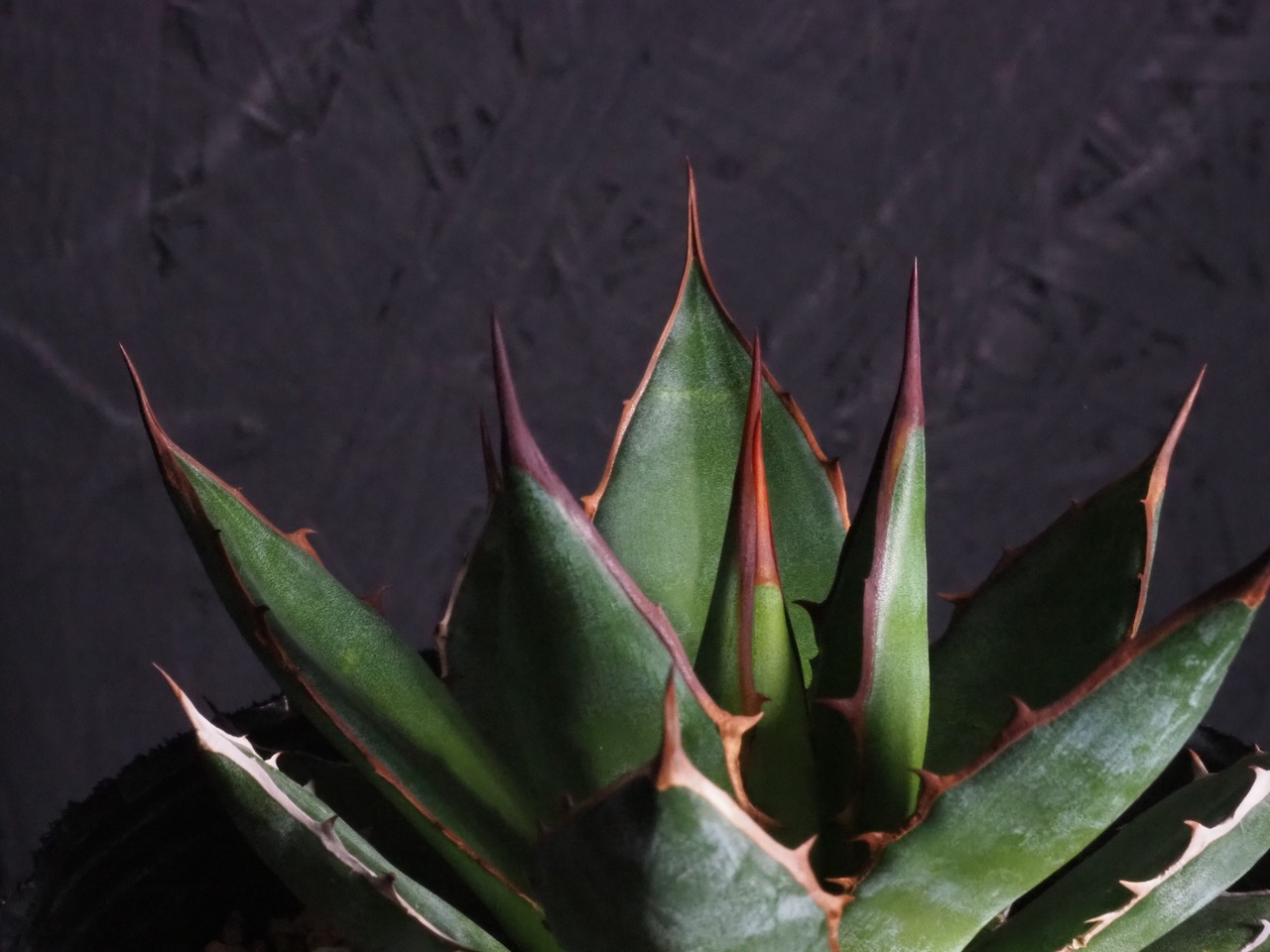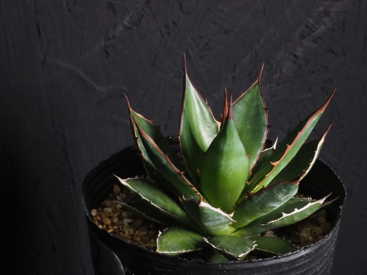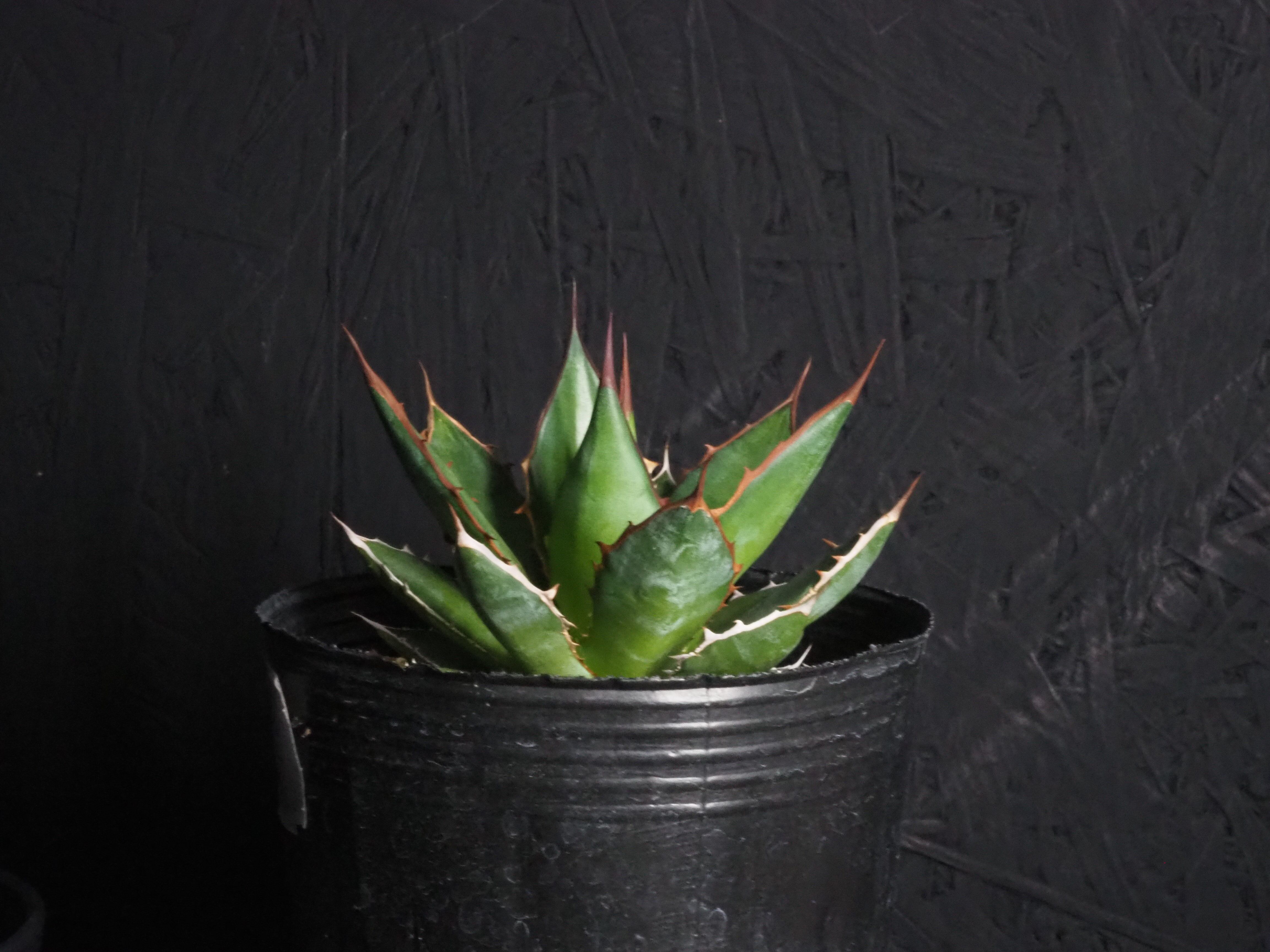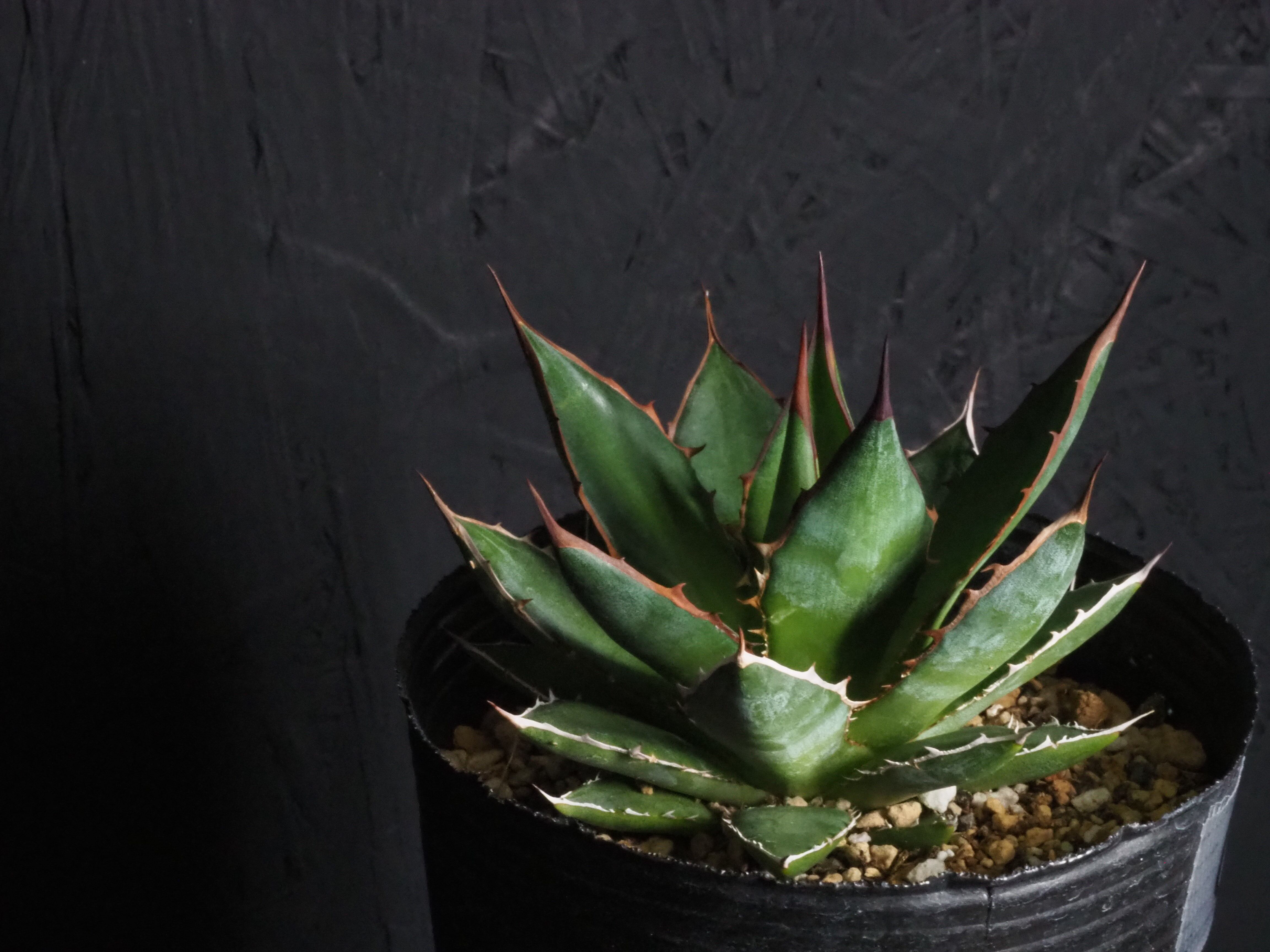 アガベの中型種ホリダ、シャープな葉と強烈な棘が特徴のアガベのトップランカーです。小型~中型であまり大きくならないのが特徴。地植えでは70~80㎝になりますが、締めて管理すれば直径30㎝以内に保つことも可能なアガベです。生長と共に厳つい葉が勢いよく天に向かって伸びる様は本当にカッコイイです。幼体型の内は強い日光は葉焼けを起こしやすいので、環境変化や季節の変わり目は要注意です。少し遮光して管理してあげると調子よくご機嫌ですよ。成株では耐寒性は零下4度くらいまで。この子のようにまだ子株の内は凍結はNGです。