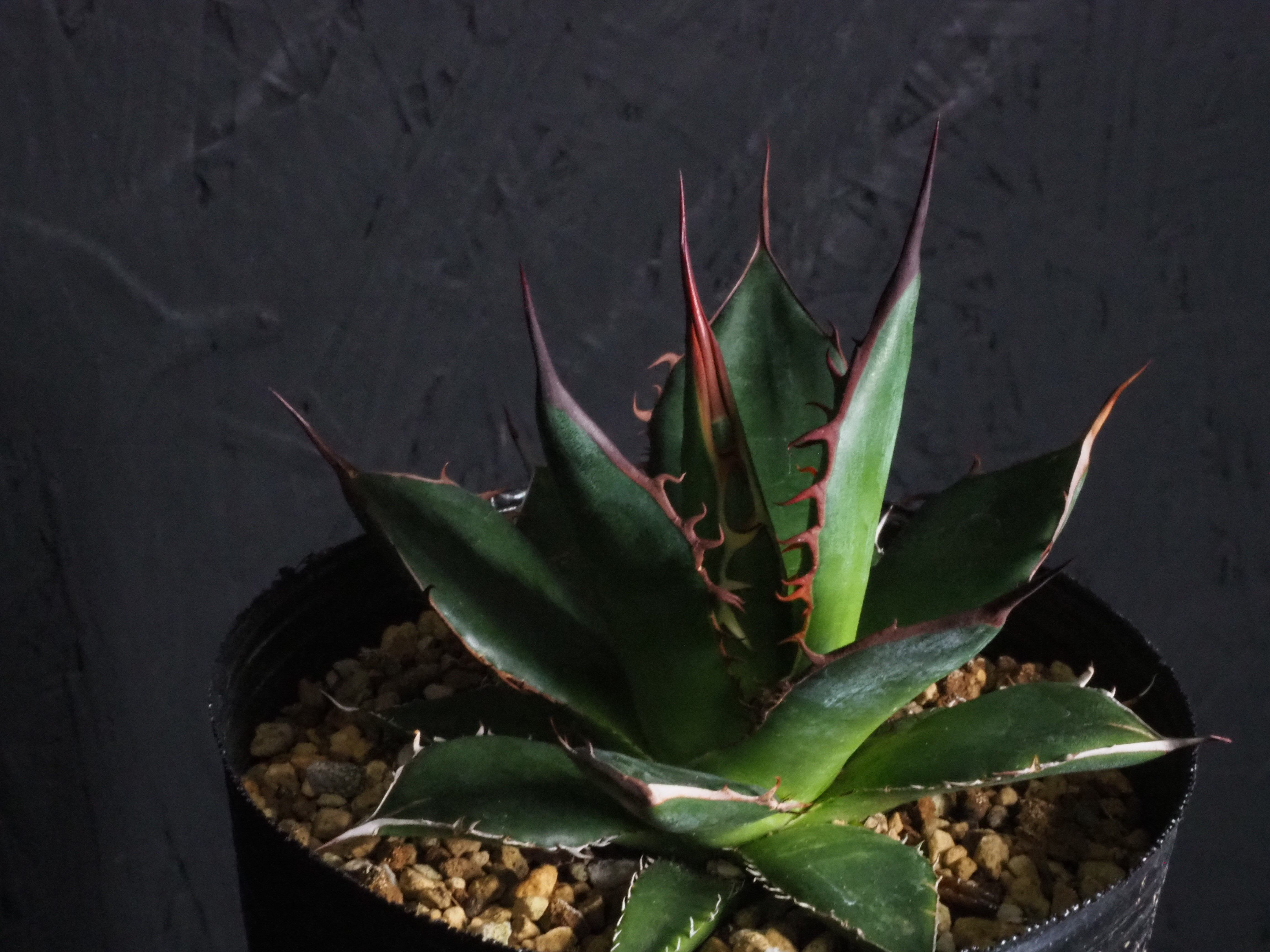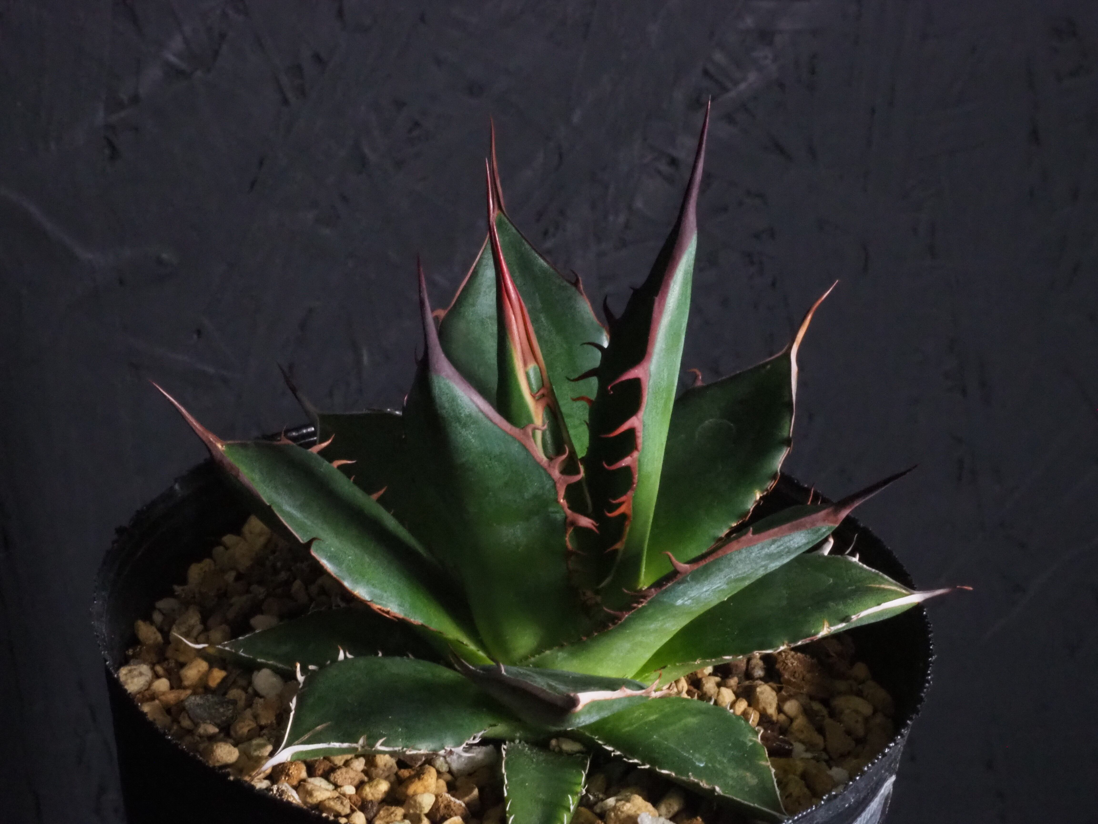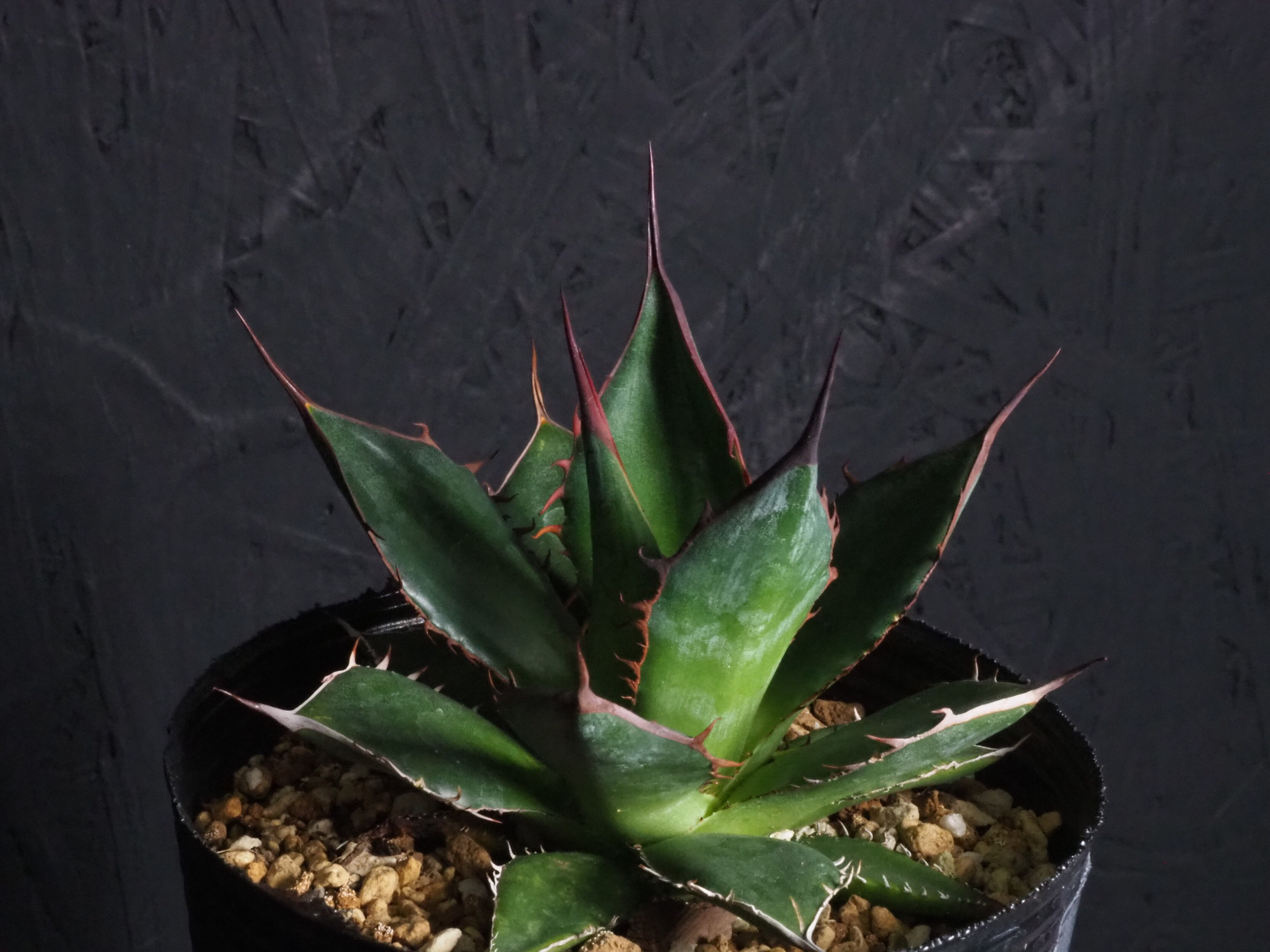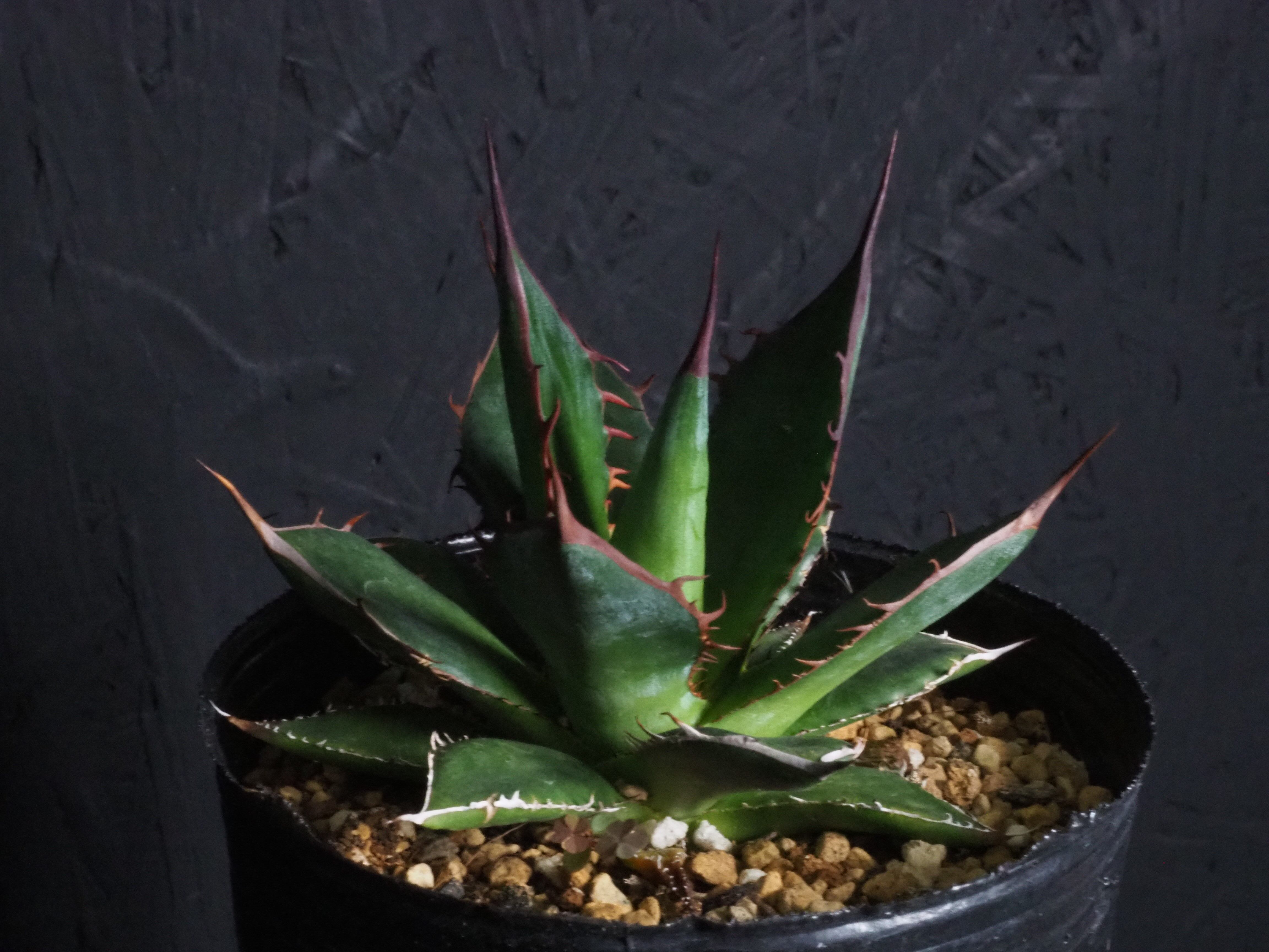 アガベの中型種ホリダ、シャープな葉と強烈な棘が特徴のアガベのトップランカーです。小型~中型であまり大きくならないのが特徴。地植えでは70~80㎝になりますが、締めて管理すれば直径30㎝以内に保つことも可能なアガベです。生長と共に厳つい葉が勢いよく天に向かって伸びる様は本当にカッコイイです。幼体型の内は強い日光は葉焼けを起こしやすいので、環境変化や季節の変わり目は要注意です。少し遮光して管理してあげると調子よくご機嫌ですよ。成株では耐寒性は零下4度くらいまで。この子のようにまだ子株の内は凍結はNGです。