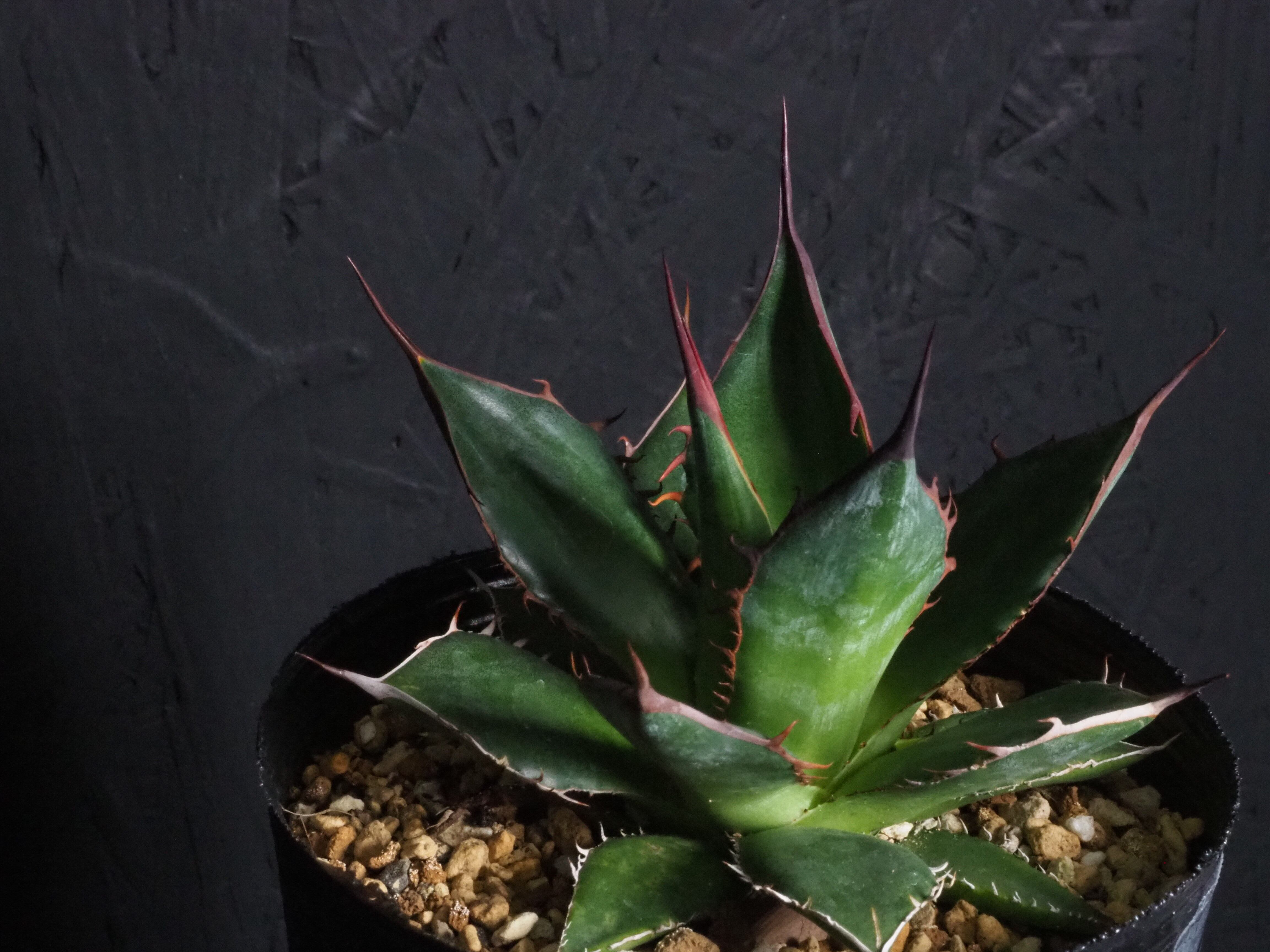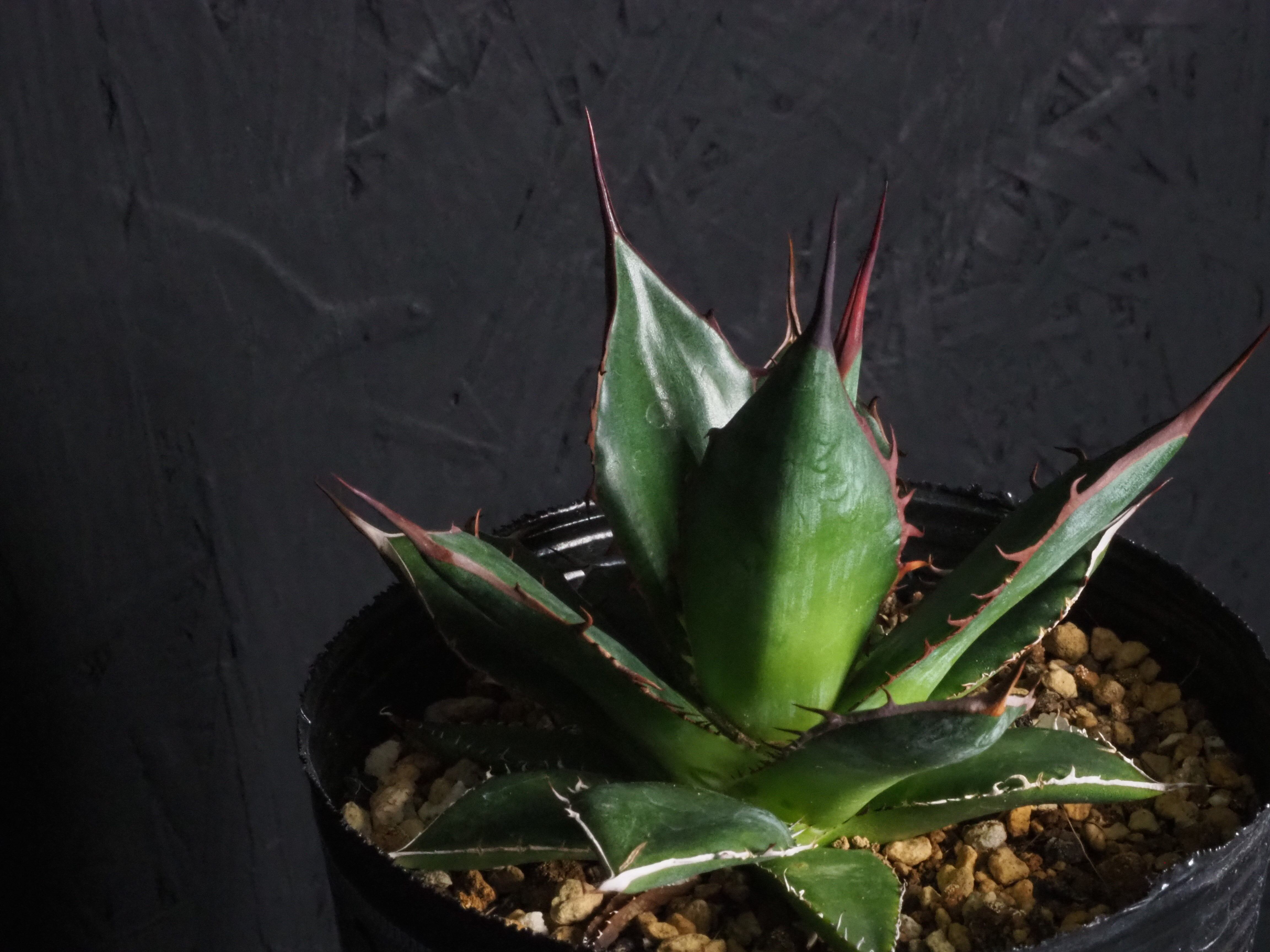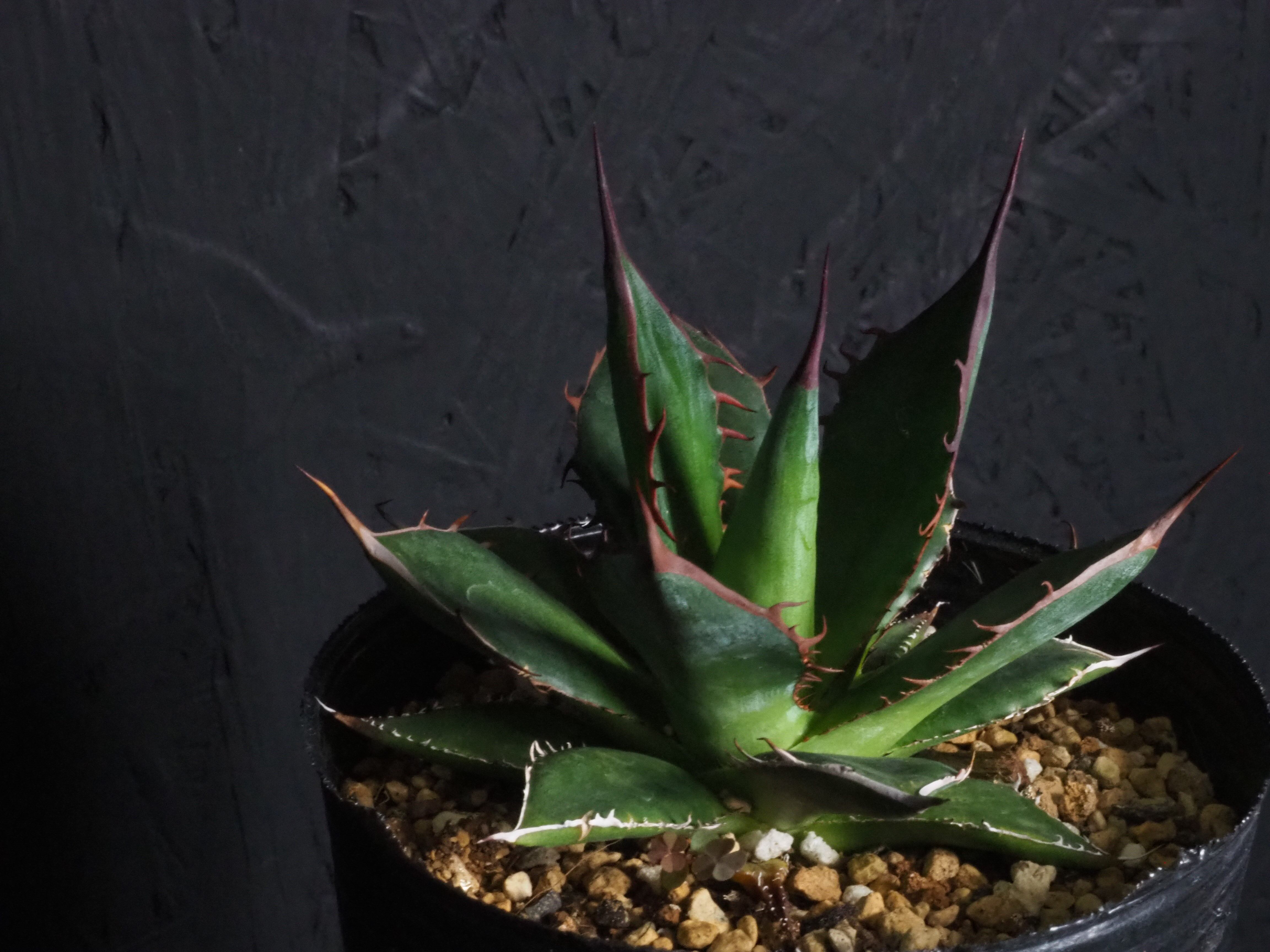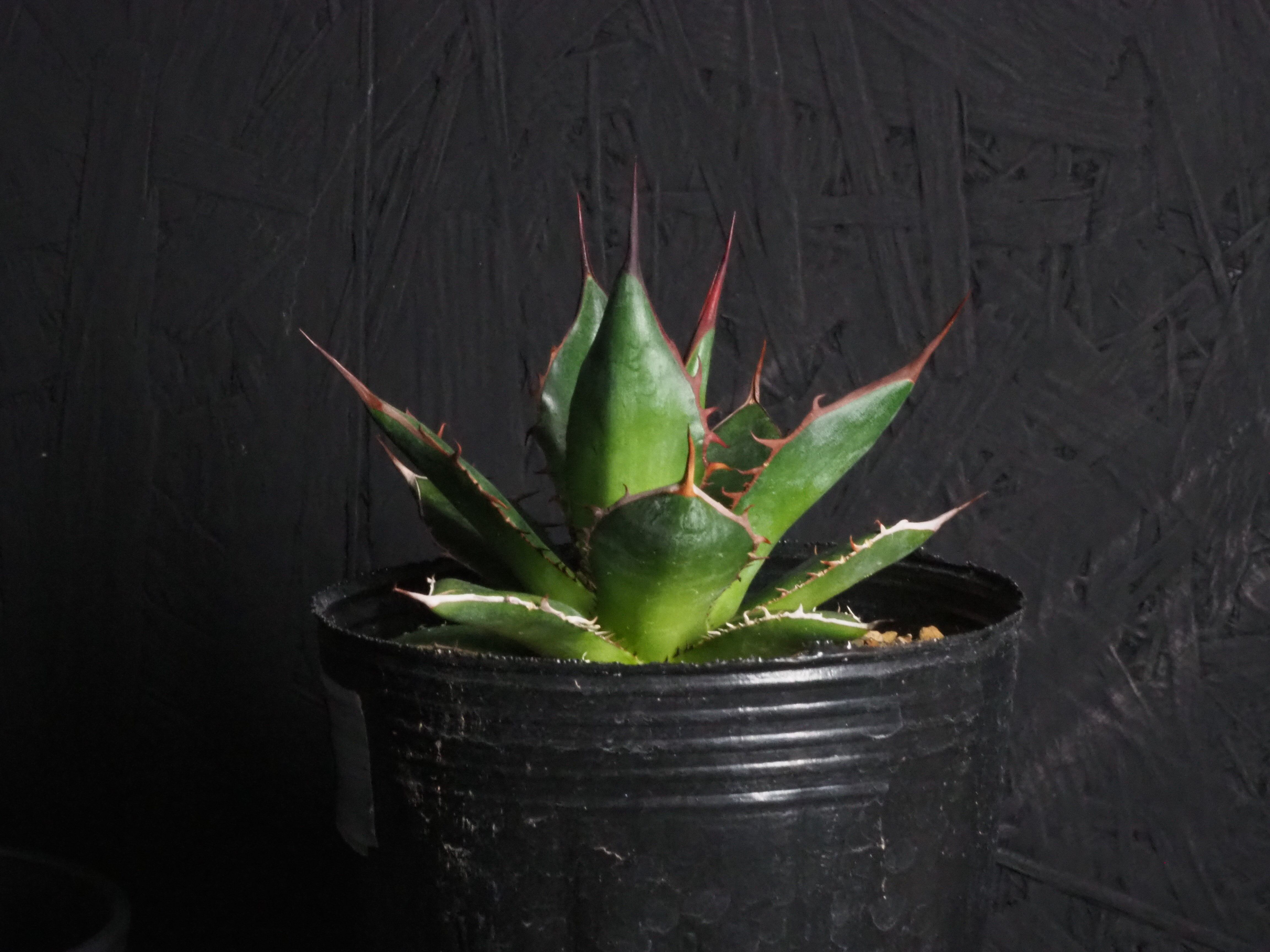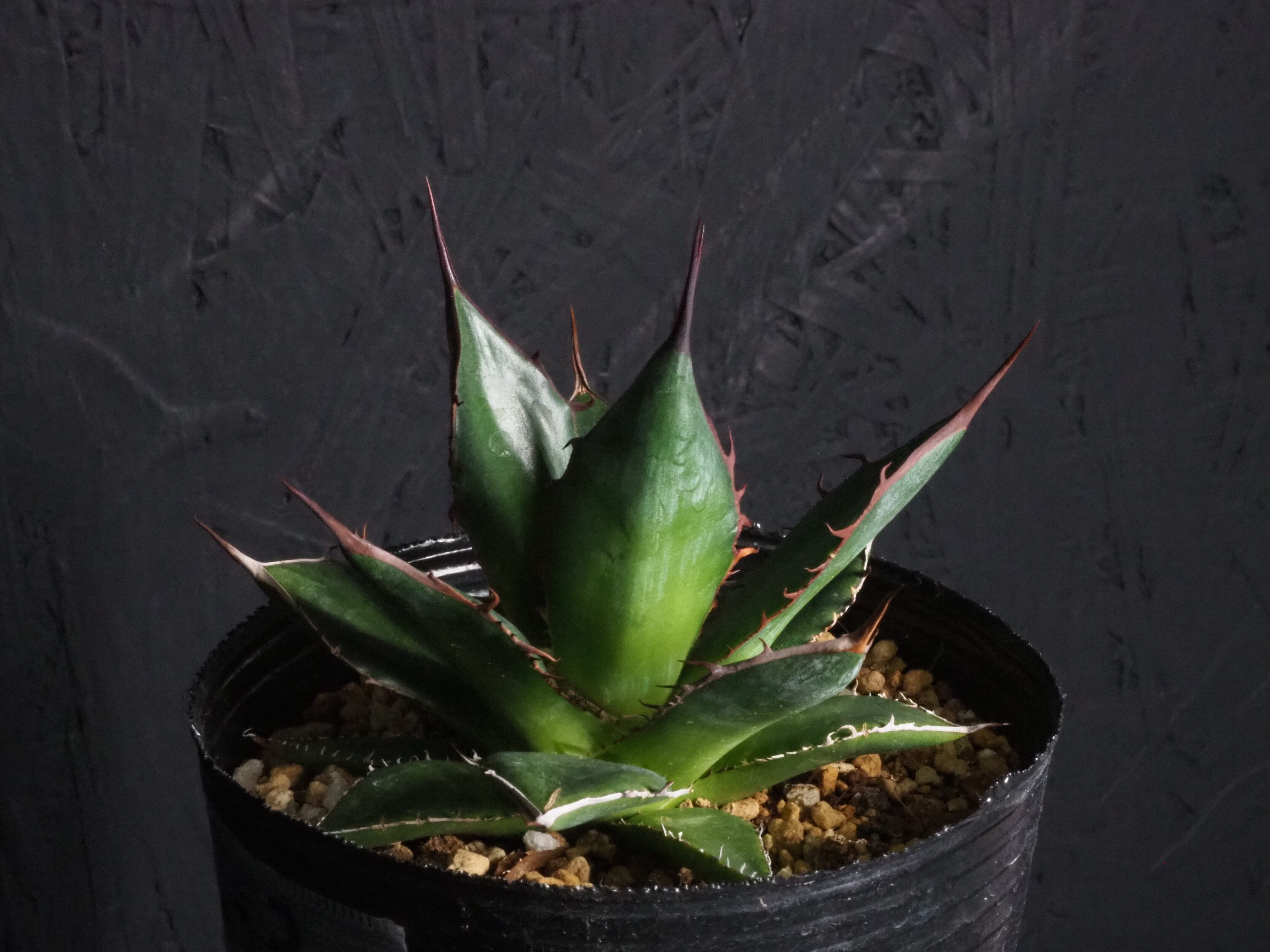 アガベの中型種ホリダ、シャープな葉と強烈な棘が特徴のアガベのトップランカーです。小型~中型であまり大きくならないのが特徴。地植えでは70~80㎝になりますが、締めて管理すれば直径30㎝以内に保つことも可能なアガベです。生長と共に厳つい葉が勢いよく天に向かって伸びる様は本当にカッコイイです。幼体型の内は強い日光は葉焼けを起こしやすいので、環境変化や季節の変わり目は要注意です。少し遮光して管理してあげると調子よくご機嫌ですよ。成株では耐寒性は零下4度くらいまで。この子のようにまだ子株の内は凍結はNGです。
