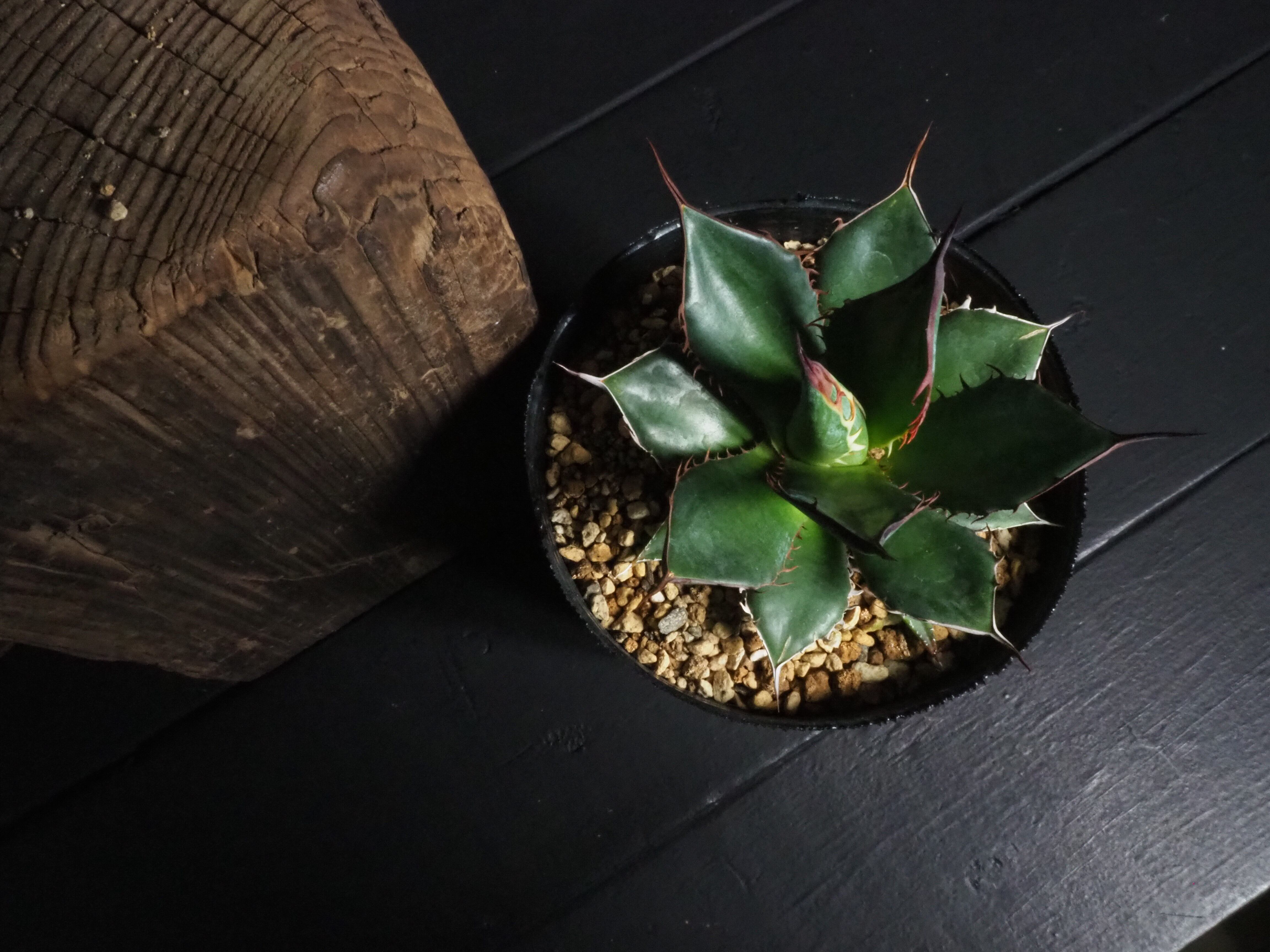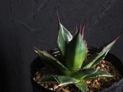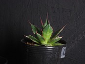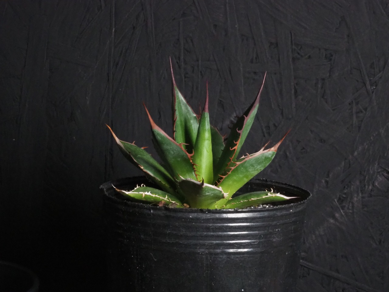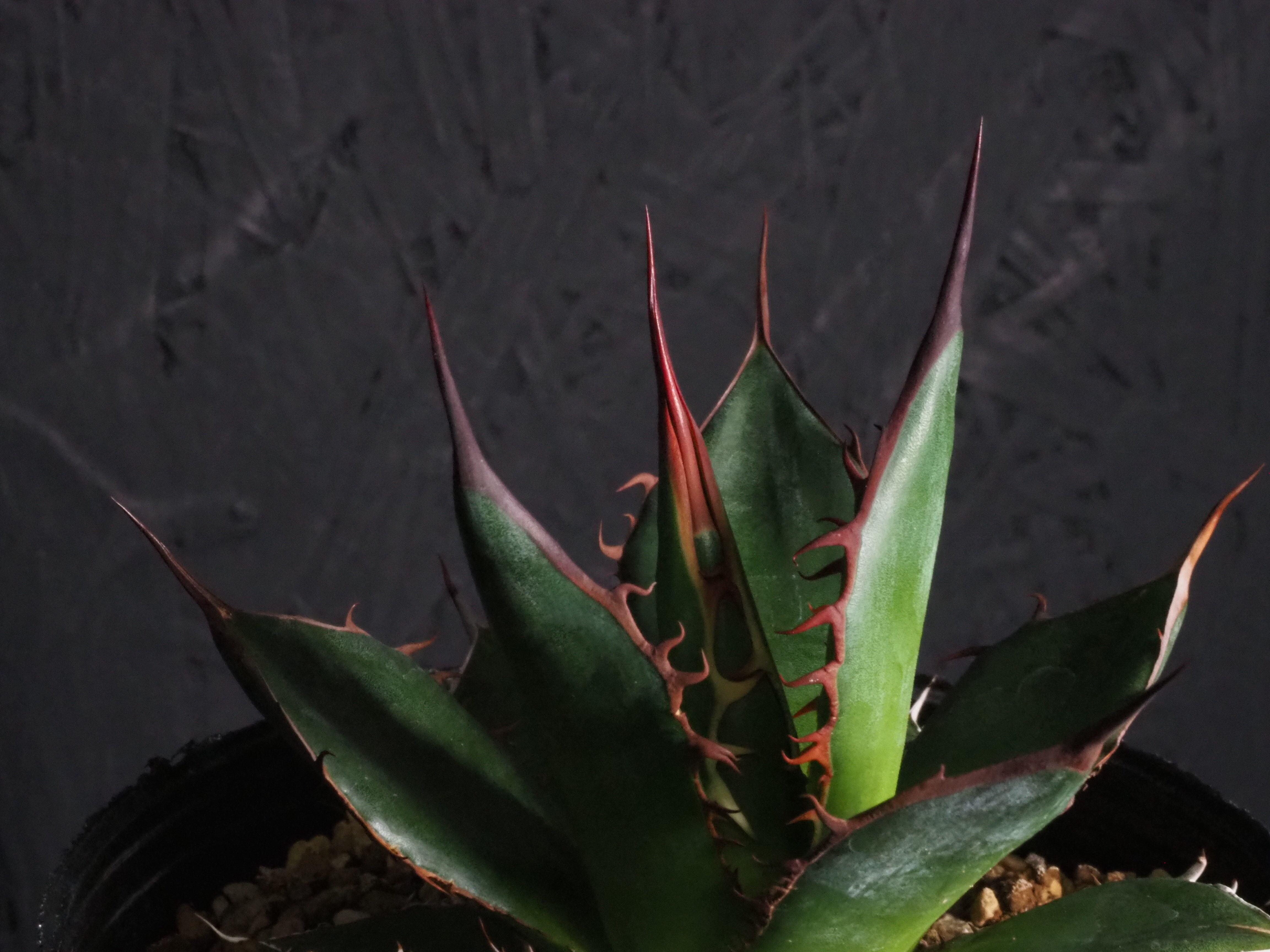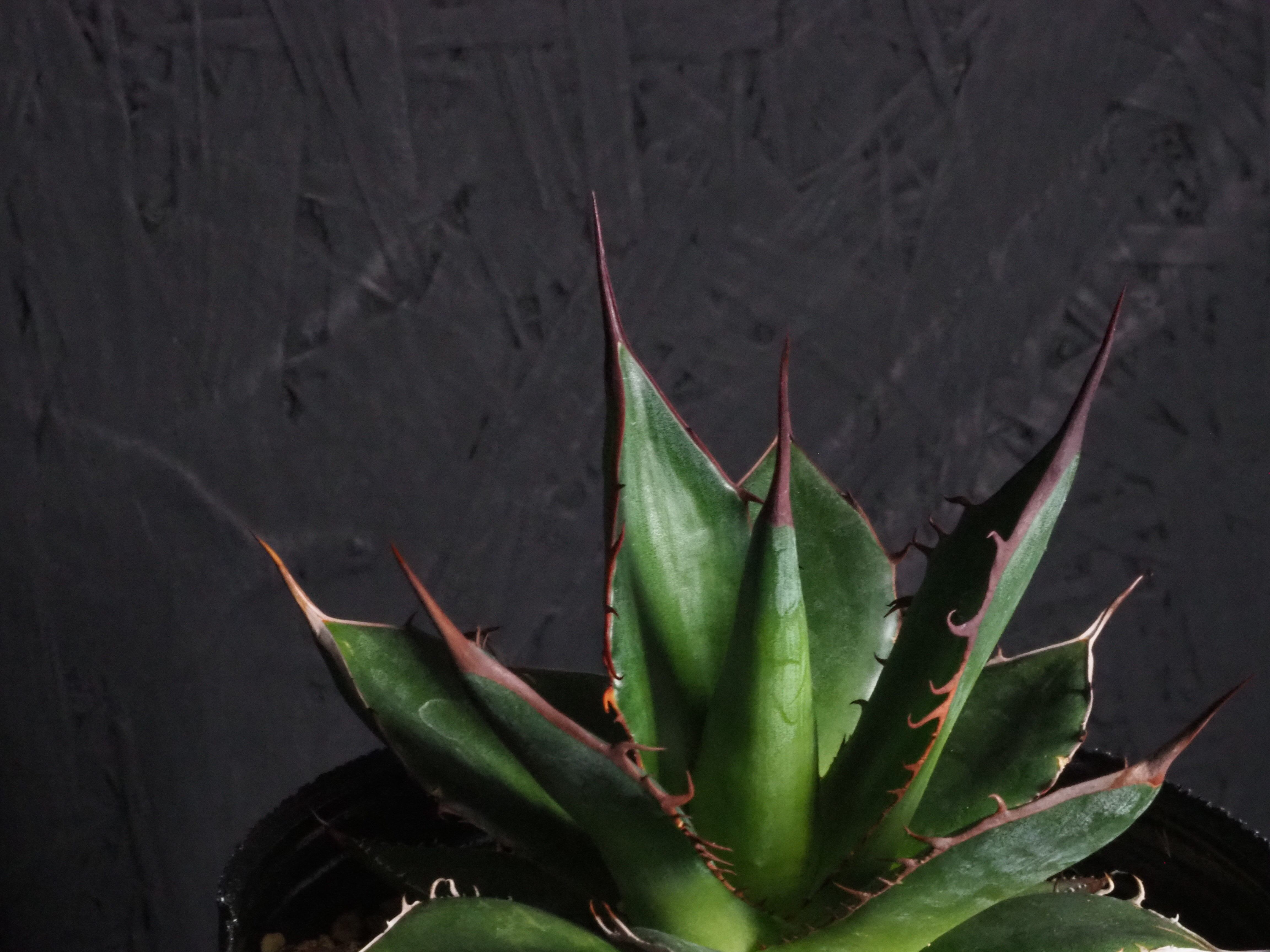 アガベの中型種ホリダ、シャープな葉と強烈な棘が特徴のアガベのトップランカーです。小型~中型であまり大きくならないのが特徴。地植えでは70~80㎝になりますが、締めて管理すれば直径30㎝以内に保つことも可能なアガベです。生長と共に厳つい葉が勢いよく天に向かって伸びる様は本当にカッコイイです。幼体型の内は強い日光は葉焼けを起こしやすいので、環境変化や季節の変わり目は要注意です。少し遮光して管理してあげると調子よくご機嫌ですよ。成株では耐寒性は零下4度くらいまで。この子のようにまだ子株の内は凍結はNGです。