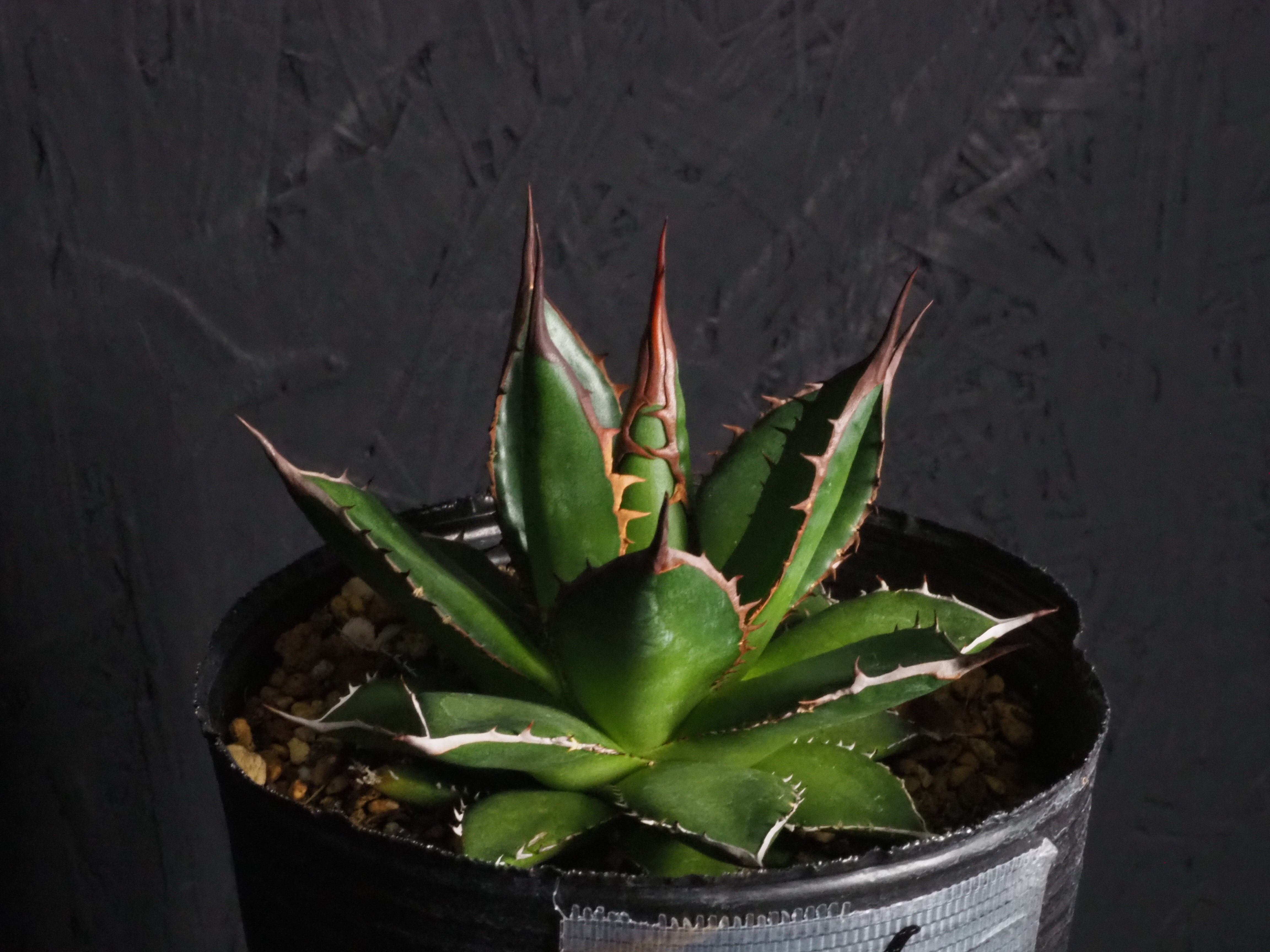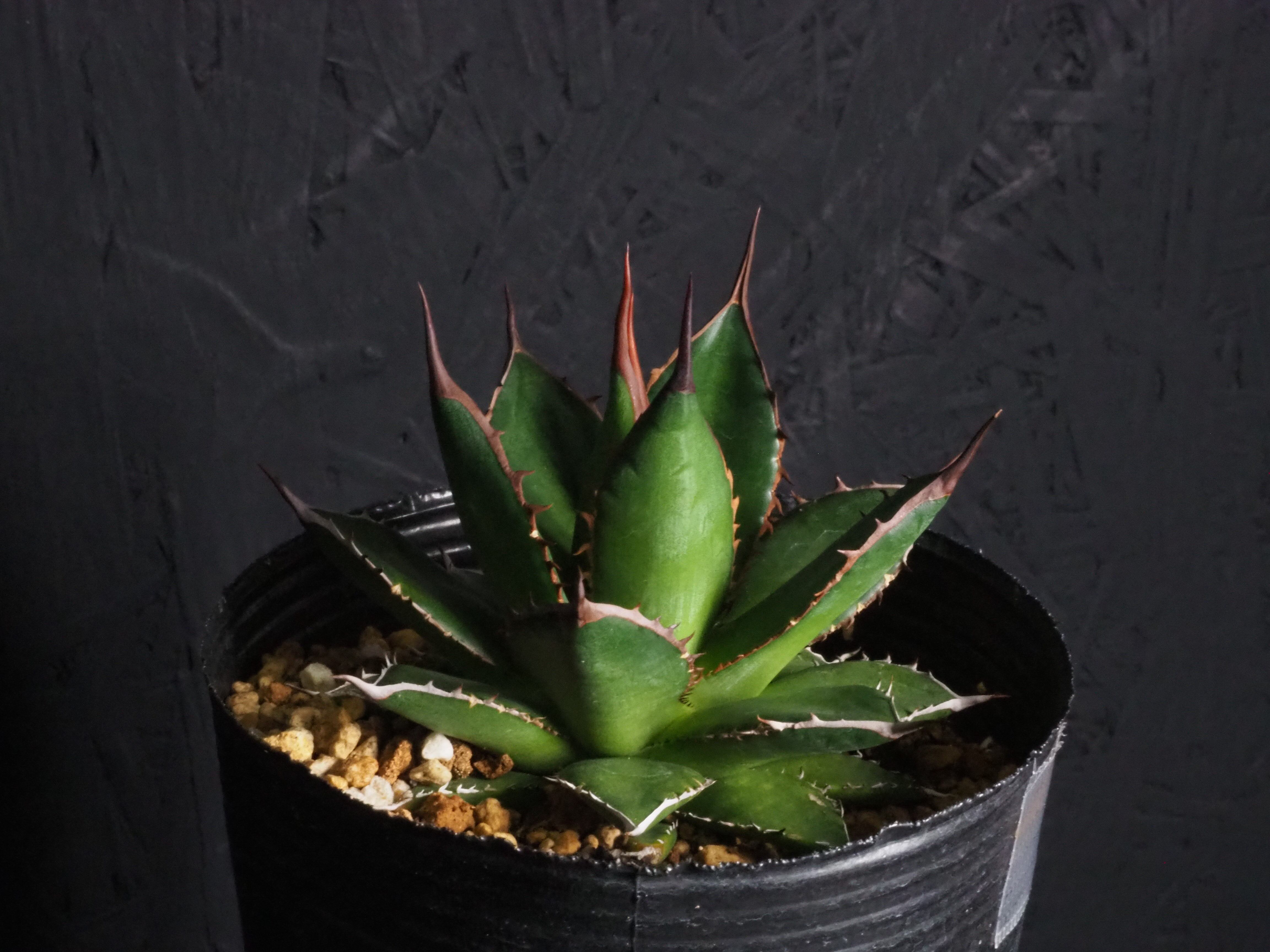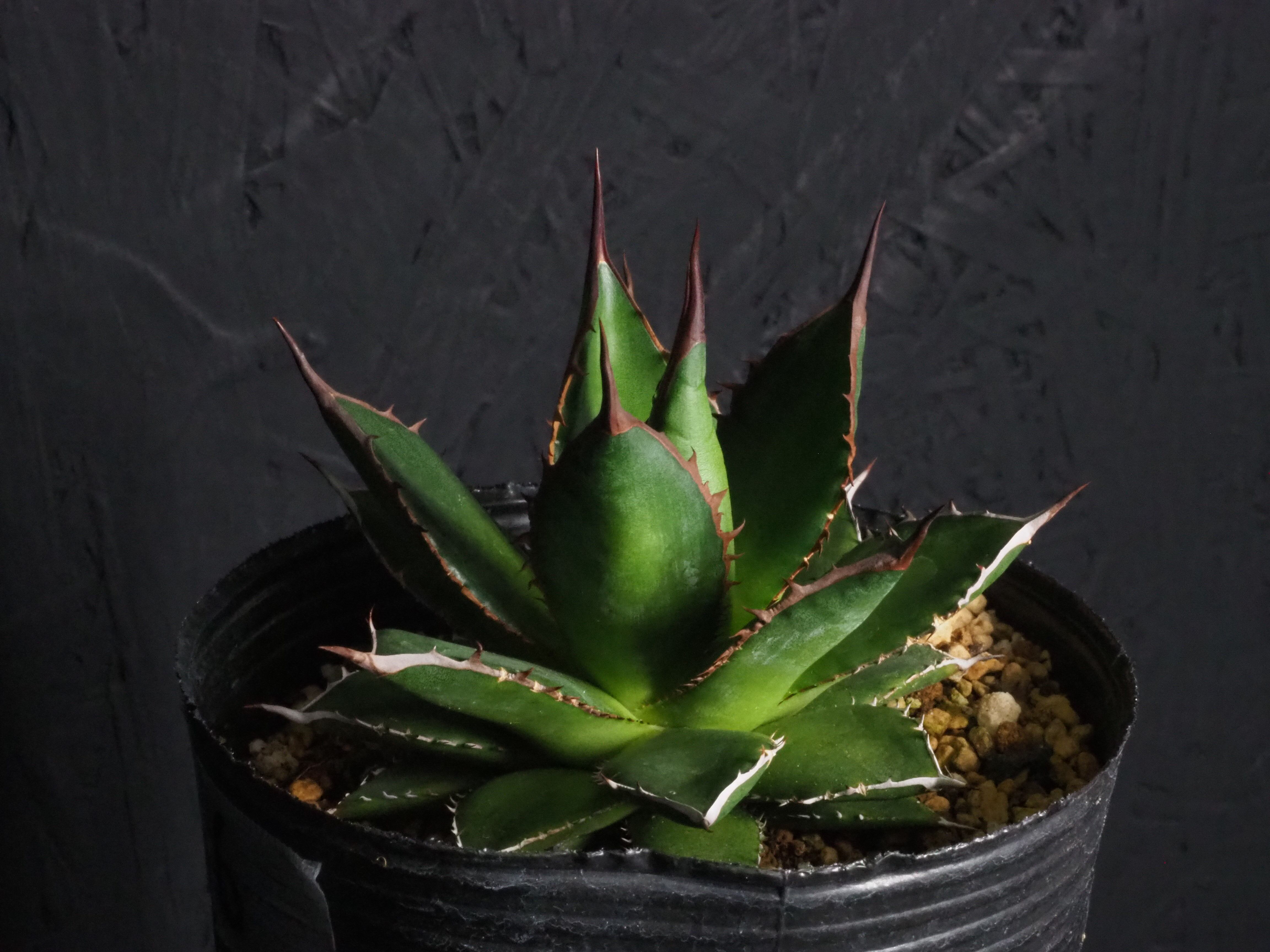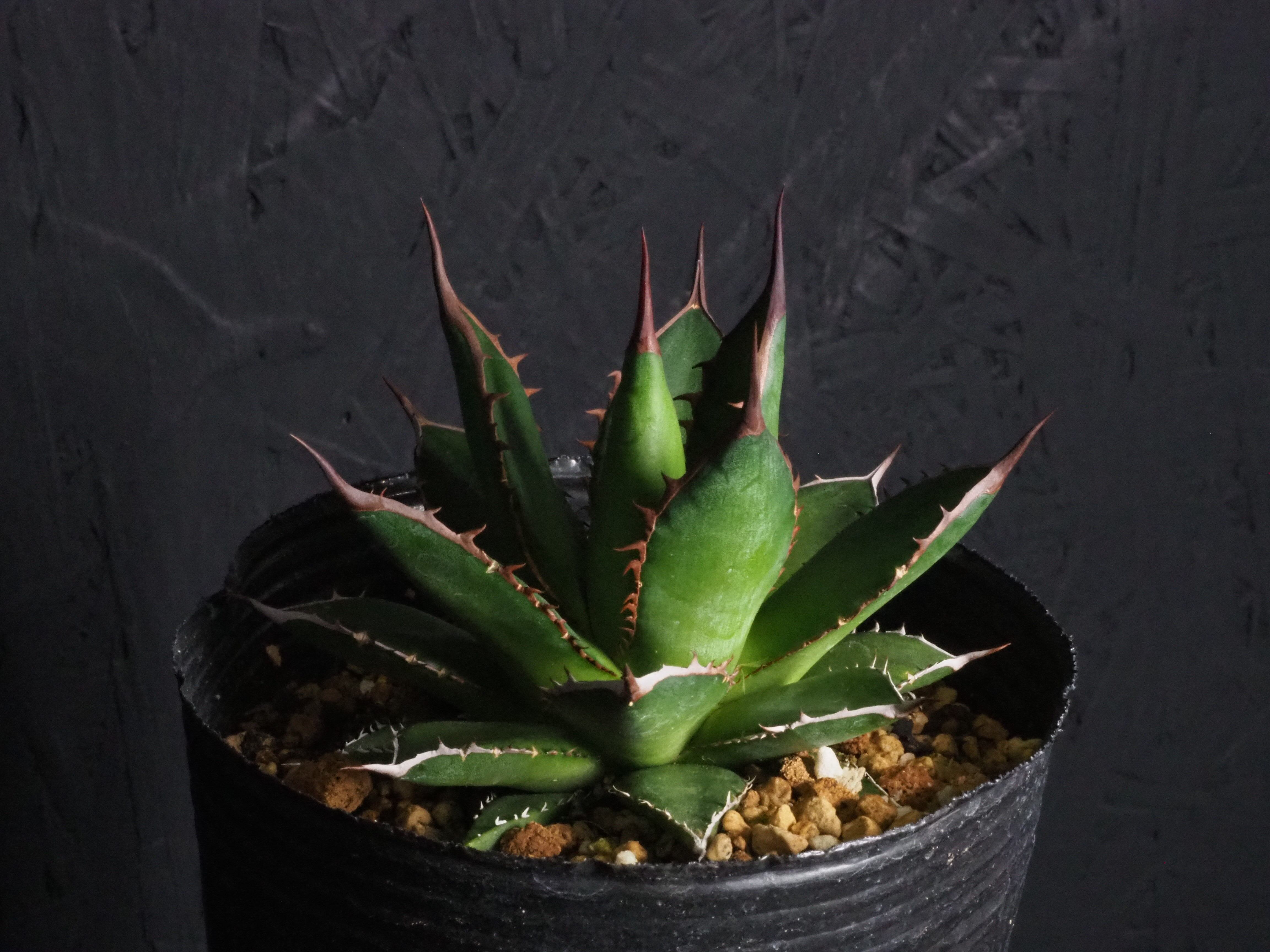 アガベの中型種ホリダ、シャープな葉と強烈な棘が特徴のアガベのトップランカーです。小型~中型であまり大きくならないのが特徴。地植えでは70~80㎝になりますが、締めて管理すれば直径30㎝以内に保つことも可能なアガベです。生長と共に厳つい葉が勢いよく天に向かって伸びる様は本当にカッコイイです。幼体型の内は強い日光は葉焼けを起こしやすいので、環境変化や季節の変わり目は要注意です。少し遮光して管理してあげると調子よくご機嫌ですよ。成株では耐寒性は零下4度くらいまで。この子のようにまだ子株の内は凍結はNGです。
