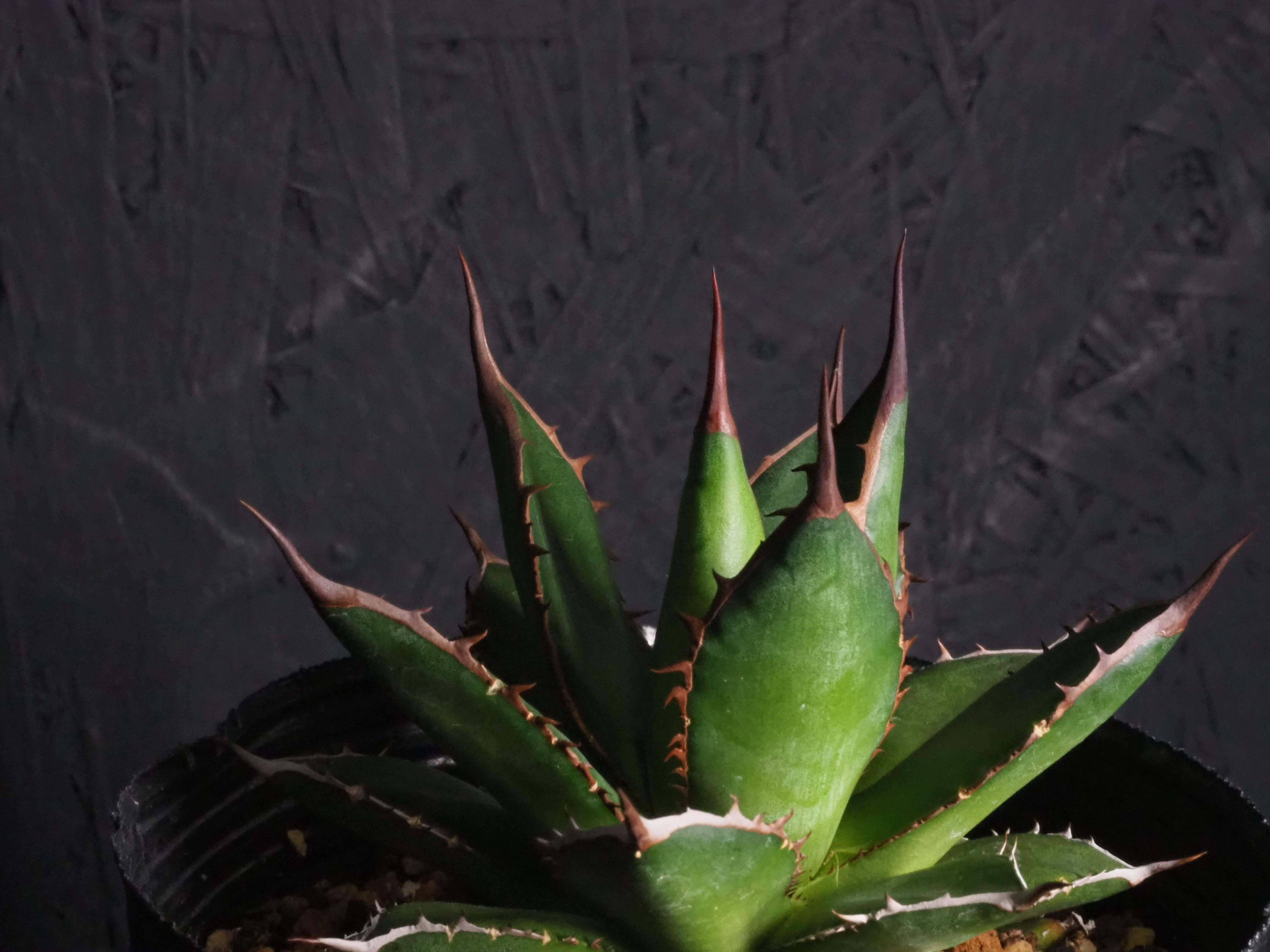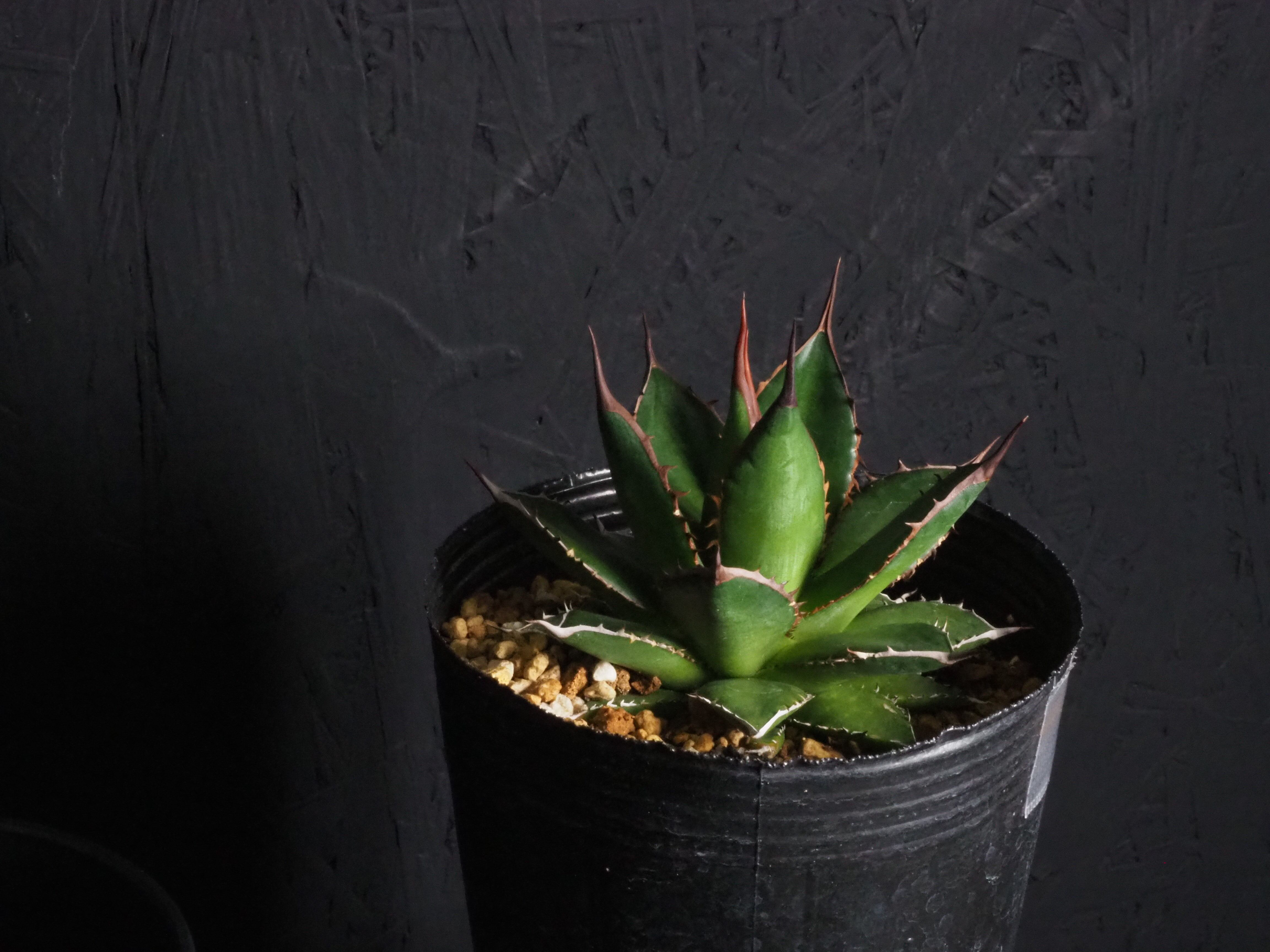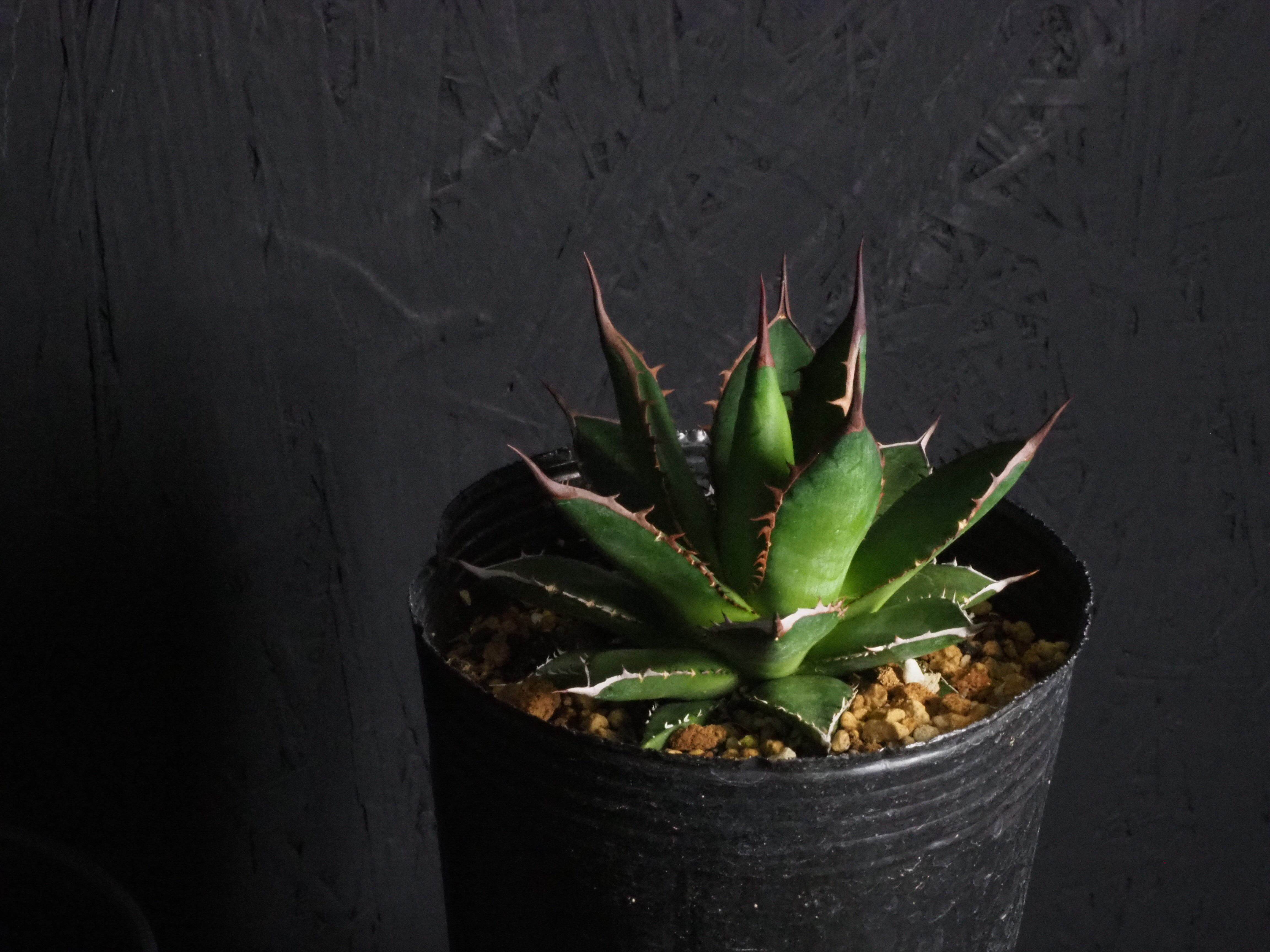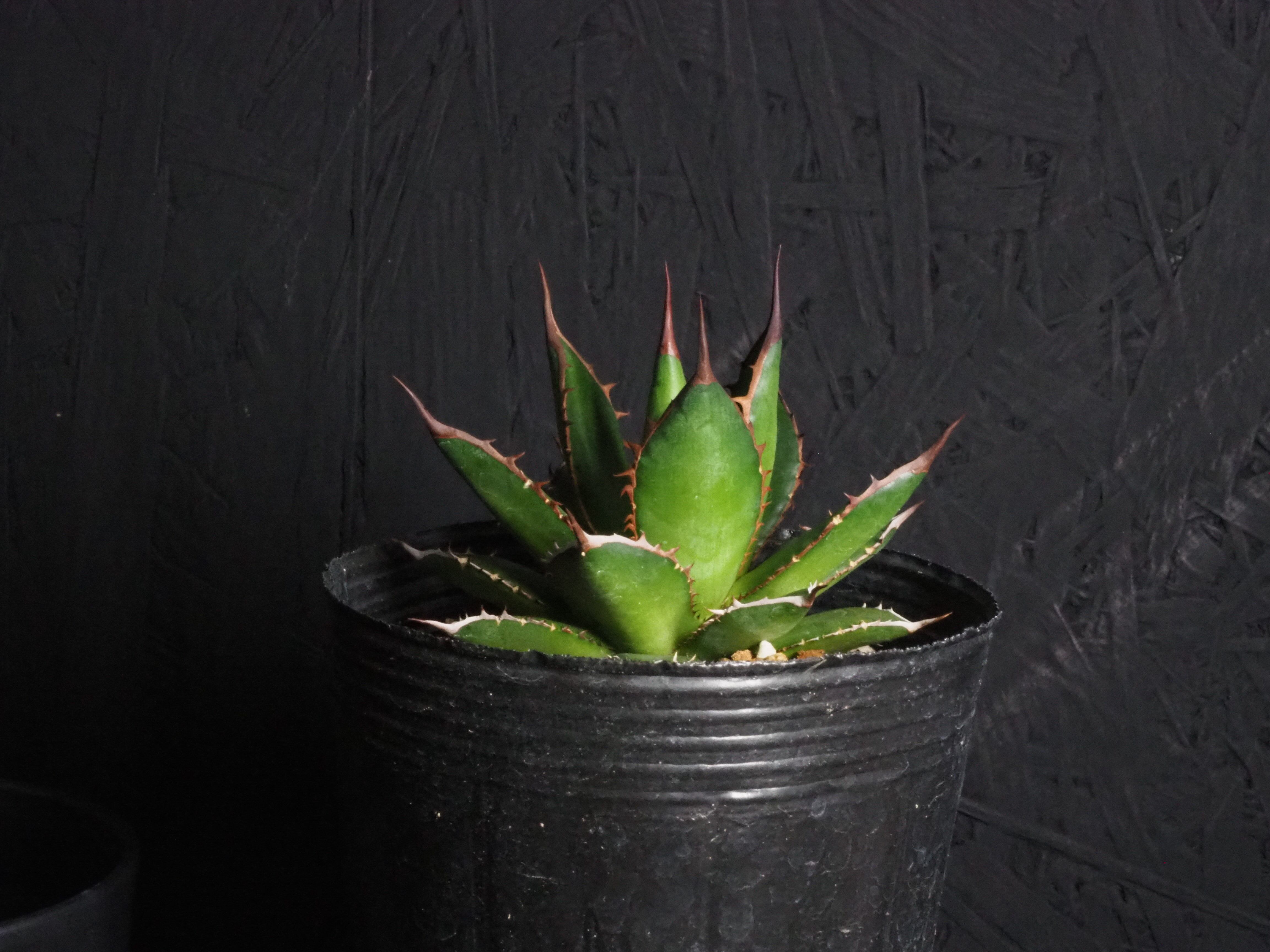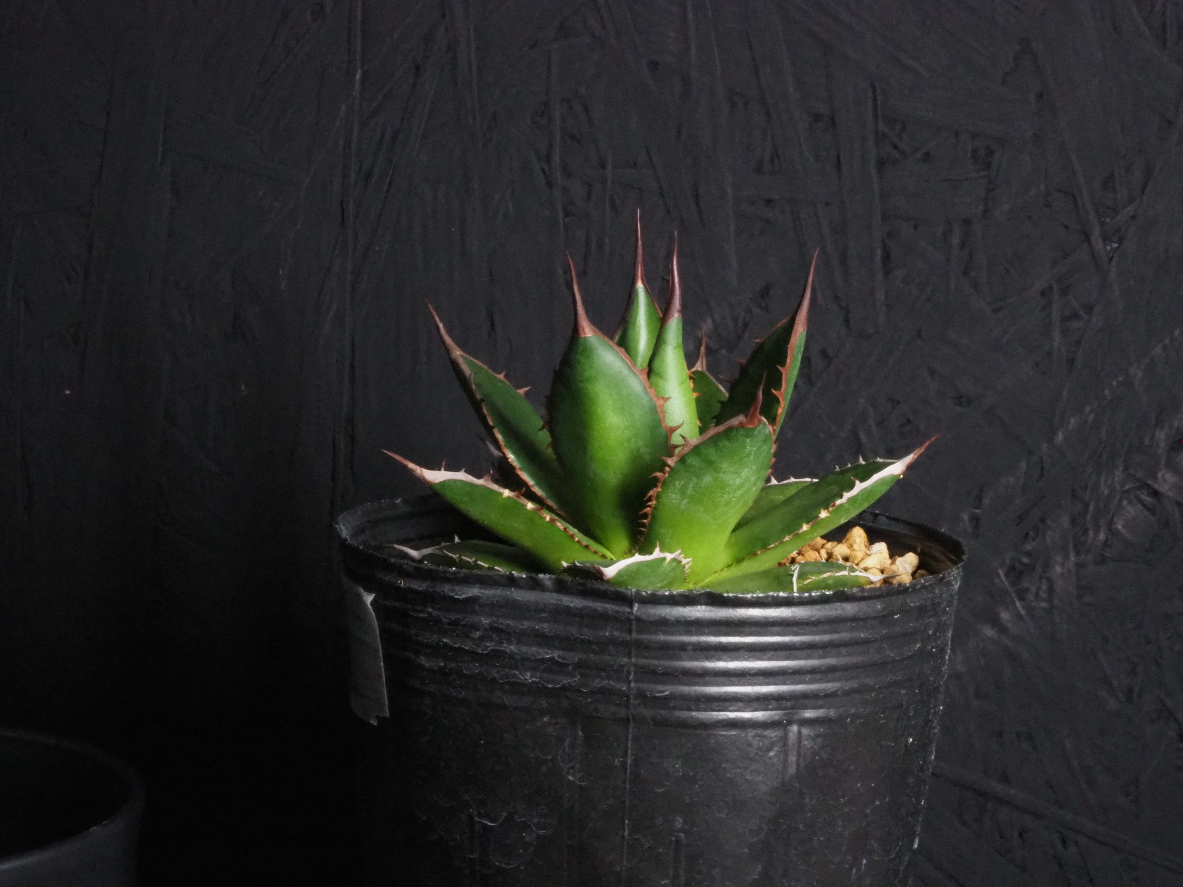 アガベの中型種ホリダ、シャープな葉と強烈な棘が特徴のアガベのトップランカーです。小型~中型であまり大きくならないのが特徴。地植えでは70~80㎝になりますが、締めて管理すれば直径30㎝以内に保つことも可能なアガベです。生長と共に厳つい葉が勢いよく天に向かって伸びる様は本当にカッコイイです。幼体型の内は強い日光は葉焼けを起こしやすいので、環境変化や季節の変わり目は要注意です。少し遮光して管理してあげると調子よくご機嫌ですよ。成株では耐寒性は零下4度くらいまで。この子のようにまだ子株の内は凍結はNGです。