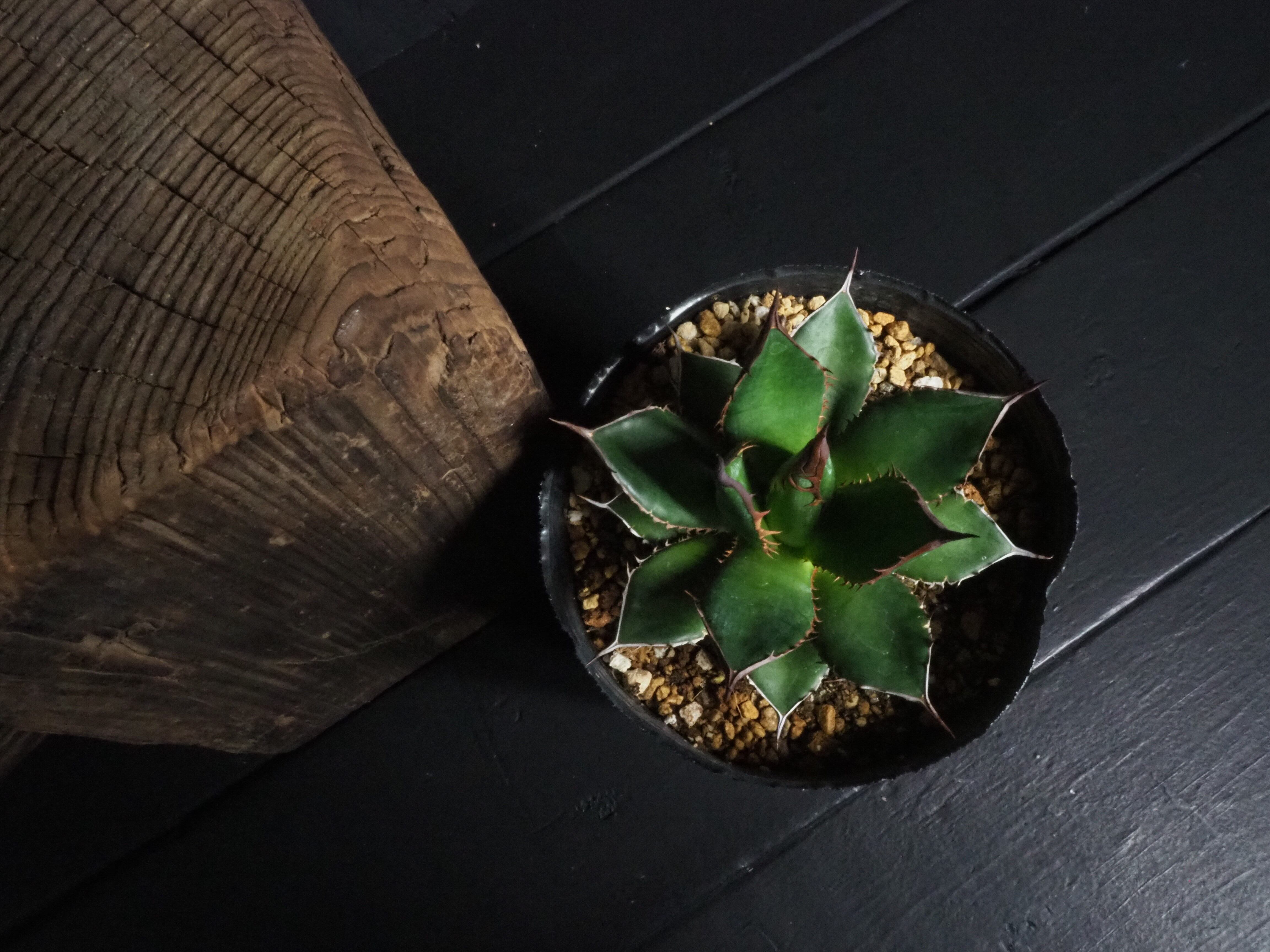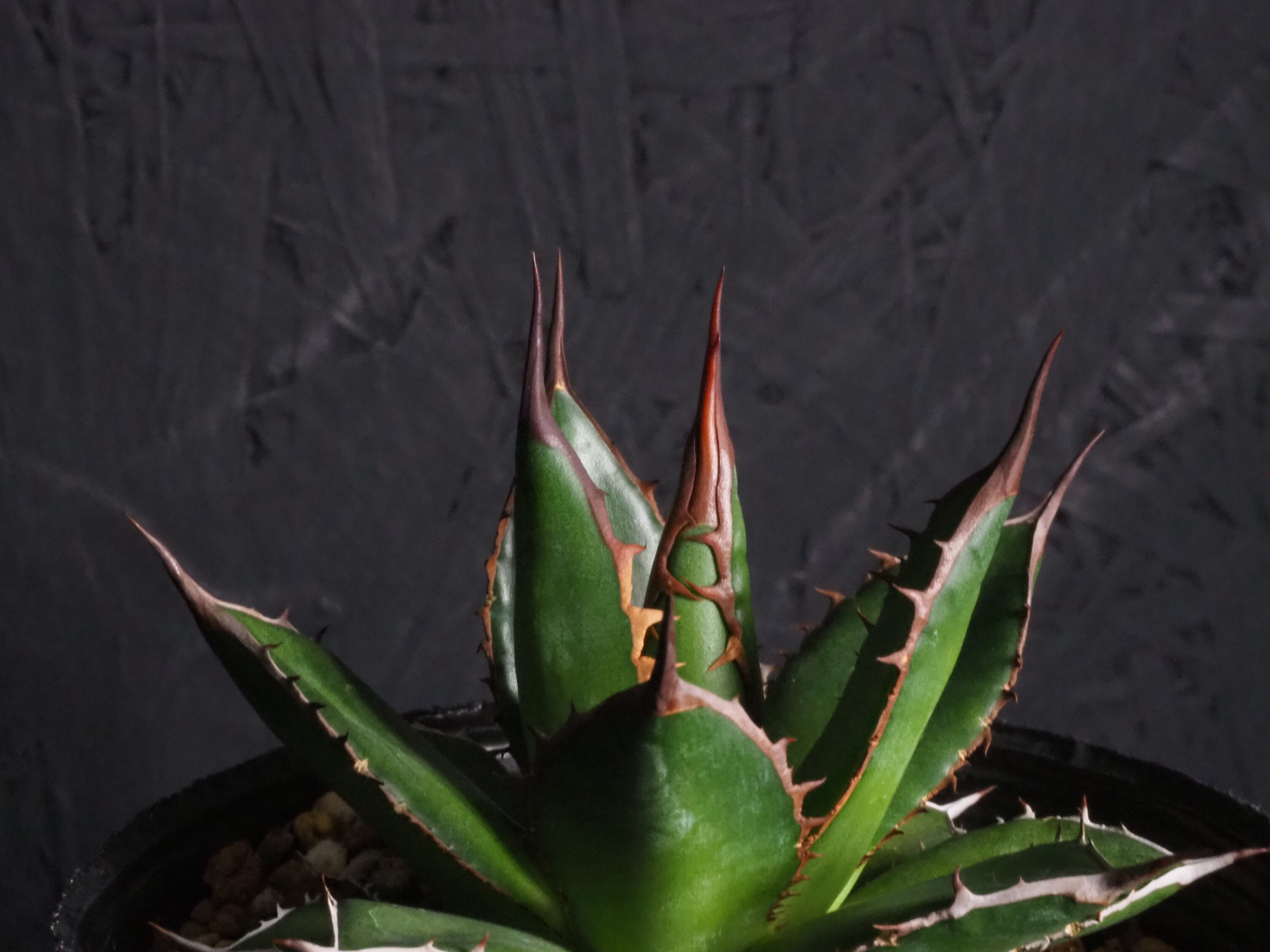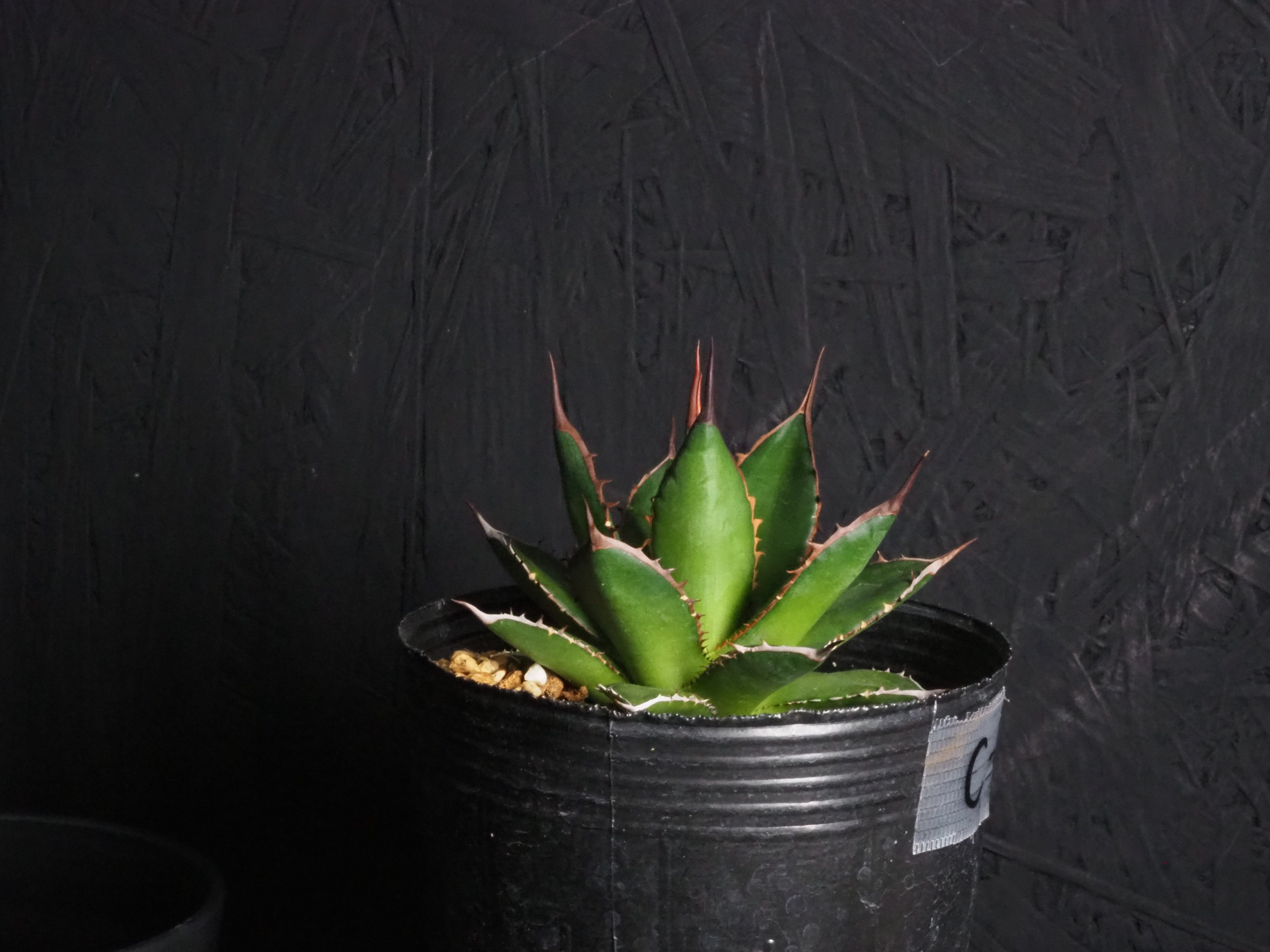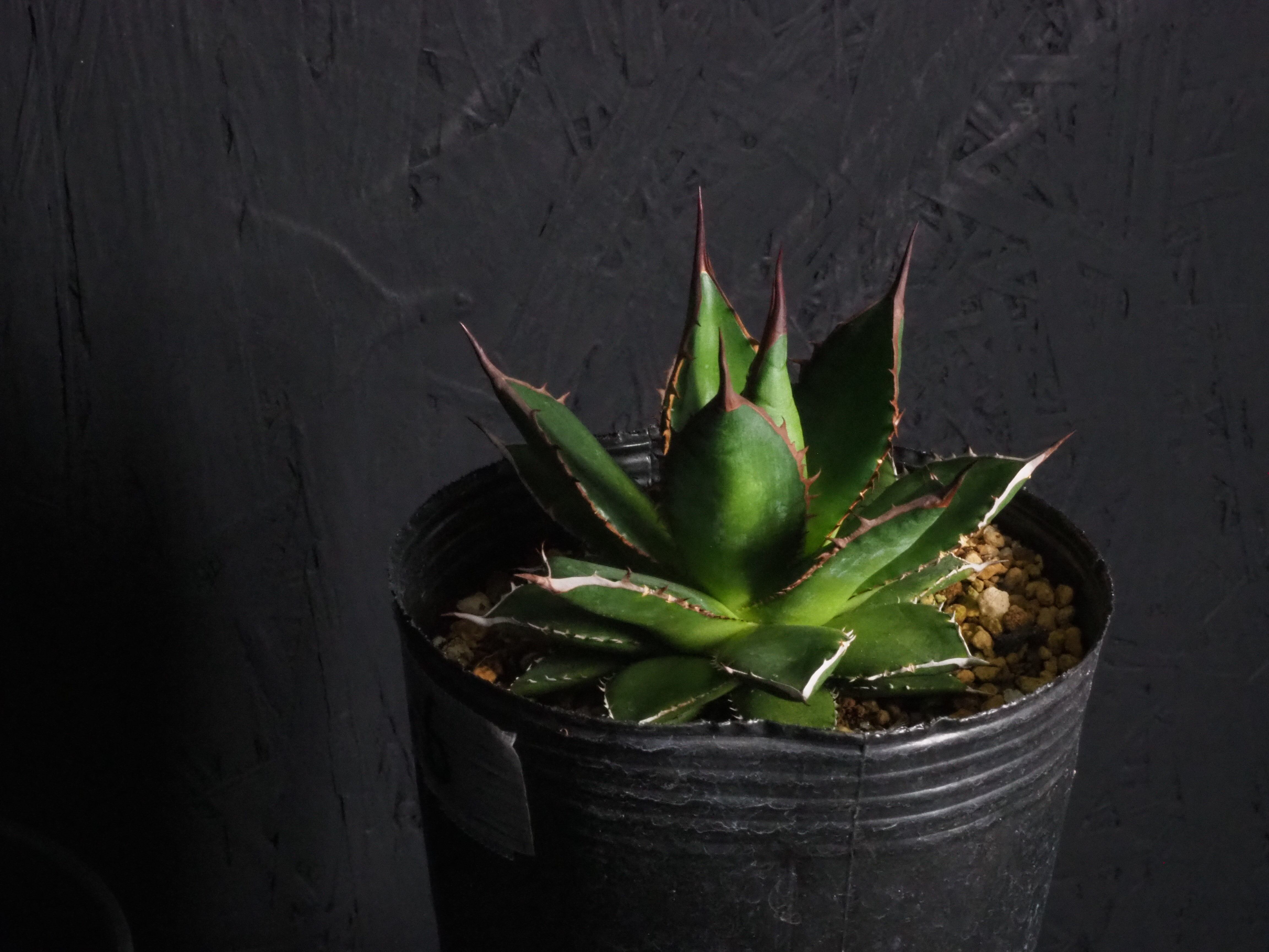 アガベの中型種ホリダ、シャープな葉と強烈な棘が特徴のアガベのトップランカーです。小型~中型であまり大きくならないのが特徴。地植えでは70~80㎝になりますが、締めて管理すれば直径30㎝以内に保つことも可能なアガベです。生長と共に厳つい葉が勢いよく天に向かって伸びる様は本当にカッコイイです。幼体型の内は強い日光は葉焼けを起こしやすいので、環境変化や季節の変わり目は要注意です。少し遮光して管理してあげると調子よくご機嫌ですよ。成株では耐寒性は零下4度くらいまで。この子のようにまだ子株の内は凍結はNGです。