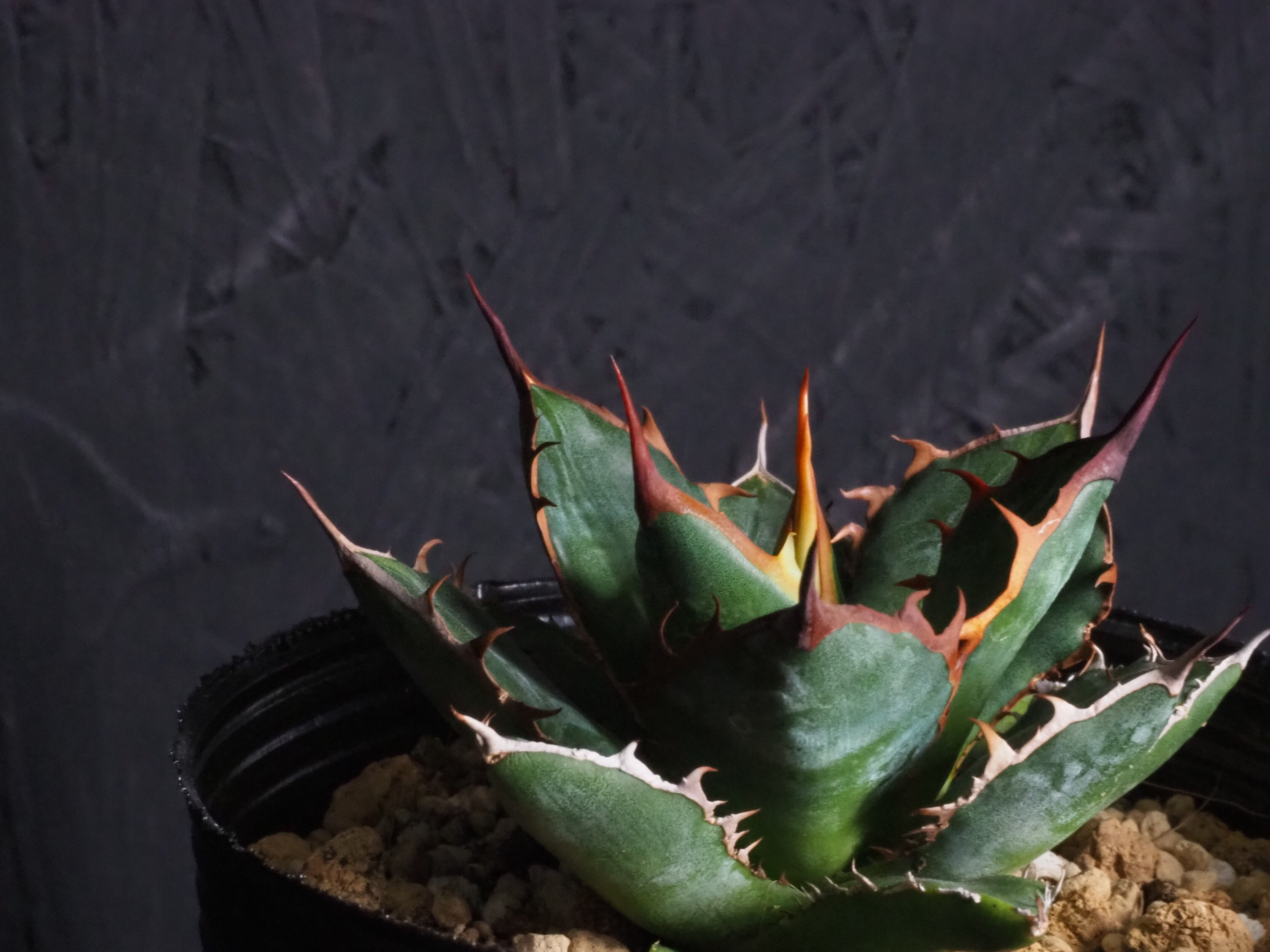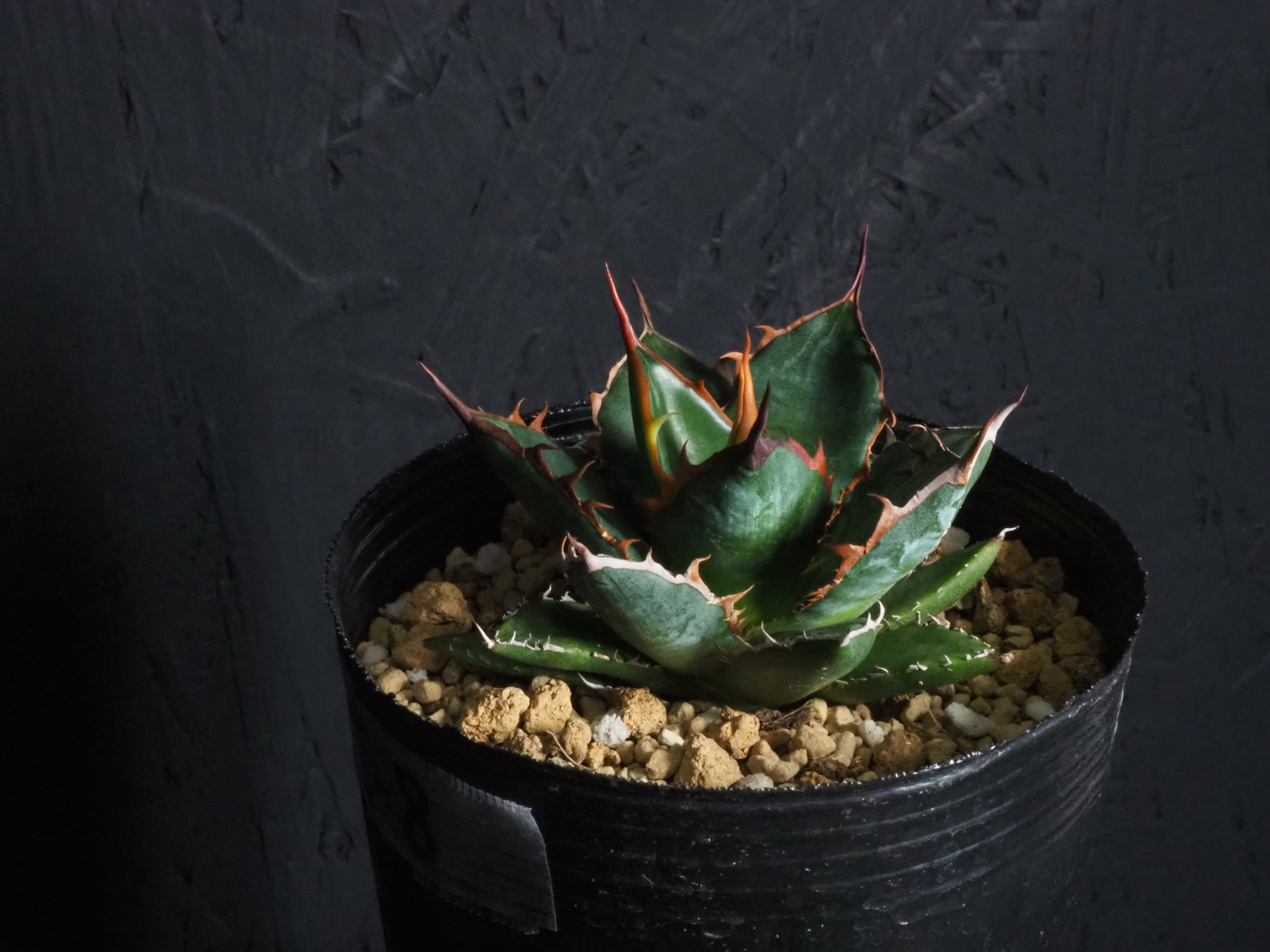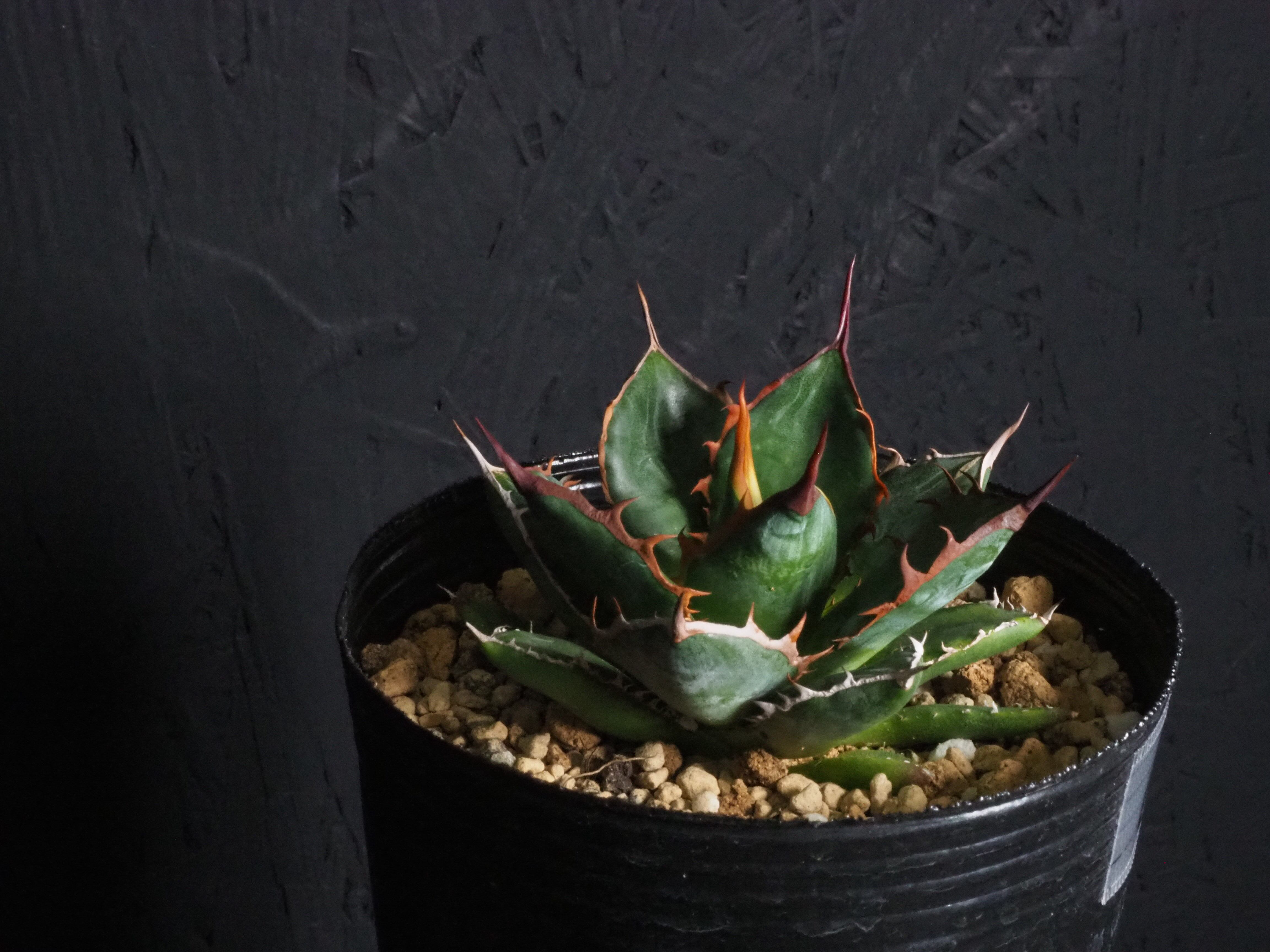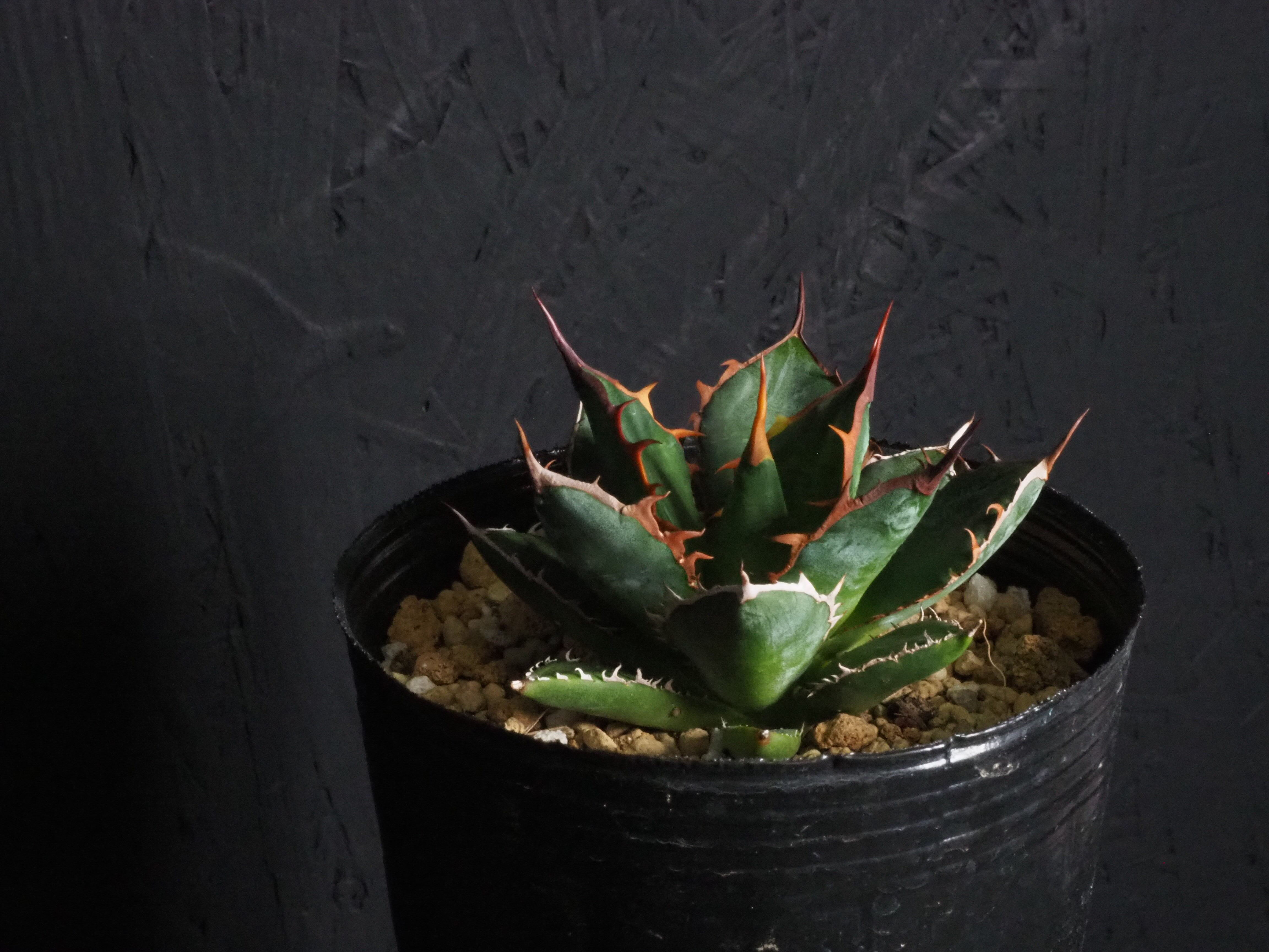 アガベの中型種ホリダ、シャープな葉と強烈な棘が特徴のアガベのトップランカーです。小型~中型であまり大きくならないのが特徴。地植えでは70~80㎝になりますが、締めて管理すれば直径30㎝以内に保つことも可能なアガベです。生長と共に厳つい葉が勢いよく天に向かって伸びる様は本当にカッコイイです。幼体型の内は強い日光は葉焼けを起こしやすいので、環境変化や季節の変わり目は要注意です。少し遮光して管理してあげると調子よくご機嫌ですよ。成株では耐寒性は零下4度くらいまで。この子のようにまだ子株の内は凍結はNGです。