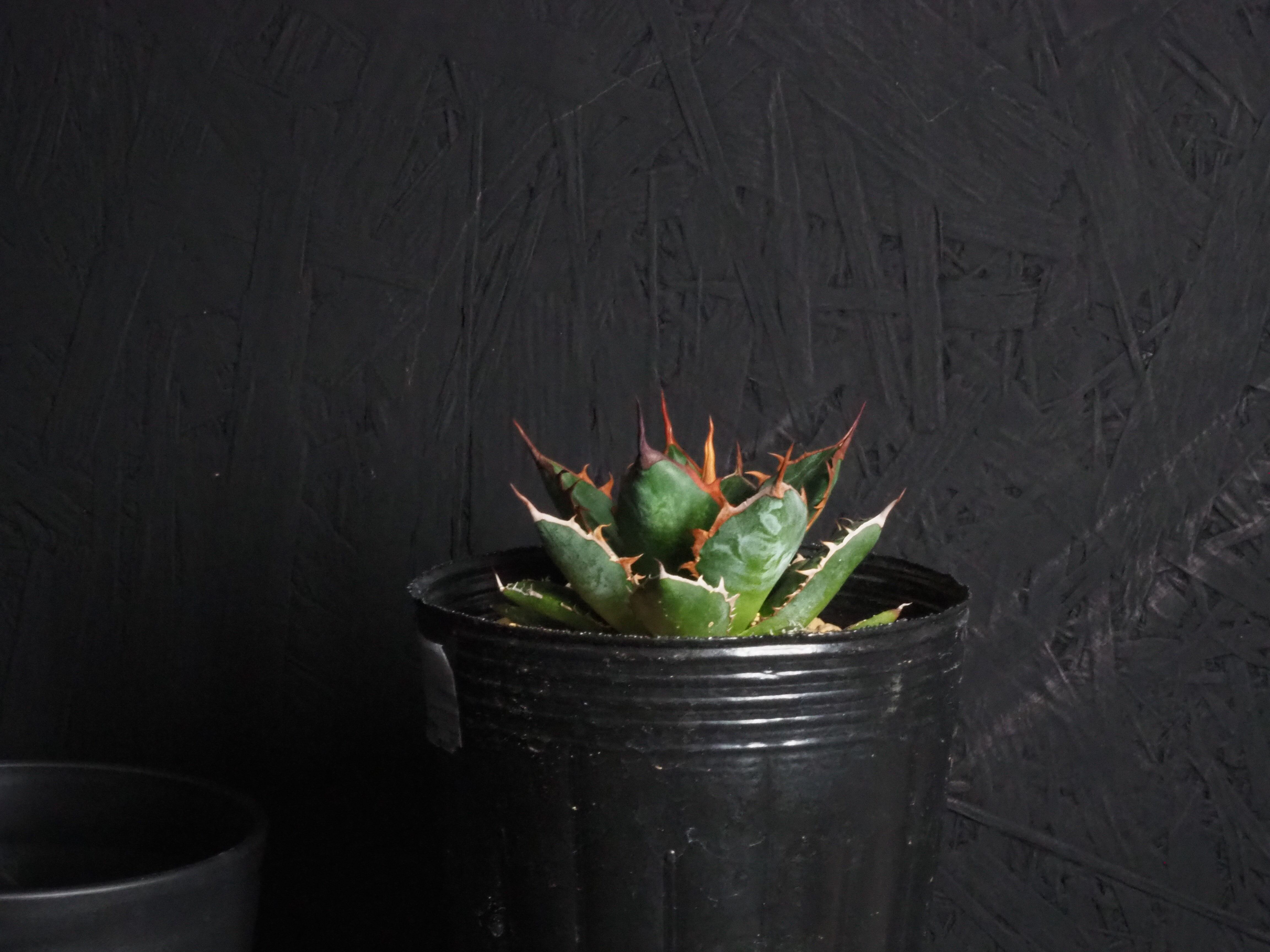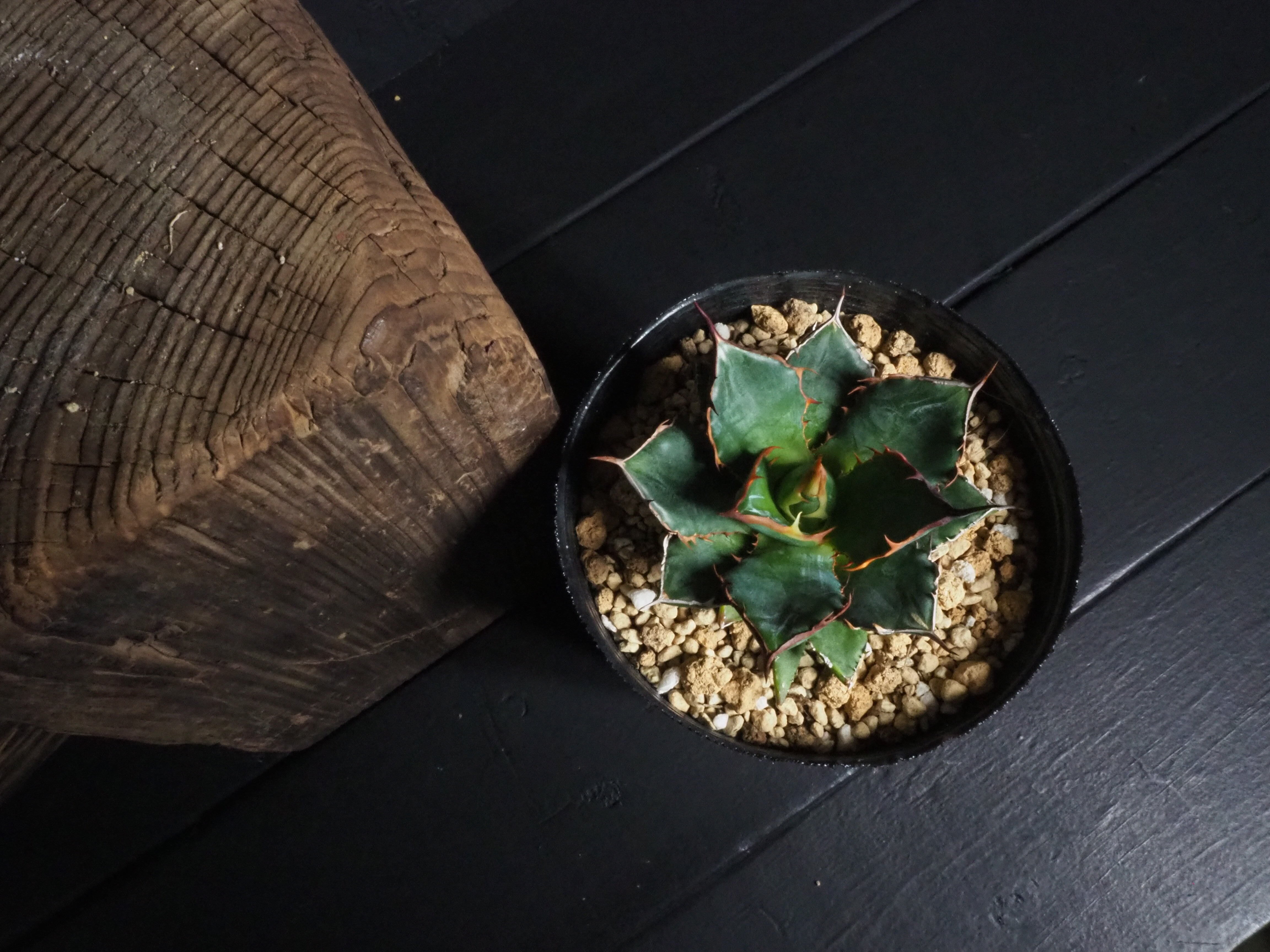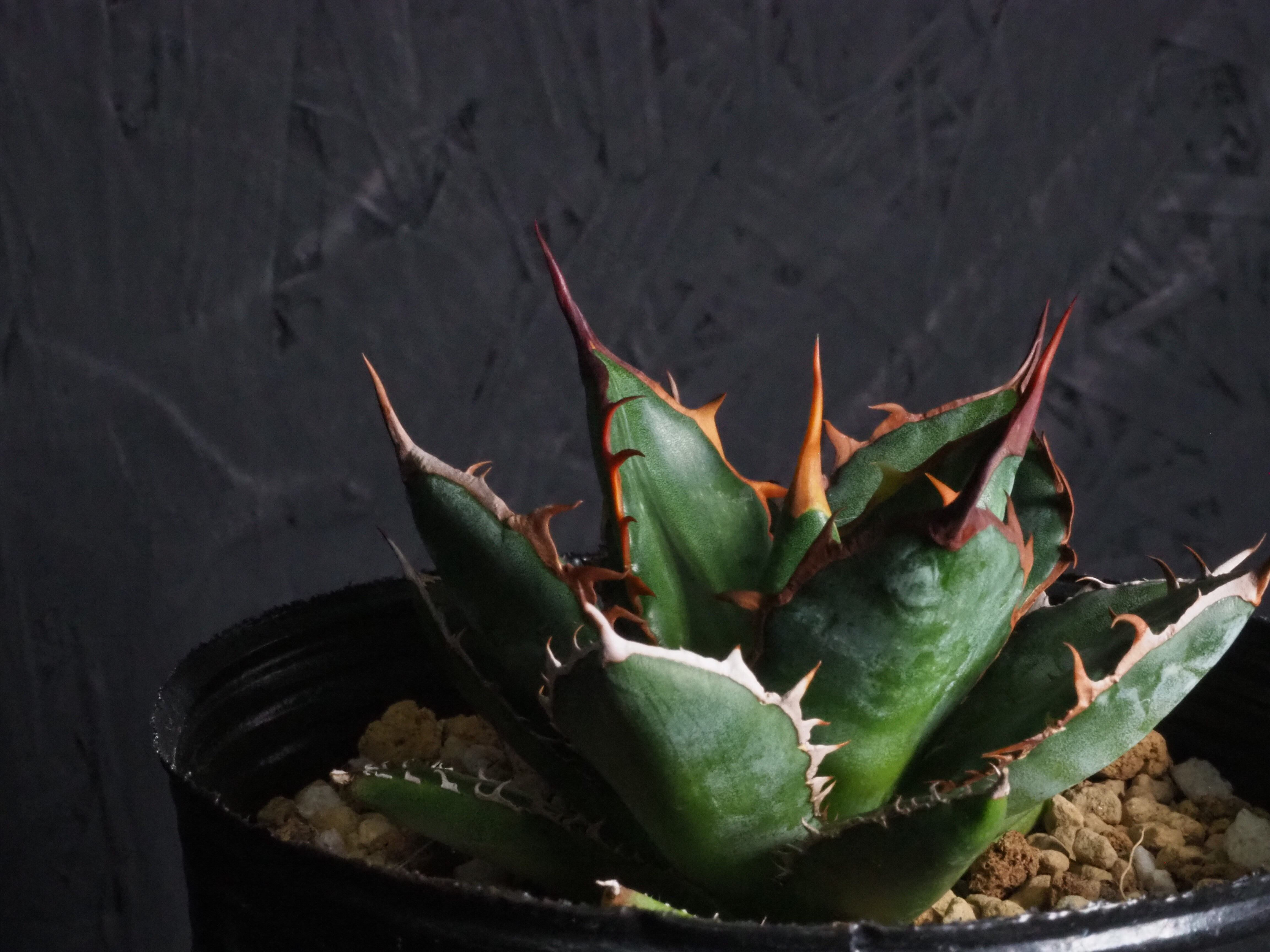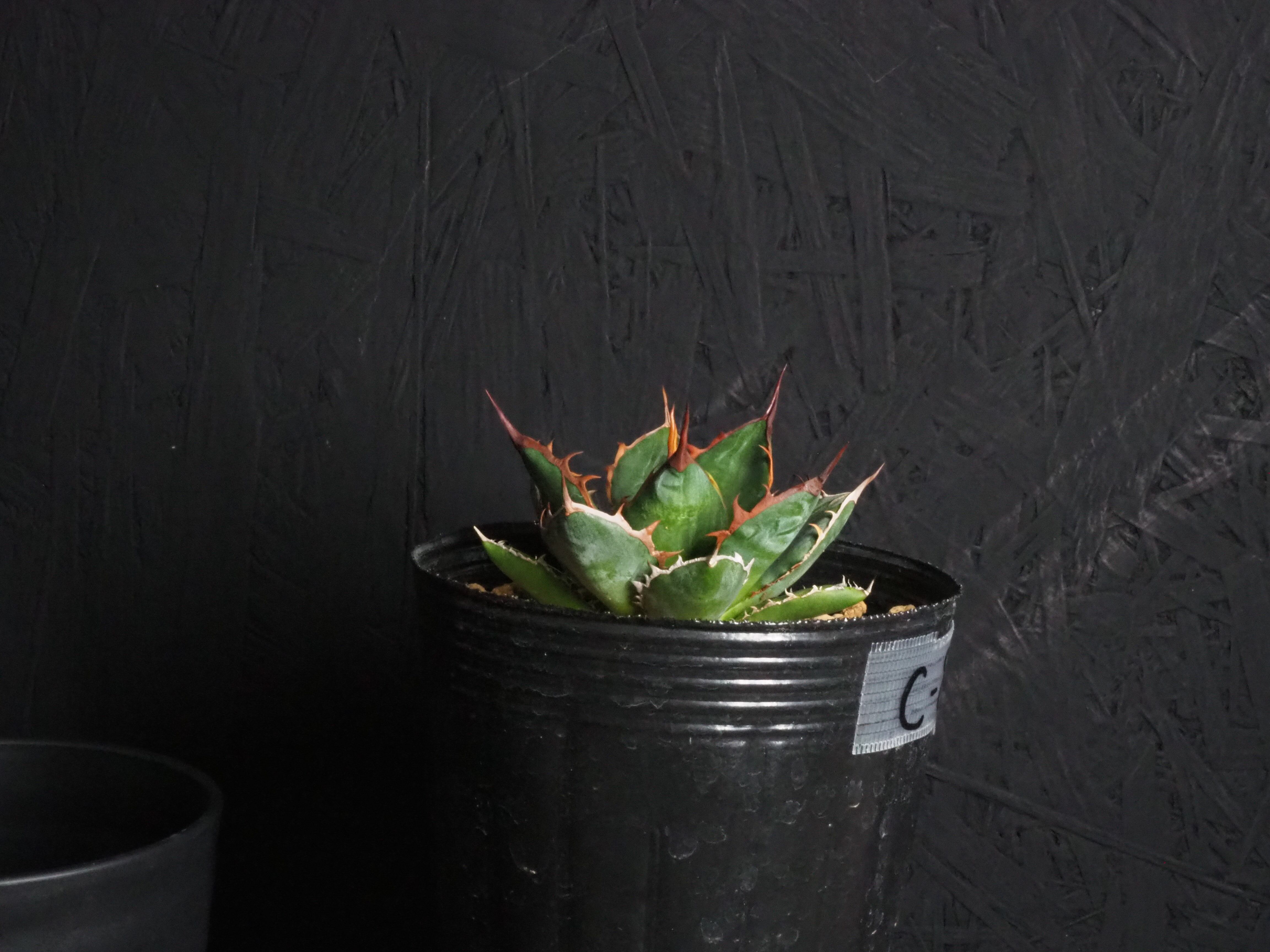 アガベの中型種ホリダ、シャープな葉と強烈な棘が特徴のアガベのトップランカーです。小型~中型であまり大きくならないのが特徴。地植えでは70~80㎝になりますが、締めて管理すれば直径30㎝以内に保つことも可能なアガベです。生長と共に厳つい葉が勢いよく天に向かって伸びる様は本当にカッコイイです。幼体型の内は強い日光は葉焼けを起こしやすいので、環境変化や季節の変わり目は要注意です。少し遮光して管理してあげると調子よくご機嫌ですよ。成株では耐寒性は零下4度くらいまで。この子のようにまだ子株の内は凍結はNGです。